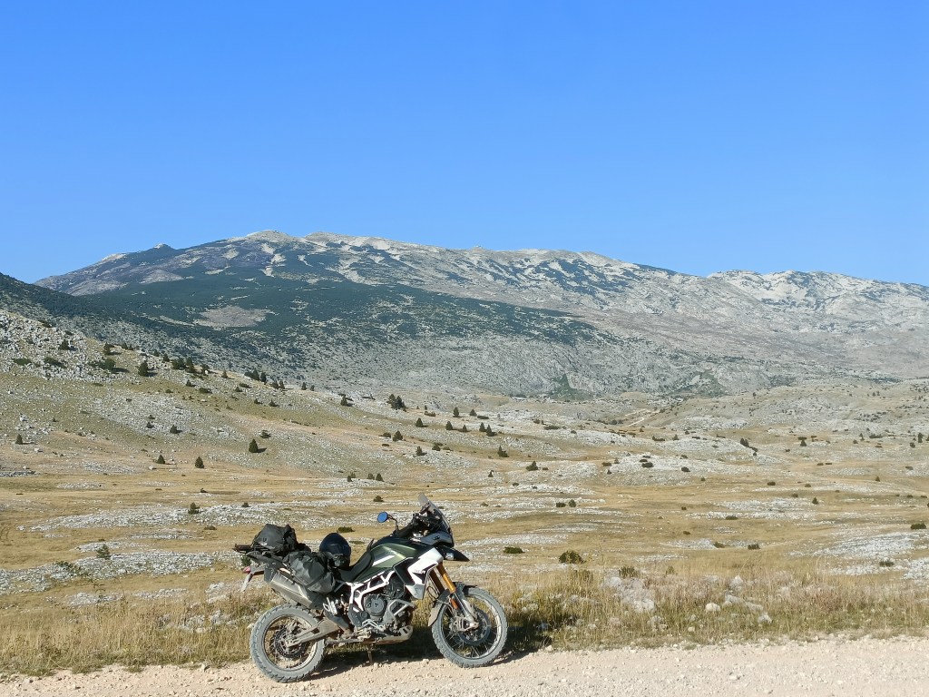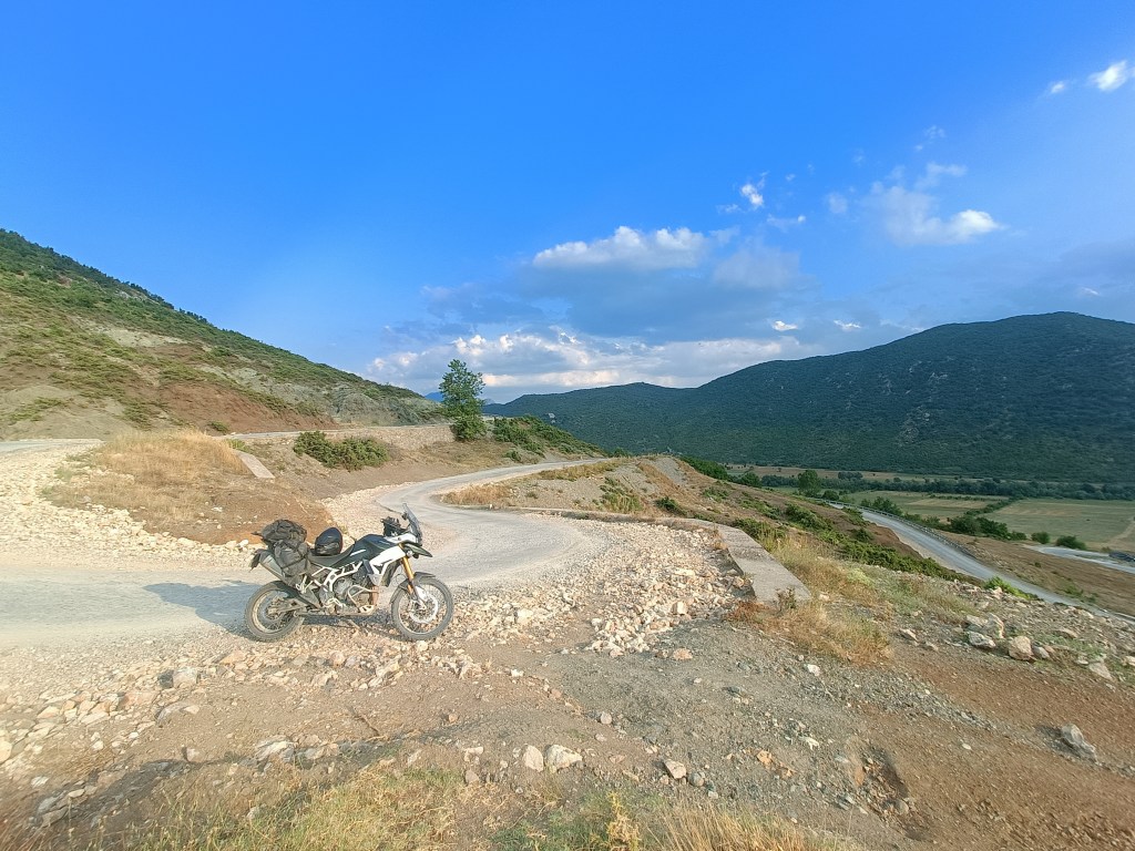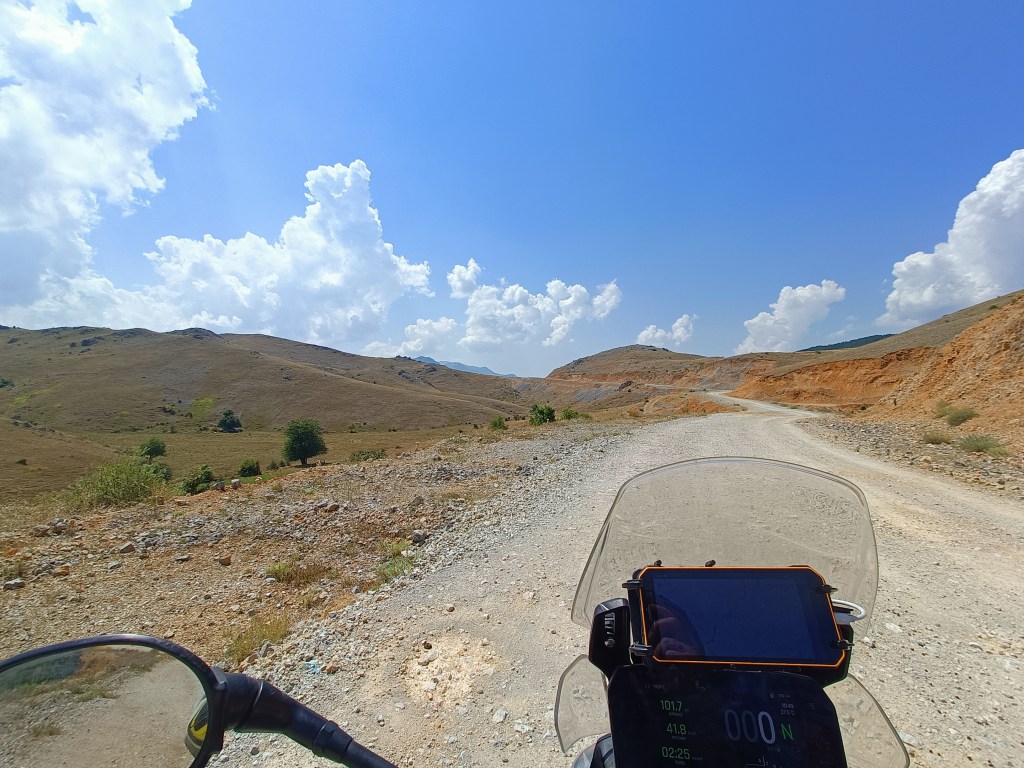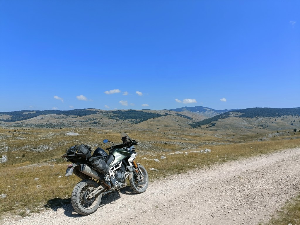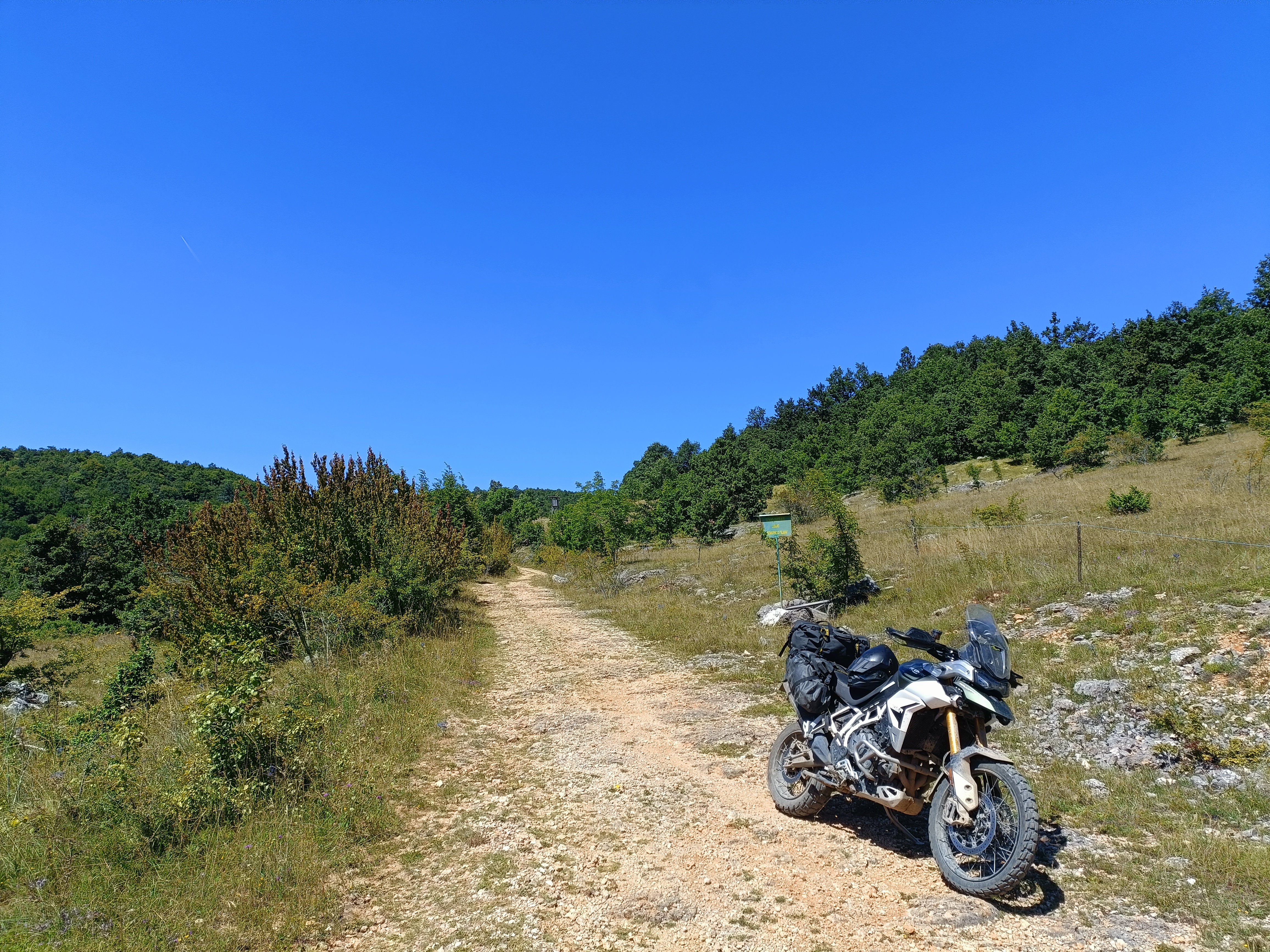 Mon choix s’est donc porté sur un grand tour de la mer Adriatique jusqu’au nord de la Grèce, en mixant mes propres traces pour la France et l’Italie, essentiellement sur routes pour l’Italie, à l’exception de quelques pistes bien connues (Assietta, Finestre, Lombardo, Giogo del Balà) et autoroutes pour la France (à l’exception du Parpaillon), pour progresser assez vite et avoir assez de temps pour suivre une grande partie des traces du Trans European Trail pour la Slovénie, la Croatie, la Bosnie, le Monténégro et l’Albanie, où j’aurais passé une majorité du temps dans la poussière, les caillasses, la terre, bref, là où généralement nature et paysages émerveillent votre progression. Au total, 7135km réalisés avec la Triumph pendant que la GasGas patientait dans le garage, des moyennes de 500km pour les journées routières, aux alentours de 250km pour les journées hors routes.