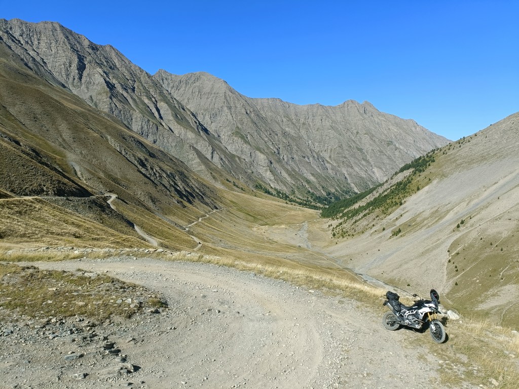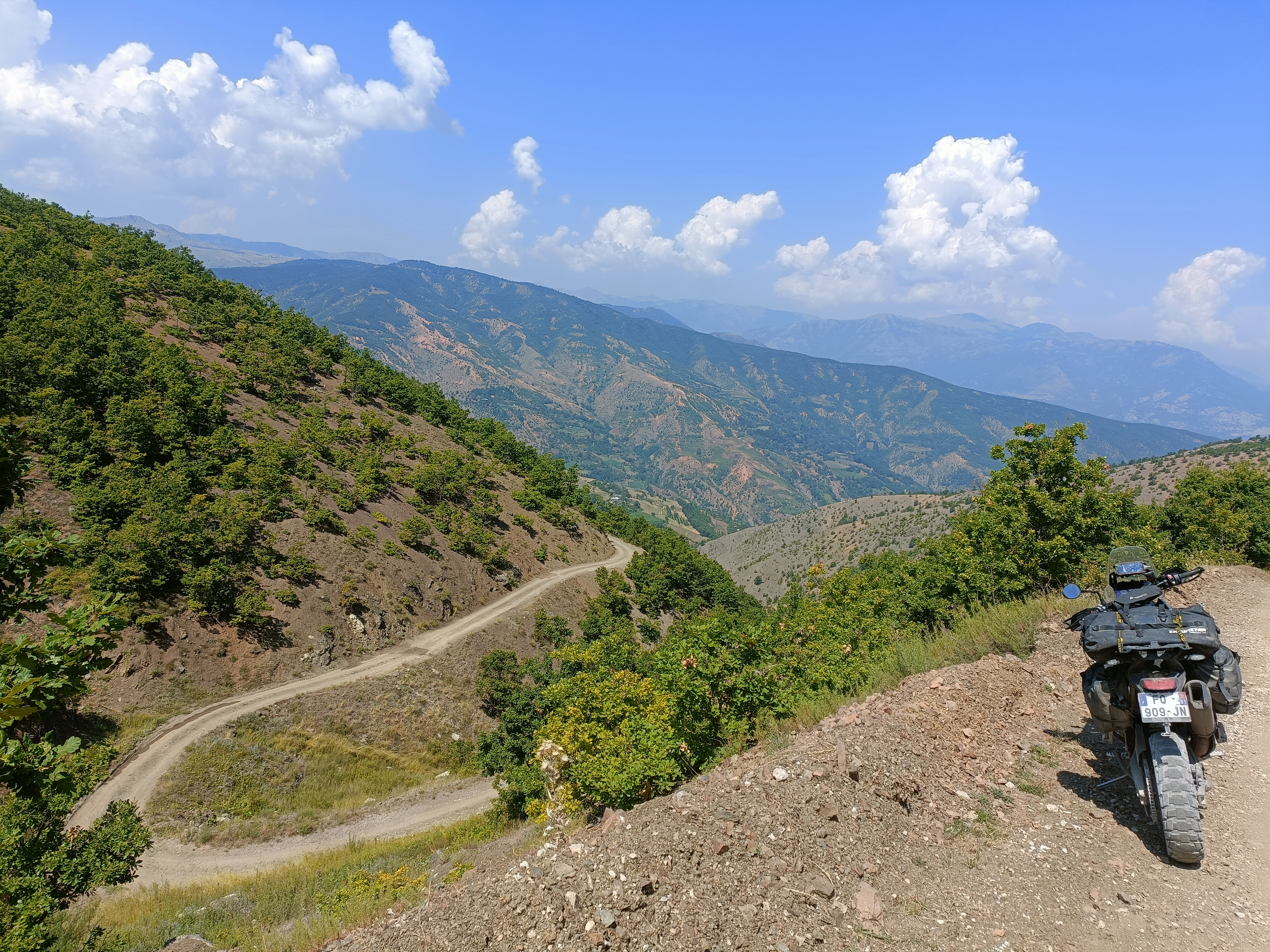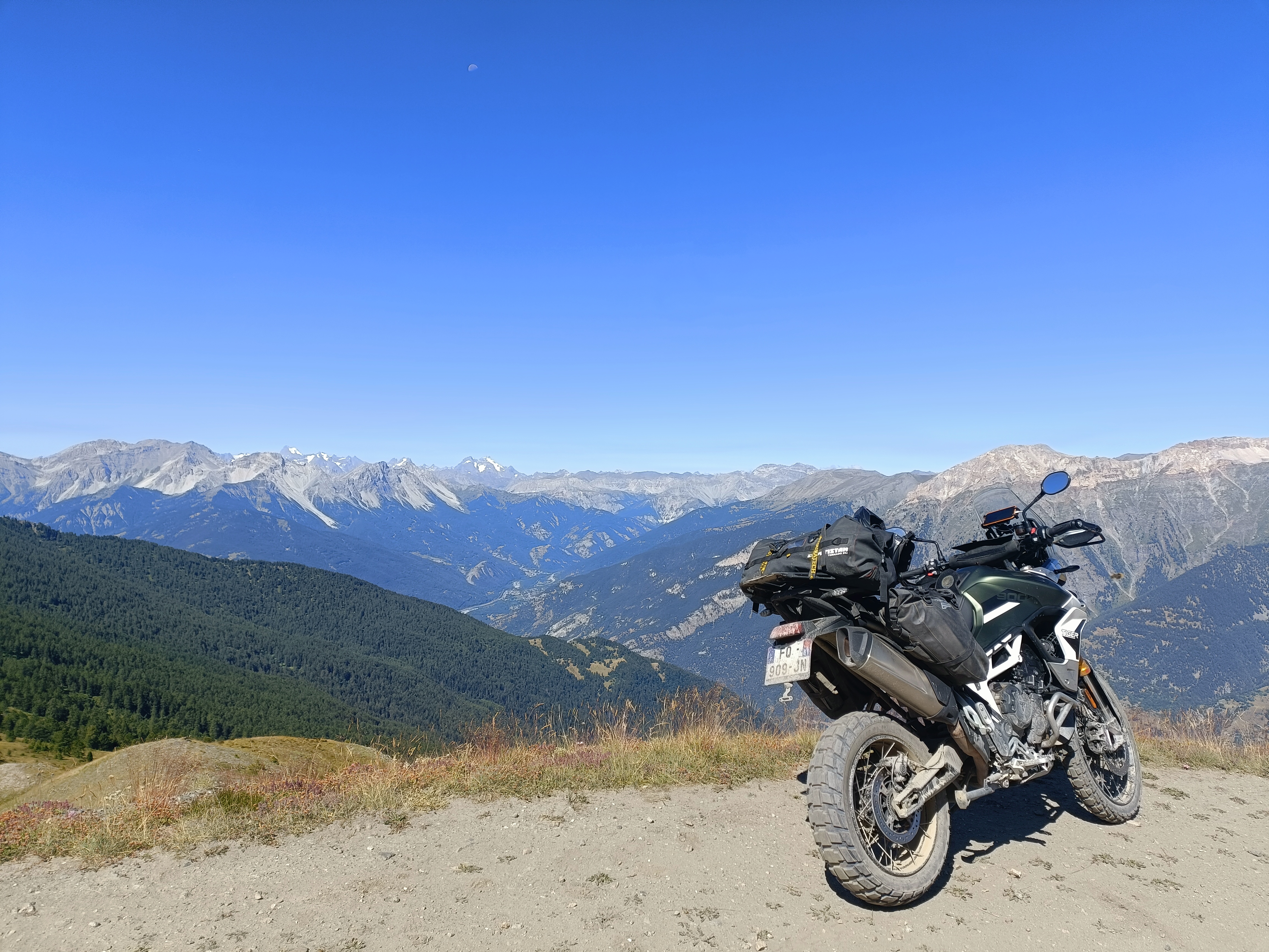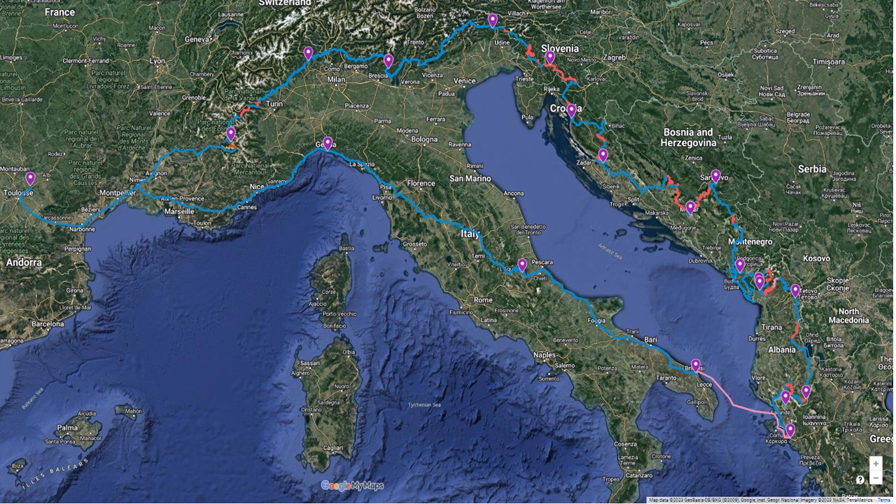 Mon choix s’est donc porté sur un grand tour de la mer Adriatique jusqu’au nord de la Grèce, en mixant mes propres traces pour la France et l’Italie, essentiellement sur routes pour l’Italie, à l’exception de quelques pistes bien connues (Assietta, Finestre, Lombardo, Giogo del Balà) et autoroutes pour la France (à l’exception du Parpaillon), pour progresser assez vite et avoir assez de temps pour suivre une grande partie des traces du Trans European Trail pour la Slovénie, la Croatie, la Bosnie, le Monténégro et l’Albanie, où j’aurais passé une majorité du temps dans la poussière, les caillasses, la terre, bref, là où généralement nature et paysages émerveillent votre progression. Au total, 7135km réalisés avec la Triumph pendant que la GasGas patientait dans le garage, des moyennes de 500km pour les journées routières, aux alentours de 250km pour les journées hors routes.