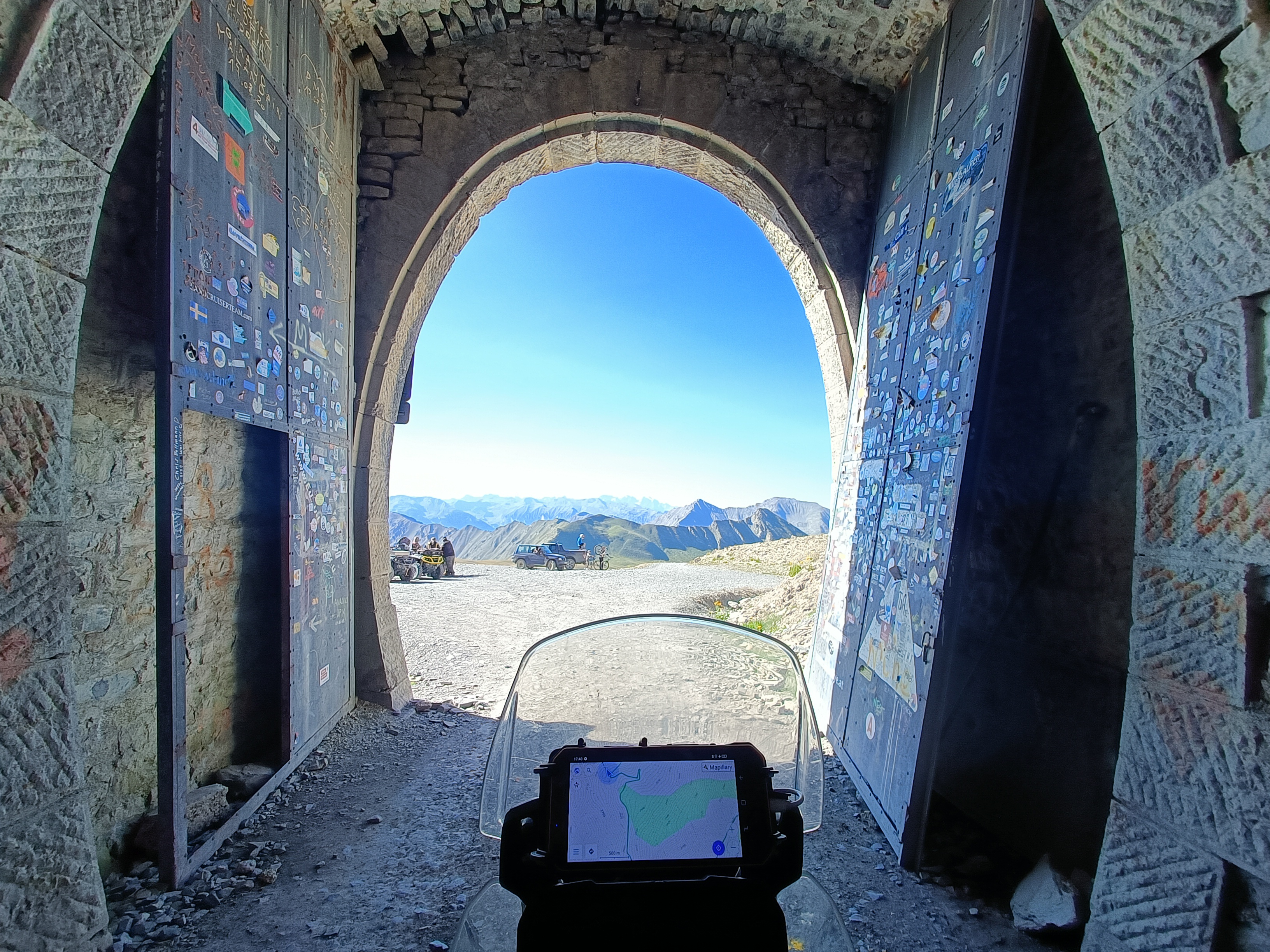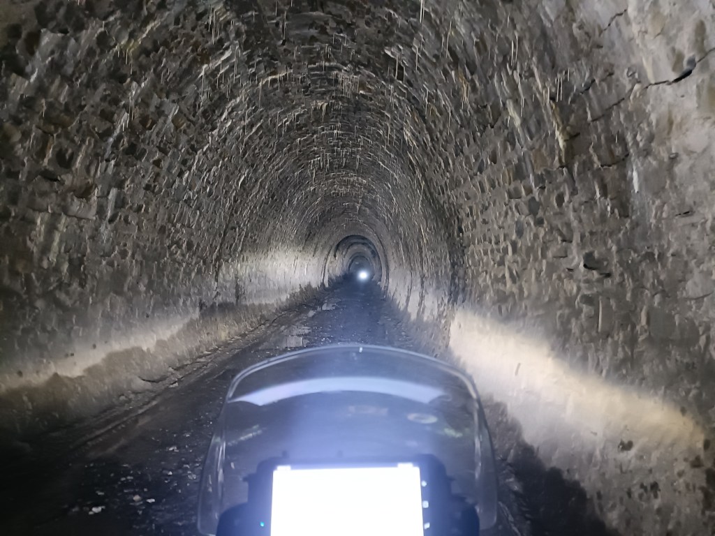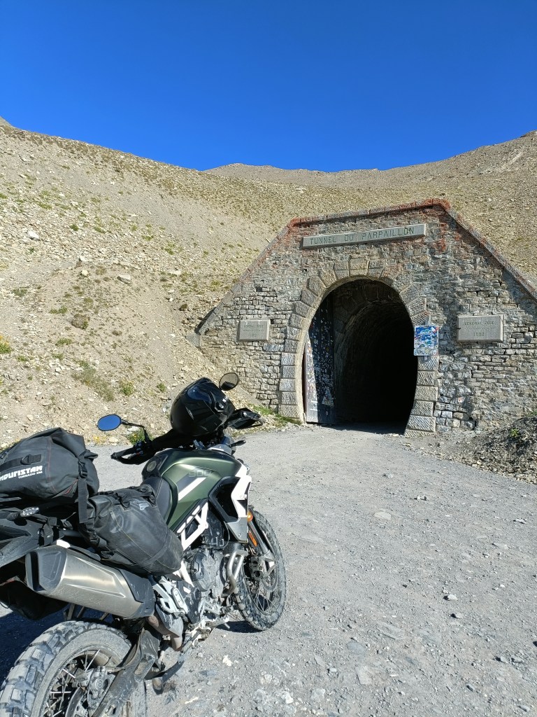 Le périple débute par 400km lancinants d’autoroutes pour rejoindre Nyons dans la Drome, puis Barcelonnette, et enfin, débuter par le Sud le col du Parpaillon. La piste est relativement facile, même si quelques passages présentent des difficultés nécessitant de décrocher un instant son regard des magnifiques paysages pour se concentrer sur la trace. Arrivé au sommet, vers 2650m tout de même, se présente le tunnel du Parpaillon, percé par le Génie Militaire à la fin du XIXème siècle. 520 mètres dans l’obscurité totale, sous d’impressionnantes stalactites formées au fil du temps, et sur un lit d’eau et de cailloux au sol. A la sortie, on domine la vallée d’Embrun, et la descente, très facile par une large piste, nous amène à Crevoux, où le soleil se couche. Sustentons-nous local: Ravioles du Champsaur, qui, comme leur nom ne l’indique pas, sont des quenelles de tomme fraiche et pommes de terre. (« surtout pas trop de crème s’il vous plait »…. trop tard)