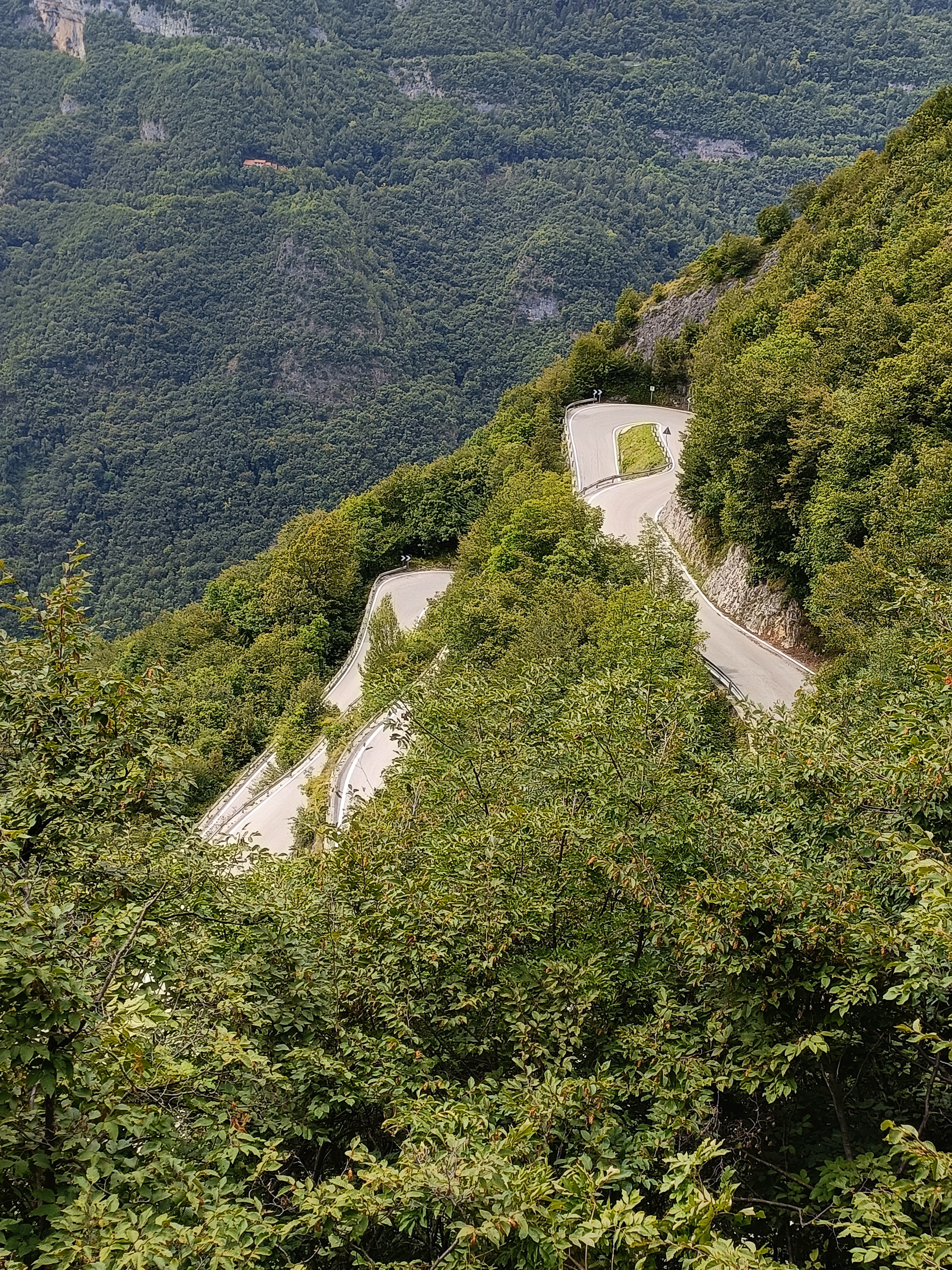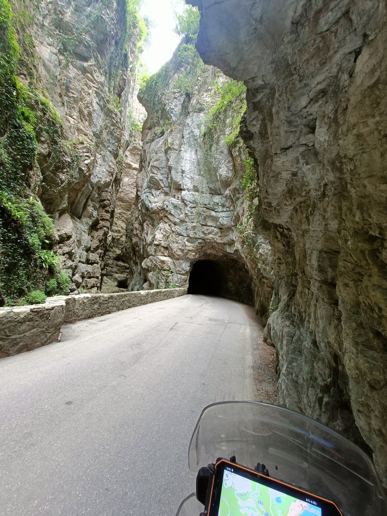 Très tôt le matin, avant que le cul à cul des voitures ne congestionne les abords du Lac de Garde, j’entame la magnifique route qui le longe du côté ouest (plus impressionnante que celle côté est). On circule au pied de falaises au milieu de beaux villages et somptueuses bâtisses posées au bord des flots calmes du lac. Au milieu de la remontée du lac vers le nord, se trouve la « Strada della Forra », une petite route tortueuse qui monte à flanc de falaise et entre dans une gorge extrêmement étroite.