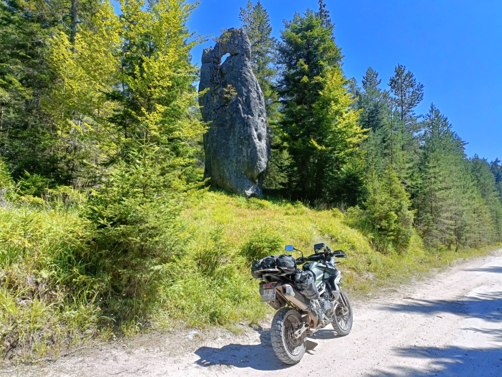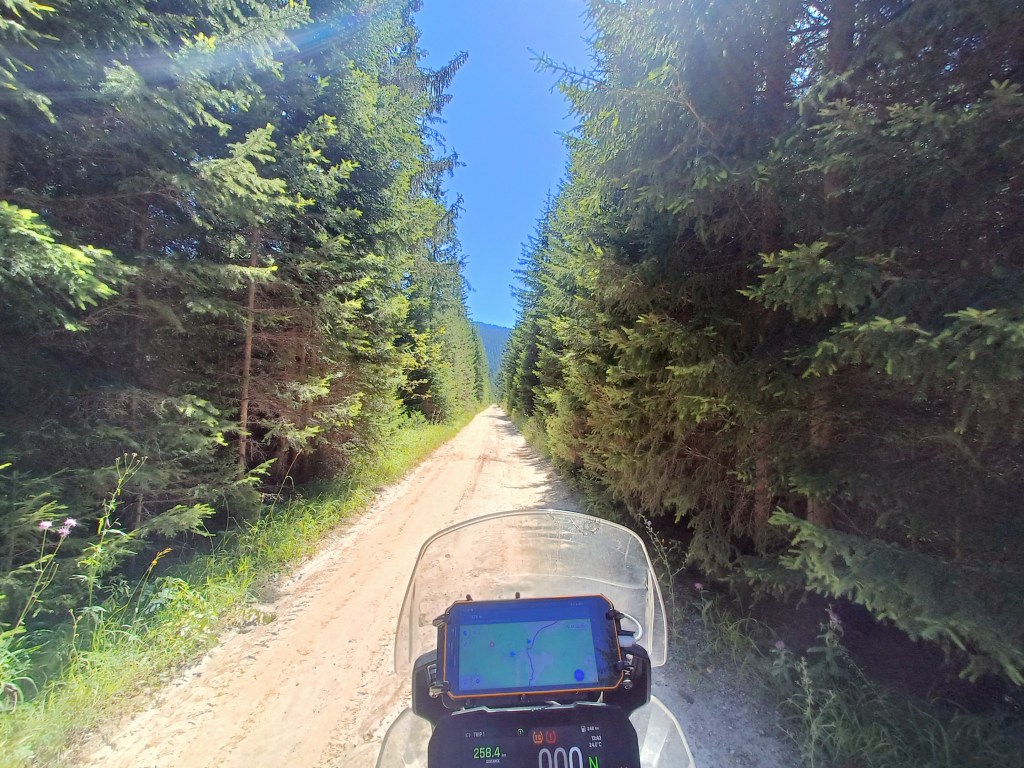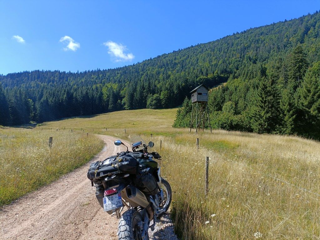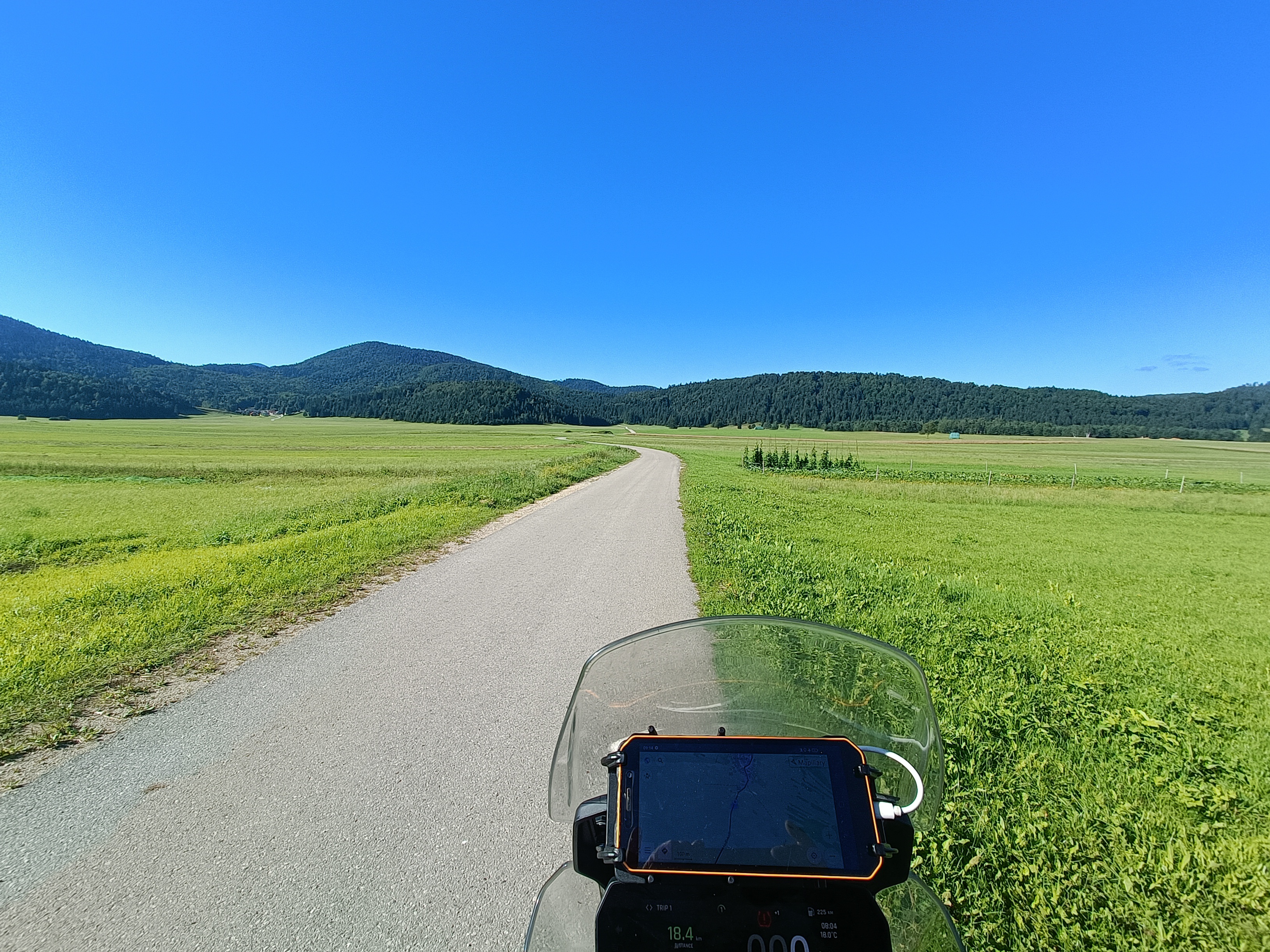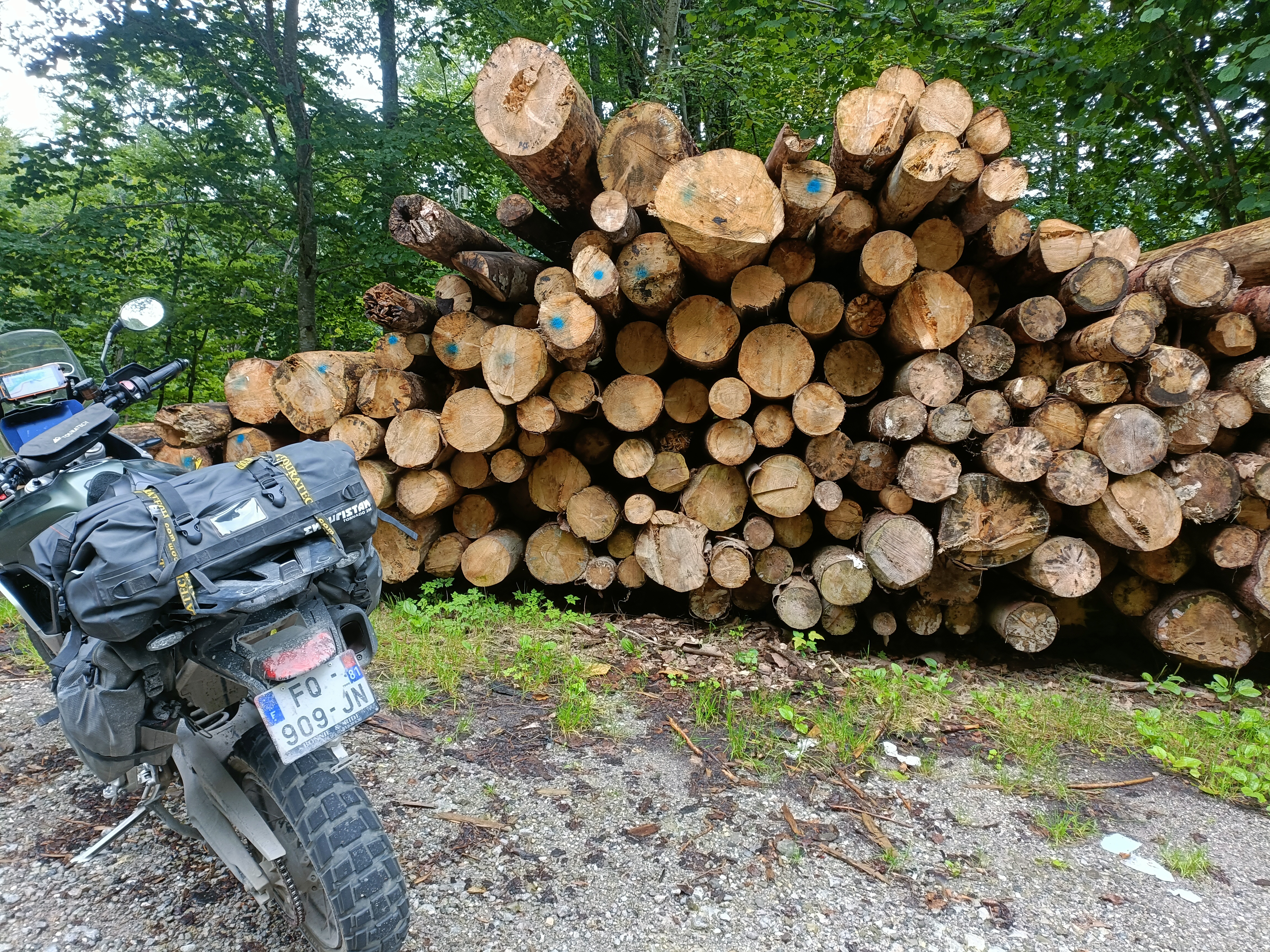 J’atteins le matin la frontière slovène par le « Passo di Sella Carnizza », que je ne sais qualifier de route ou de piste, mais dont les pentes et la beauté de la végétation marquent la traversée. L’étroitesse aussi, puisque j’ai du tutoyer le ravin pour doubler…. une autre moto. Me voilà désormais dans les paysages slovènes où je quitterai le bitume pour toute la journée, pour naviguer au travers de pistes forestières de moyennes montagnes à la végétation denses, aux rivières à l’eau couleur turquoise et aux étangs hébergeant une faune riche d’échassiers (et ces p…. de moustiques). Une myriade de curiosités géologiques, tels d’énormes rochers en équilibre précaire ou des rivières souterraines qui surgissent en contrebas de la piste. Et des barrages appelés « brusoves » construits au 18ième siècle et classés par l’Unesco. Une chance qu’aucune route bitumée ne permette de les rejoindre. Je parviens en fin de journée alors que le soleil se couche au sommet de mont Slivnica, duquel une vue à 360 degré se dégage sur les paysages slovènes. Je passerai la nuit dans le refuge, où visiblement le tenancier craint que je sois sous alimenté et sous hydraté.