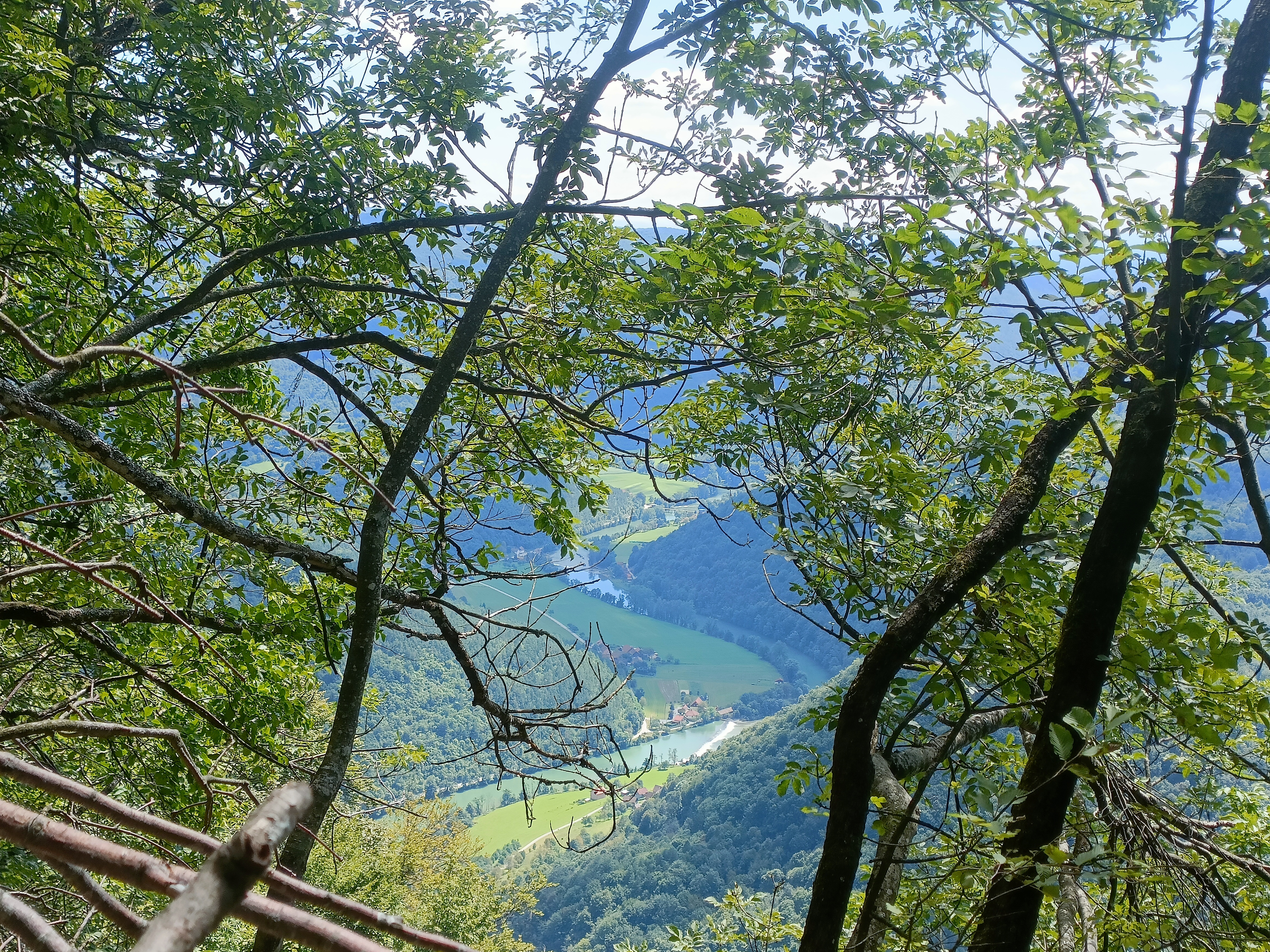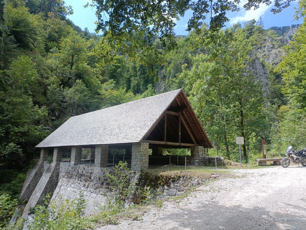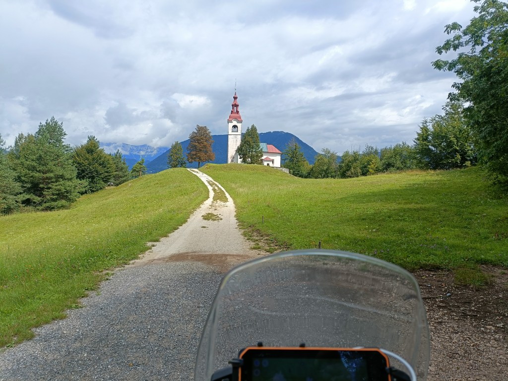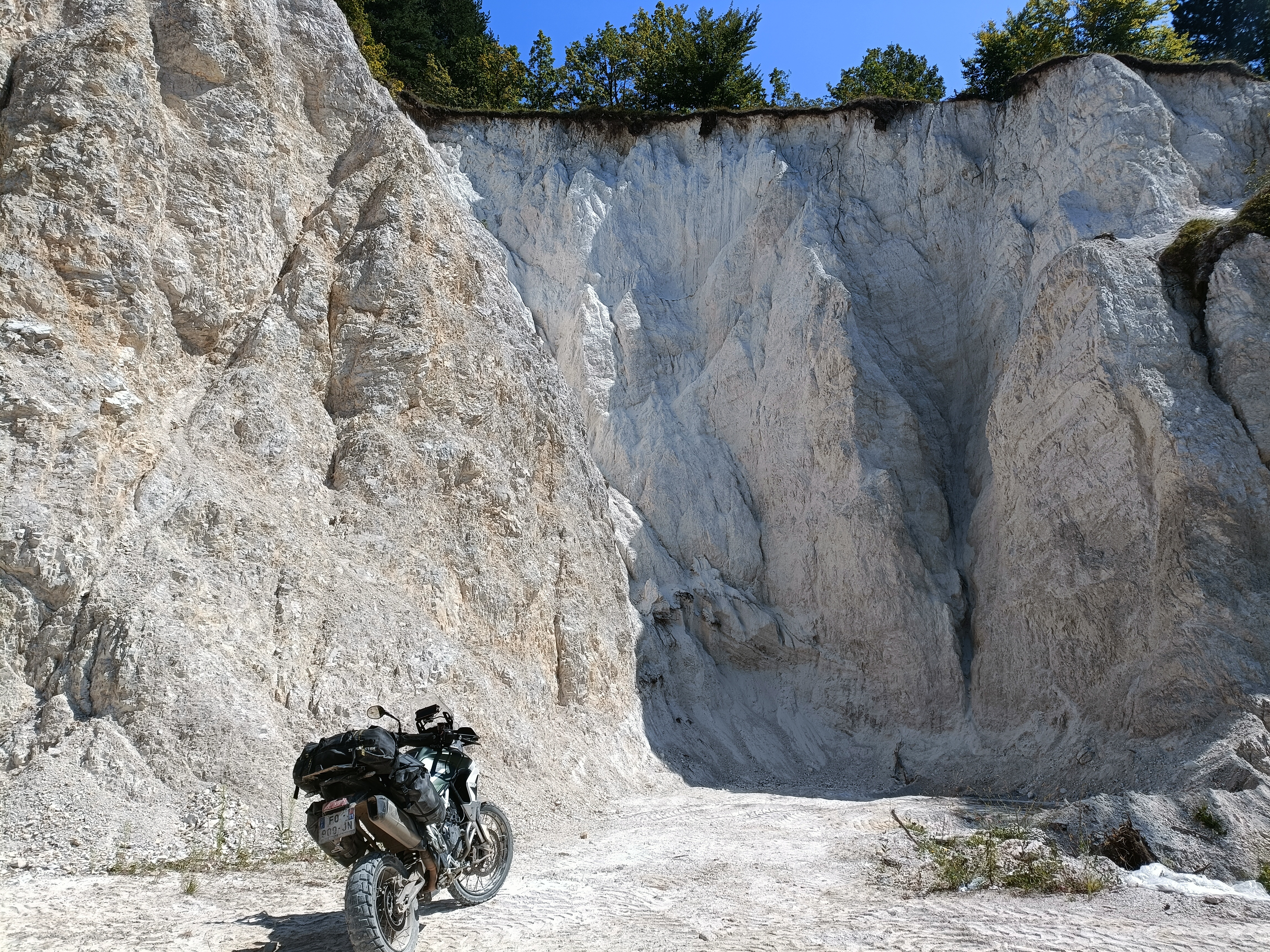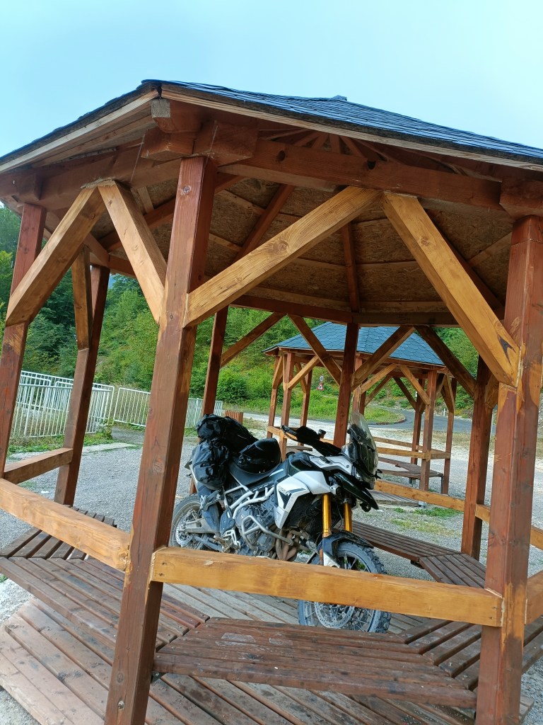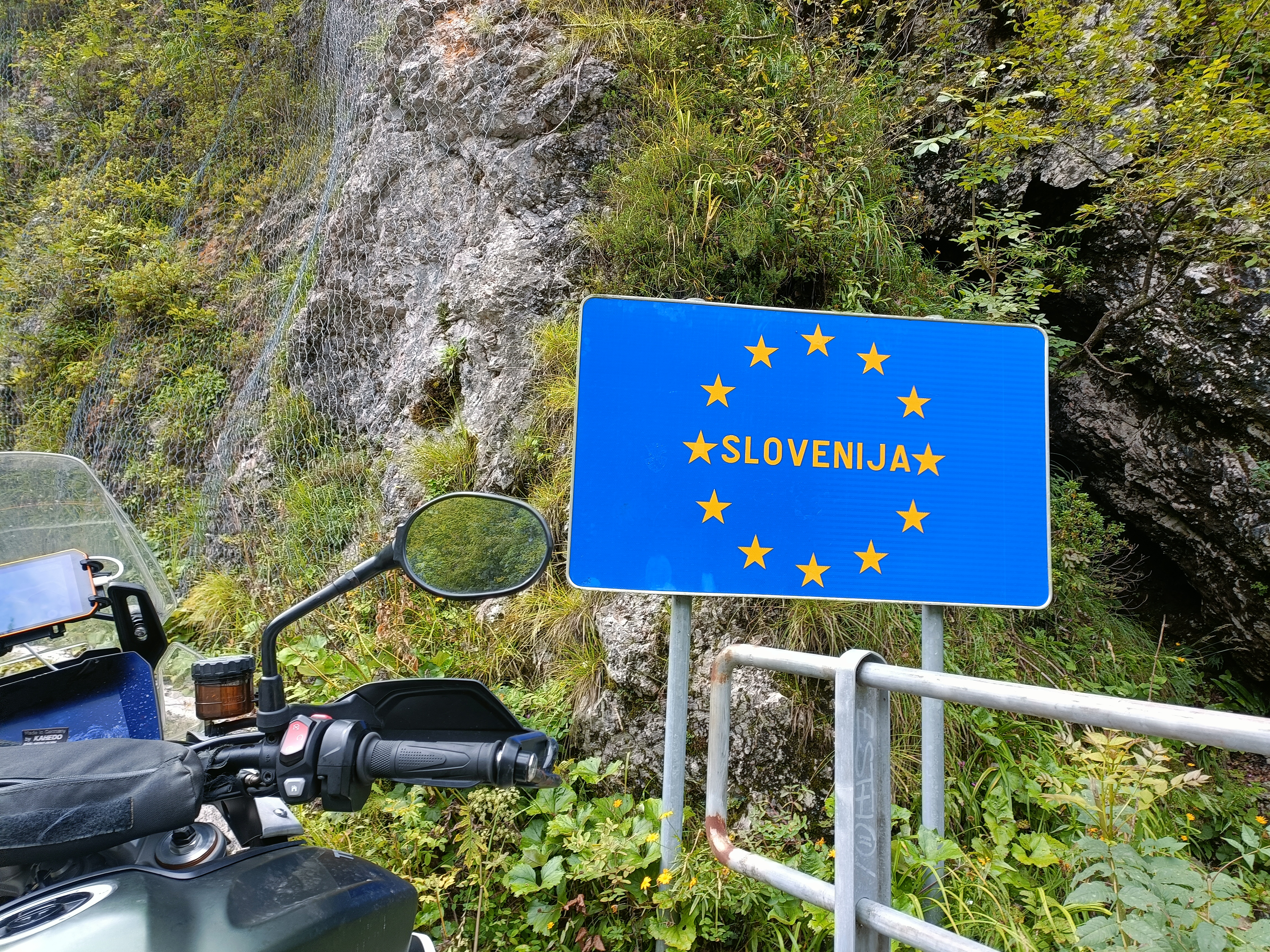 J’atteins le matin la frontière slovène par le « Passo di Sella Carnizza », que je ne sais qualifier de route ou de piste, mais dont les pentes et la beauté de la végétation marquent la traversée. L’étroitesse aussi, puisque j’ai du tutoyer le ravin pour doubler…. une autre moto. Me voilà désormais dans les paysages slovènes où je quitterai le bitume pour toute la journée, pour naviguer au travers de pistes forestières de moyennes montagnes à la végétation denses, aux rivières à l’eau couleur turquoise et aux étangs hébergeant une faune riche d’échassiers (et ces p…. de moustiques). Une myriade de curiosités géologiques, tels d’énormes rochers en équilibre précaire ou des rivières souterraines qui surgissent en contrebas de la piste. Et des barrages appelés « brusoves » construits au 18ième siècle et classés par l’Unesco. Une chance qu’aucune route bitumée ne permette de les rejoindre. Je parviens en fin de journée alors que le soleil se couche au sommet de mont Slivnica, duquel une vue à 360 degré se dégage sur les paysages slovènes. Je passerai la nuit dans le refuge, où visiblement le tenancier craint que je sois sous alimenté et sous hydraté.