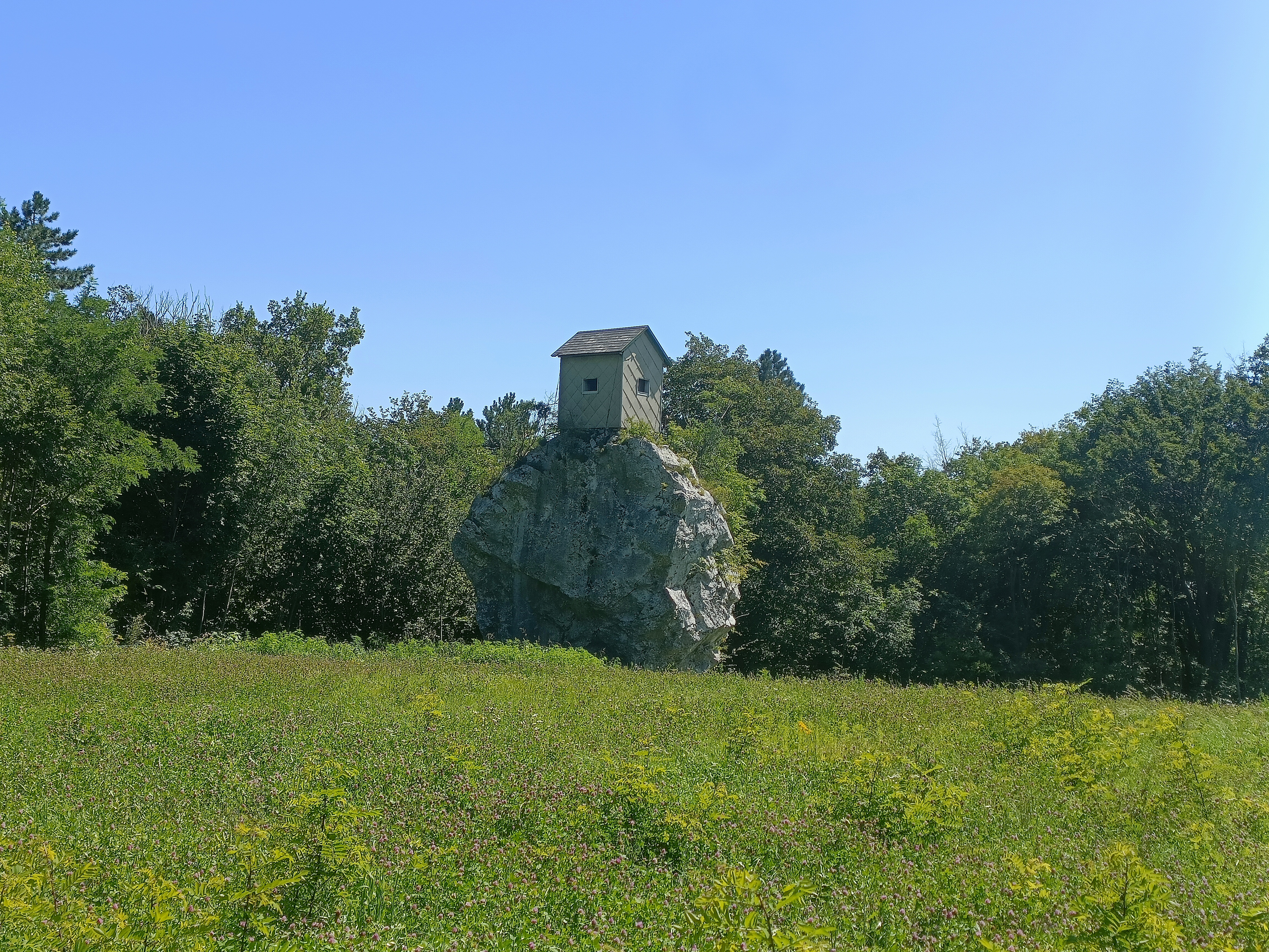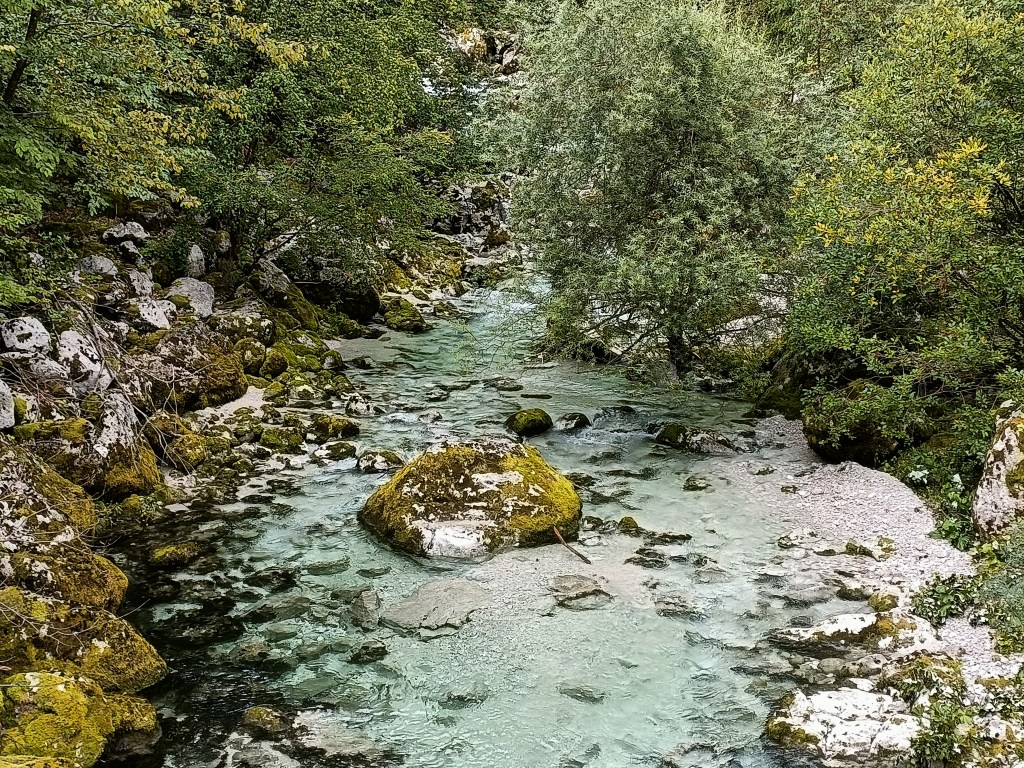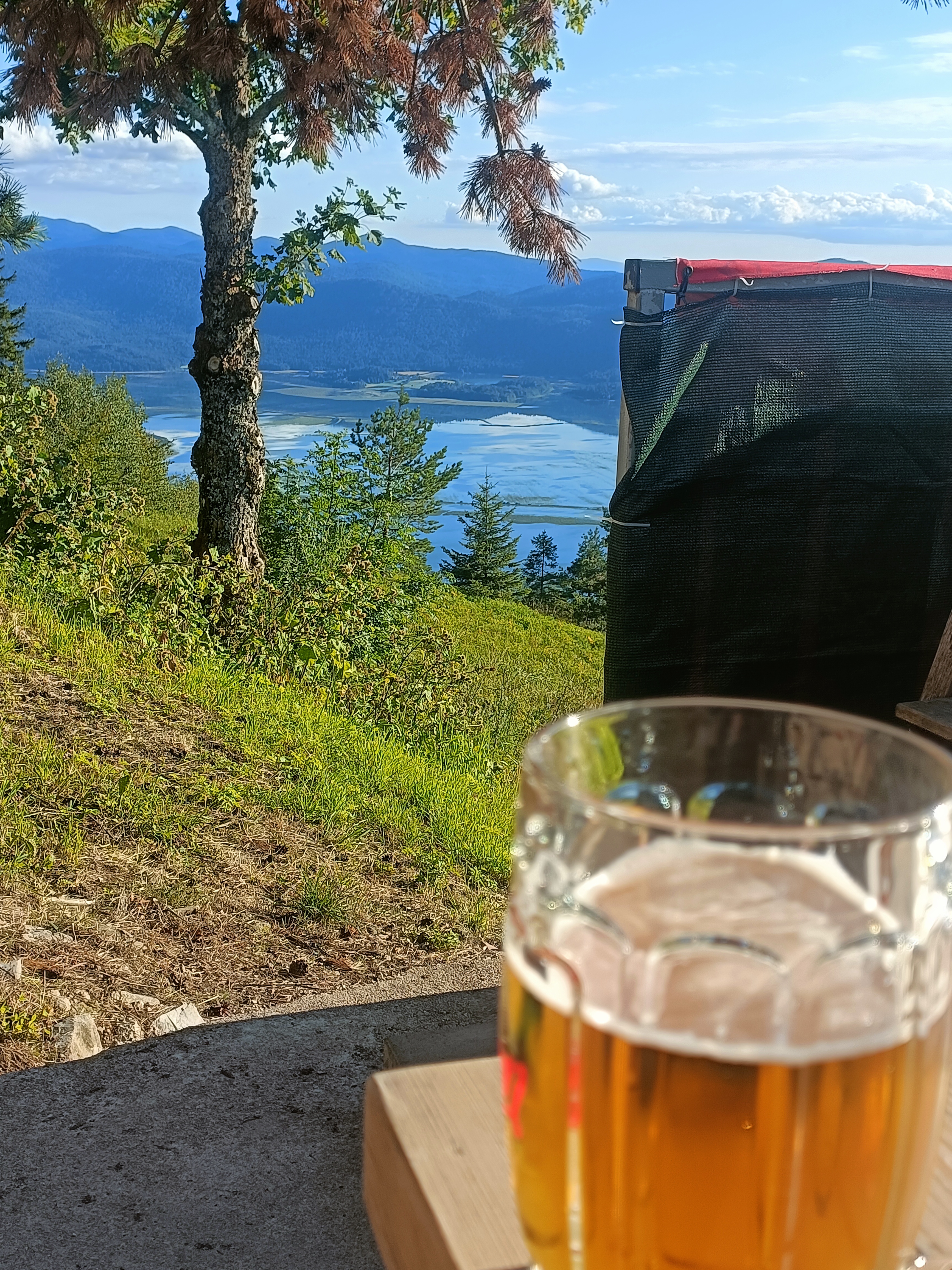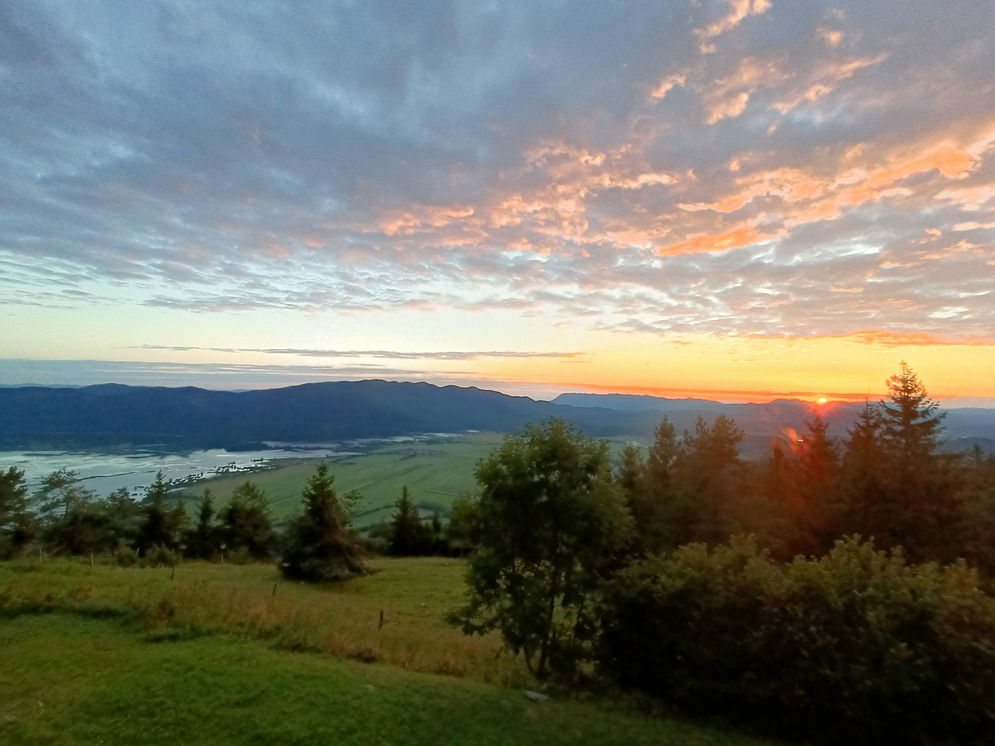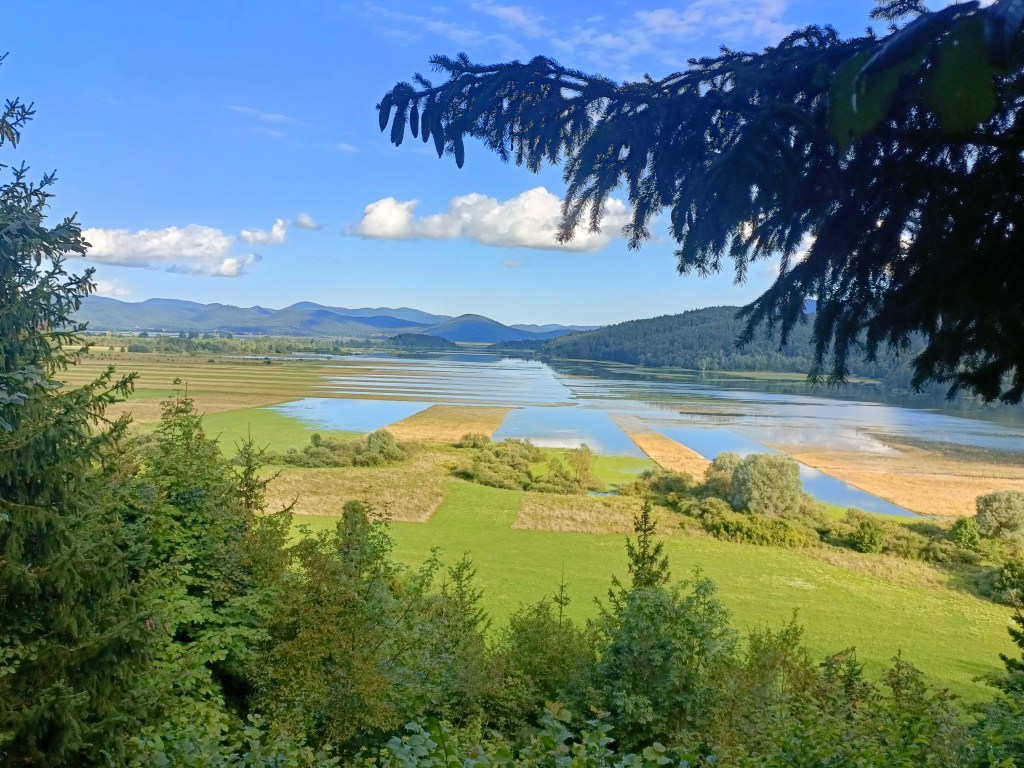 J’atteins le matin la frontière slovène par le « Passo di Sella Carnizza », que je ne sais qualifier de route ou de piste, mais dont les pentes et la beauté de la végétation marquent la traversée. L’étroitesse aussi, puisque j’ai du tutoyer le ravin pour doubler…. une autre moto. Me voilà désormais dans les paysages slovènes où je quitterai le bitume pour toute la journée, pour naviguer au travers de pistes forestières de moyennes montagnes à la végétation denses, aux rivières à l’eau couleur turquoise et aux étangs hébergeant une faune riche d’échassiers (et ces p…. de moustiques). Une myriade de curiosités géologiques, tels d’énormes rochers en équilibre précaire ou des rivières souterraines qui surgissent en contrebas de la piste. Et des barrages appelés « brusoves » construits au 18ième siècle et classés par l’Unesco. Une chance qu’aucune route bitumée ne permette de les rejoindre. Je parviens en fin de journée alors que le soleil se couche au sommet de mont Slivnica, duquel une vue à 360 degré se dégage sur les paysages slovènes. Je passerai la nuit dans le refuge, où visiblement le tenancier craint que je sois sous alimenté et sous hydraté.