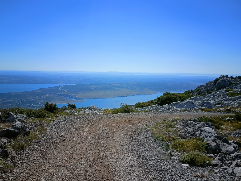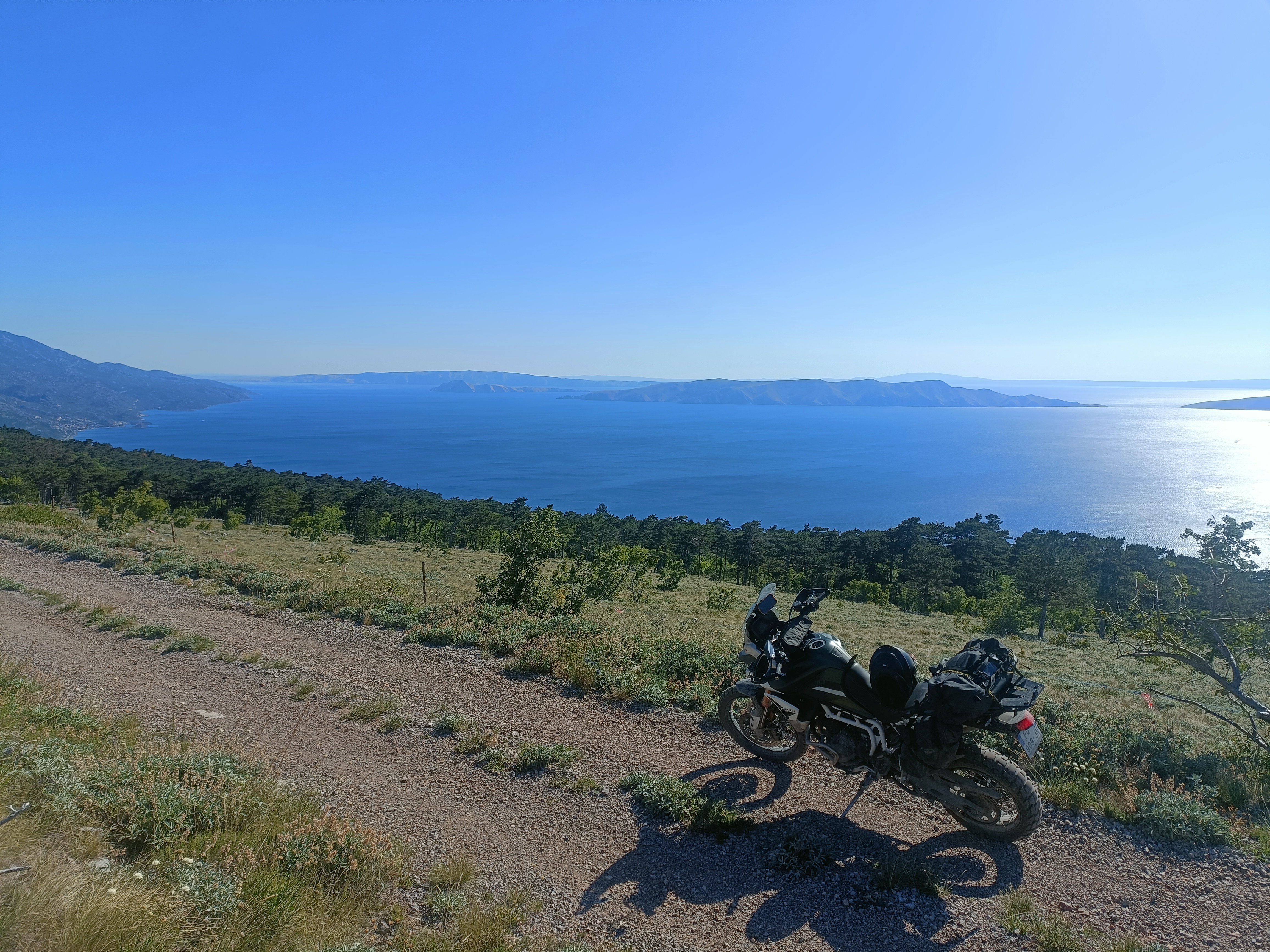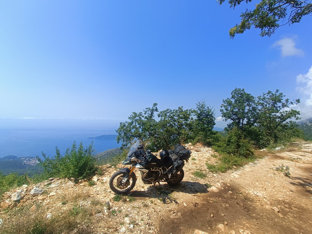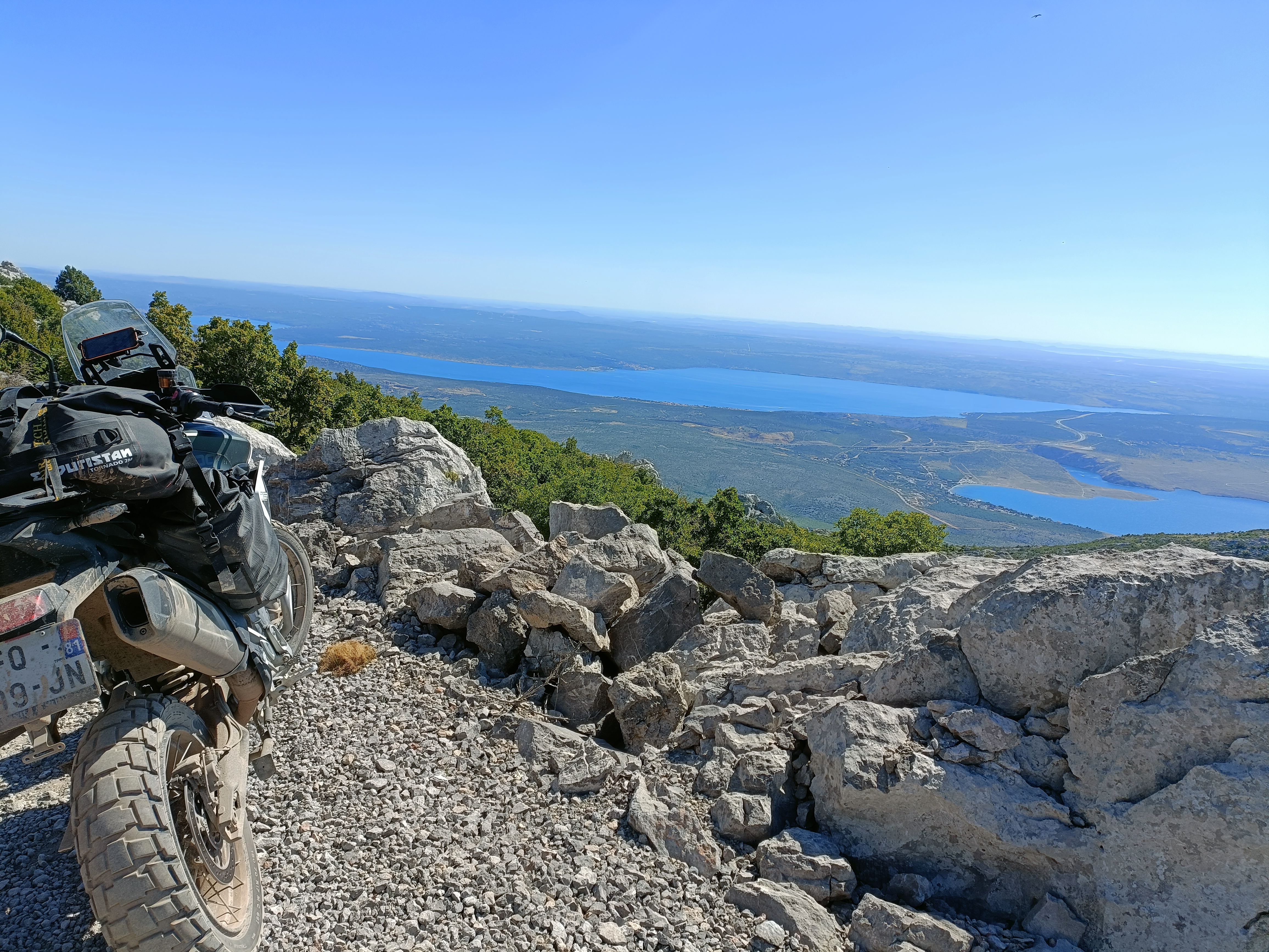 Je me redirige vers la côte par des pistes de plateaux parfois techniques parfois rapides, et un peu de route, pour rejoindre un des plus beaux spots off-road de la Croatie aux alentours de Sveti Rok. Une trentaine de kilomètres de pistes pour certaines très techniques, sur une crête à plus de 1000 mètres au dessus du bleu turquoise de l’Adriatique. Beaucoup de concentration et d’humilité pour les derniers kilomètres de descente vers Starigrad, on est parfois sur des pentes à plus de 20% dans des pierres roulantes. Les yeux vivent un véritable dilemme entre paysages et étude de la trajectoire. Wouafff, arrivé en bas trempé de sueur, ce sera direct dans l’adriatique rafraichir le pilote.