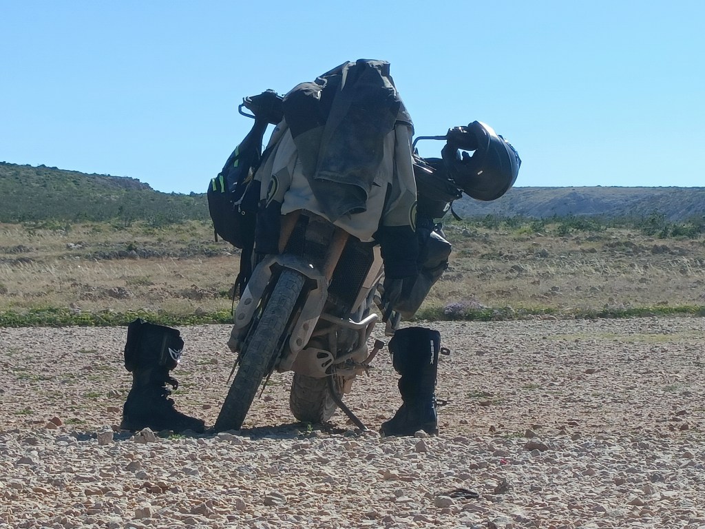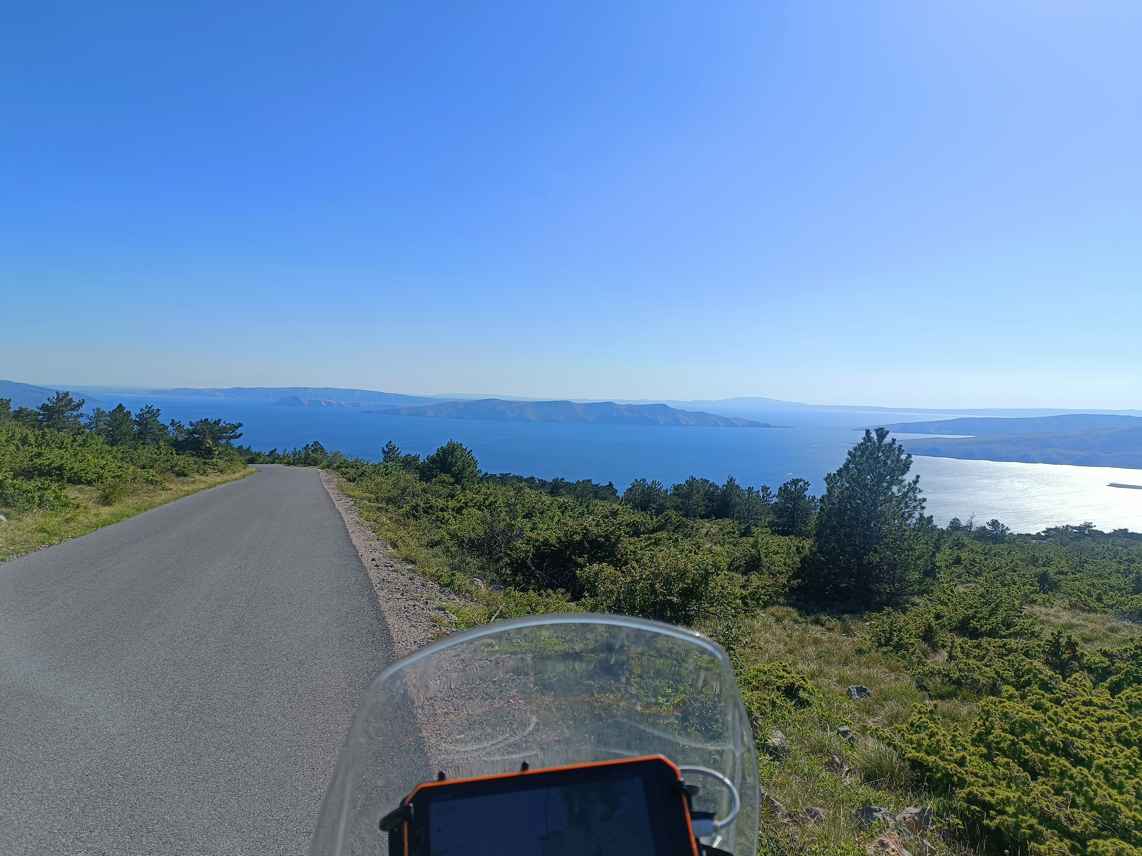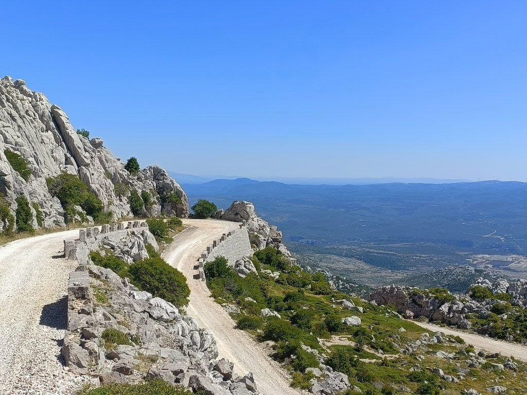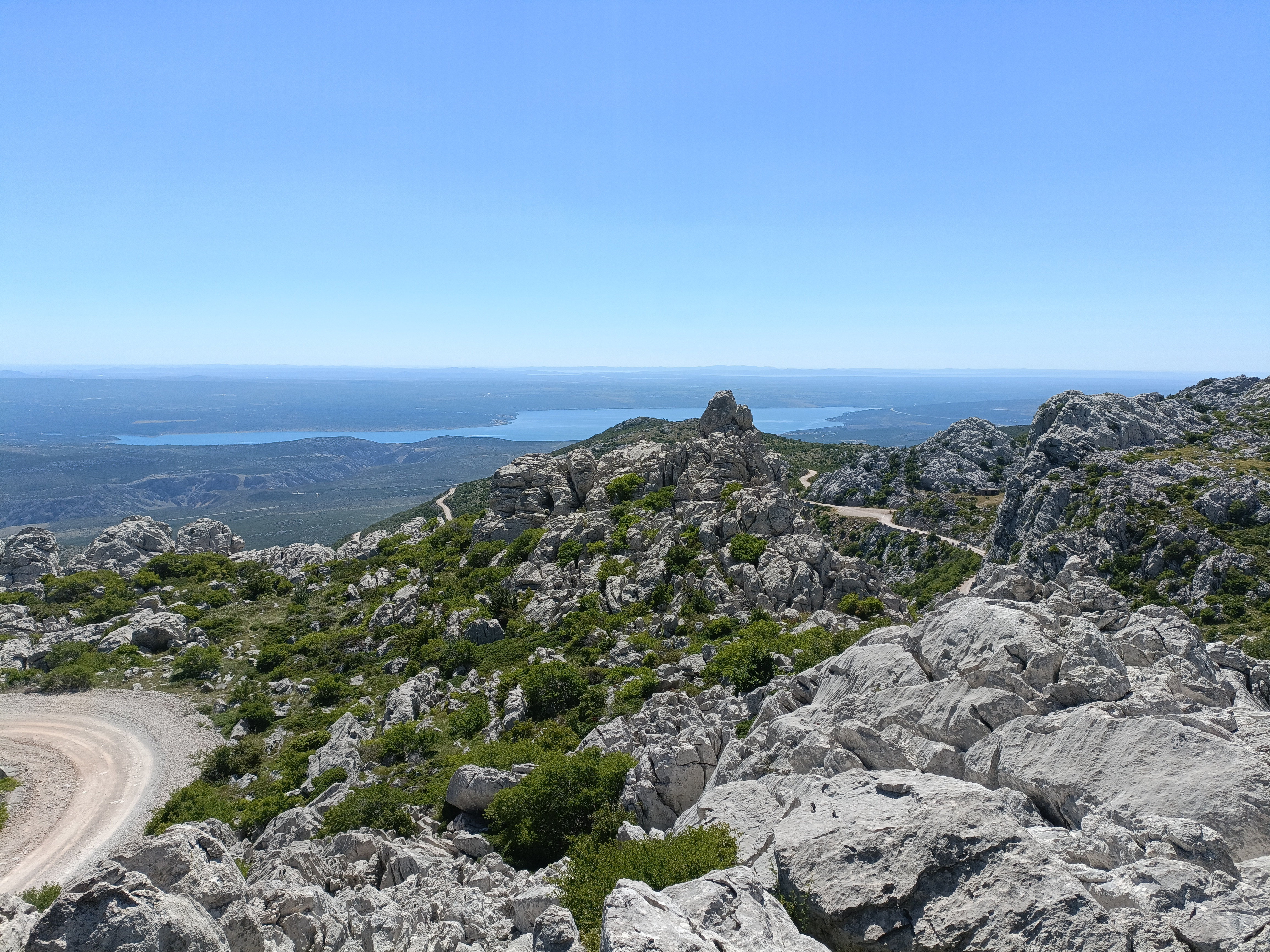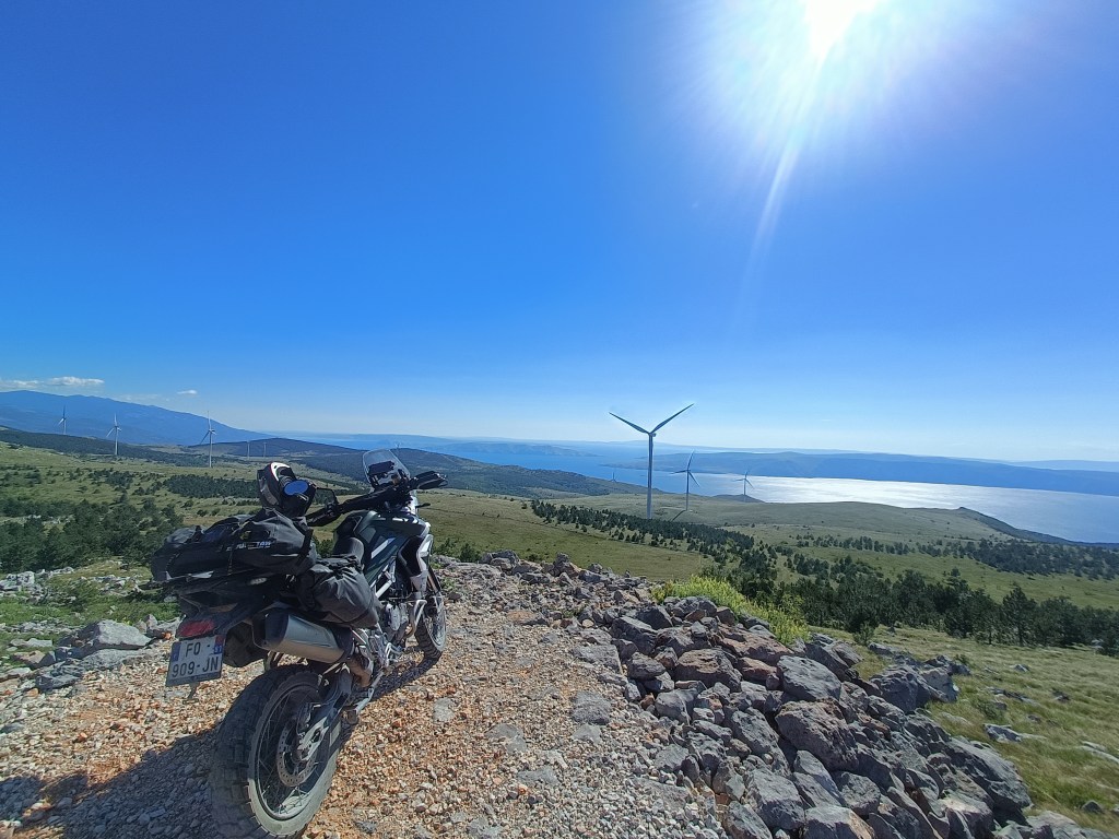 Je me redirige vers la côte par des pistes de plateaux parfois techniques parfois rapides, et un peu de route, pour rejoindre un des plus beaux spots off-road de la Croatie aux alentours de Sveti Rok. Une trentaine de kilomètres de pistes pour certaines très techniques, sur une crête à plus de 1000 mètres au dessus du bleu turquoise de l’Adriatique. Beaucoup de concentration et d’humilité pour les derniers kilomètres de descente vers Starigrad, on est parfois sur des pentes à plus de 20% dans des pierres roulantes. Les yeux vivent un véritable dilemme entre paysages et étude de la trajectoire. Wouafff, arrivé en bas trempé de sueur, ce sera direct dans l’adriatique rafraichir le pilote.