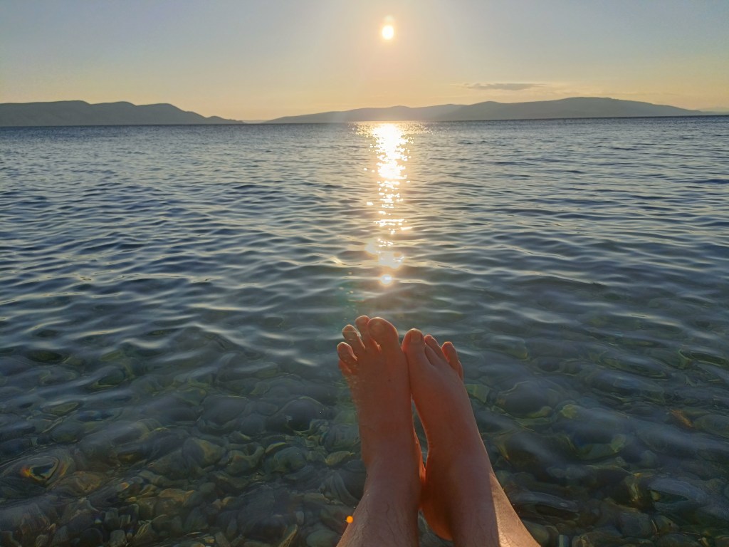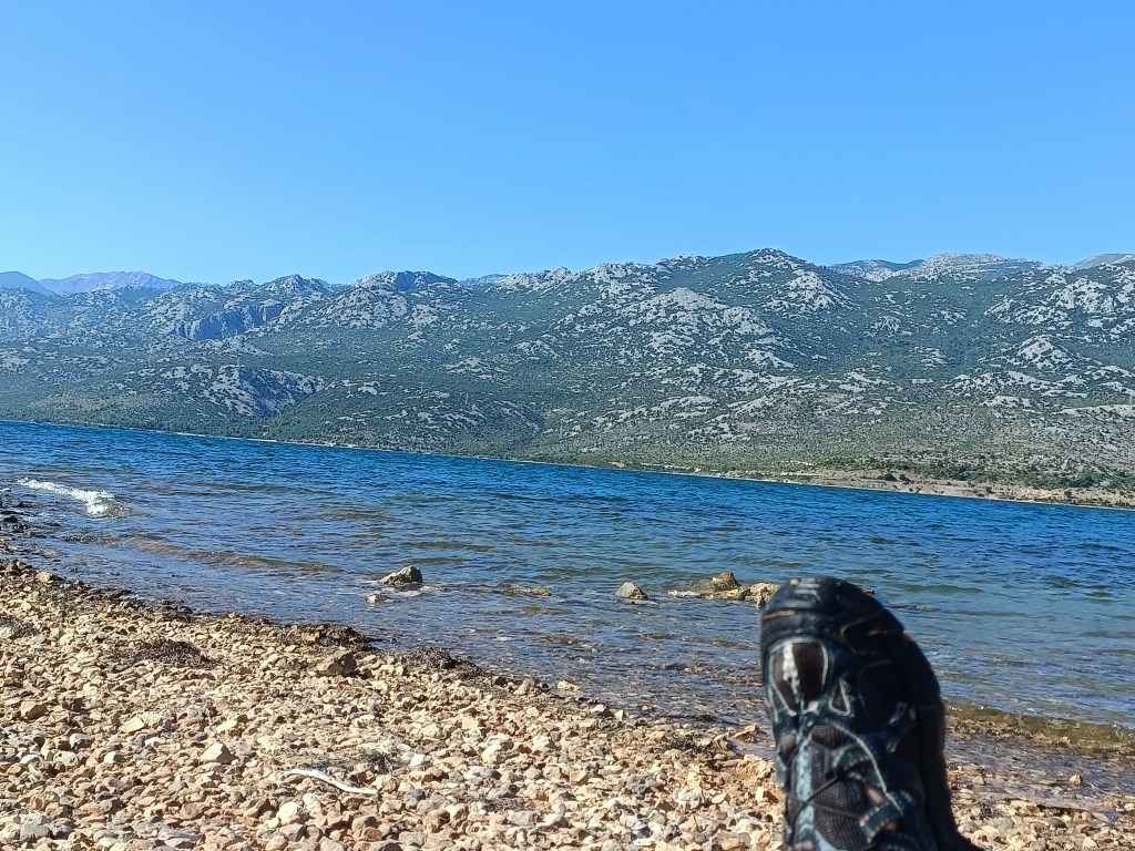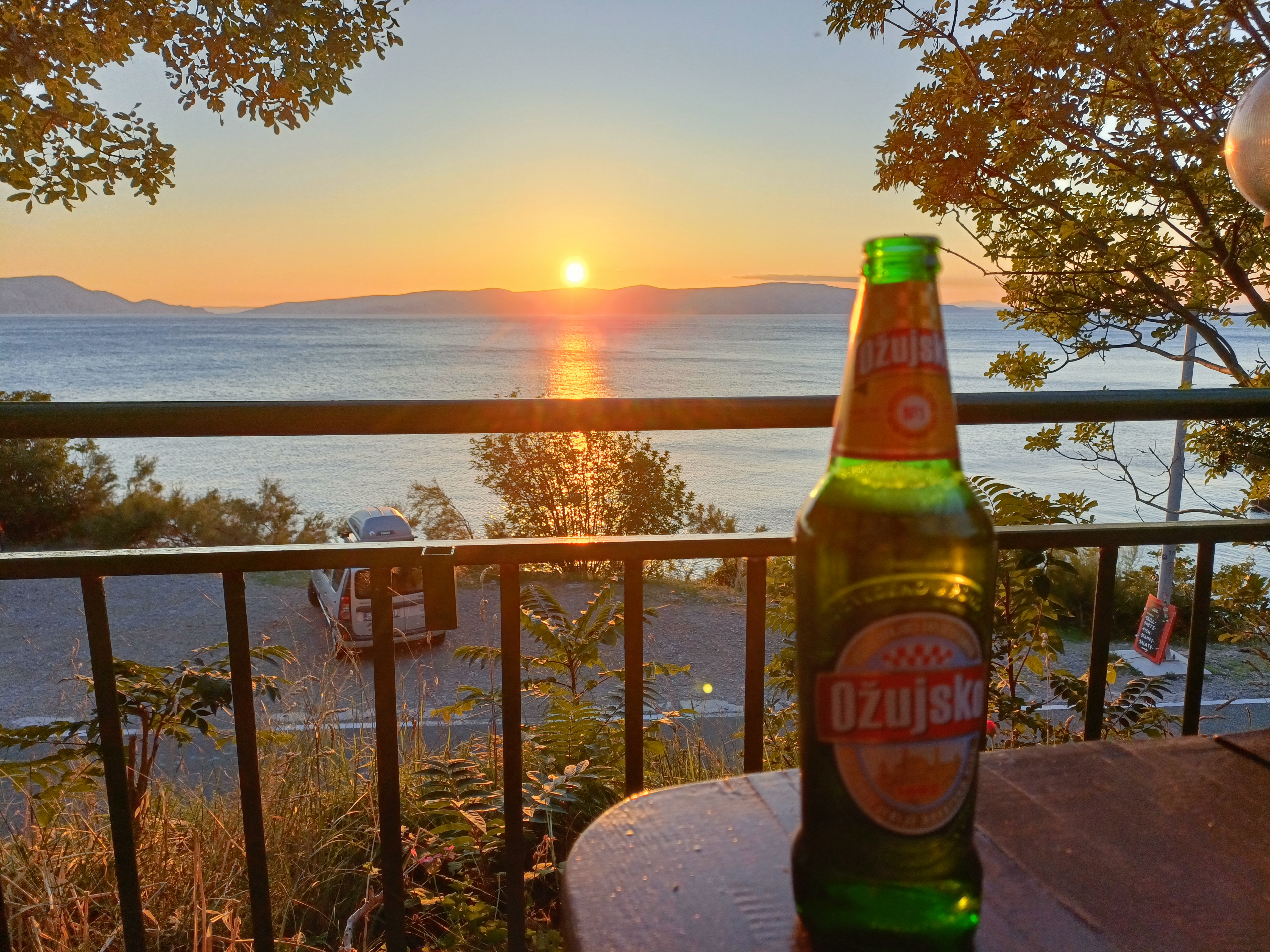 Voilà enfin au sixième jour les rives de l’Adriatique, en contrebas, saisies du regard du haut de pistes caillouteuses pendant une centaine de kilomètres assez exigeants physiquement (mais je rappelle que j’ai arrêté de fumer et que je n’ai pas encore épuisé mon stock de protéines de la veille). J’ai à deux reprises par le passé pu longer cette côte par la route, mais rien ne vaut de le faire par les hauteurs , car on surplombe l’ensemble de l’archipel d’iles. Surtout, on est à l’écart du tourisme de masse et on oublie les dégâts que ce dernier cause sur le paysage côtier. Je descends en fin de journée sur l’un des rares villages côtiers encore préservés, Stevi Juraj, pour m’y baigner au coucher du soleil, m’y houblonner et me délecter d’un bar grillé.