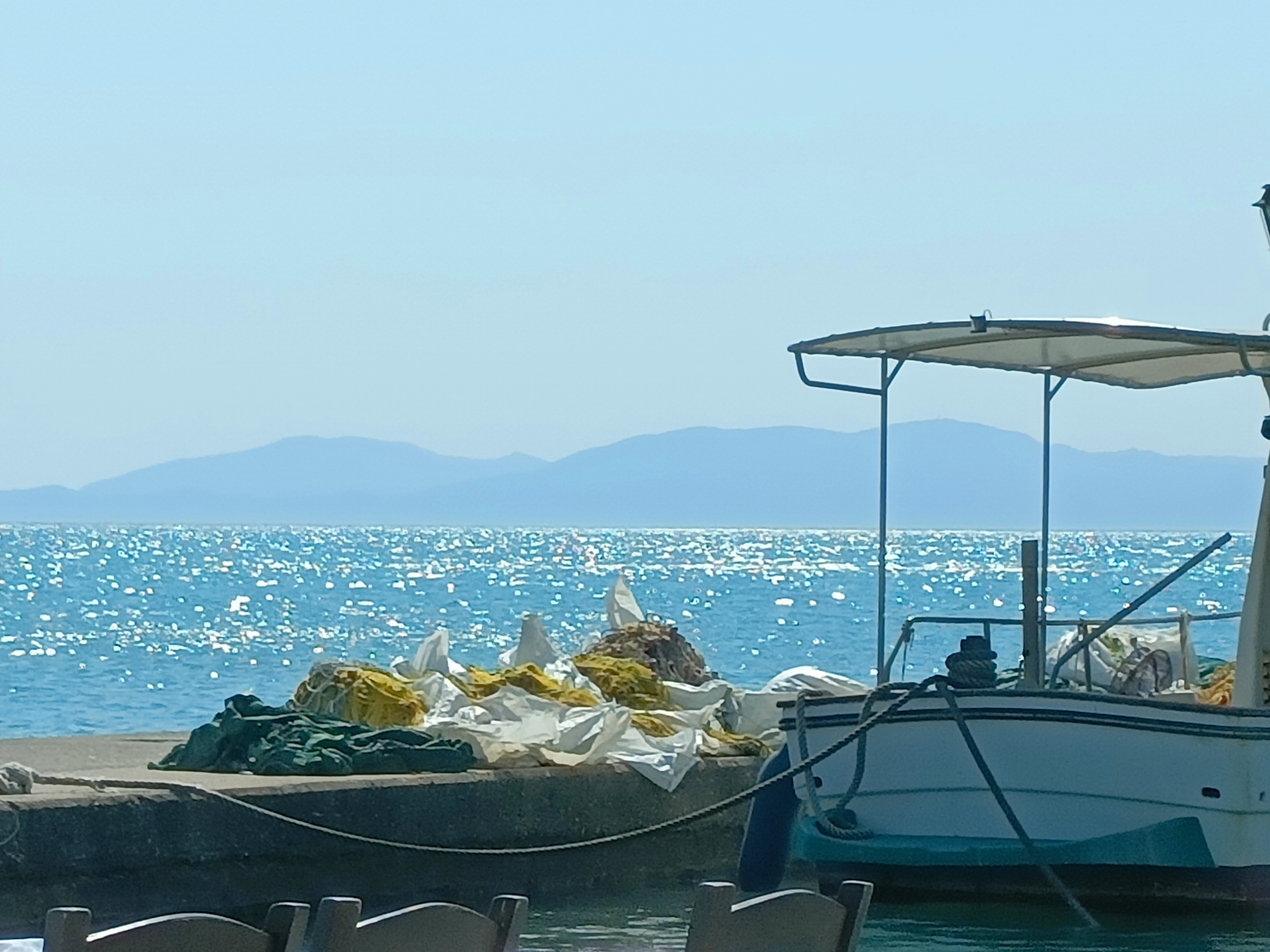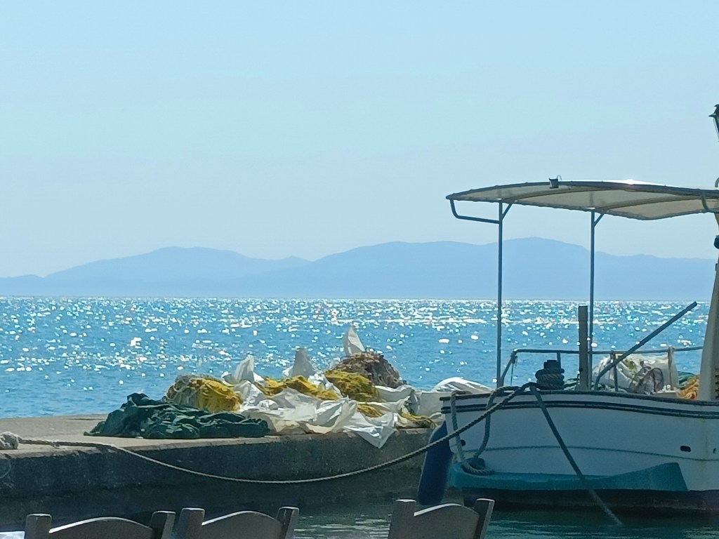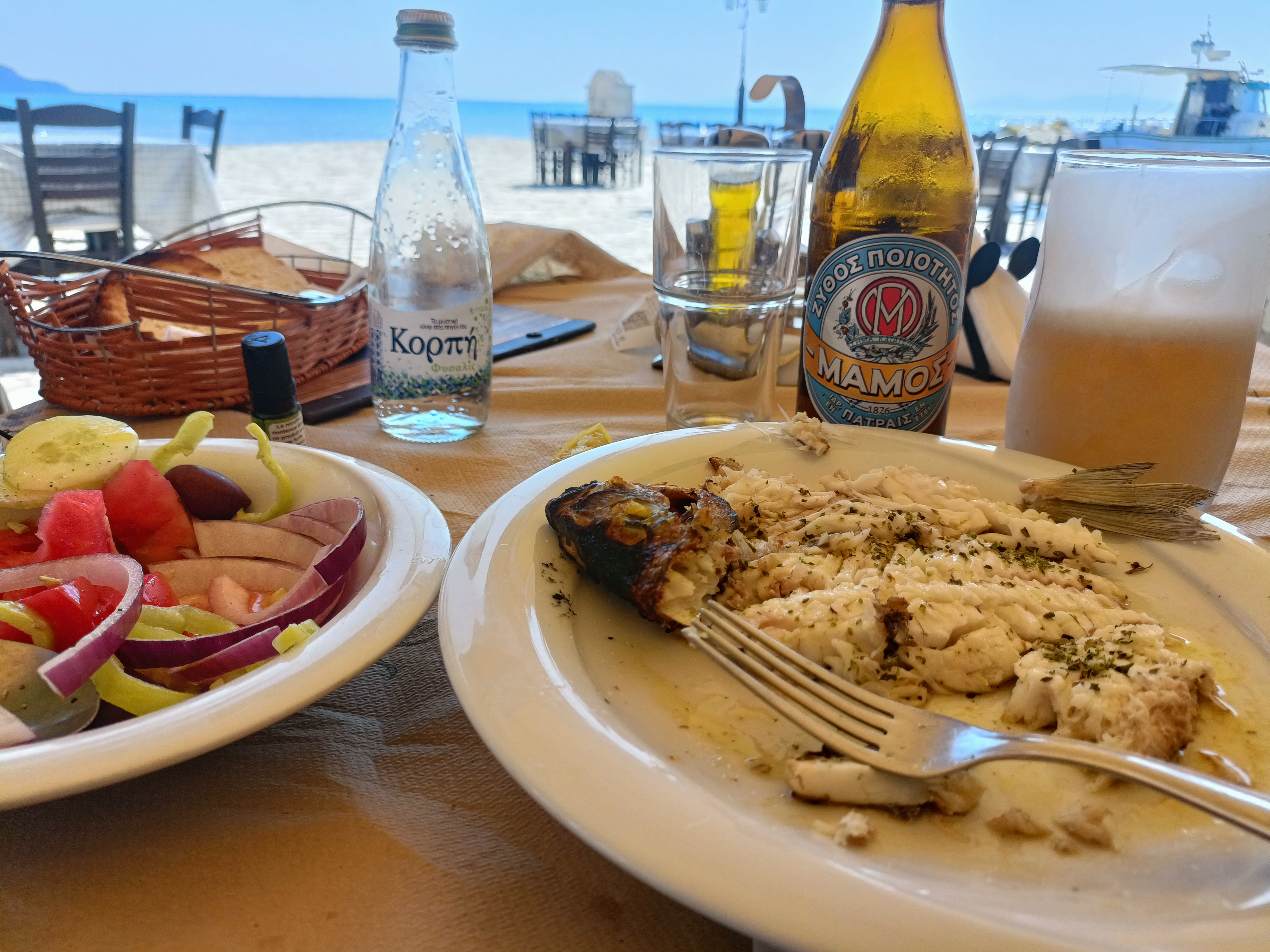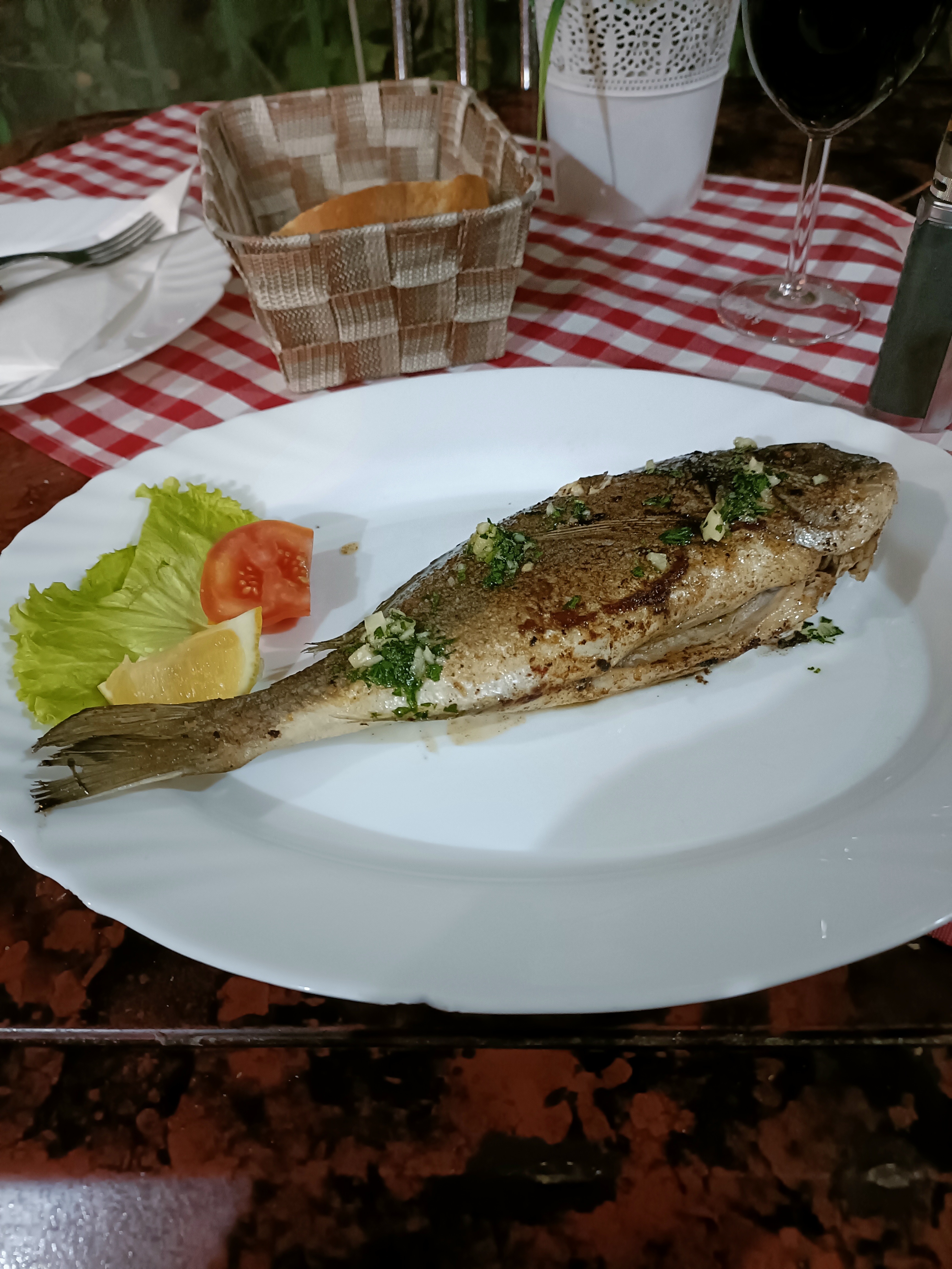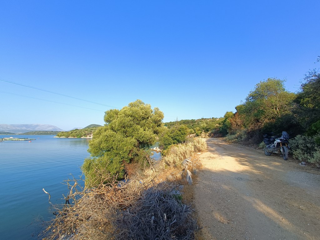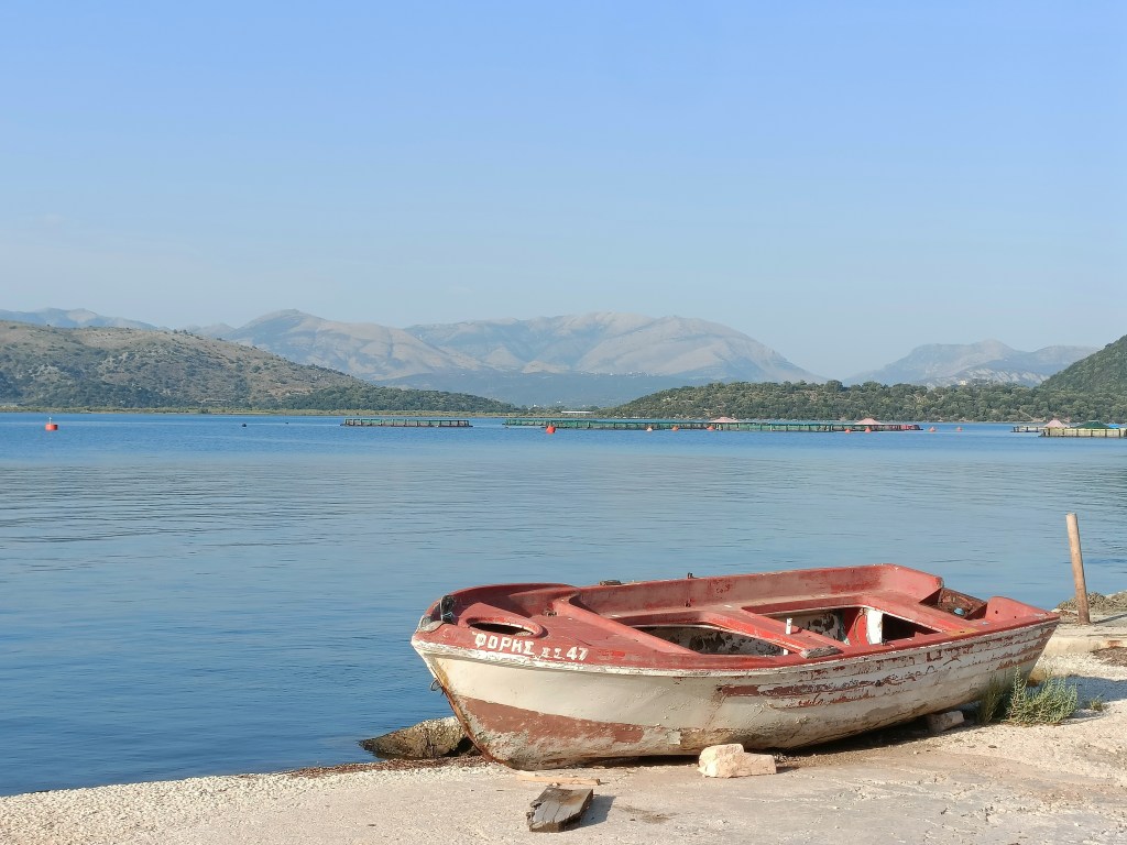 Je repars vers la frontière grecque et m’arrête dans le premier village de pêcheur, Sagiada. Aucun touriste, une vue superbe sur Corfou, et un restaurant de poissons avec une carte de « génériques » et une carte de la pêche locale. Il est 17h mais peu importe l’heure, je reste là 3h à contempler l’adriatique et déguster Saint-Pierre et Bars en papotant avec le fils du parton marin-pêcheur, entre deux fournées de glaçons pour la cheville. Je prends mon temps car je ne suis plus qu’à 20km du port d’Igoumenitsa, d’où mon ferry pour l’Italie lève l’ancre le lendemain matin.
