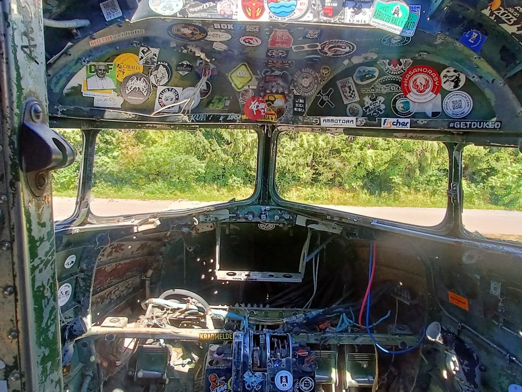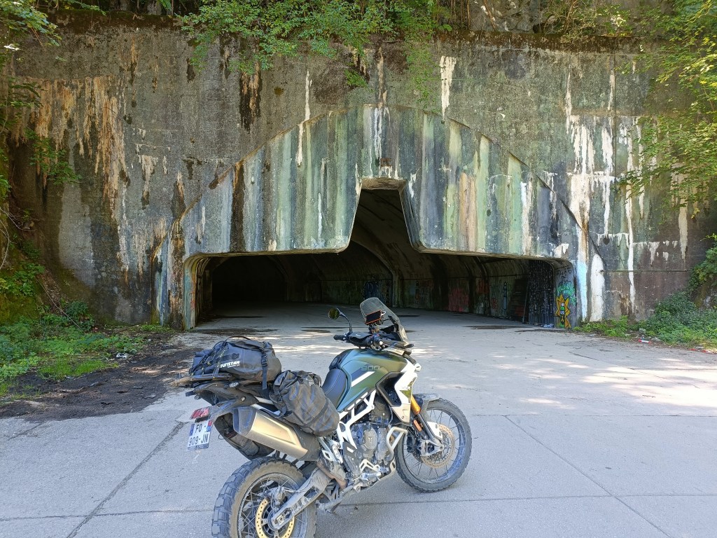 Encore quelques kilomètres de pistes tôt le matin sur les hauteurs de la côte adriatique croate, pour réparer la frustration de la veille. En effet, les vues sur les îles sont plus belles le matin, lorsque le soleil est encore à l’est et qu’il illumine la roche blanche des îles. La mer en contrebas à 800m d’altitude, il en devient difficile de se concentrer sur les pièges de la piste. Alors on est parti pour une petite centaine de kilomètres de routes dans les terres, le long desquelles se multiplient les cimetières, les églises détruites souvent, et neuves parfois. Les traces de la guerre de Yougoslavie se multiplient ainsi au fur et à mesure que l’on pénètre ce territoire. Je poursuivrais ainsi jusqu’aux vestiges de la base militaire aérienne de Zeljava, à la frontière avec la Bosnie. Un lieu perdu, fait de galeries creusées dans la montagne où étaient stockés et d’où décollaient la flotte croate. Ces galeries commencent à devenir une attraction touristique, et étonnamment j’y aurais croisé lors de mon immersion une dizaine de motards pour deux voitures. Certainement le fait des réseaux communautaires Instagram, car poster sa moto à l’entrée d’une galerie ou à côté d’un avion à l’abandon est très tendance… j’y aurais succombé également.