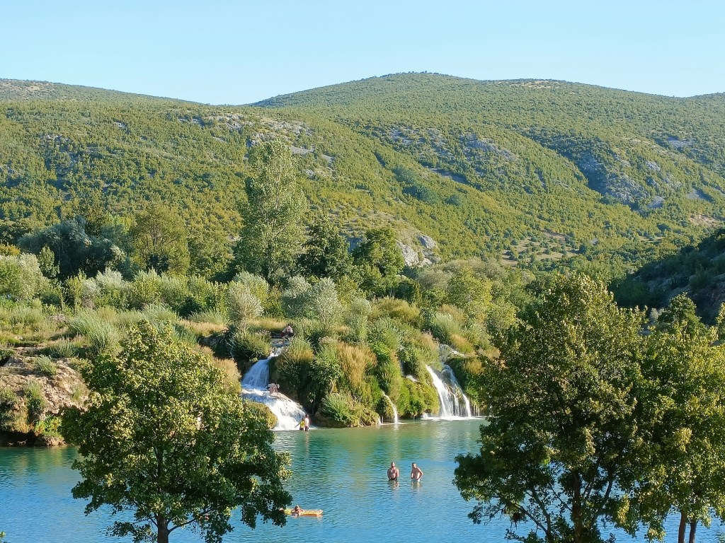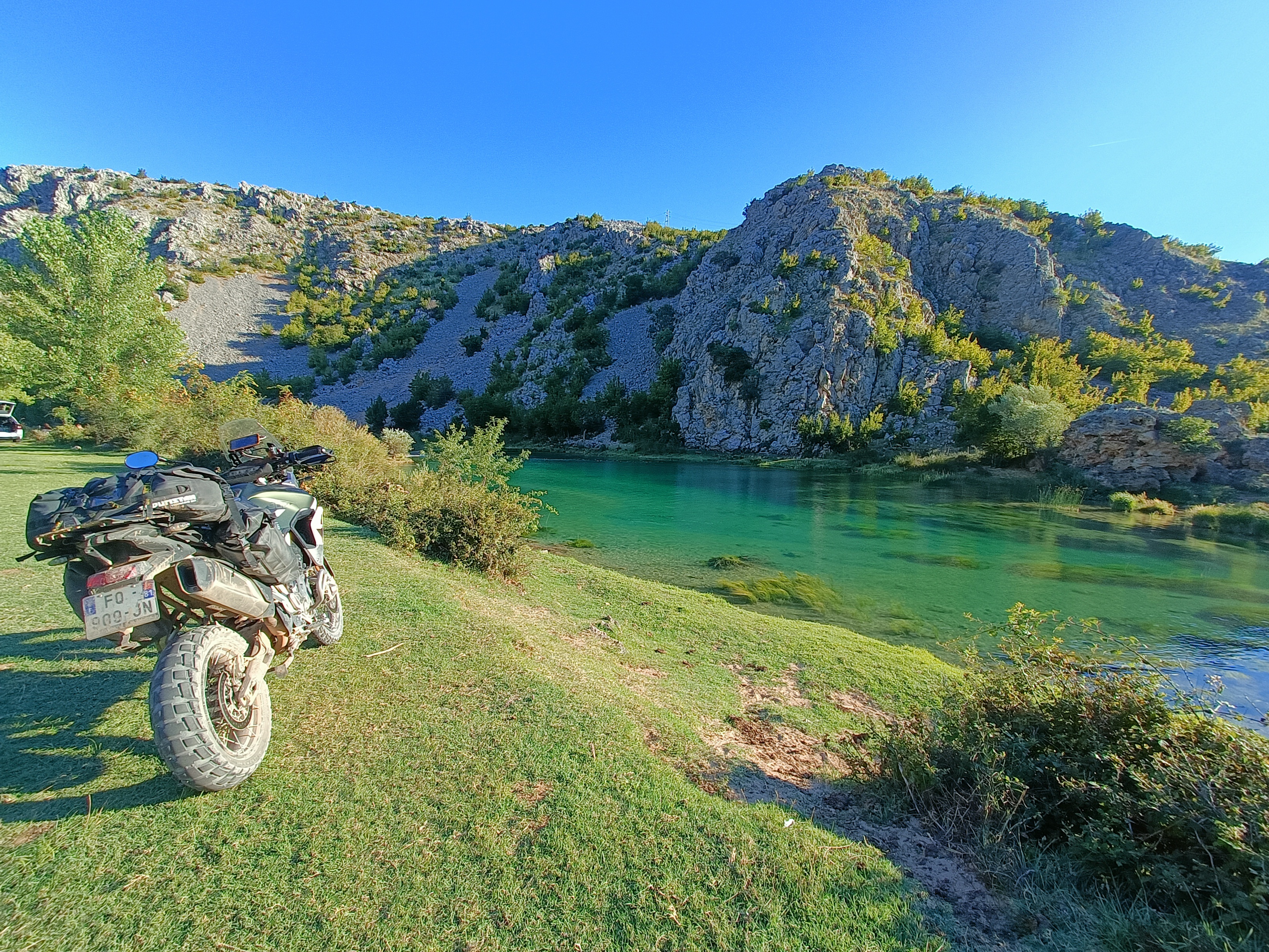 Il est encore trop tôt pour la recharge de houblons, et les paysages sont toujours plus beaux en fin de journées quand le soleil décline et les brumes de chaleur perdent de leur épaisseur. Alors je me dirige vers la gorge de la rivière de Zrmanja, avant que cette dernière ne se jette dans l’adriatique, puis plus en amont vers les cascades naturelles que cette rivière a façonné tout au long de son parcours. Du bleu turquoise vers le vert émeraude…. punaise, c’est beau, je dors là.