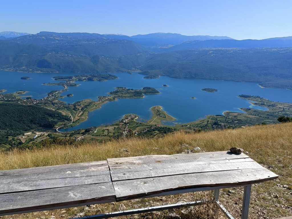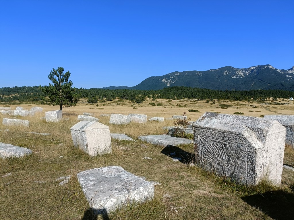 De quoi être sûr de ne pas tomber en hypoglycémie pour les 200km de pistes de montagnes qui m’attendent si je veux tenir mon objectif de parvenir jusqu’à Mostar avant le coucher du soleil, par la trace proposée par la communauté du Trans European Trail. Des pistes tour à tour faciles et assez rapides puis techniques et piégeuses. Au beau milieu de ces 200km où les cimetières fleuris en lisière de villages détruits auront dominé l’après midi, se trouve le lac Ramsko, certes artificiel, mais assurément l’un des plus beaux paysages de Bosnie, surtout si on parvient à le dominer du haut de la piste qui le surplombe 600m plus haut, seul à flan de falaise. Puis des pistes au bord desquelles apparaissent de superbes nécropoles moyenâgeuses composées de plusieurs « stecci », lourds tombeaux sculptés posés là sur le sol au beau milieu de nulle part.