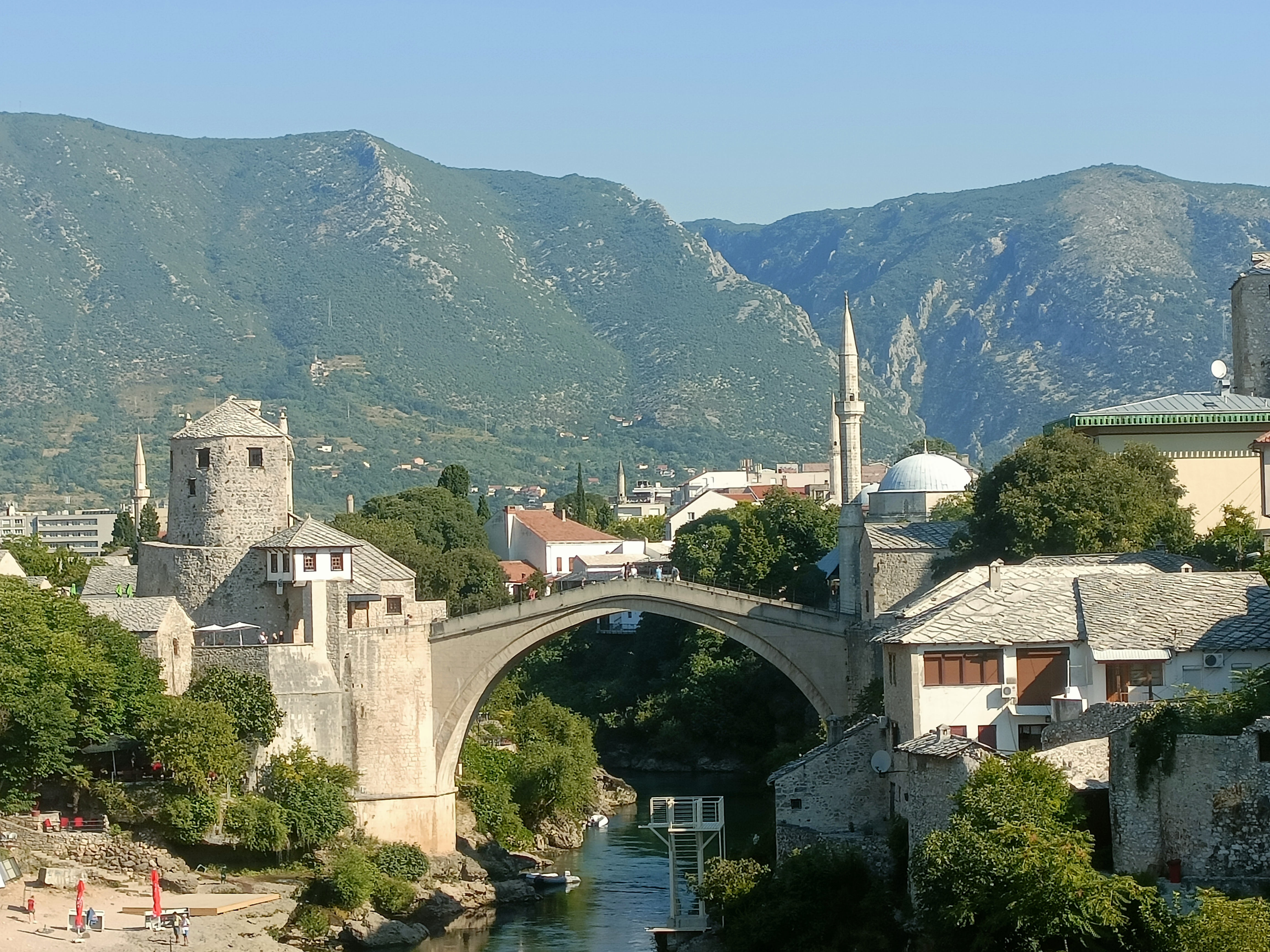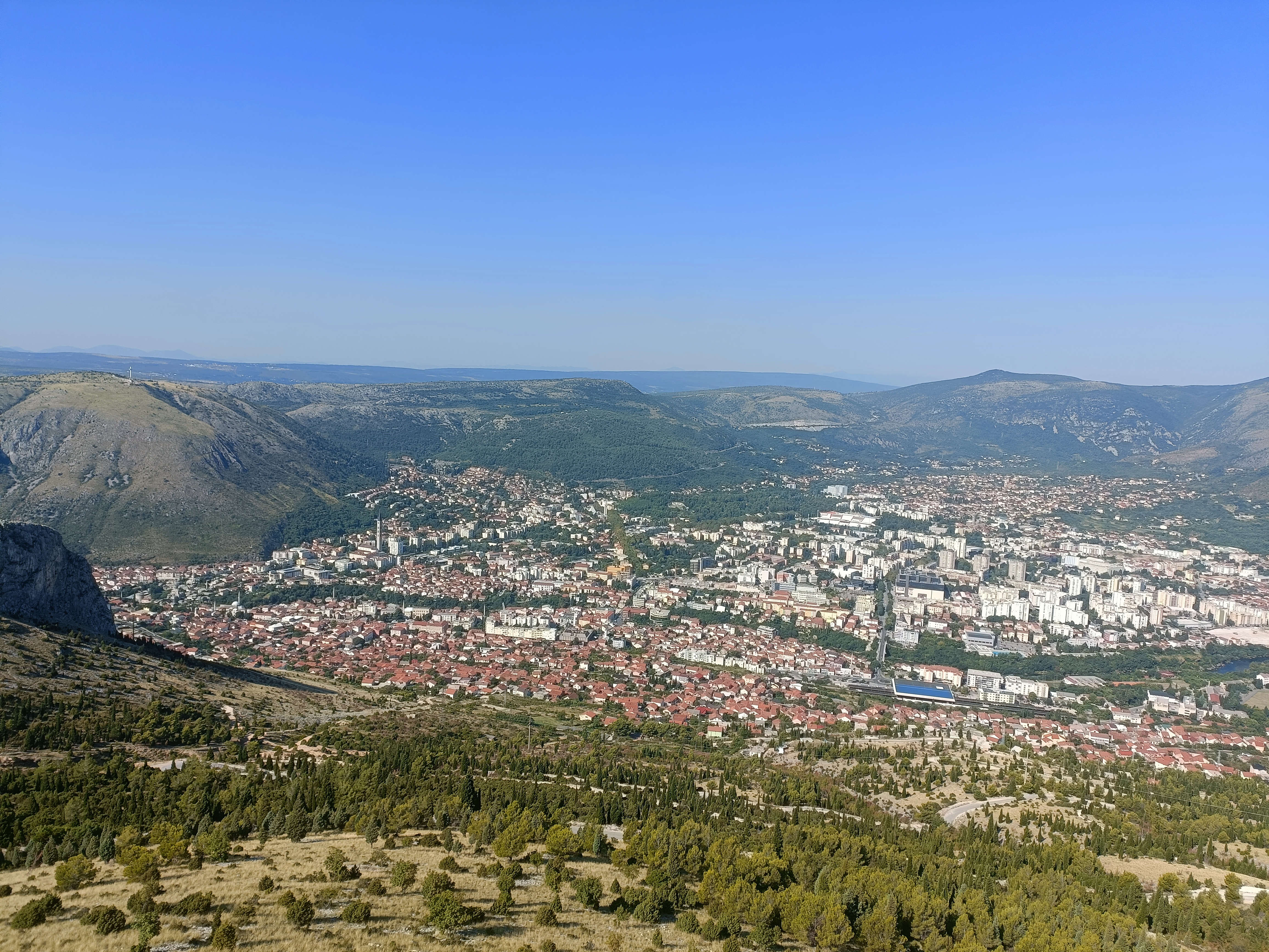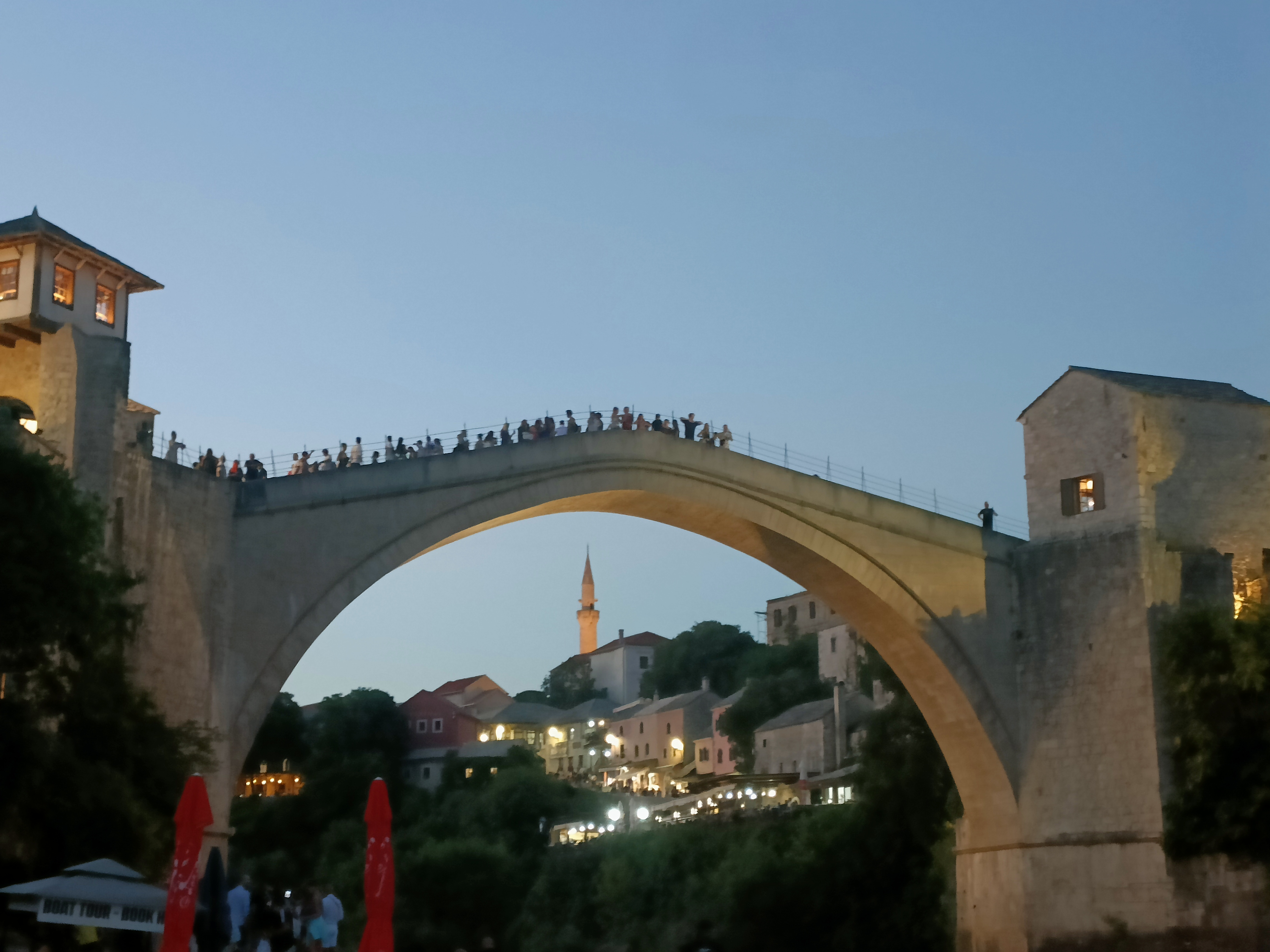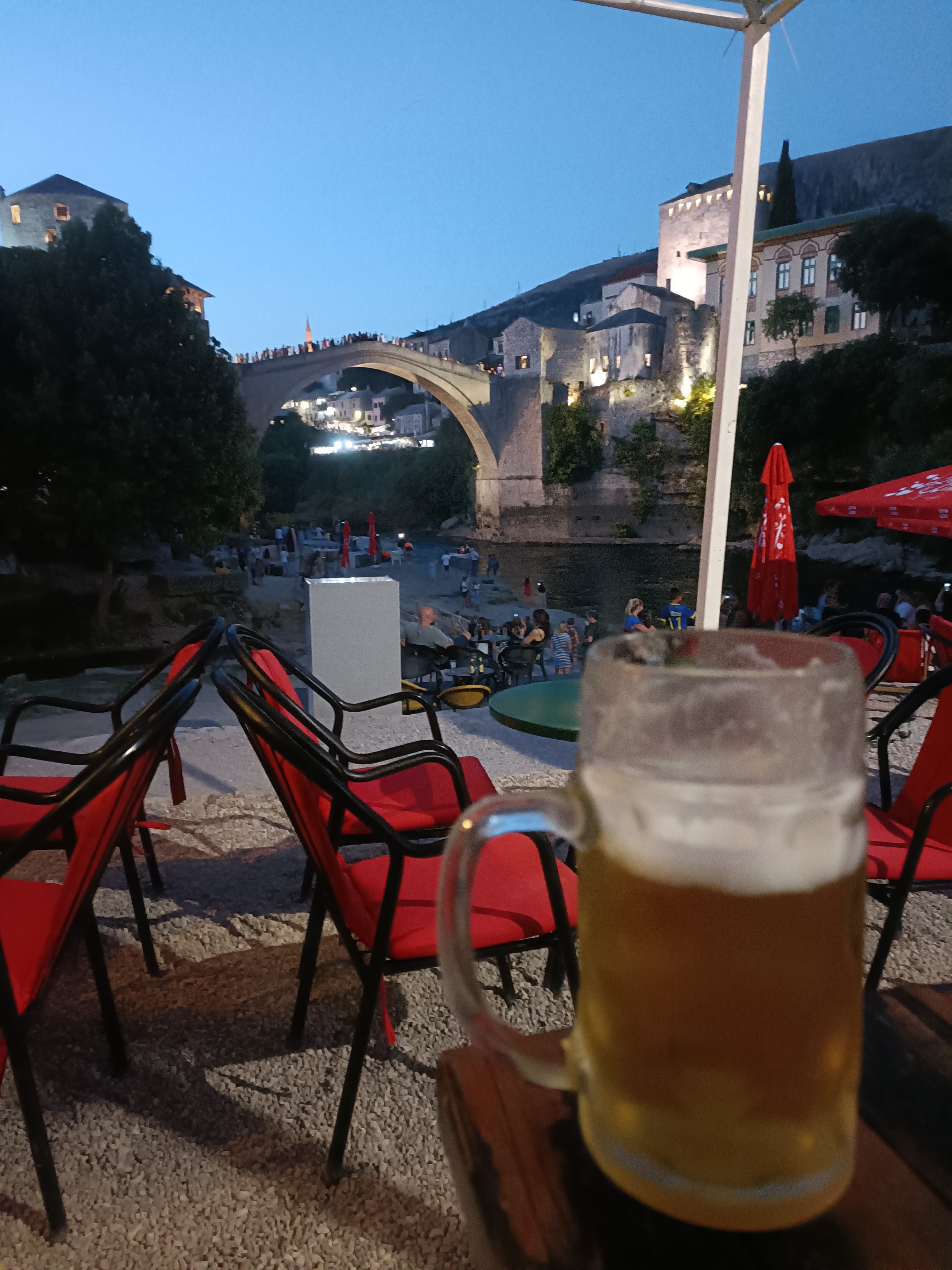 On termine par une harassante piste descendante jusqu’à Mostar, où finalement le soleil sera couché à mon arrivée dans la vieille ville. Dance floor outdoor sous le pont de Mostar, IPA de brasserie locale, beignets bosniaques pour accompagner les poivrons à la farce d’agneau. Je suis lessivé, heureux, la journée fut dense en pilotage et paysages. A peine 23h j’ai déjà sombré.