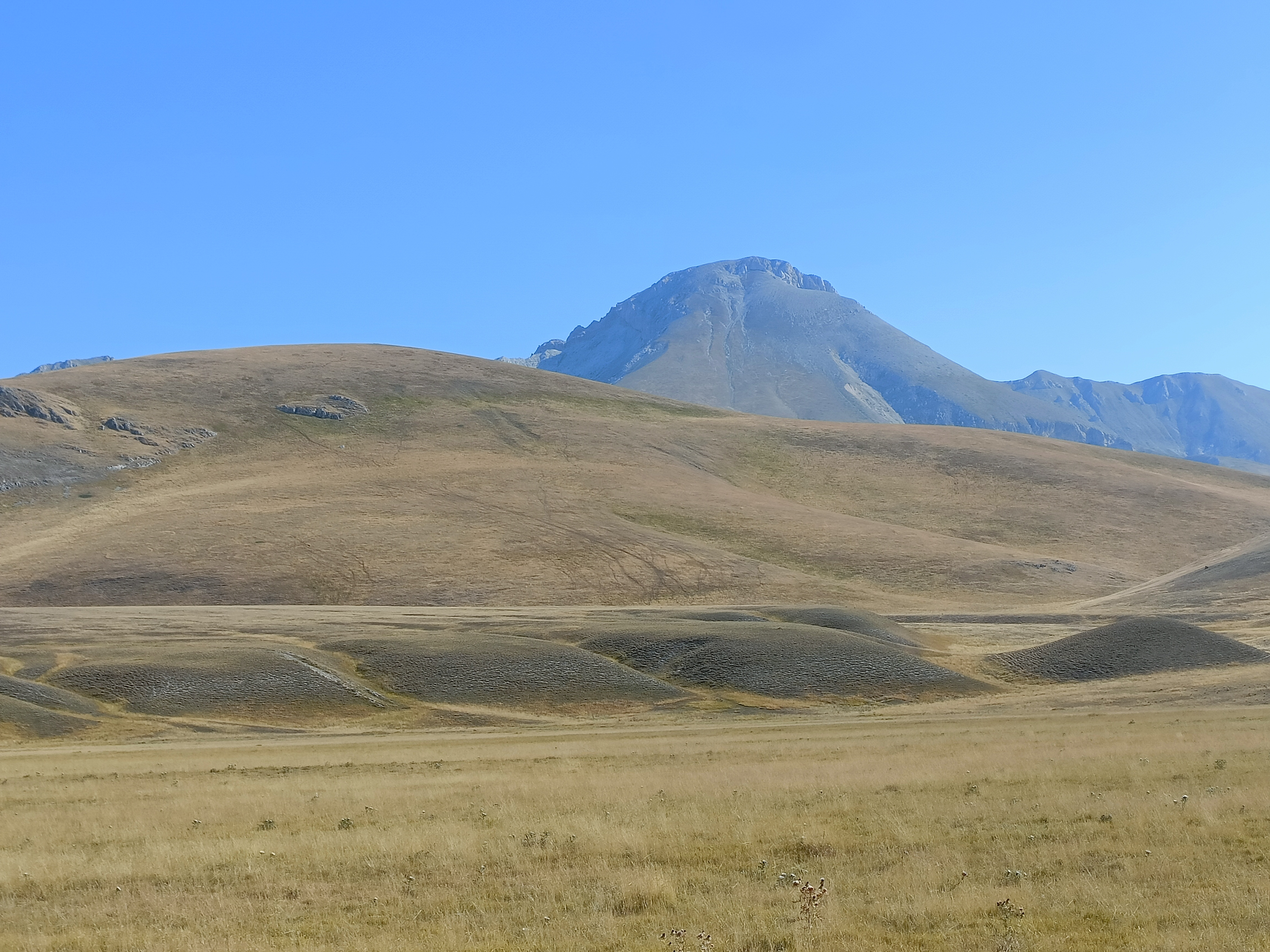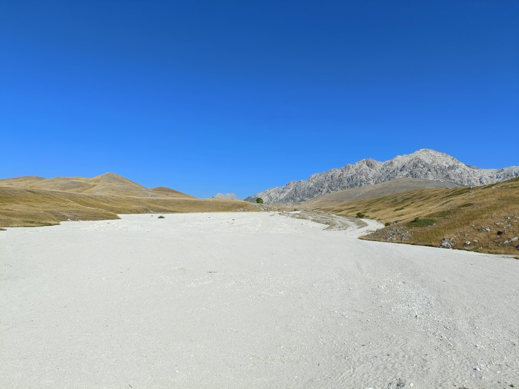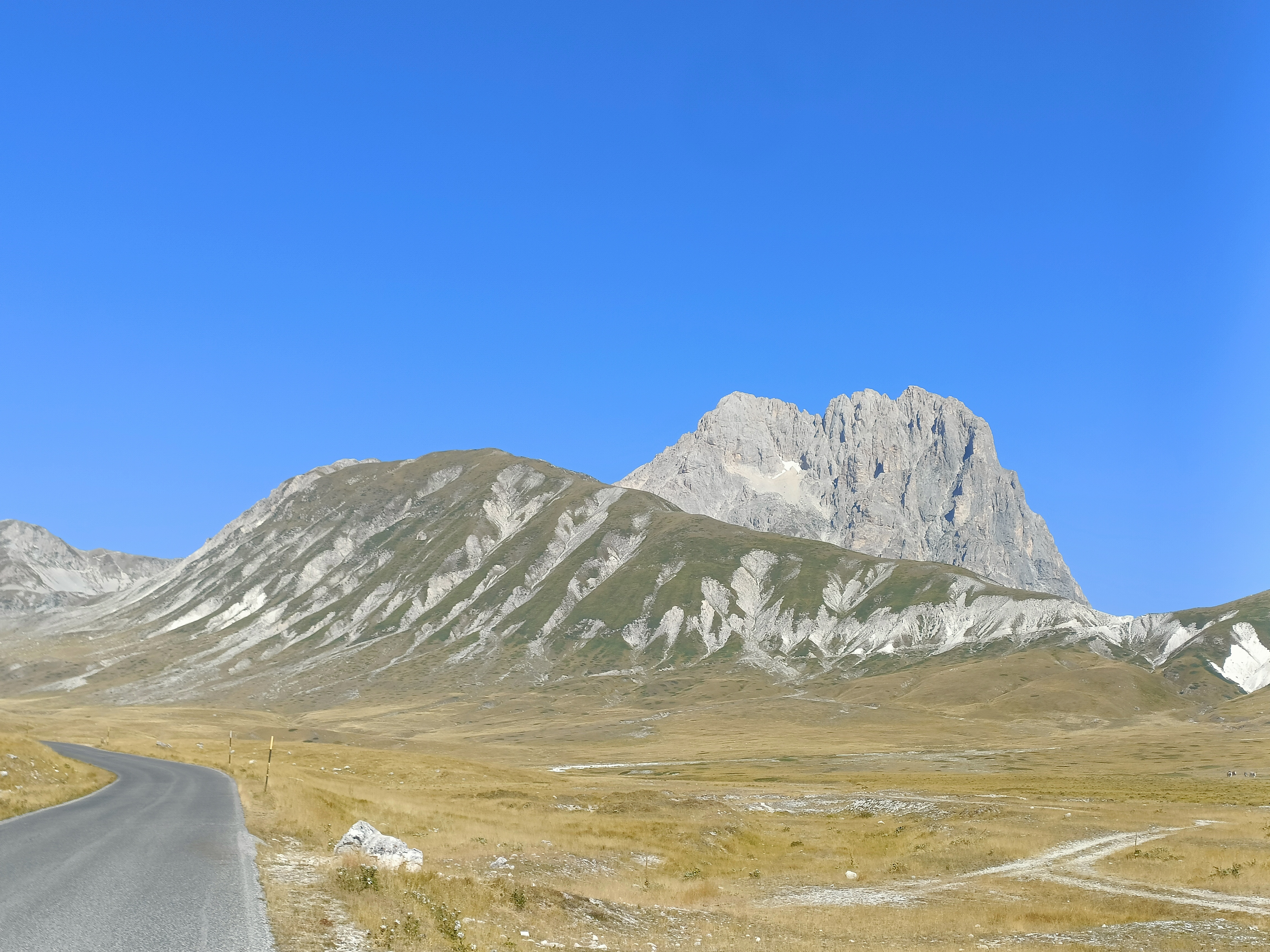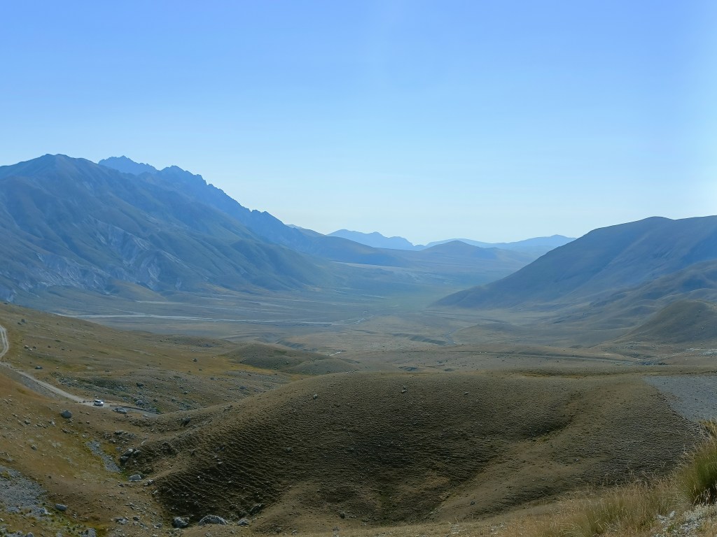Crème sur la cheville et les hématomes, Dolipran, petit déjeuner très copieux et c’est reparti pour une longue journée de route afin de boucler ce tour de l’Adriatique. Je navigue par les petites routes des Pouilles entre Brindisi et Bari pour découvrir les « trulli », des huttes en pierres surmontée de toits pyramidaux, classées par l’Unesco. S’en suivent 250km d’autoroutes vers le nord pour rejoindre après une centaine de kilomètres de route de montagne le village de Castel Del Monte, dans les Abruzzes, et qui marque l’entrée du « Campo Imperatore », dans le massif des Appenins. On aperçoit encore les séquelles du terrible tremblement de terre qui a secoué toute la région de L’Aquila en 2009.