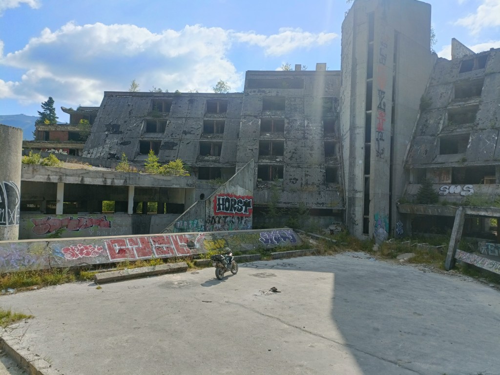 Je poursuis sur ce plateau par une belle piste, jusqu’à trouver une piste qui mène au pic de Bjelašnica, à 2100 mètres, où se situent un observatoire en piteux état, et le bâtiment détruit qui marque le départ de la piste olympique de descente de 1984. Il est temps de plonger vers Sarajevo que l’on aperçoit au loin par différente pistes, et une traversée d’une station de ski qui semble revivre, non loin du célèbre hôtel Igman, hôtel luxueux construit pour les JO de 1984 et qui fut l’objet de violentes agressions durant la guerre des balkans. J’y entre, seul, traverse son lounge, ses halls, sa piscine, jusqu’à être pris d’une angoisse…. et si cela s’écroulait. Je repars donc vers Sarajevo, par la forêt et y parviens une vingtaine de kilomètres plus tard, finalement plus en avance que ce que j’espérais. J’en profite pour essayer de joindre par la ville la piste de bobsleigh, par des quartiers sud très escarpés, où s’accrochent de nombreuses maisons traditionnelles. Une ville dans la ville. Je ne parviendrais pas à ce site célèbre… car il est protégé et inaccessible en véhicule. Mais j’aurais découvert un quartier authentique, tortueux, et où un automobiliste des plats pays n’aurait pas osé poser ses roues.