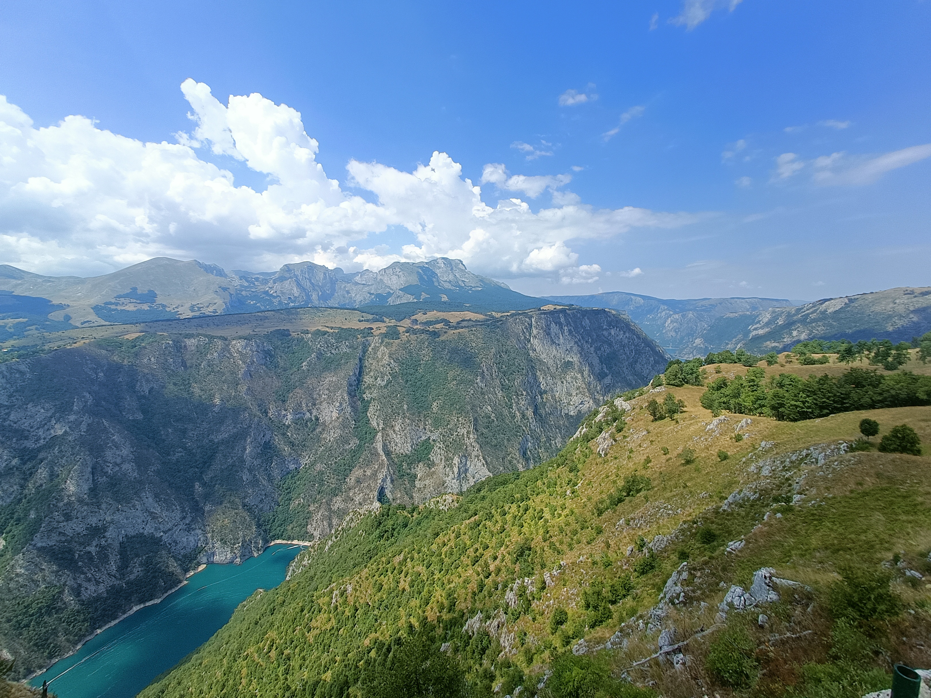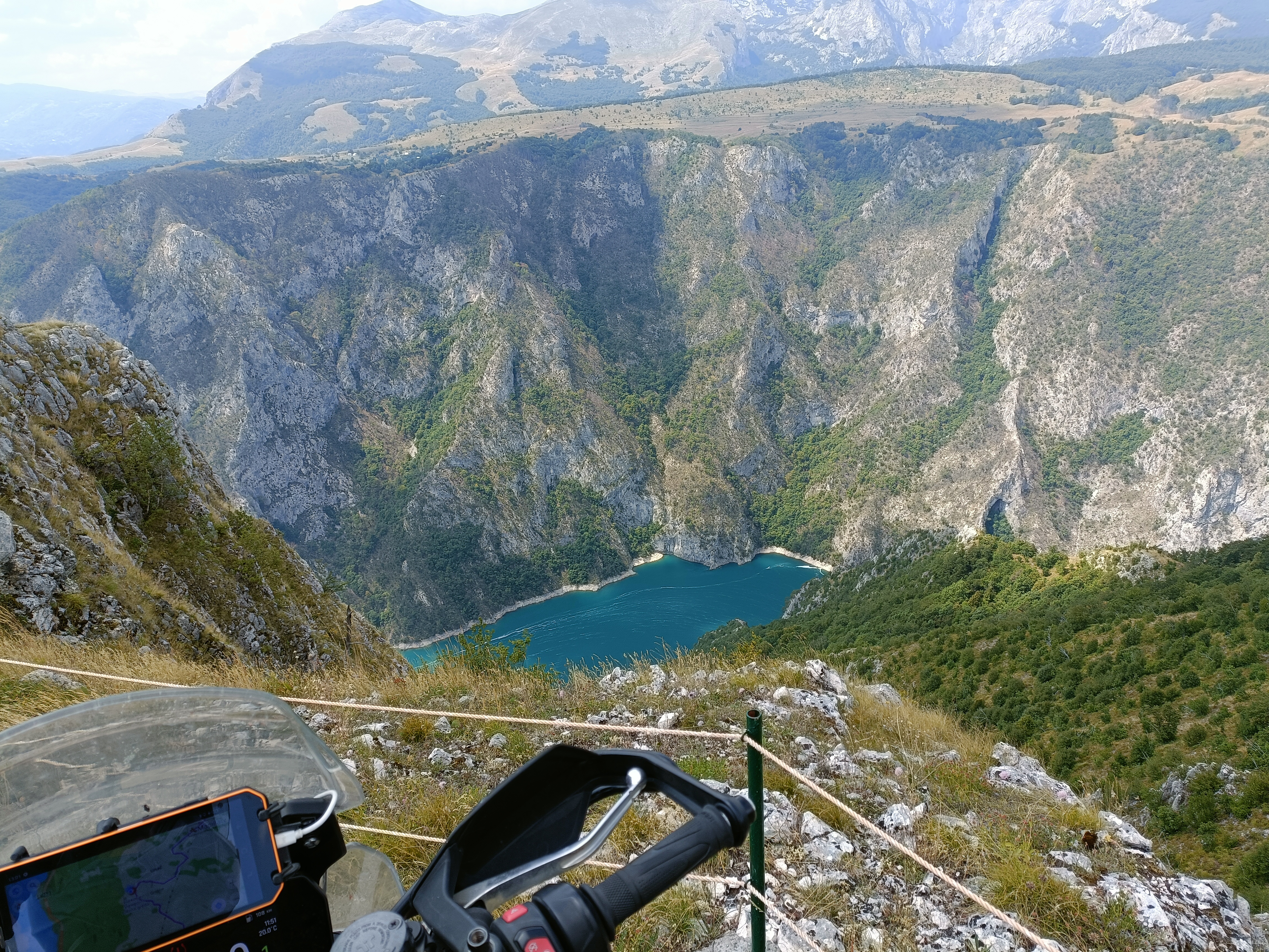 Direction le sud pour rejoindre le Montenegro en fin de journée. 70km de routes de gorges et montagnes pour rejoindre la frontière avec le Montenegro, au bord de l’impressionnante et très connue rivière Tara. On attaque ensuite le massif du Durmitor, par une piste puis une petite route de montagne, un des plus beaux massifs montagneux du continent européen, par ses impressionnantes strates et découpages rocheux. La piste d’un coup s’ouvre sur les gorges de la rivière Piva, 800 mètres plus bas…. Vertiges garantis quand on approche la moto du précipice.