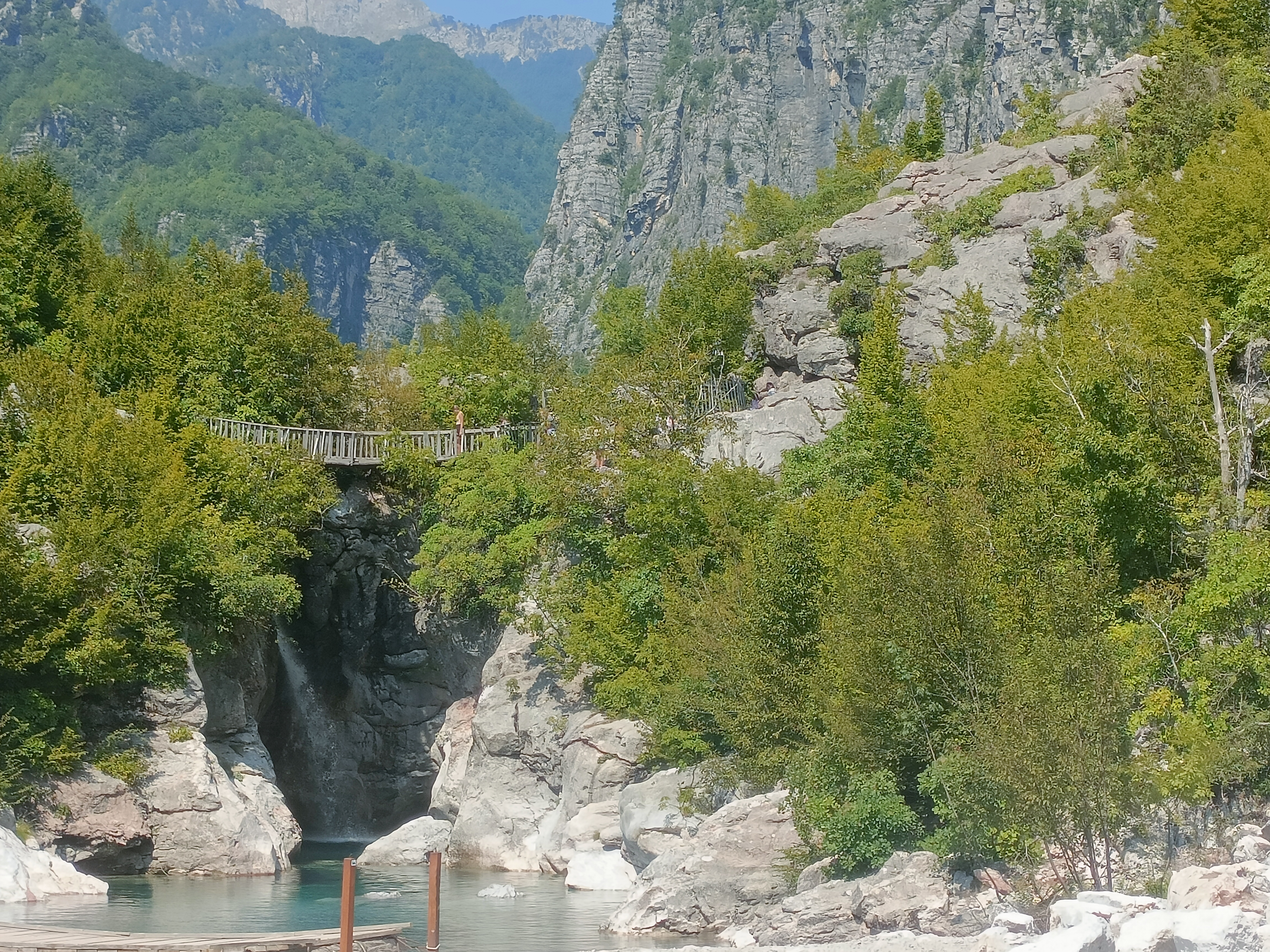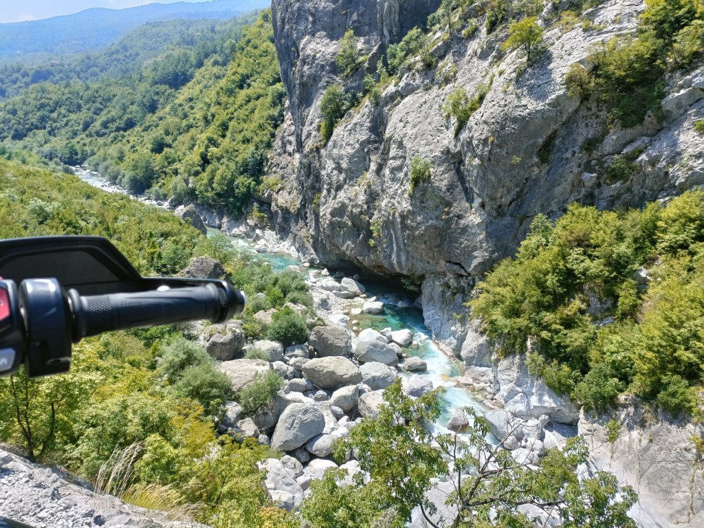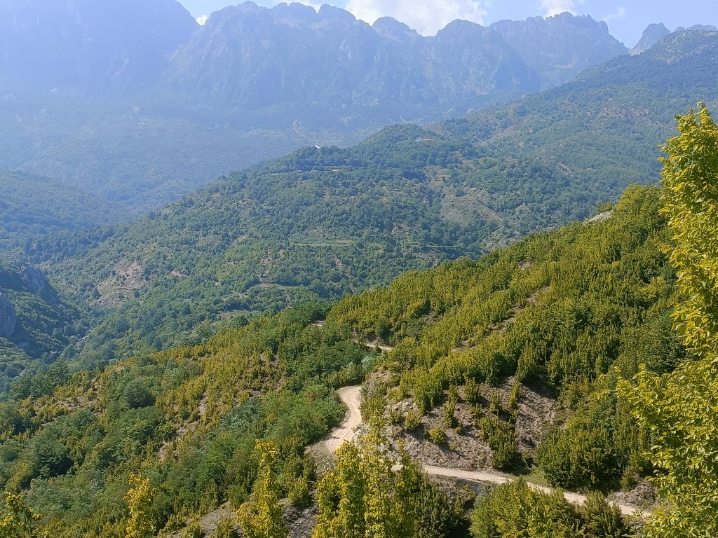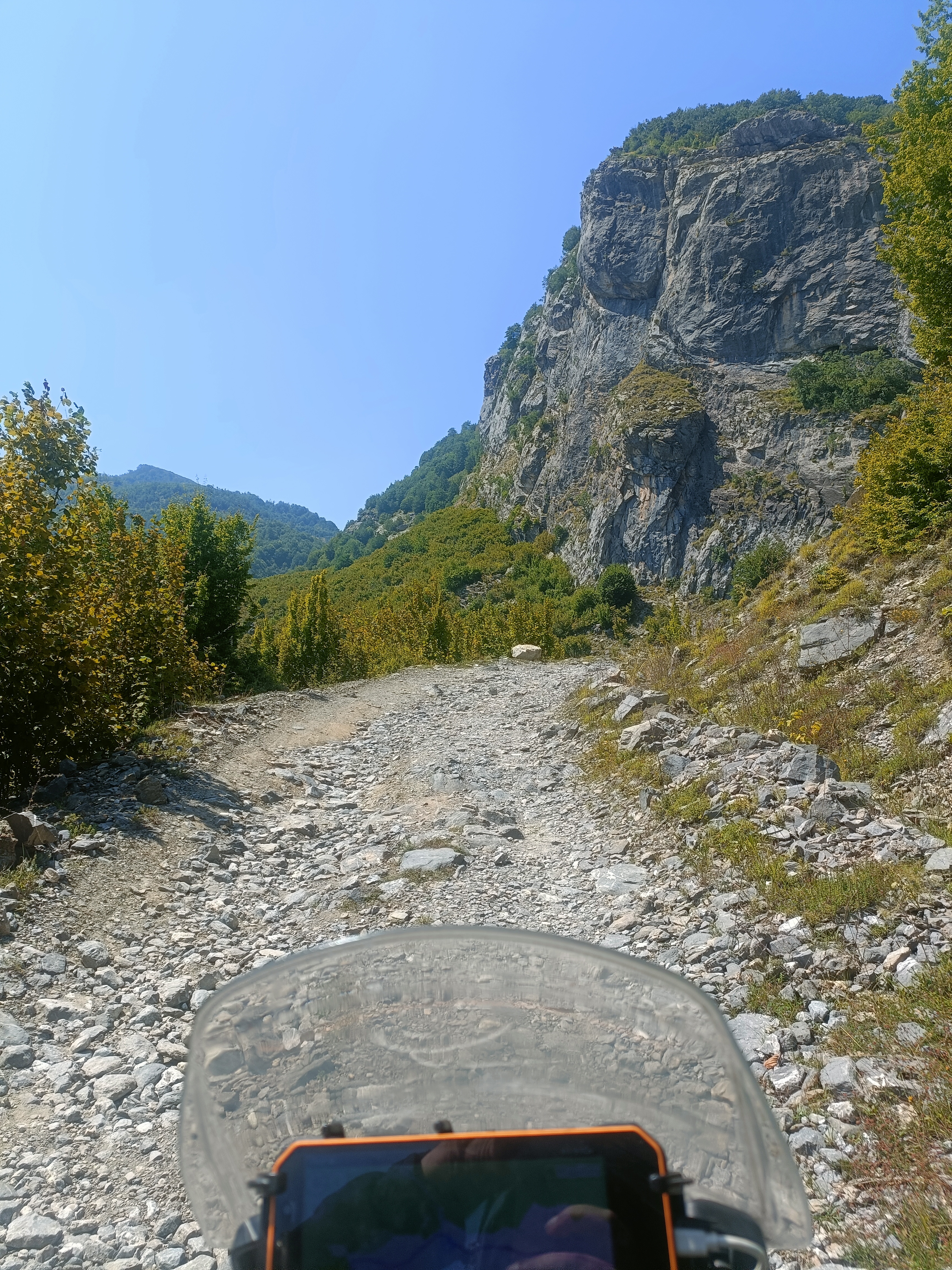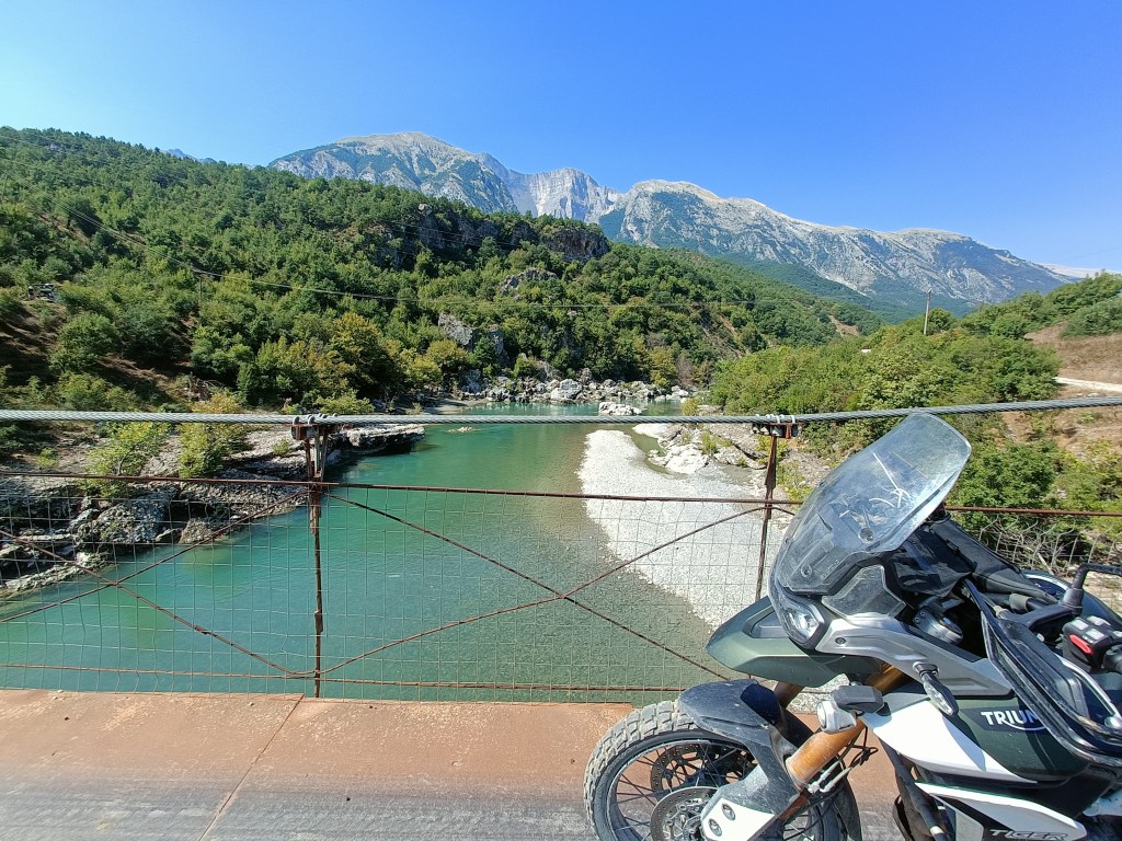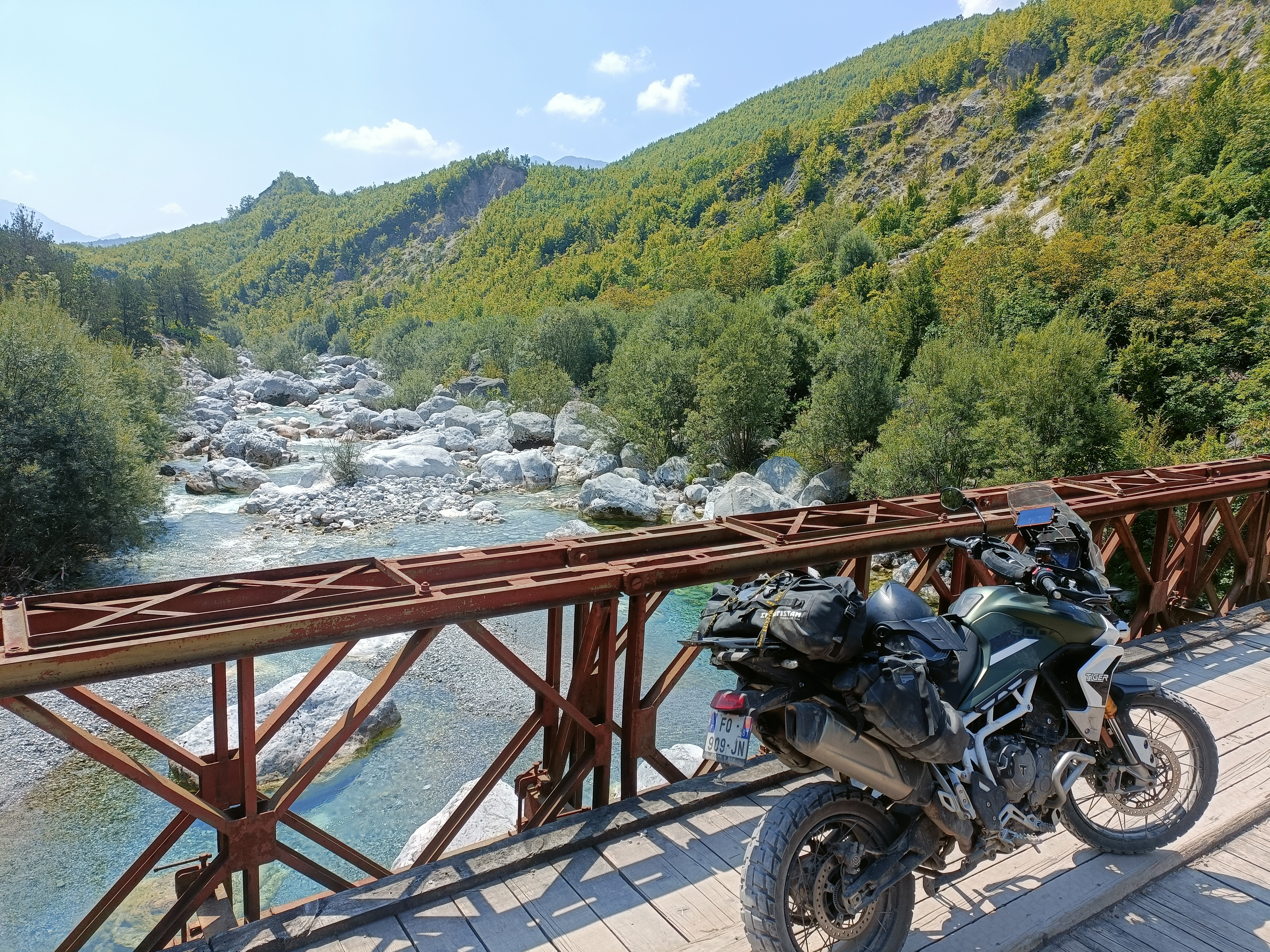 Cela commence le matin par une montée vers le col qui amène au village de Theth dans la vallée suivante. Première déception: montée et descente ont été récemment asphaltées. Cela n’en reste pas moins impressionnant et on s’amuse plutôt bien sur cette petite route étroite. Il n’est que 10h30, mais je préfère me restaurer dans le village, anticipant que cela serait impossible le reste de la journée. Plus qu’un village, il s’agit plutôt d’un habitat dispersé fait de petites maisons dont les habitants proposent une nourriture de produits locaux aux égarés (en majorité des randonneurs qui gravissent le sentier qui relie Theth et Valbona plus à l’est de cette micro mais très haute chaine de montagne). La piste commence en sortie de village vers le sud, au fond d’une gorge et en surplomb d’une rivière agitée (la Lumi i Thethit, qui devient la Lumi i Shales par la suite). On franchit quelques passerelles en bois à la solidité précaire. Une vingtaine de kilomètres plus tard, on quitte la rivière pour remonter vers l’ouest par une montée très technique par endroit. Sur les 70km de pistes au total, seuls les premiers kilomètres de cette montée peuvent s’avérer difficiles pour les peu expérimentés (de la pente et quelques marches). On navigue ensuite vers 1000/1200 mètres sur des pistes très caillouteuses pendant plusieurs kilomètres avant de redescendre par toute une série d’épingles aux pierres roulantes vers de nouvelles gorges, celles de la rivière Kirri. Le bitume revient au village de Prekal, où deux bars ont bien compris que l’on n’arrive pas là sans avoir soif.