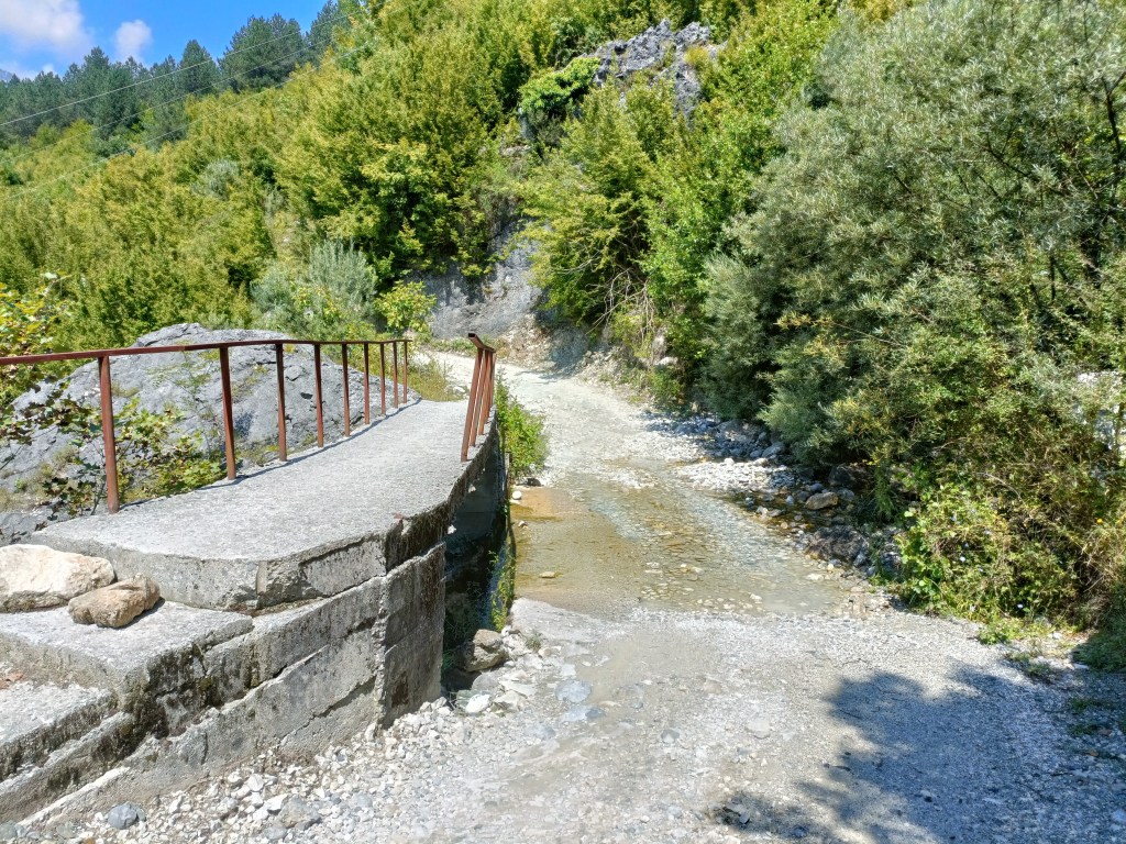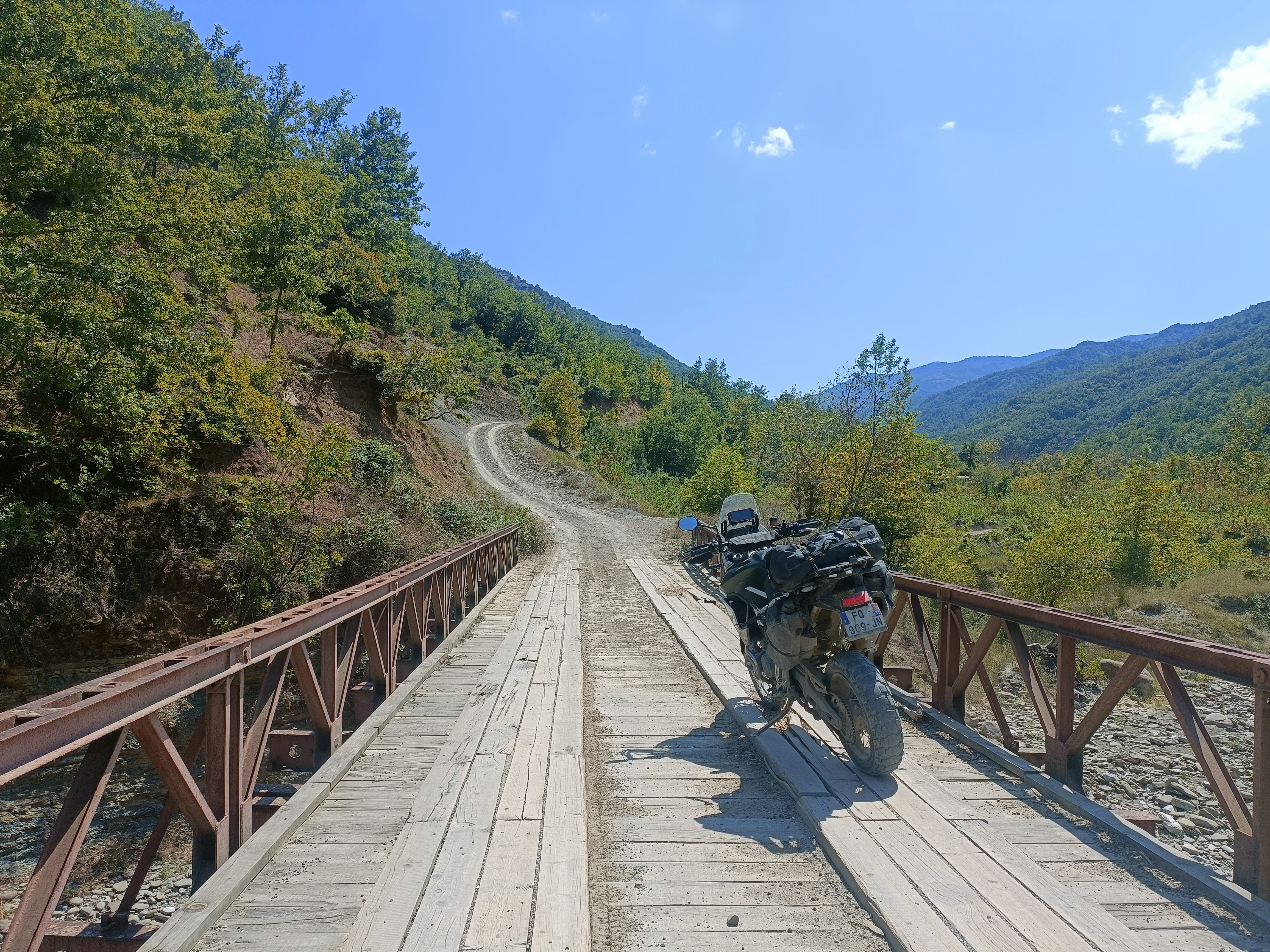 Bon, on se calme et se réconcilie avec soi-même, avant de repartir. Il va être difficile de piloter dans les chemins avec la cheville qui commence à être endolorie et moins mobile. Je termine tout de même la piste qui me mène sur un pont de bois où coule l’Osumit 90 mètres plus bas sous mes pieds et du bois pourris. Très impressionnant, à vrai dire même un peu flippant !