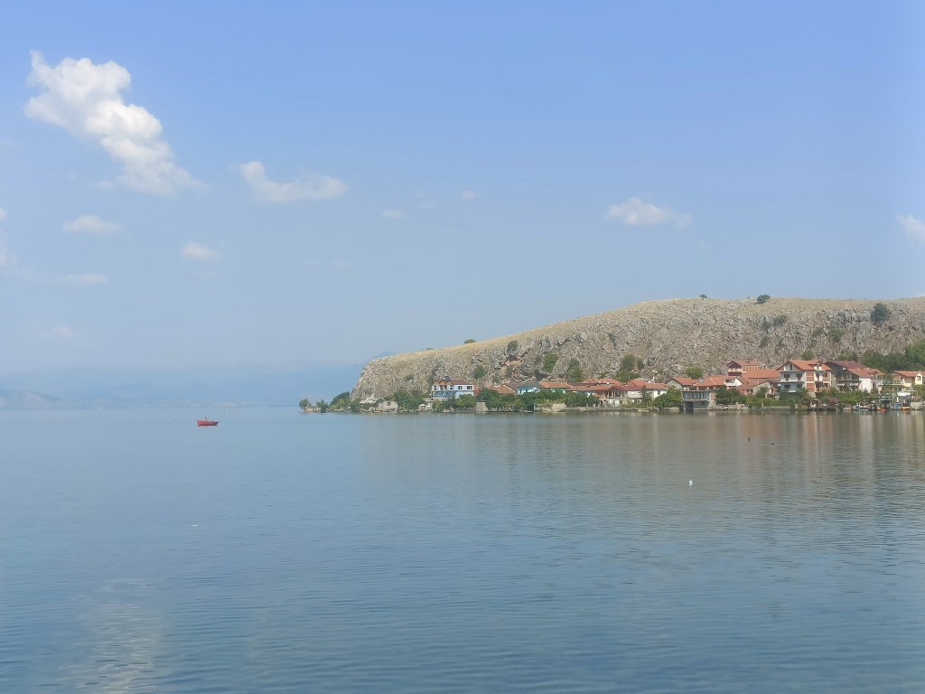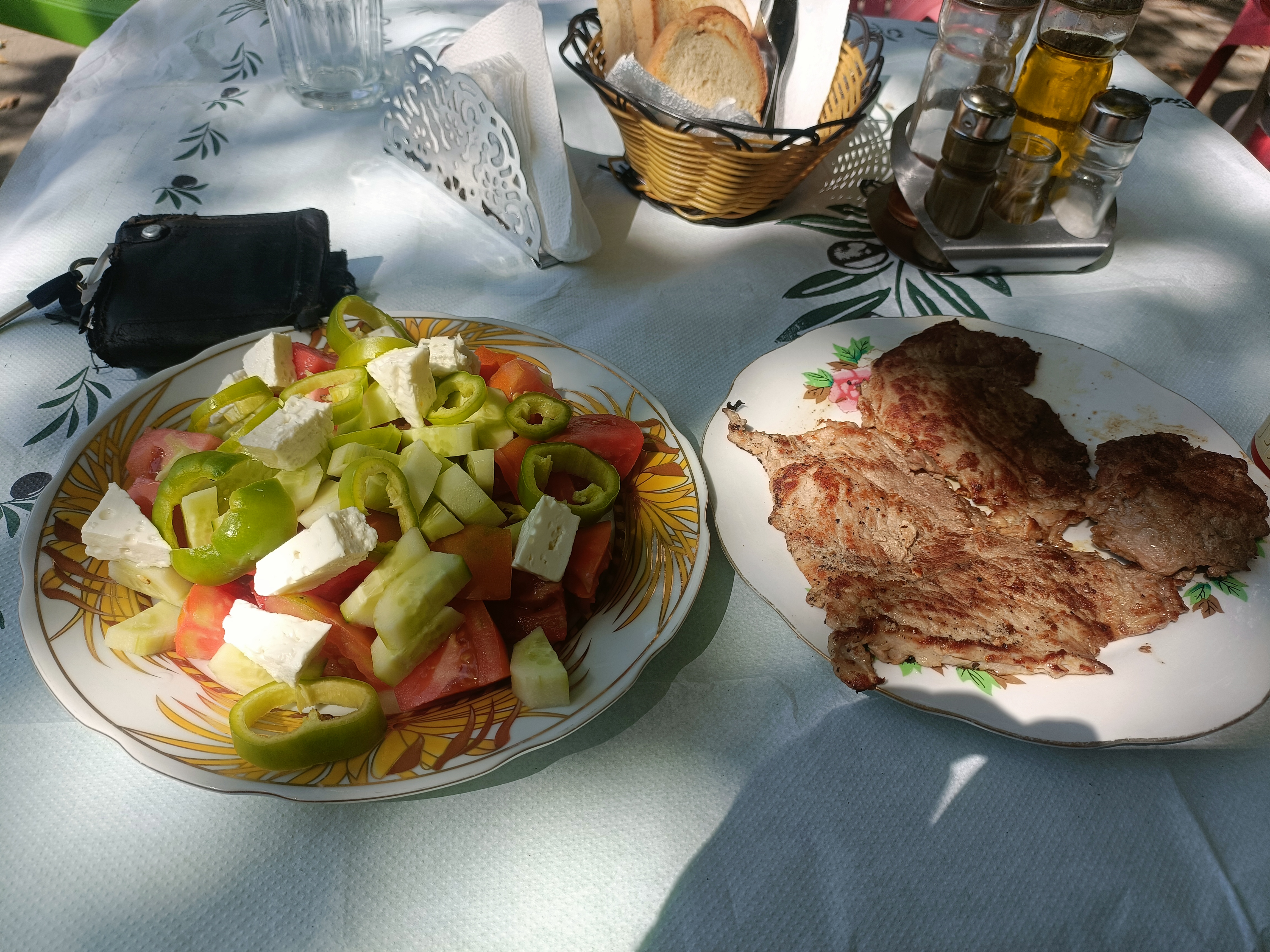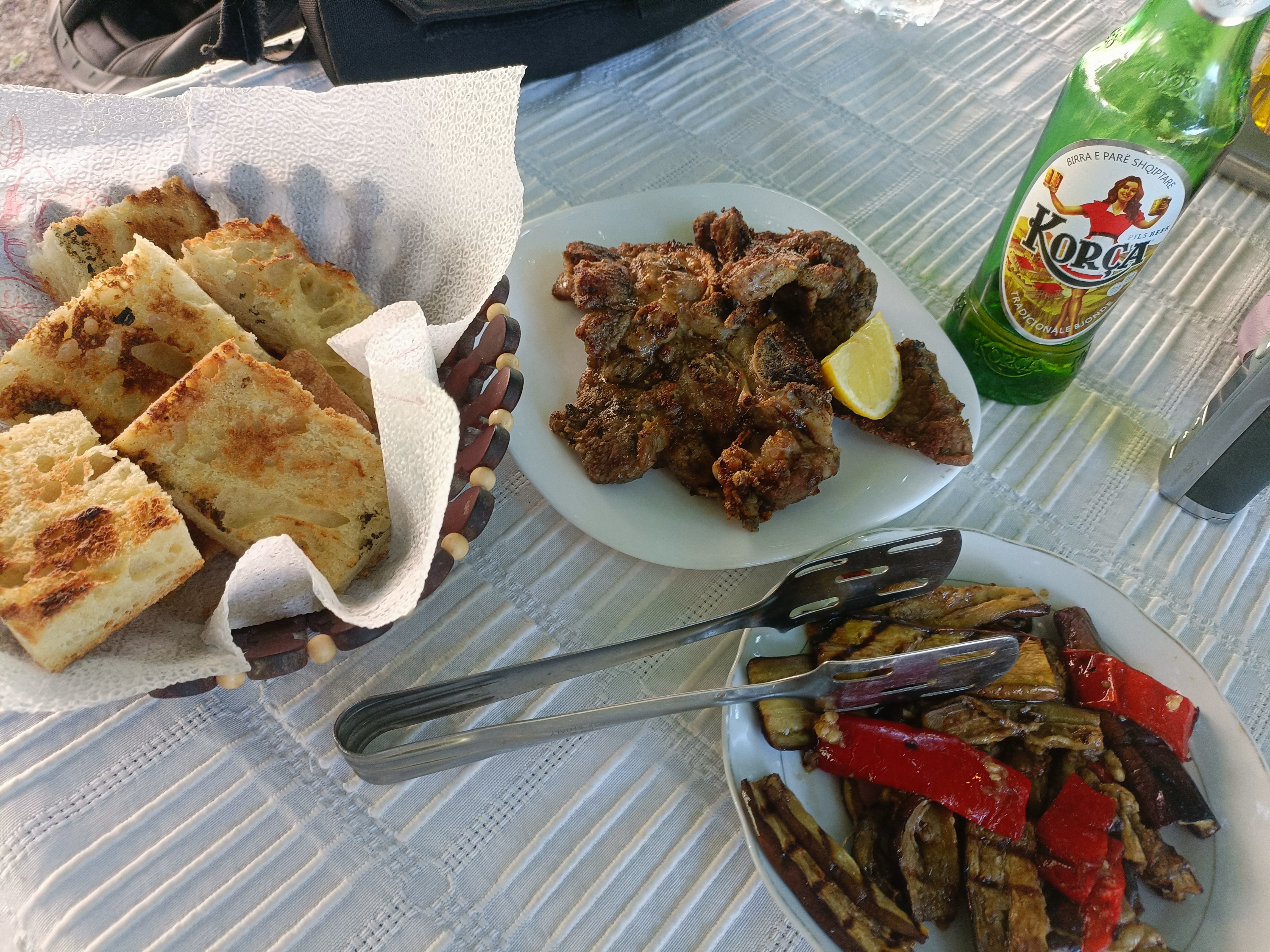 Cette fois-ci, je tiens mon engagement : je ne dévie pas du cap sud, sur plus de 300km, ce qui m’emmènera au sud-est de l’Albanie près de la frontière grecque. Des routes de montagnes en début de journée, puis une longue piste de 50 kilomètres qui m’emmène vers la ville de Librazhd, de laquelle je rejoins le magnifique lac de Ohrid, partagé par l’Albanie à l’ouest et la Macédoine à l’est. Déjà exploré en 2018 côté macédonien lorsque de retour de Roumanie, je voulais revoir ce lac naturel aux eaux turquoises et émeraudes, sur plus de 30km de long et 15 de large. J’en profite pour faire une pause sur la petite péninsule de Lin, en dégustant au-dessus de l’eau la truite endémique du lac, appelée Koran. Je poursuis par une longue plaine vers Korça, sorte de capitale de l’est de l’Albanie, réputée pour sa bière du même nom, produite depuis plus d’un siècle. S’en suit une centaine de kilomètres de routes chaotiques et pistes de cailloux jusqu’aux montagnes boisées et fraiches de la réserve de Shelegur. Là, je choisirais l’option glamping, dans une famille d’agriculteurs dont je gouterais le veau. Vraiment perdu au milieu de nulle part, sous le grondement des orages.