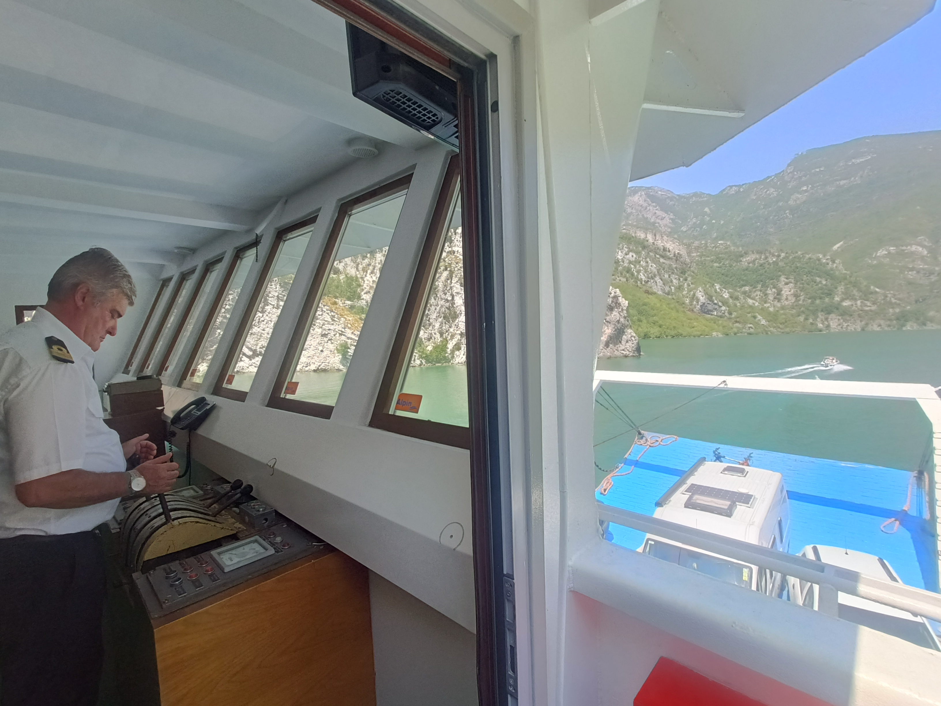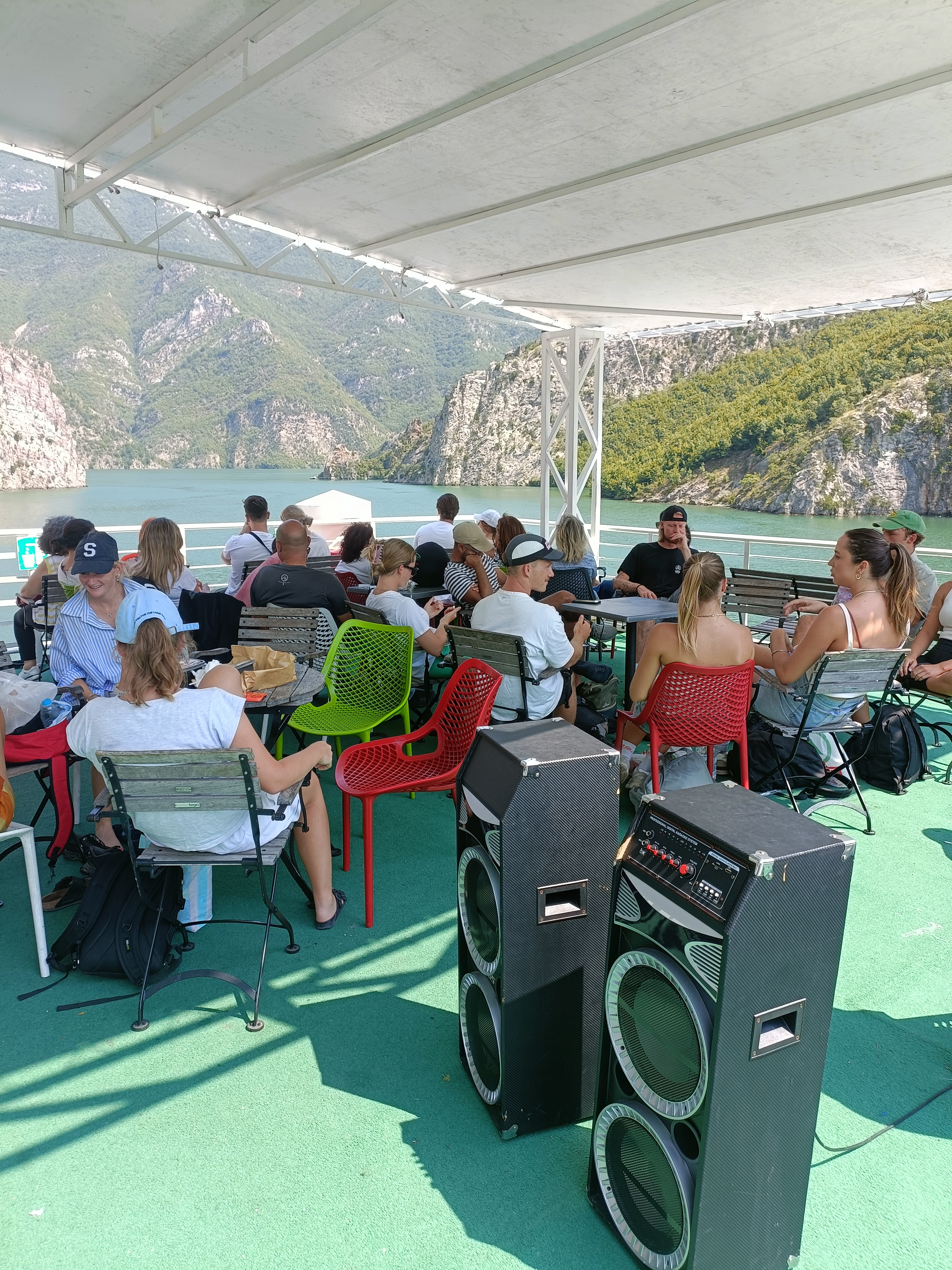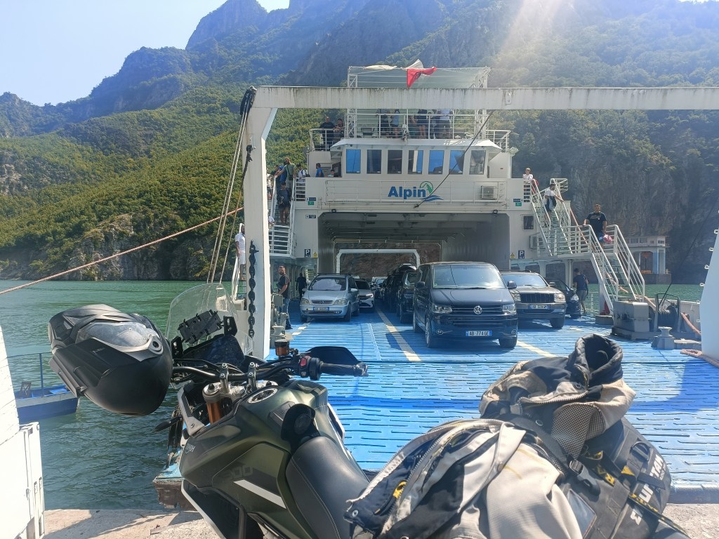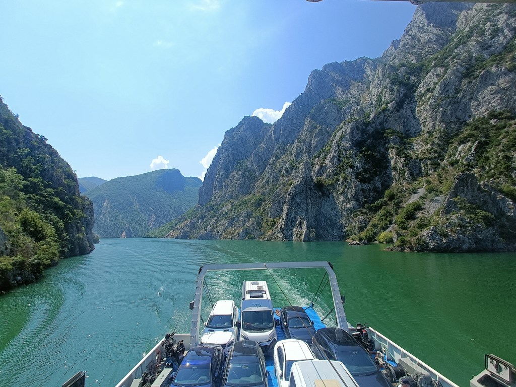 Il serait peut-être temps de reprendre le chemin vers le sud si l’on veut vraiment arriver au plus bas de la mer adriatique. Alors je pars…. vers l’est. Oui, lors des fouilles menées pour la préparation du voyage, je découvre qu’un lac artificiel traverse l’Albanie d’Ouest en Est, sur plus de 70km de Koman à Fierze. Une sorte de fjord au milieu de l’Albanie, que l’on rejoint au bout d’une piste de 50km au départ de Shkodër, sur lequel navigue un ferry pour assurer les liaisons de la population albanaise privée de la route noyée sous les eaux du lac par l’édification du barrage. Une soixantaine de personnes sur le ferry, essentiellement locale, une vingtaines de voitures, et deux motos: un slovaque tentait également l’expérience. Comme moi, il savait que les 3h de navigation allaient se faire au milieu des montagnes, dans un canyon impressionnant, mais comme moi aussi, il fut surpris de découvrir que le bar et le dance floor du bateau allaient très vite s’animer de bières et danses locales. Pour la bière, nous avons su parfaitement lui et moi nous adapter, beaucoup moins pour la danse, mais je suis prêt à m’entrainer pour une prochaine fois.