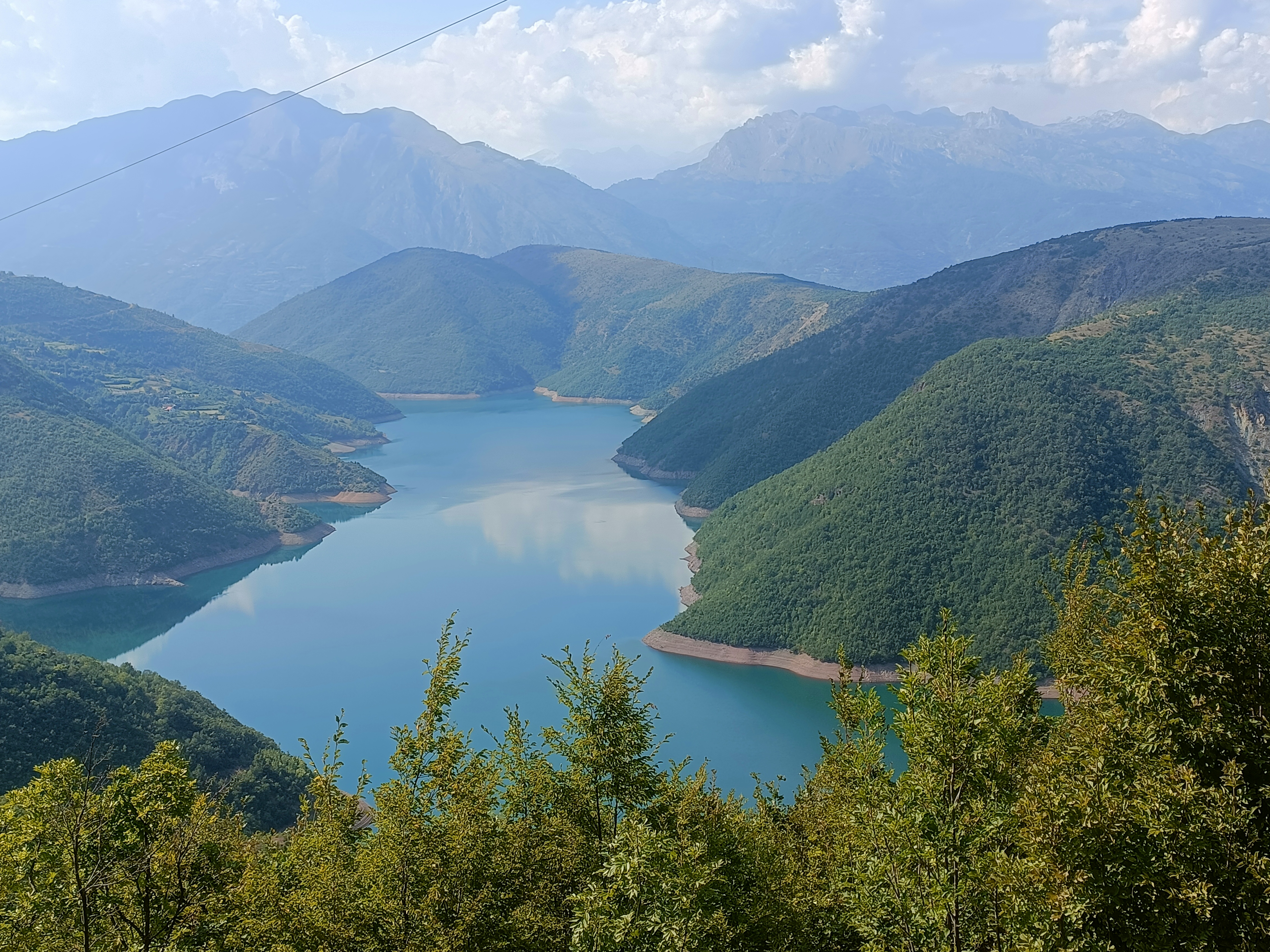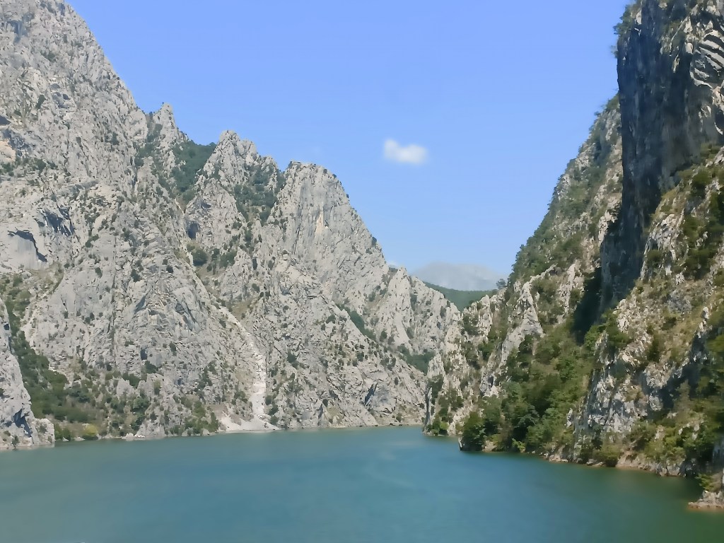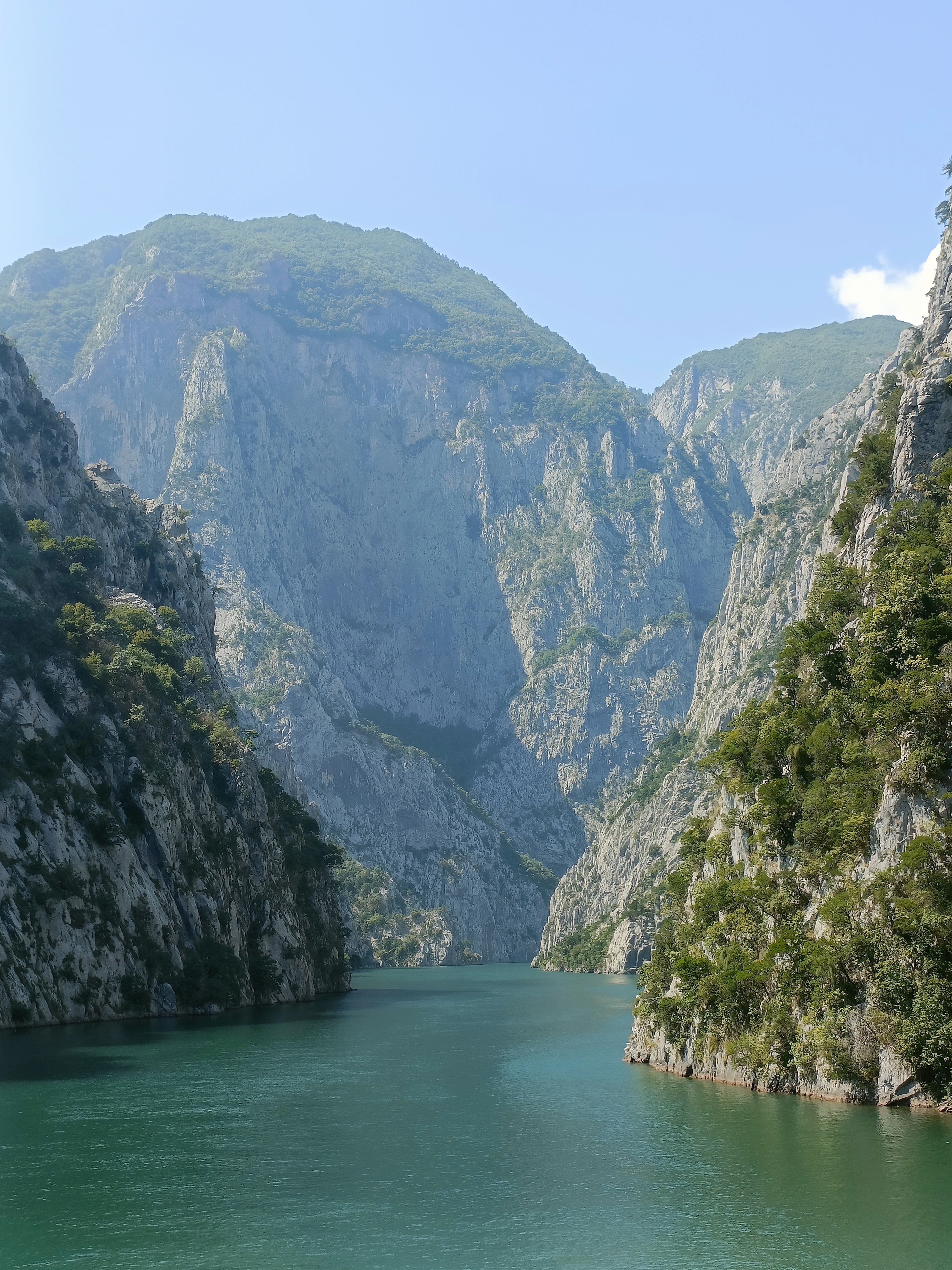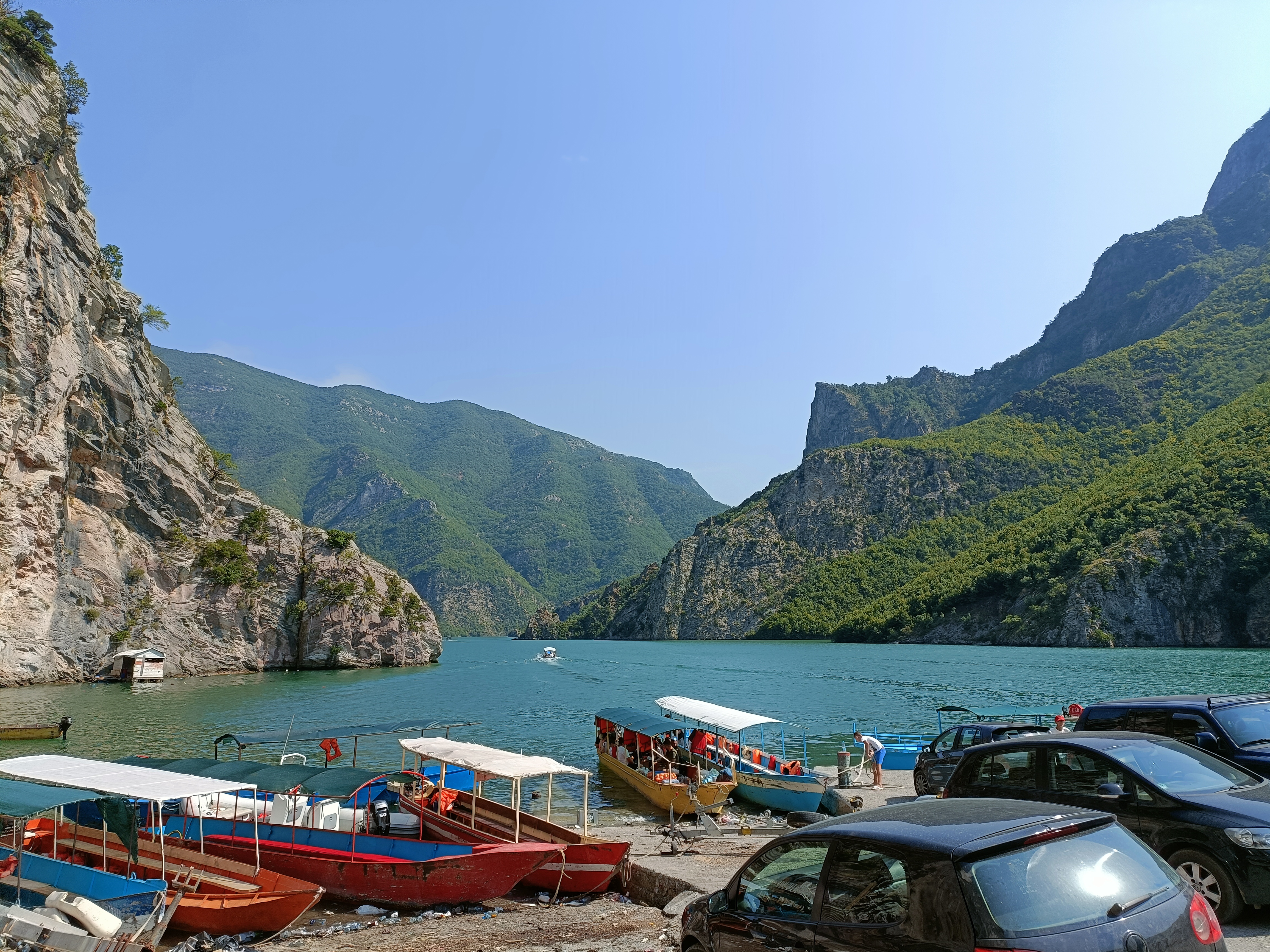 Il serait peut-être temps de reprendre le chemin vers le sud si l’on veut vraiment arriver au plus bas de la mer adriatique. Alors je pars…. vers l’est. Oui, lors des fouilles menées pour la préparation du voyage, je découvre qu’un lac artificiel traverse l’Albanie d’Ouest en Est, sur plus de 70km de Koman à Fierze. Une sorte de fjord au milieu de l’Albanie, que l’on rejoint au bout d’une piste de 50km au départ de Shkodër, sur lequel navigue un ferry pour assurer les liaisons de la population albanaise privée de la route noyée sous les eaux du lac par l’édification du barrage. Une soixantaine de personnes sur le ferry, essentiellement locale, une vingtaines de voitures, et deux motos: un slovaque tentait également l’expérience. Comme moi, il savait que les 3h de navigation allaient se faire au milieu des montagnes, dans un canyon impressionnant, mais comme moi aussi, il fut surpris de découvrir que le bar et le dance floor du bateau allaient très vite s’animer de bières et danses locales. Pour la bière, nous avons su parfaitement lui et moi nous adapter, beaucoup moins pour la danse, mais je suis prêt à m’entrainer pour une prochaine fois.