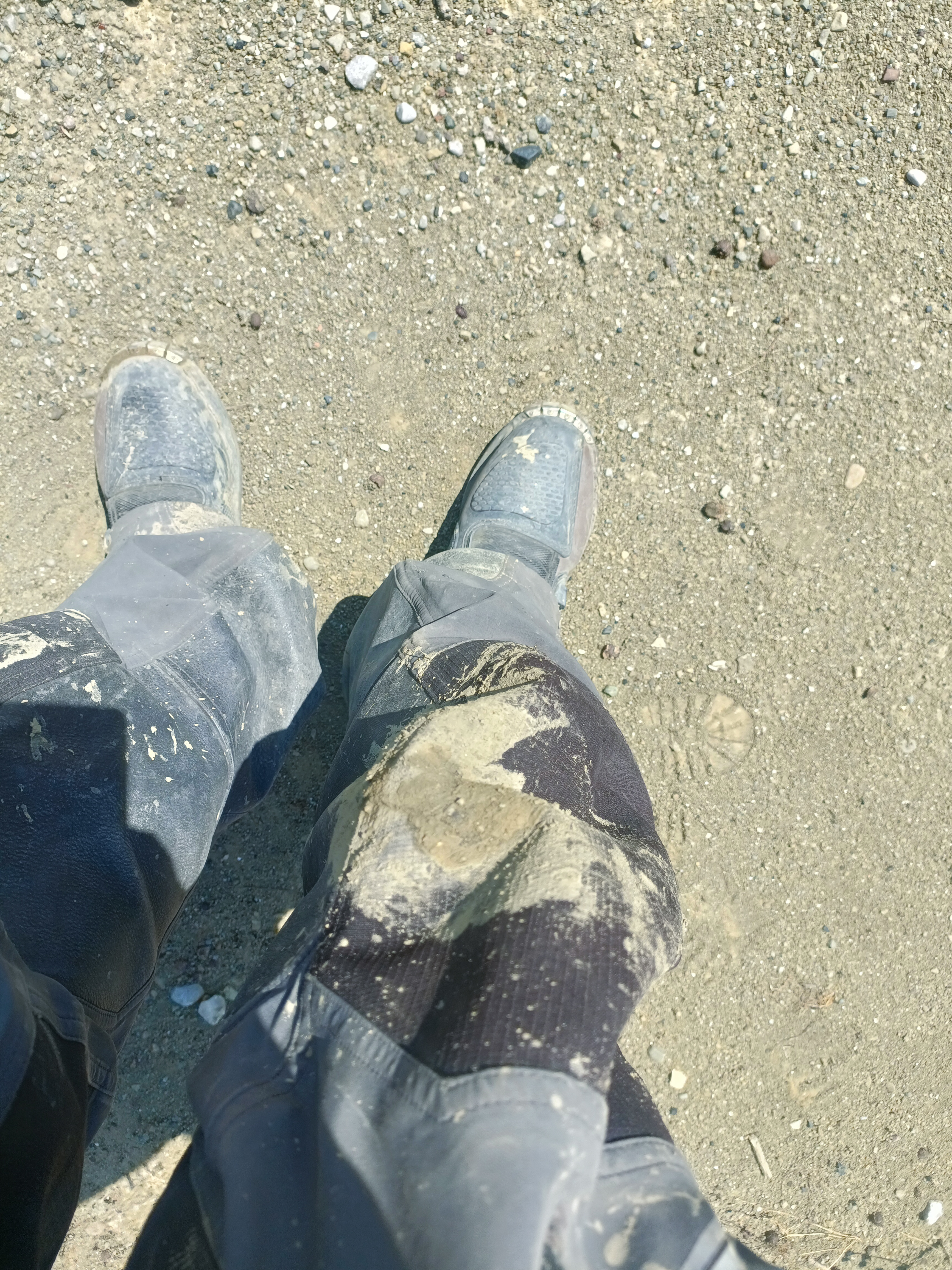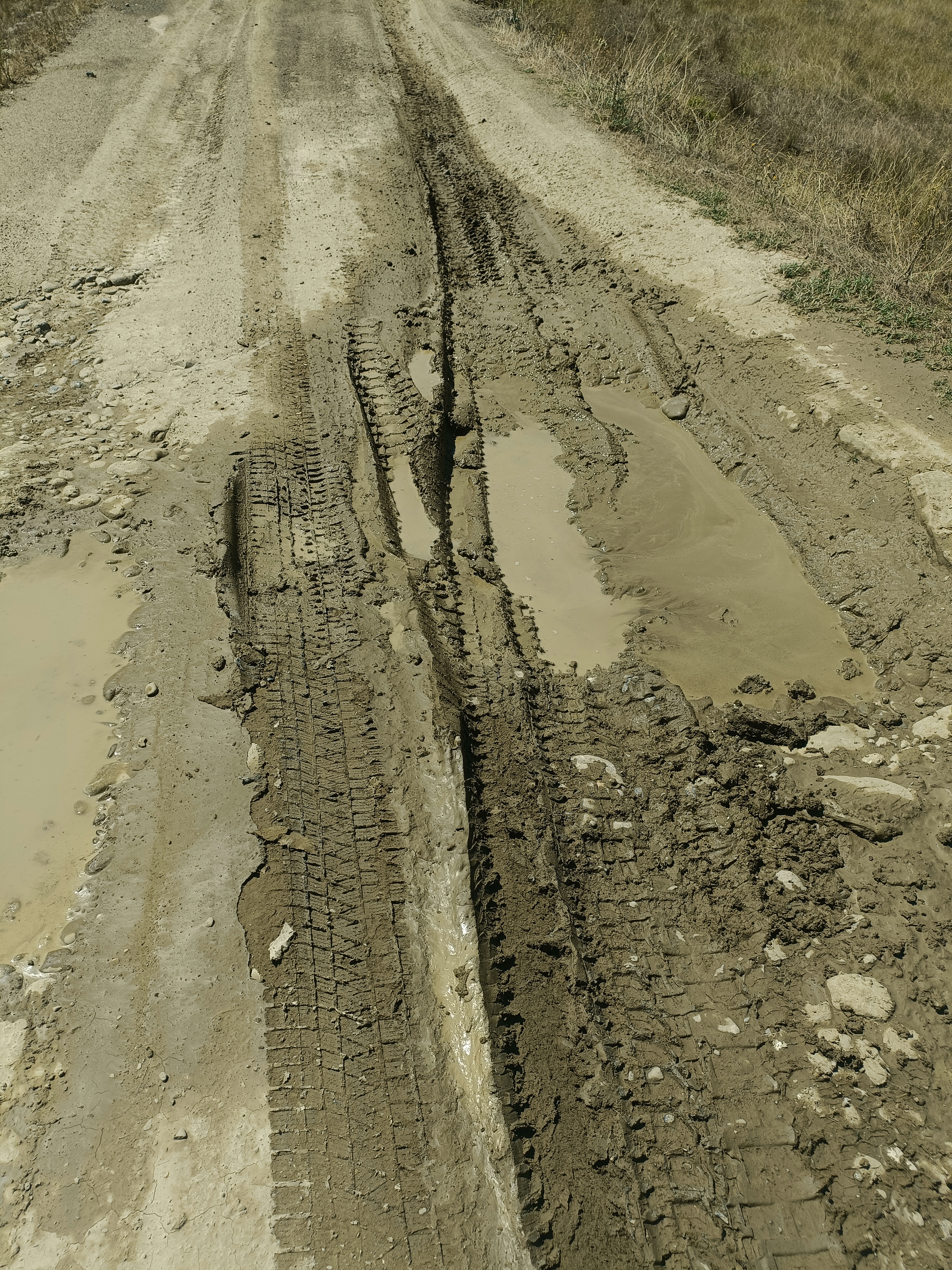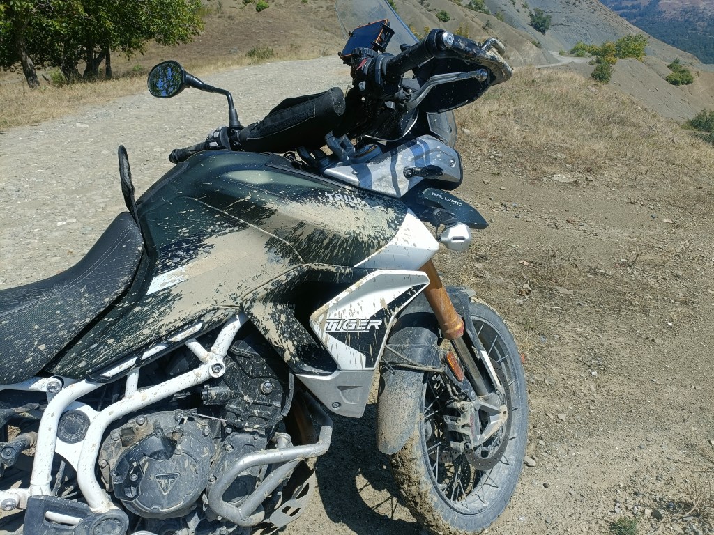 Je regarde la carte, simule sur mon GPS différentes alternatives pour rejoindre le point de chute (sans jeu de mot) prévu pour ce soir: verdict, il faut faire 150 kilomètres de petites routes tortueuses, ou 30 de pistes plus 15 de routes. Je choisis l’option 2, celle initialement prévue. Cela aura été la piste la plus difficile de tout le voyage, ornières, marches, rochers, boue. Je me concentre sur les choix de trajectoires, souffre, transpire, et laisse la Triumph user de son couple moteur pour passer les obstacles en douceur en m’économisant le plus possible. Arrivée au bout de ces 30 kilomètres, passées en deux heures et deux litres d’eau, je suis soulagé et même un peu fier de ne pas être le blaireau que je croyais être trois heures avant lorsque je me relevais de la chute.