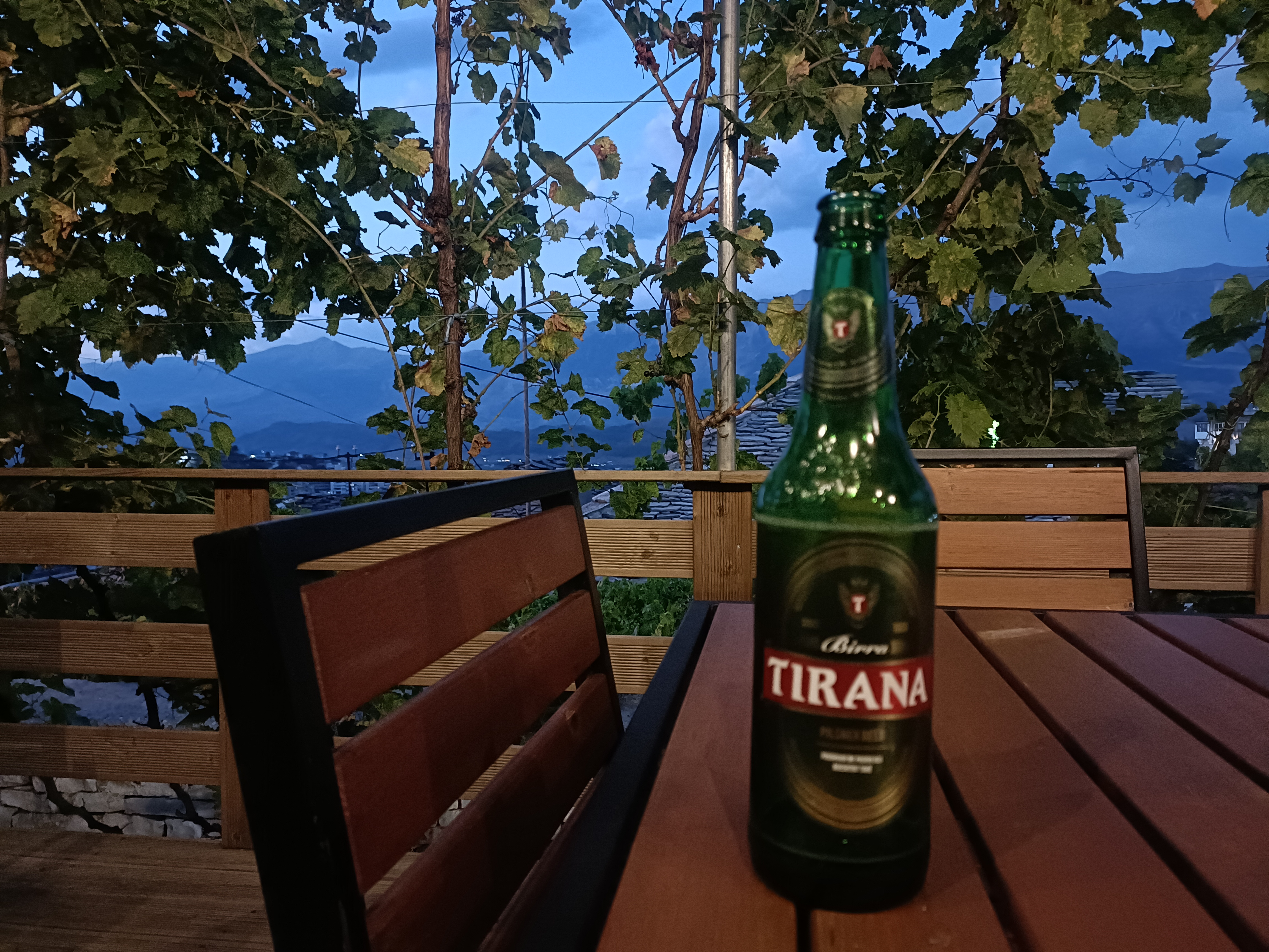 Je rejoins la ville de Gjirokaster, un des plus belles villes d’Albanie, classée par l’Unesco, avec ses maisons traditionnelles accrochées aux pentes du Mali i Gjerë. C’est dans l’une d’entre elles que je passerais la nuit. La tenancière de la guesthouse sera à mes petits soins. D’abord un bandage d’oignon et de sel autour de la cheville, je lui fais confiance, puis elle me fournit des sacs de glaçons pour soulager la douleur. Je peux ainsi passer la soirée sur sa terrasse surplombant la ville, m’hydrater de houblon albanais et me sustenter de son excellente cuisine jusqu’à ce que la fatigue m’emporte vers la chambre juste à côté, elle même juste à côté de la moto. Je vais désormais devoir m’habituer à réduire les distances pédestres entre le lit, la moto, et les spécialités locales à déguster.