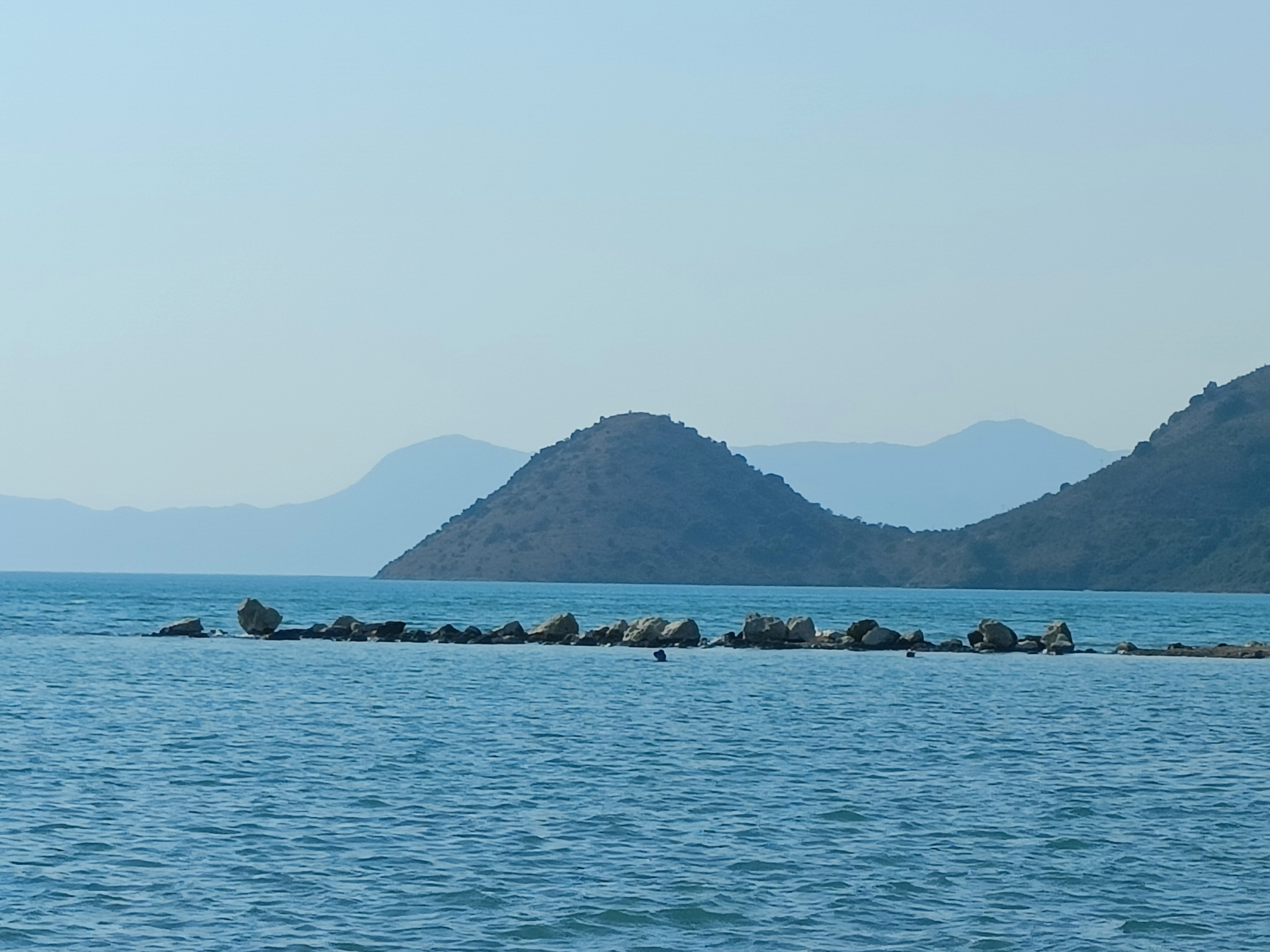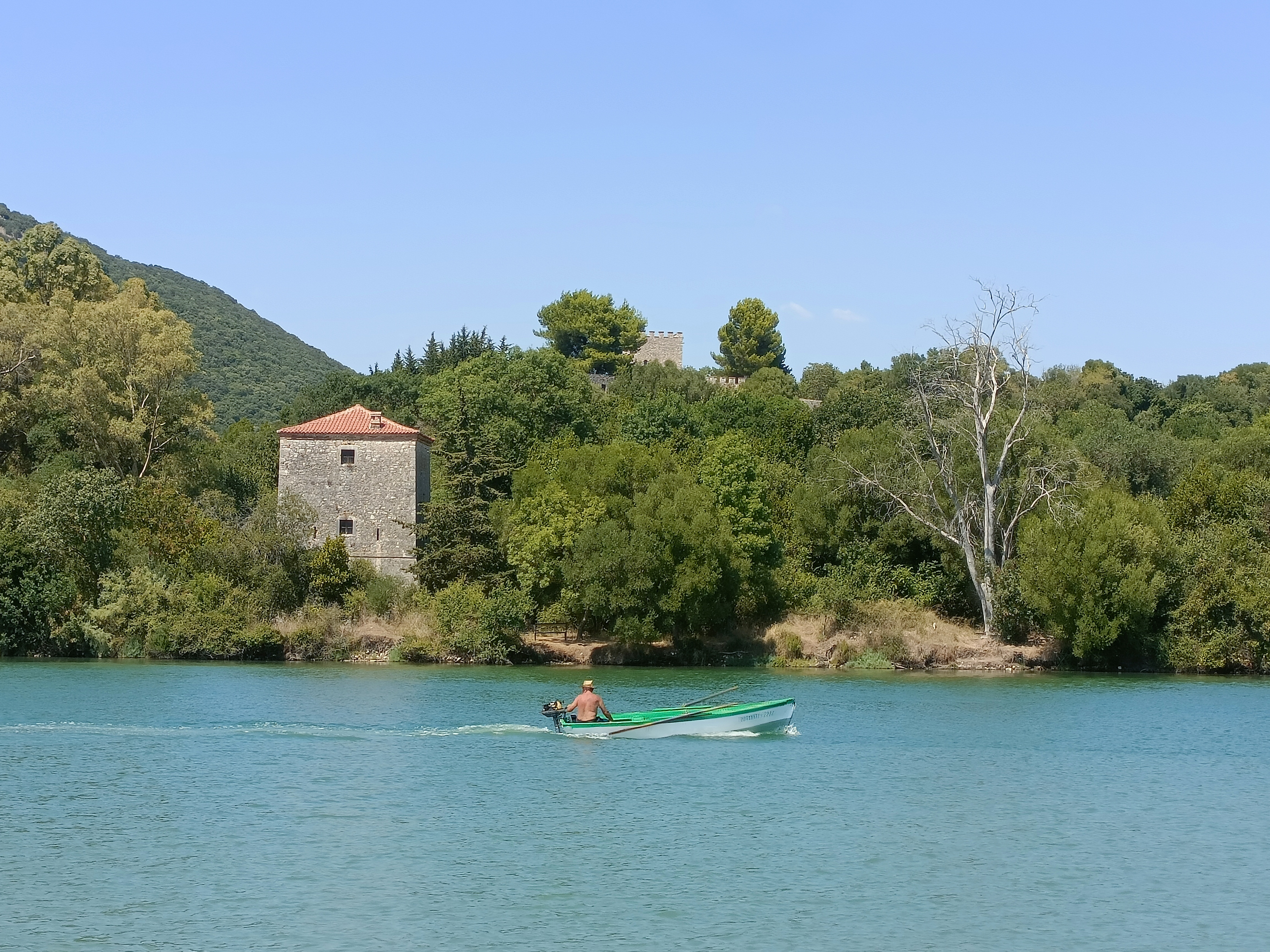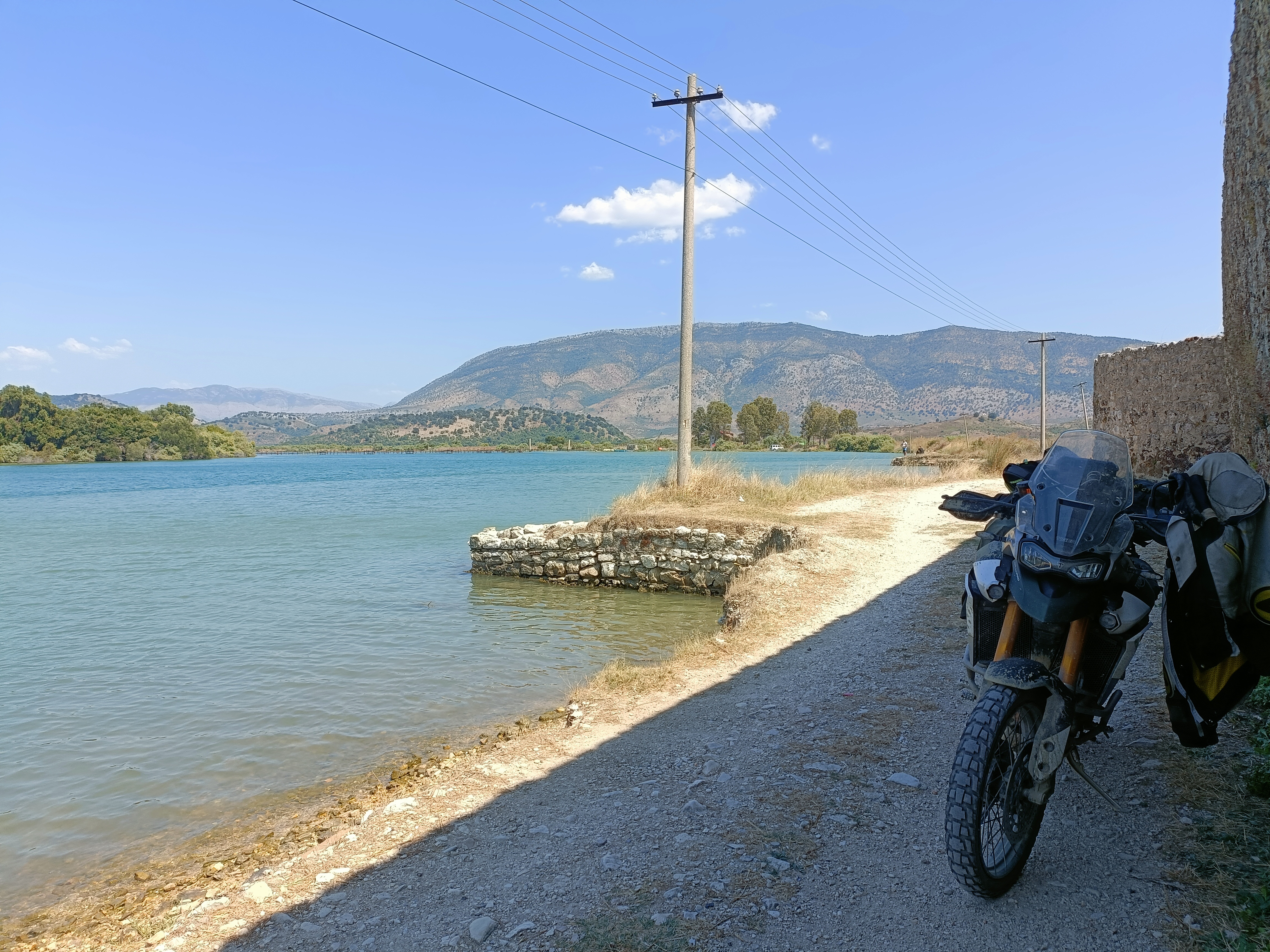 Me voilà à nouveau en direction de l’adriatique par les petites routes de montagne pendant une centaine de kilomètres, parcourus de vestiges récents de la dictature communiste (chute du régime en 1991). On plonge vers l’adriatique, que je longe jusqu’à la frontière grecque. De beaux paysages côtiers aux baies turquoises, gâchés par endroits de spéculations immobilières anarchiques. Quelques kilomètres avant la frontière, une nature préservée reprend ses droits, au niveau du parc archéologique de Butrint dans une zone humide magnifique en termes de faune et de flore. Evidemment un regret, celui de ne pouvoir aller visiter à pied le théâtre romain, tel qu’il était prévu. Je m’allonge au pied et à l’ombre des ruines d’un château vénitien en bord de canal, pour récupérer de la forte chaleur, en admirant les nombreux échassiers qui habitent le parc.