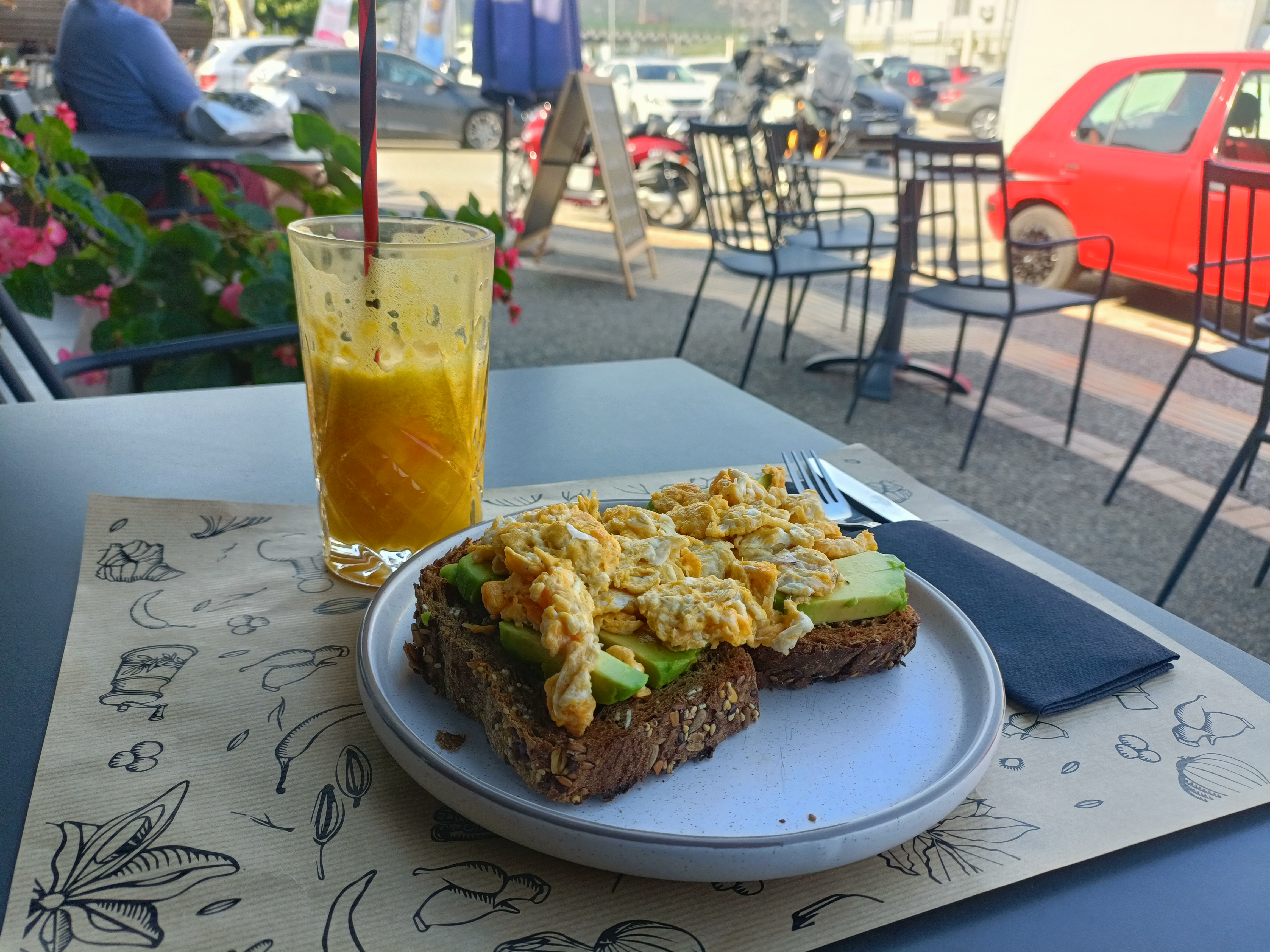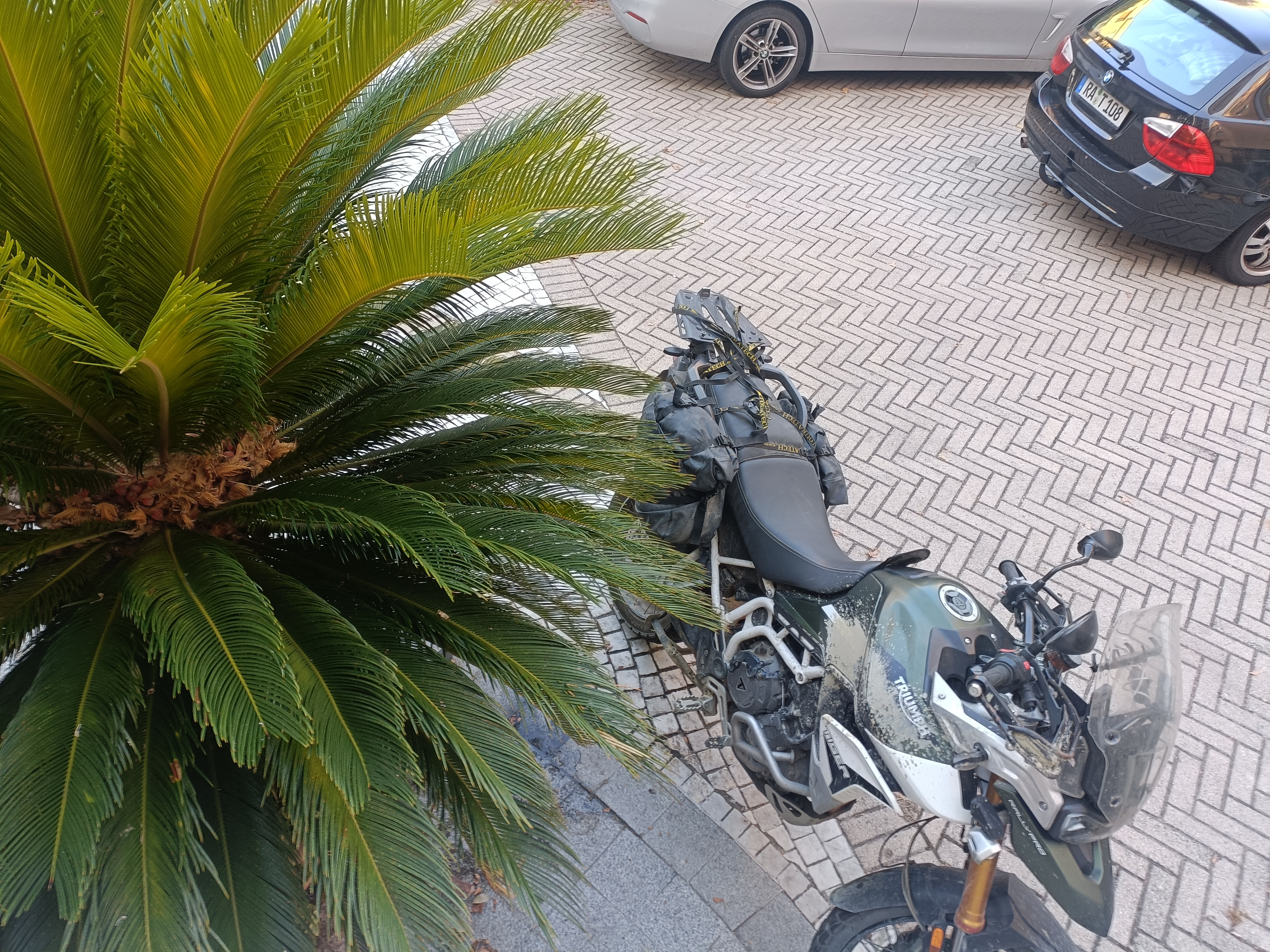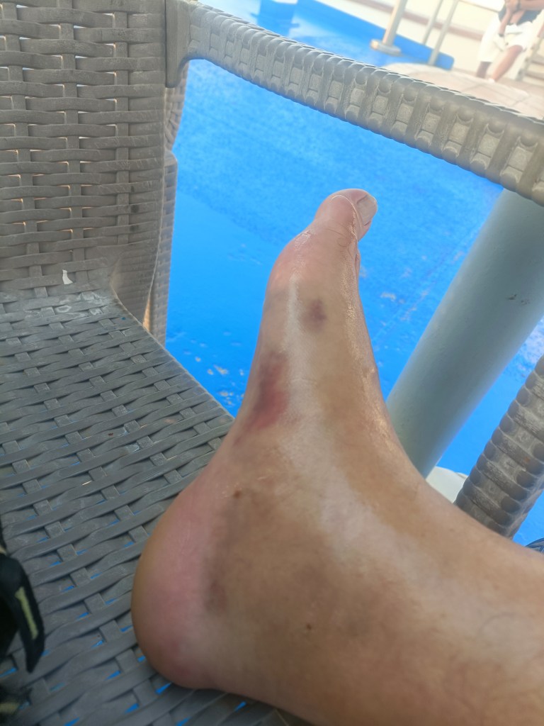 Réveil tout maché. La cheville est bleue, mais c’est aussi le genou qui a doublé de volume et un gros hématome a fait son apparition sur la cuisse. Petit dej à cloche pied, Dolipran, on sangle les bagages, et c’est reparti. Une fois sur la moto, avec les bottes hyper rigides qui font quasi office d’attelle, c’est supportable, hormis un manque de réactivité à la pédale de frein arrière. Avant de m’endormir, j’ai booké les 4 hôtels dont j’ai besoin sur le chemin du retour (1 Grèce, 3 Italie). Jusqu’à maintenant rien n’était réservé, mais là, je devais m’assurer d’avoir dans un périmètre réduit le lit, le parking et la terrasse du soir, jusqu’au retour.