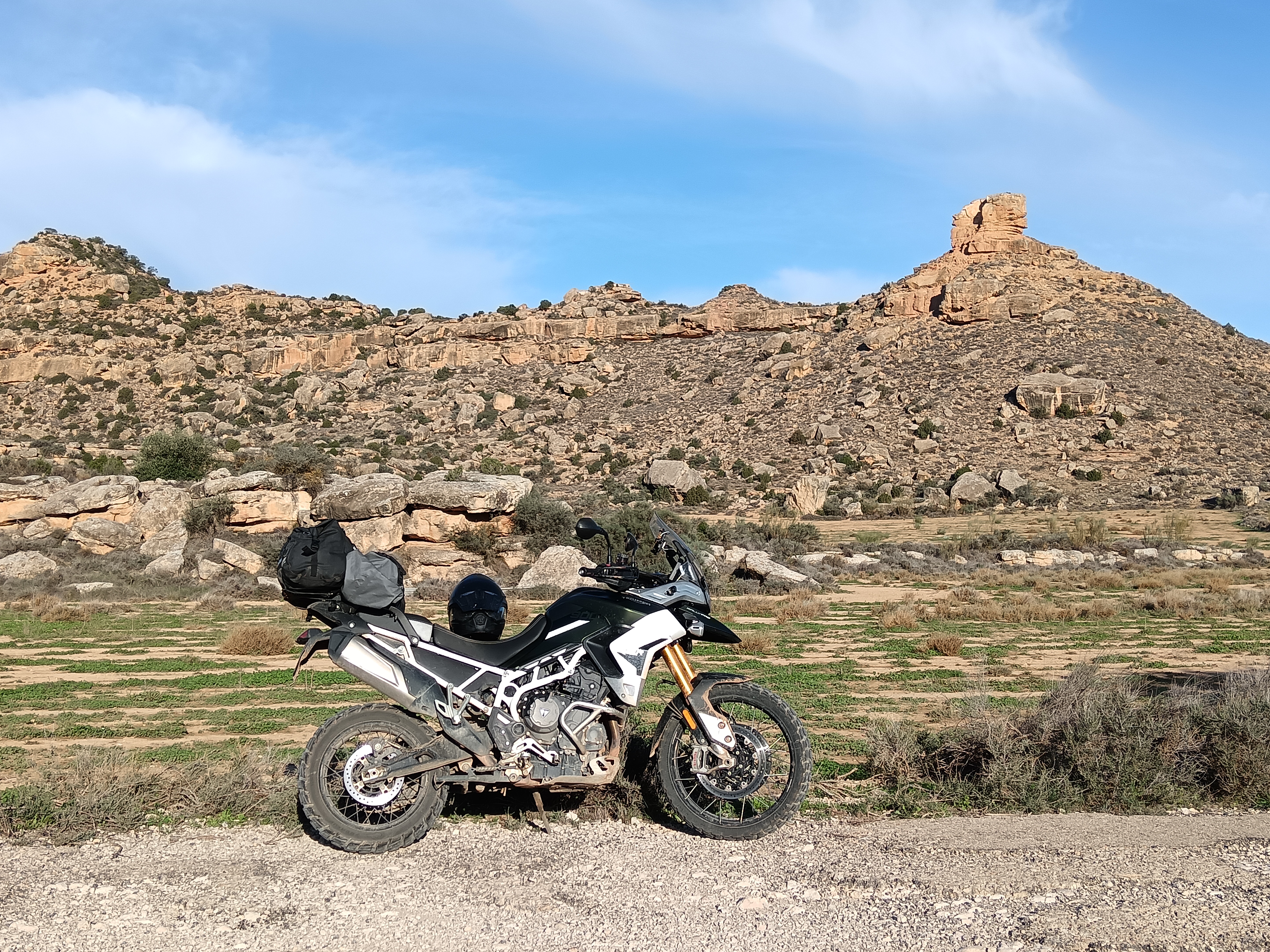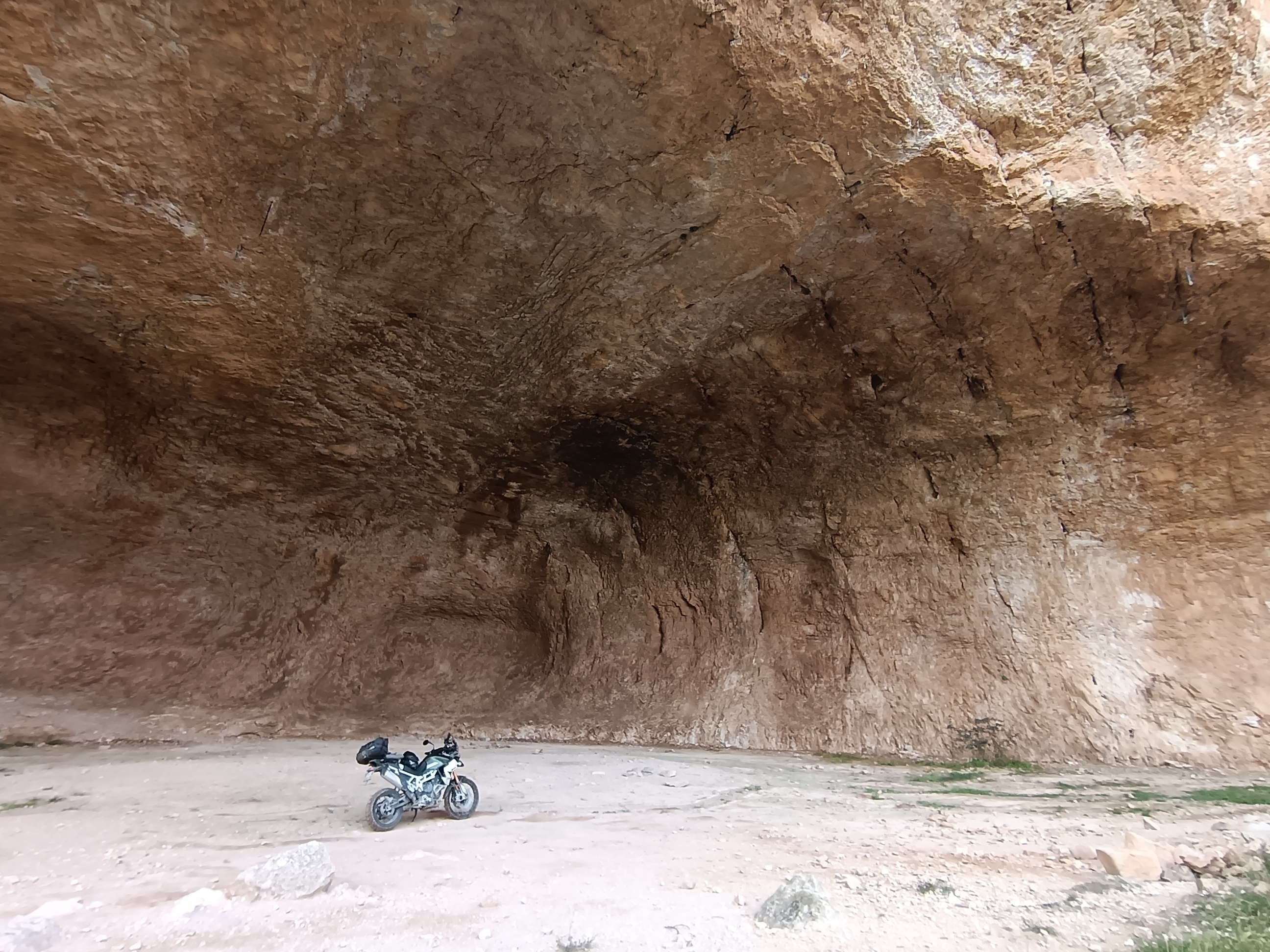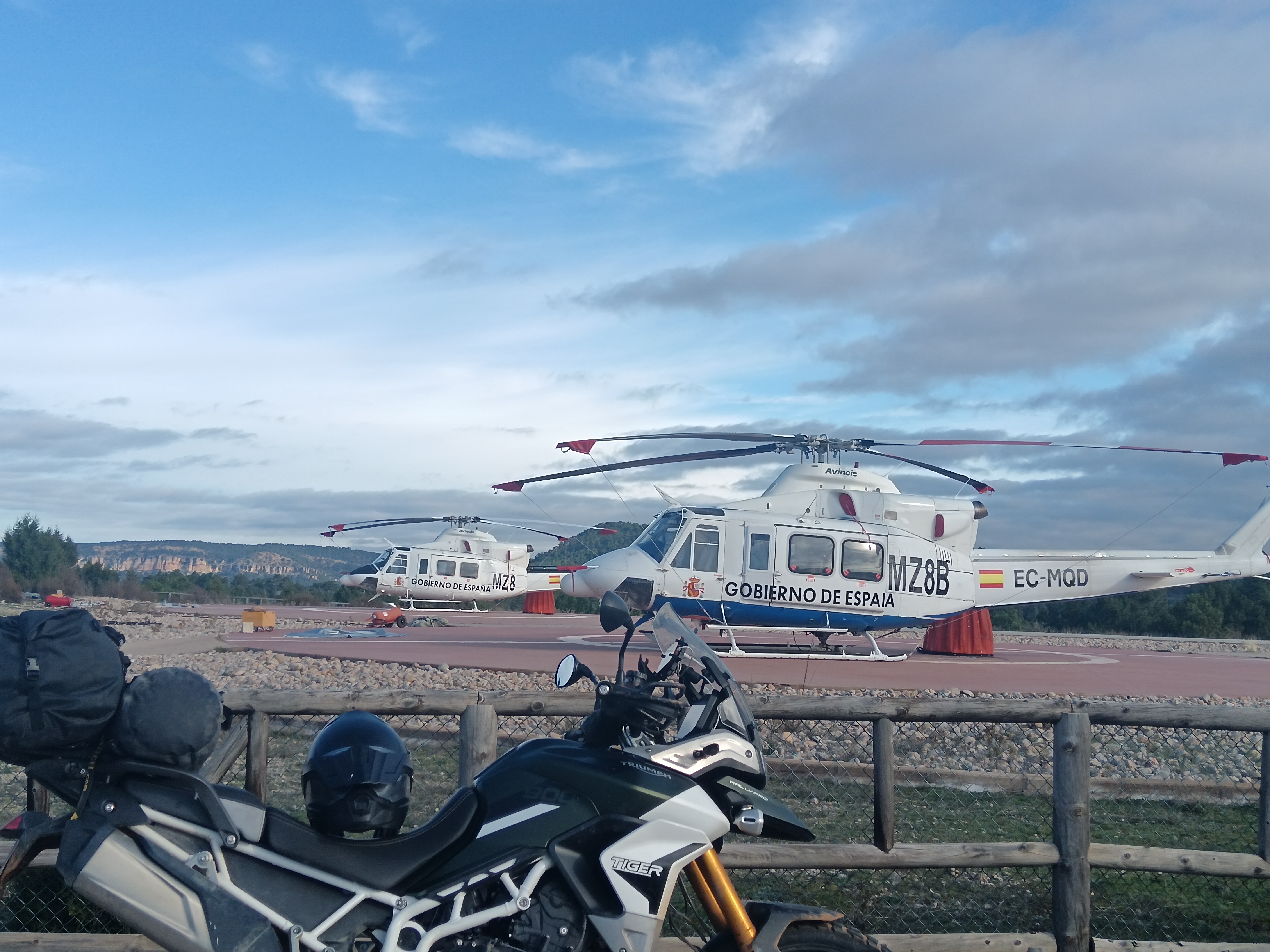 Samedi matin, conférence terminée, c’est le week-end. Je m’offre deux jours de voyage pour rentrer. Matéo annoncée très fraiche, mais ensoleillée. on entame plein est en montant sur les falaises qui surplombe Cuenca. S’en suivent trente kilomètres de pistes en crête, jusqu’à parvenir à un héliport perdu au milieu de nulle part, avec deux hélicos du gouvernement espagnol postés là. Mystère pour moi, à creuser. Je poursuis par des pistes de terre rouge, plusieurs petits cols, avant d’arrivée près de Teruel au village très touristique, et il est vrai très beau, d’Albaraccin, flanqué entre deux falaises ocres. Une centaine de kilomètres de plateaux arides (plus de stations essence, rien à bouffer, j’ai la dalle), et nous voilà dans le Maestrazgo, superbe chaine de montagne à la densité de population qui ferait pâlir la Laponie. Plusieurs pistes, dans des canyons très étroits, assez inaccessibles en voiture. Une centaine de kilomètres ainsi jusqu’au barrage de Castellote, puis une nuit dans la petite ville de Alcorisa et le très typique petit hôtel de Casa de la Fuente, dont le tenancier sera de très bon conseil pour ce qui est de mon alimentation du soir.