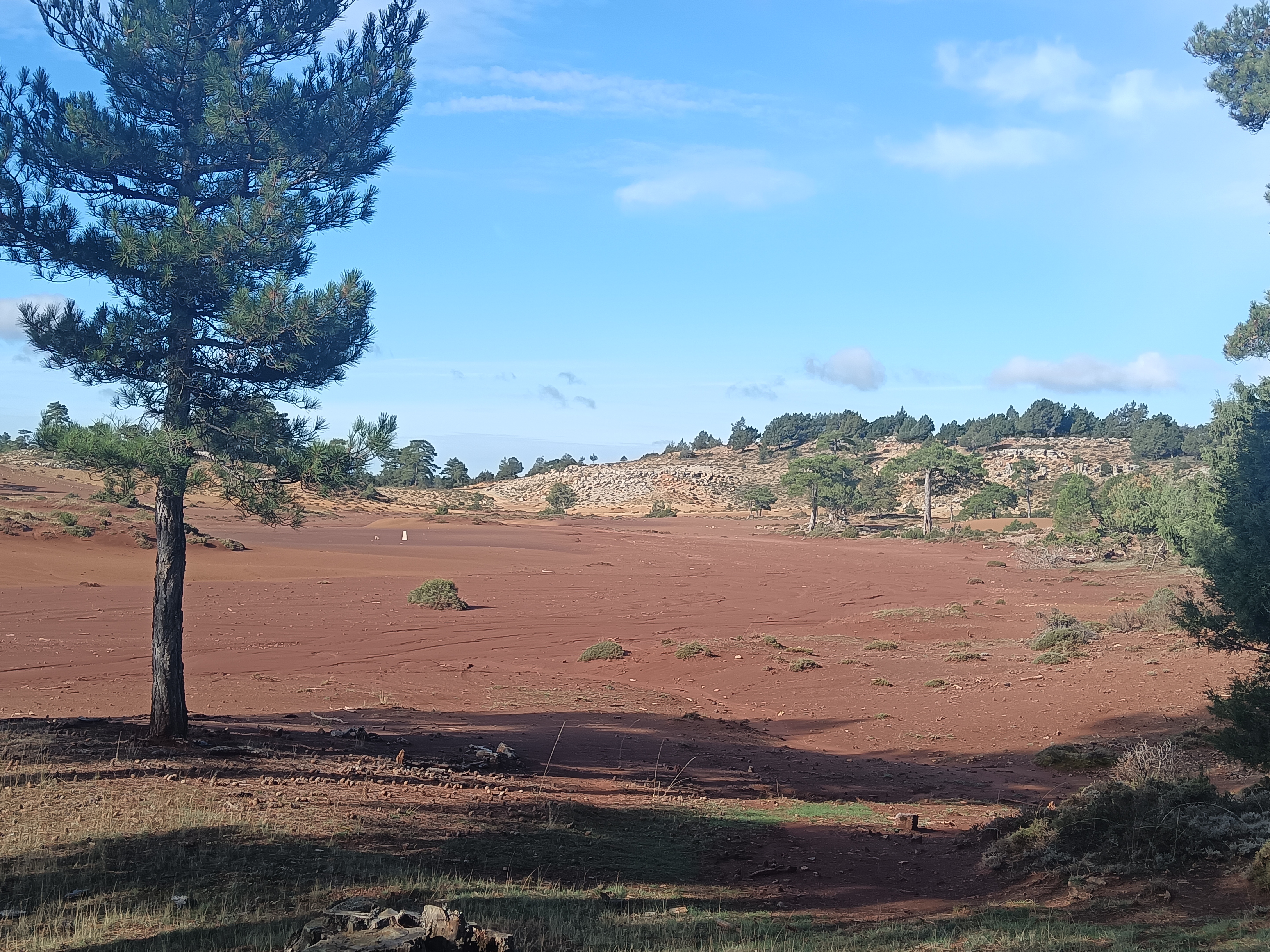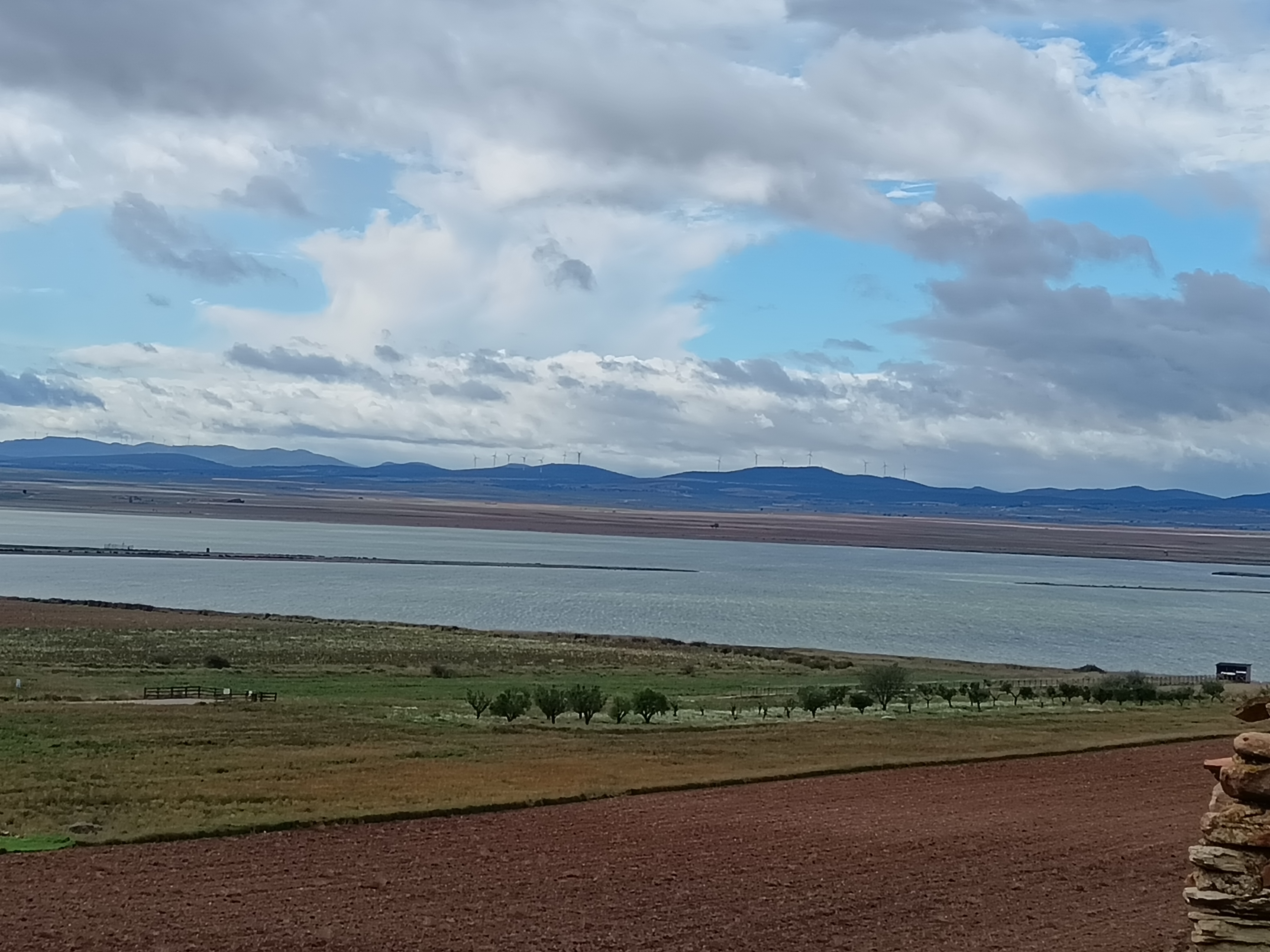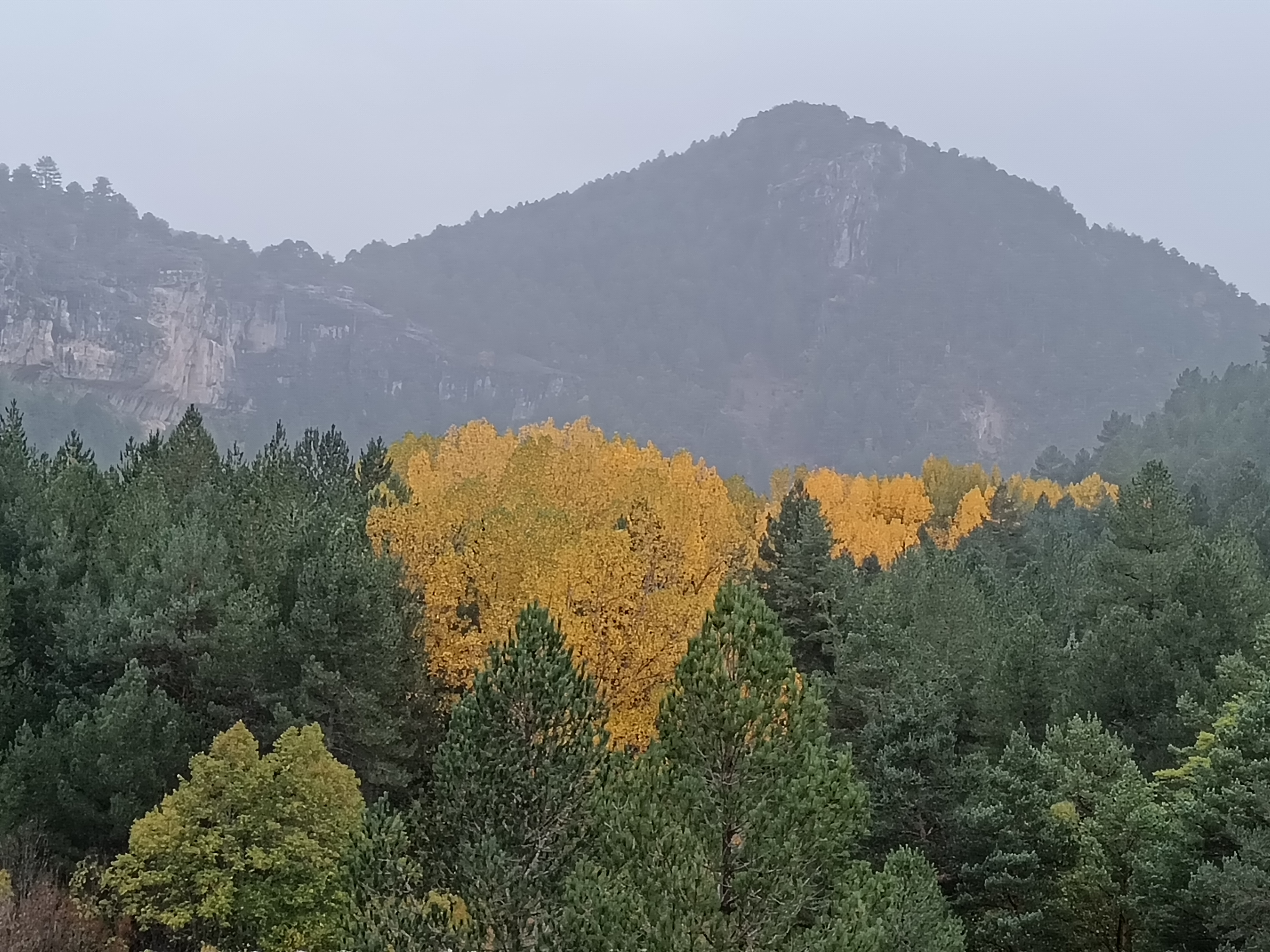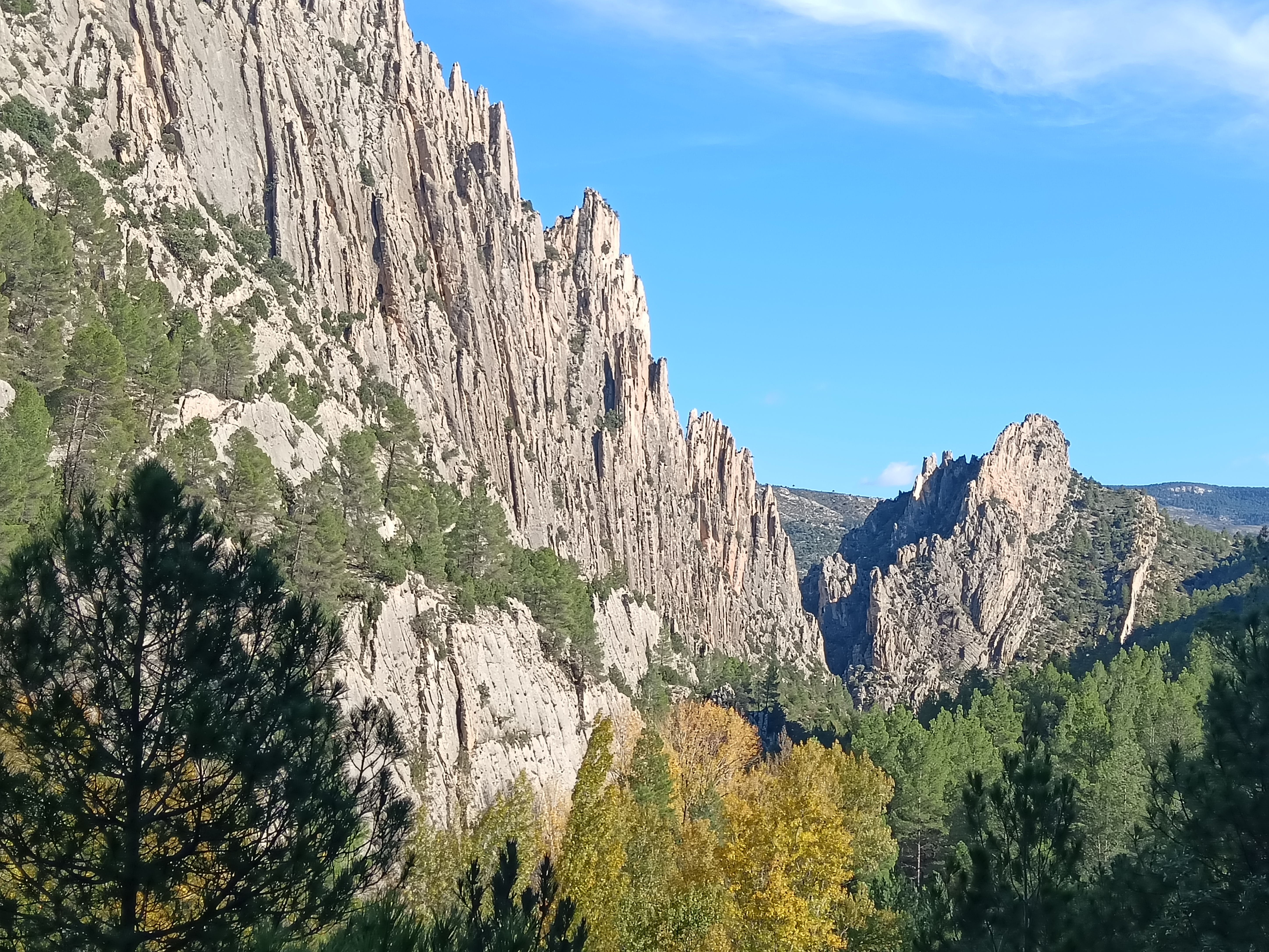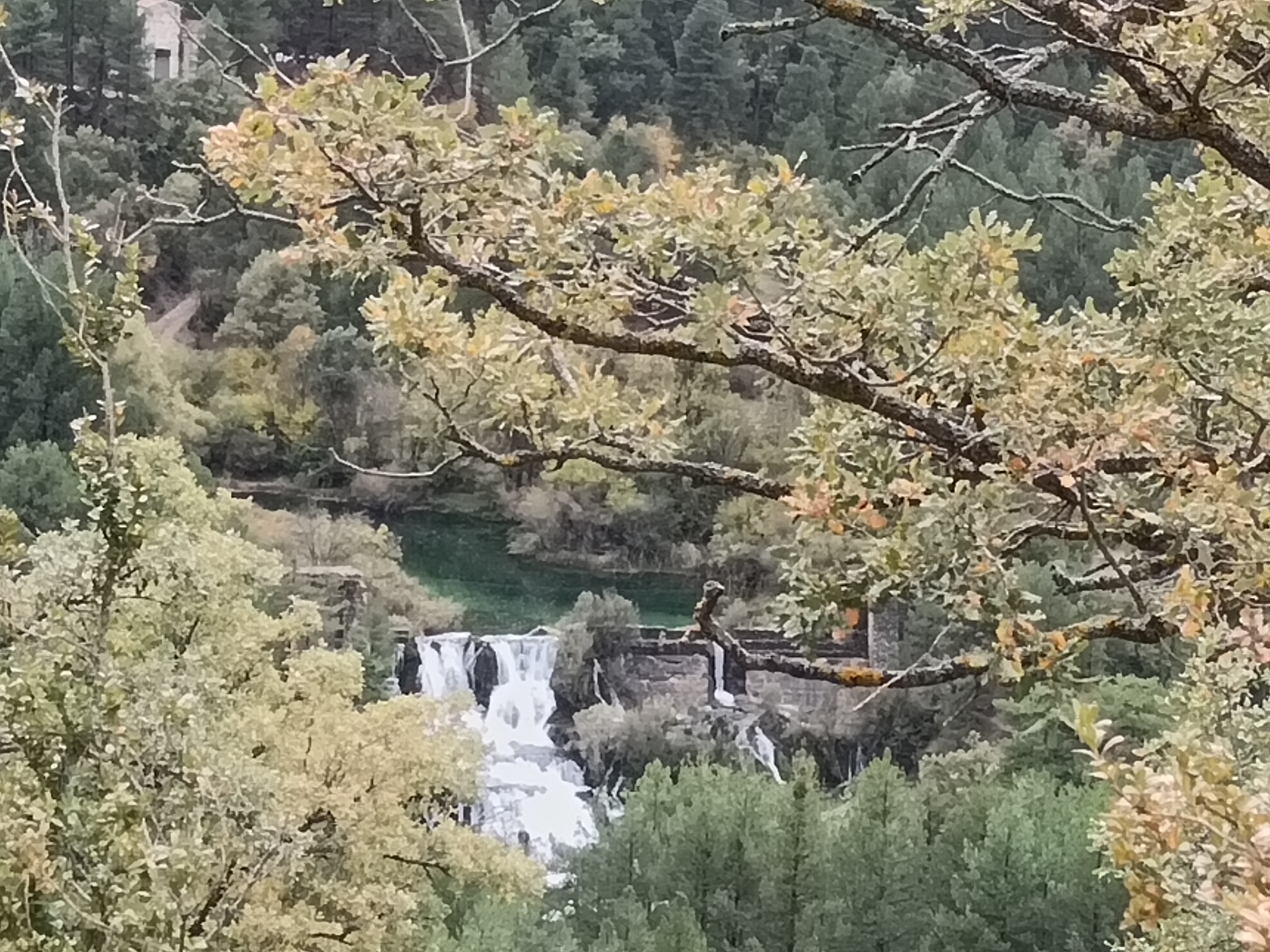 Réveil et descente dans l’excellente patisserie de l’hôtel. Puis une heure sèche cheveux en main pour sécher encore quelques affaires. Et nous voilà prêt à repartir. Soleil, averses, gros vent, froid, mais n’est ce pas un trop automnal ? Plusieurs curiosités au programme jusqu’à Cuenca. On commence au sud des Monegros, à l’ouest de Belchite, par le Foz de Zafrané, étonnant canyon dont on accède au fond par une piste, pour parvenir à une impressionnante cavité. On poursuit vers le sud, jusqu’à Daroca, d’où démarre le col qui mène à un impressionnant plateau, à la frontière Aragon/Mancha. Sur ce plateau, ne pas manquer la lagune de Gallocante, une lagune salée, d’environ 10km de long pour 1 ou 2 de large, à plus de 1000m d’altitude. Je m’en approche au mieux par quelques pistes, pour y admirer quelques espèces d’oiseaux et autres échassiers. On continue jusqu’à Molina de Aragon, avant d’entrer dans le parc naturel du Alto Tajo, pour une centaine de kilomètres d’étroites routes et pistes jusqu’à Cuenca. Seulement 100 kilomètres, mais compter au moins 4 heures, tant il y a de motifs à arrêts et contemplations. Parmi les intérêts de ce parc, outre de croiser plus de cervidés et rapaces que d’humains, on notera la piste forestière longeant le Taje, qui débute à la sortie de Taravilla, et se termine au pont de Martinete. On longe la rivière au plus près de sa source avant qu’elle ne meure à Lisbonne après avoir grossi tout au long de son parcours ibérique, au fond d’un magnifique canyon à cette saison verdoyant et jaunissant. Autre arrêt incontournable: les cascades du Rio Cuervo. Puis plus au sud encore, los callejones de las Majadas, étonnant ensemble de formes géologiques. Arrivée à Cuenca, bien épuisé, moins spongieux que la veille, mais pas vraiment sec non plus. Il est temps de passer à la science, non sans tester croquetas et agneau locaux.