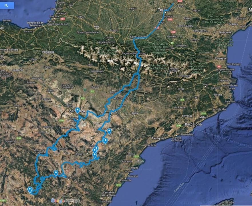 Il semblerait que le voyage aoutien n’ait pas totalement comblé (et esquinté) l’anglaise qui en aura redemandé encore, des pistes et petites routes tournicoteuses. J’ai eu beau lui expliqur que dans la vie j’ai un métier le reste de l’année, et que c’est grâce à ce dernier que ses trois infatigables pistons peuvent aller s’agiter l’été. Face à la fronde, j’ai du céder, et c’est alors que je profitais d’une conférence scientifique en Espagne (mon métier donc) en cette fin octobre pour offrir à la brexiteuse l’occasion d’un rab de caillasses et payages, arguant que l’avion ça pollue toussa toussa. Un voyage de 1800km à travers le Nord et Centre Est de l’Espagne, réalisé en 2 fois 2 jours, avec au milieu 3 jours de conférence dans la magnifique ville de Cuenca, dans la Castille-La-Manche, et son Université. Le parcours est screené ci-dessous, et je vous en dis plus en dessous encore, en images et ressentis, pour l’aller, le retour. On termine avec quelques photos de Cuenca durant la conférence, et les incontournables souvenirs culinaires et houblonnesques.