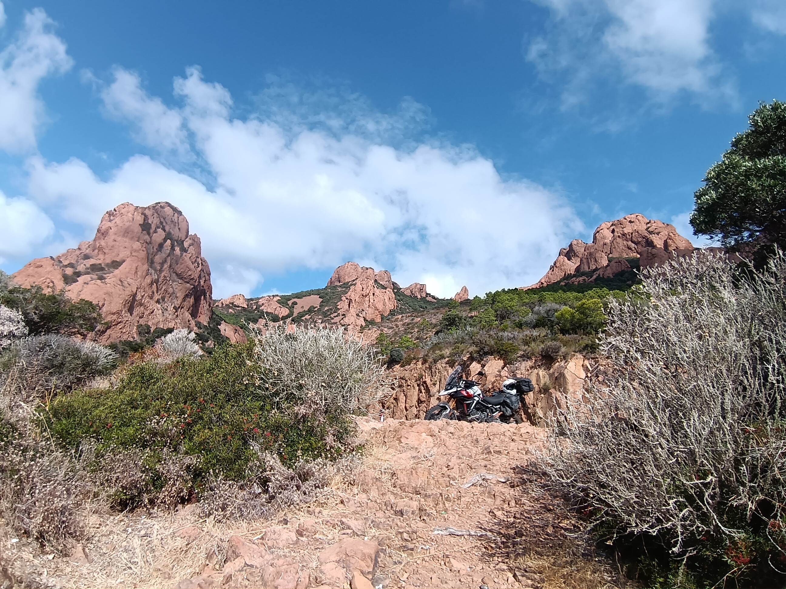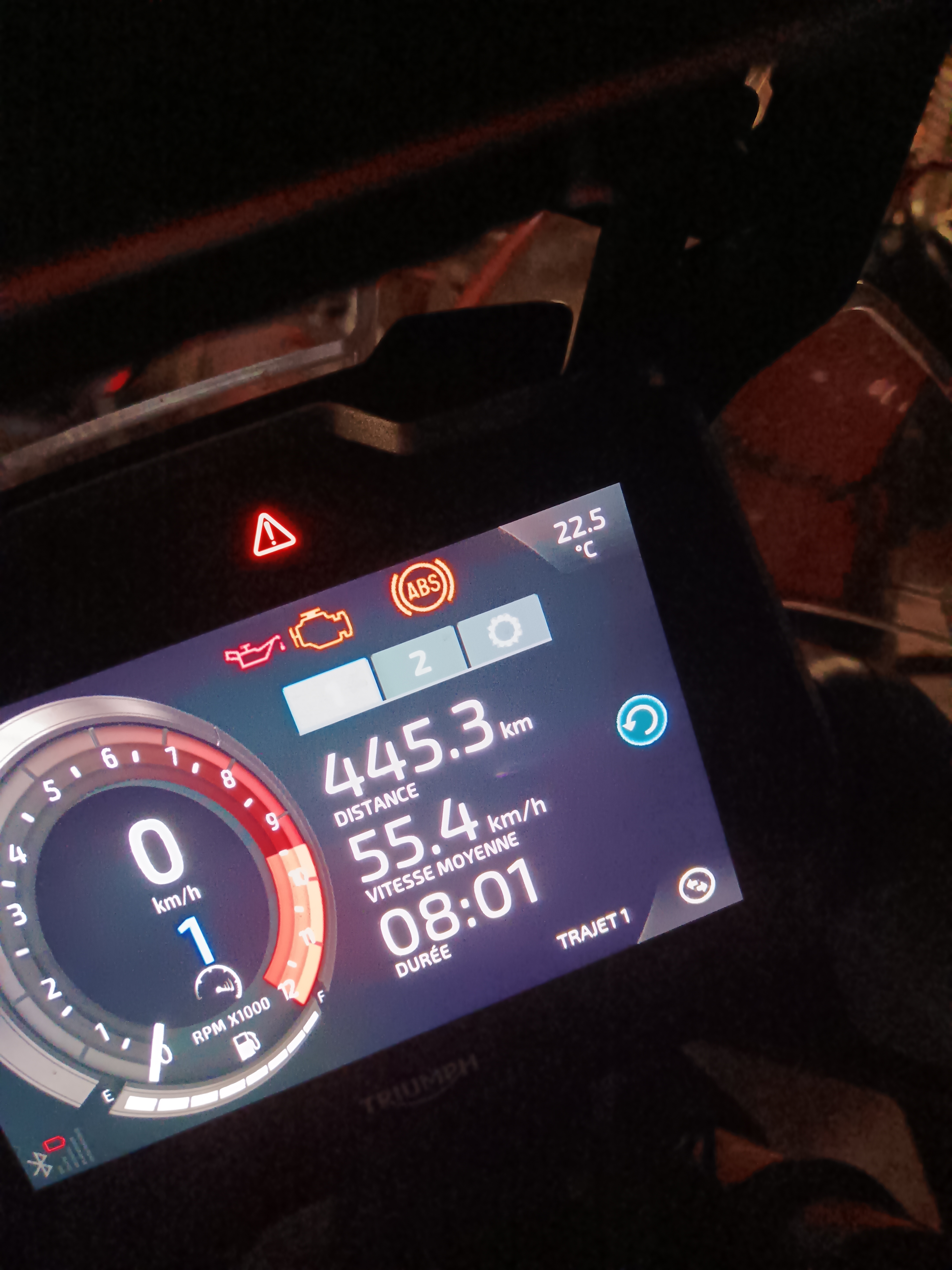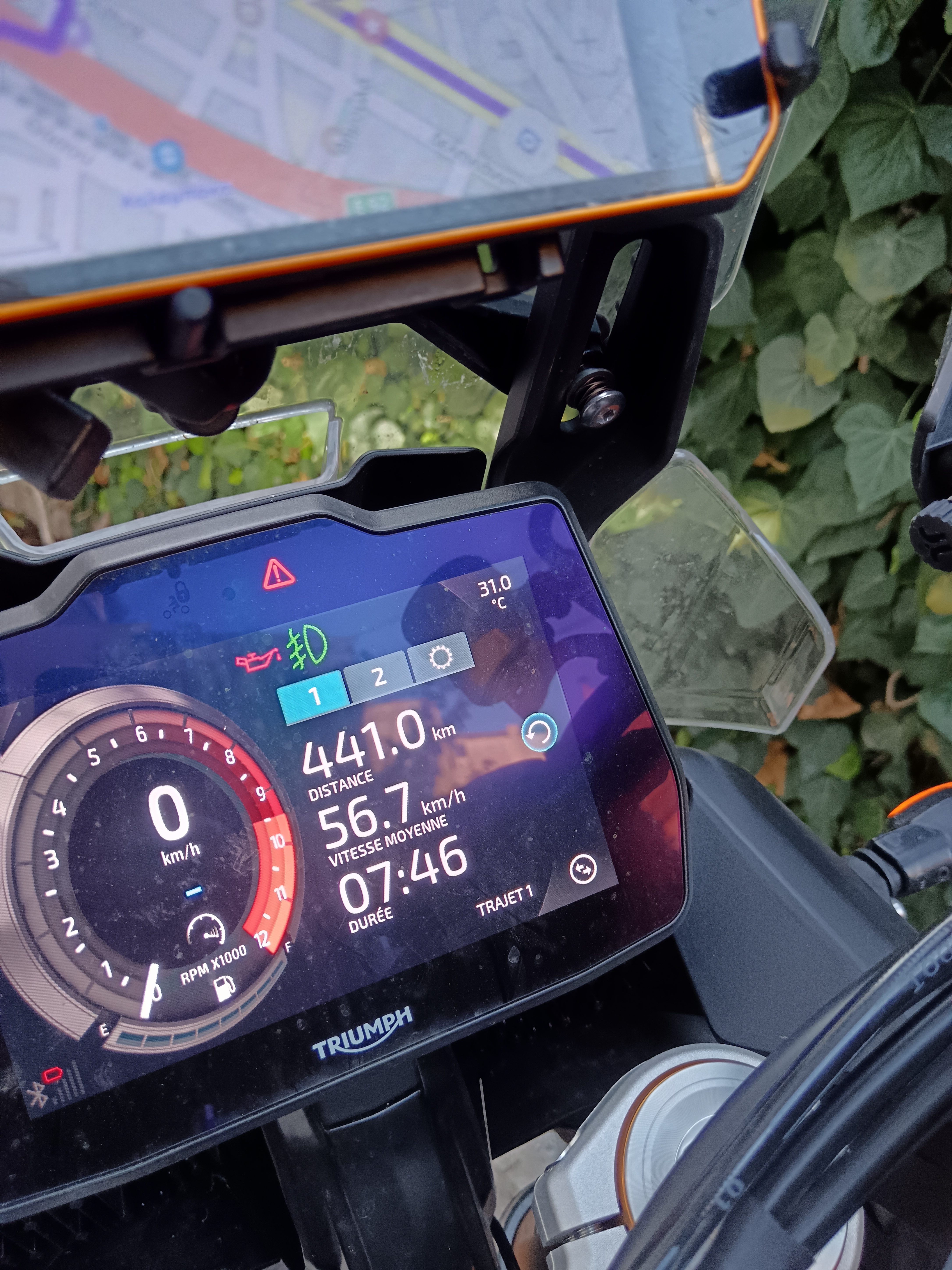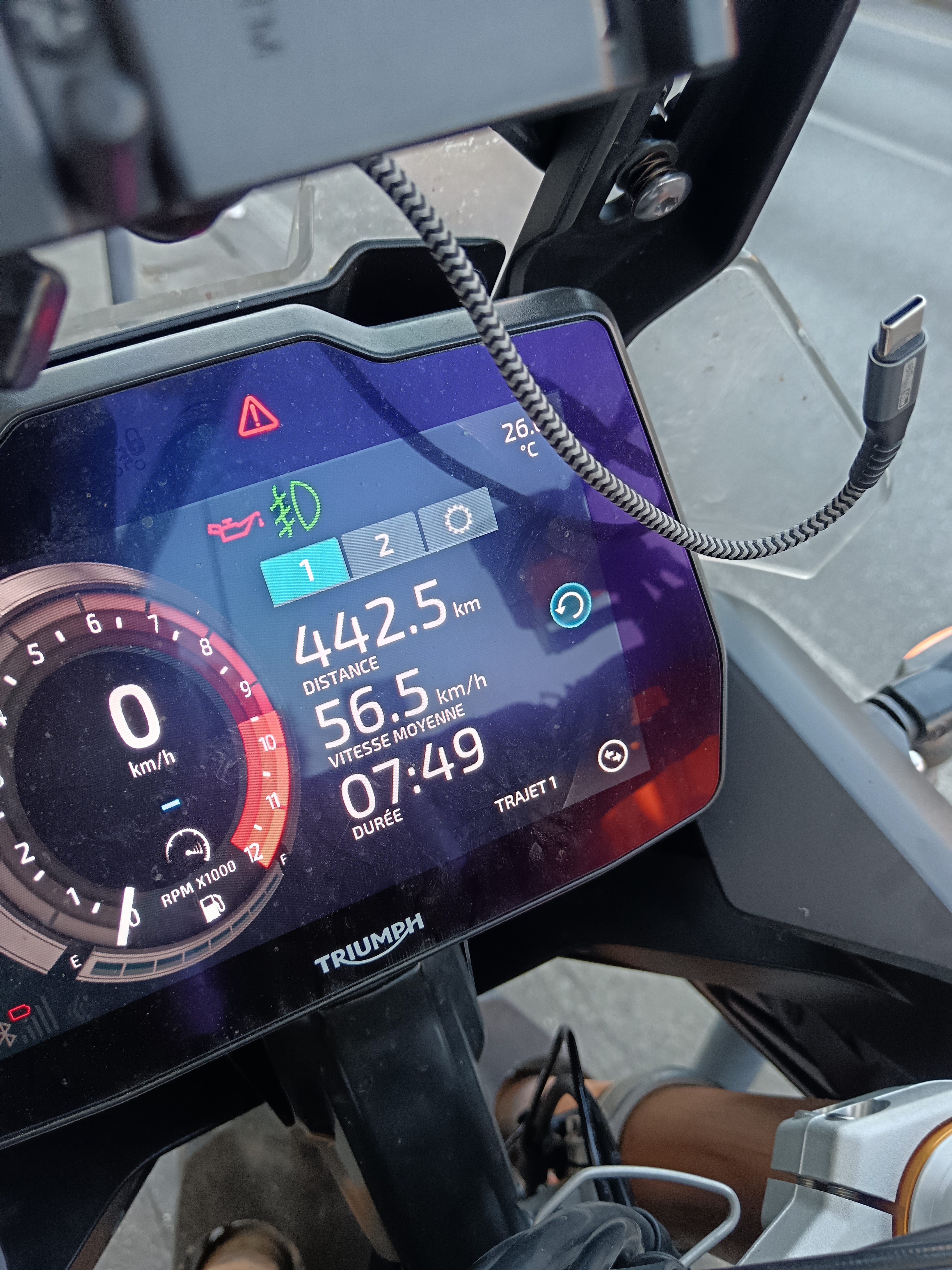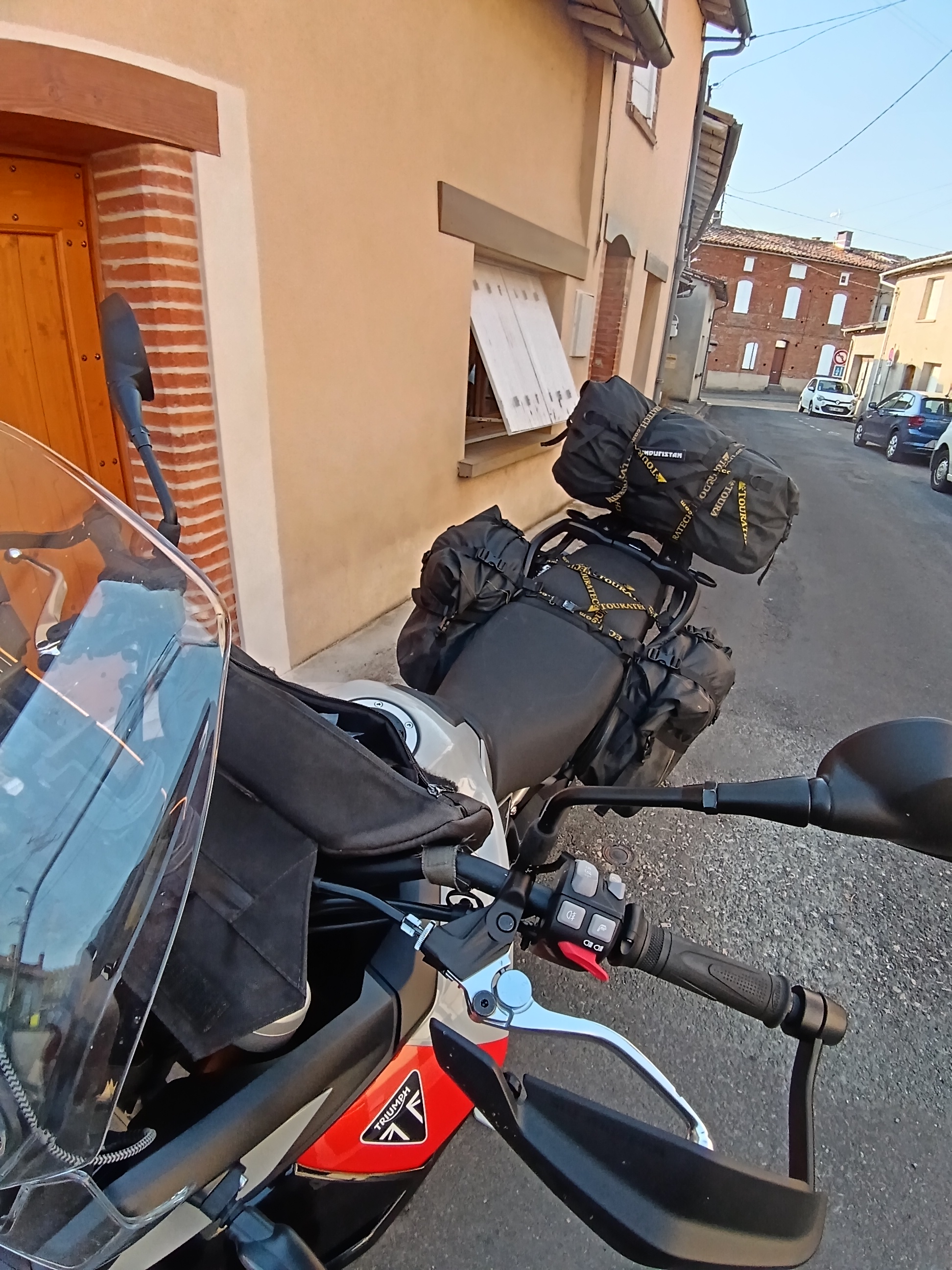 La trace a été préparée deux mois durant pendant les soirées, sur MyMaps, puis transférée sur un vieux téléphone de chantier étanche via l’application Osmand, solidement arrimé derrière la bulle de la jeune Brexiteuse. Si bien que parler d’aventure aventureuse serait pur mensonge: il suffit de vérifier de temps en temps que le petit point bleu ne s’écarte pas de la trace rouge. Le reste du temps, il n’y a qu’à contempler sans s’inquiéter, la technologie nous amènera à bon port. D’autres vous diront qu’ils sont des aventuriers, alors même qu’ils importent des traces qu’ils n’ont pas même réalisées. Ceux-là même en général qui fixent un piquet de tomates à leur guidon, affublé d’une (quand c’est pas deux) caméras pour montrer à des inconnus sur YouTube comment ils penchent dans les virages. Aucun artifice de ce type de ma part. Juste rouler, contempler, rouler, contempler.
