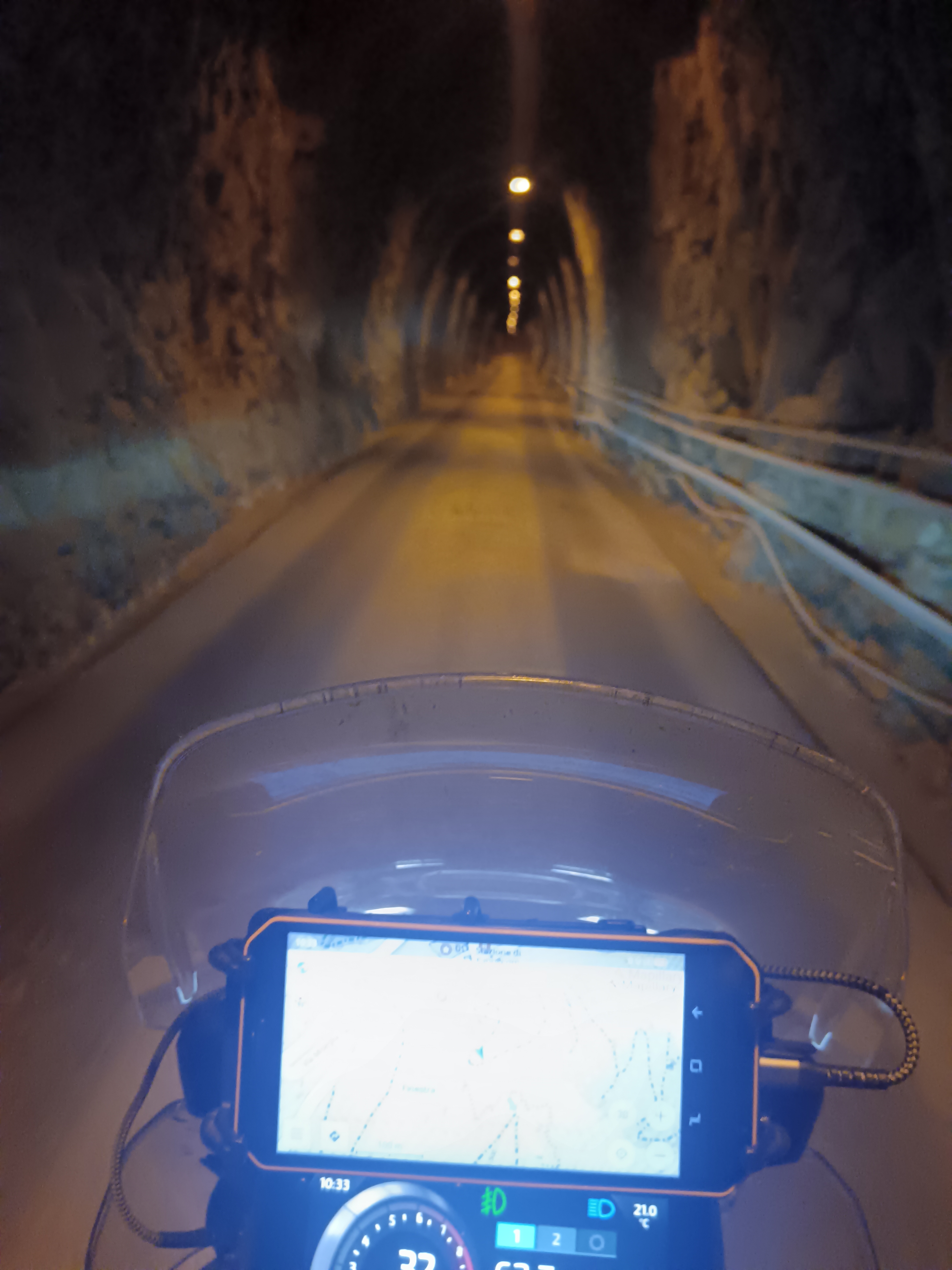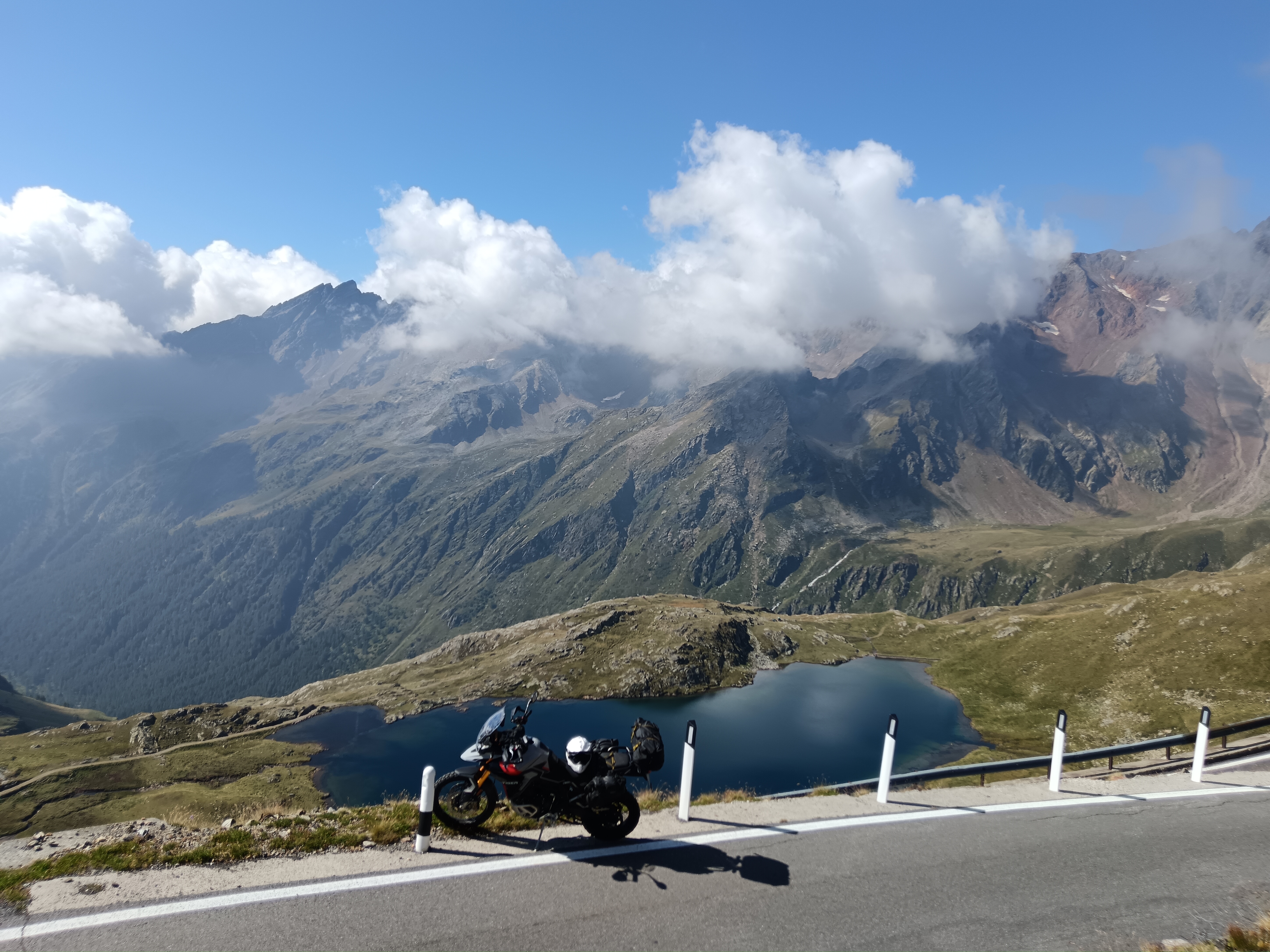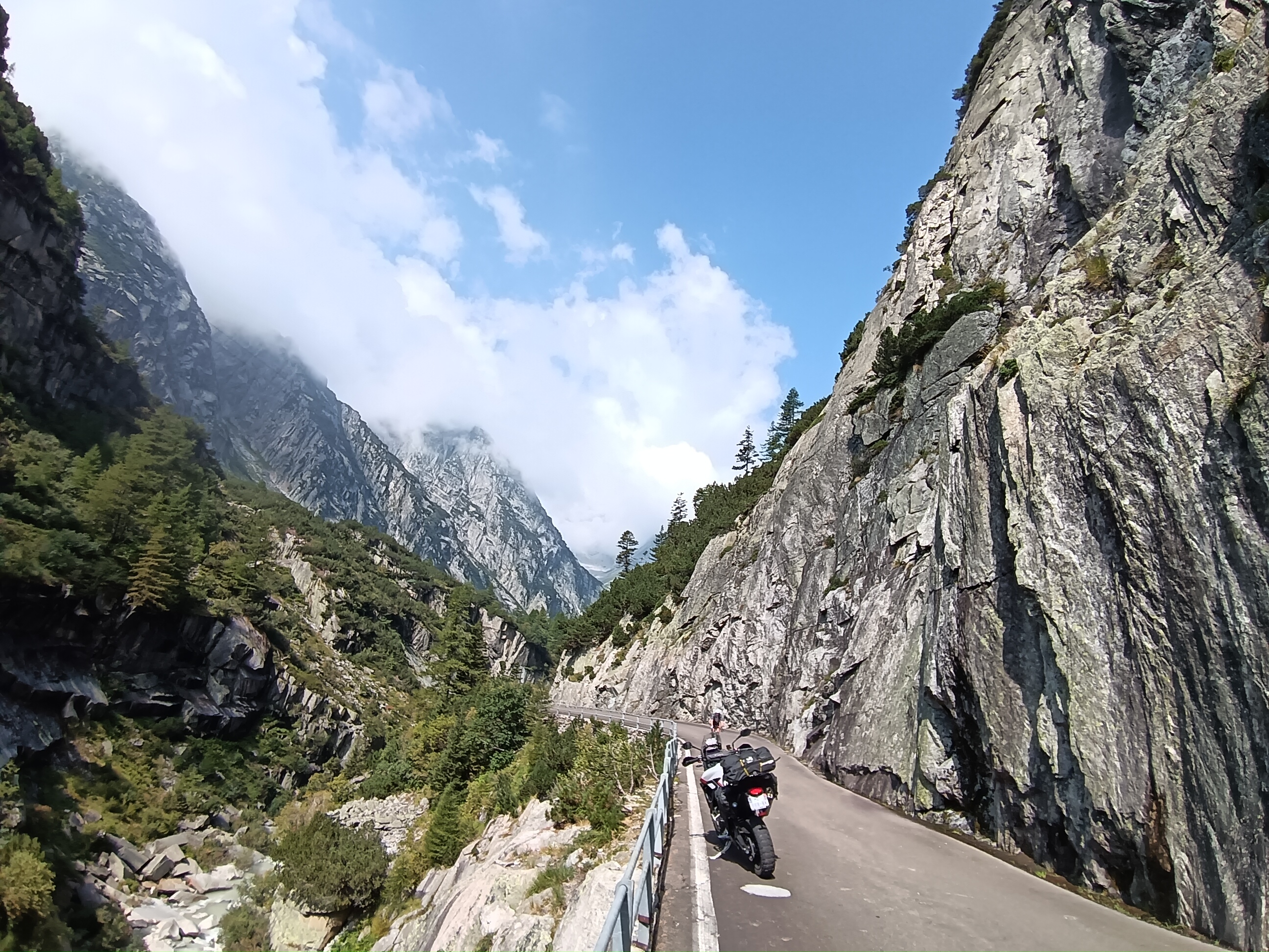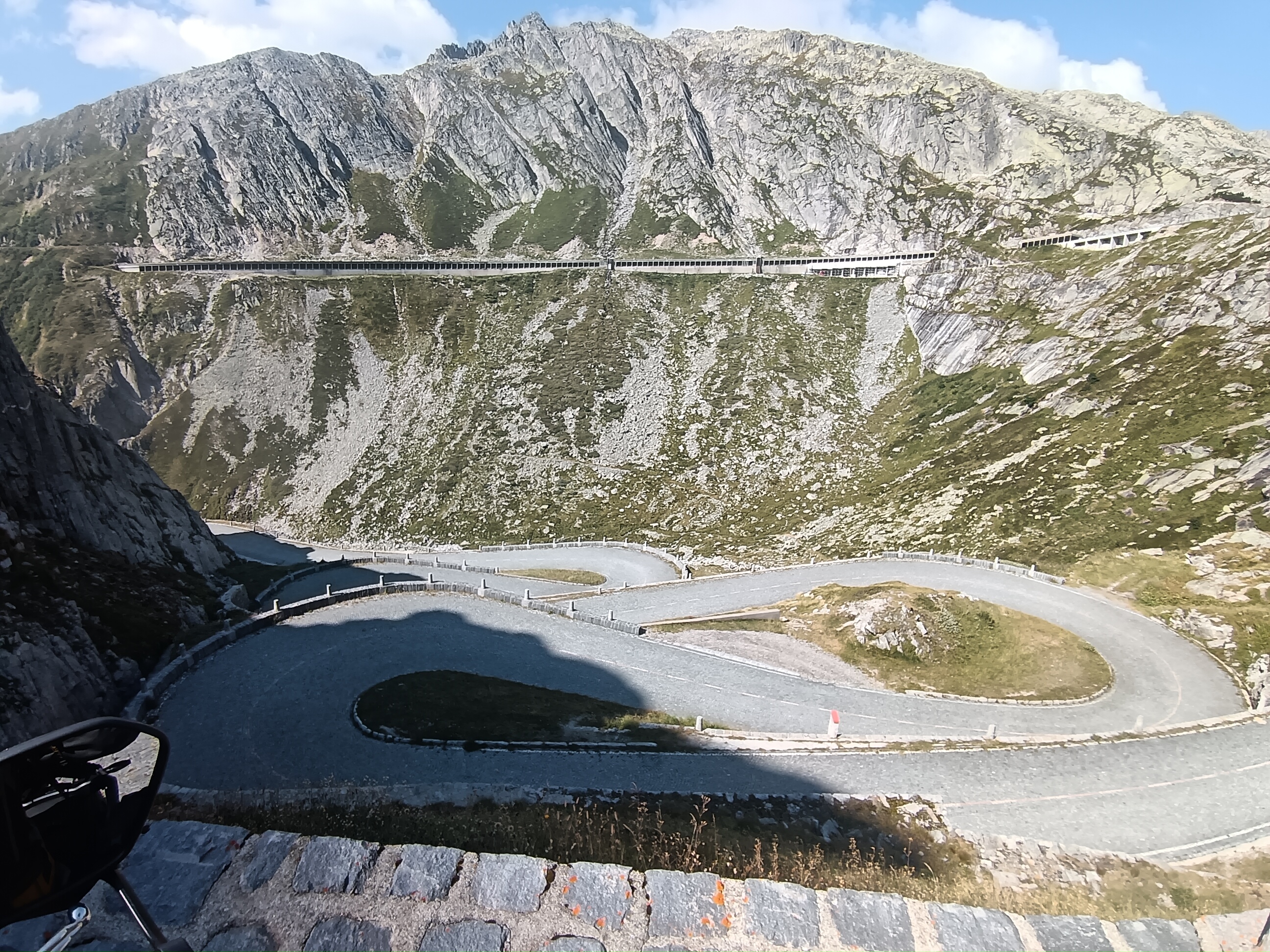 Journée très hautes montagnes, essentiellement suisses. Une de ces journées du voyage pour lesquelles j’ai été trop ambitieux lors de la préparation du roadbook, puisqu’il aura fallu plus de 8h30 de roulage (moteur allumé moto roulante – dixit la Brexiteuse) entre les deux salles de bain, soit à peu près 12h en comptant les arrêts contemplation, nutrition, hydratation, et évacuation. Peu importe, une des plus belles journées malgré tout, même si elle m’aura coûté très cher. Réveil avec lever de soleil sur le lago Maggiore qu’on longe jusqu’à Locarno en Suisse (où l’on ne s’attarde pas, peu d’intérêt et pouvoir d’achat insuffisant de votre serviteur). On rejoint ensuite Airolo, où, à partir de là, c’est spectacle garanti pour les yeux, et excitation de la Brexiteuse pour ses pneus. On entre en effet dans une série de cols de haute altitude, d’importants glaciers, dont celui du Rhône, du moins ce qu’il en reste. Dans l’ordre: San Gottardo, Furka, Grimsel, Susten, Oberalp, Splügen, Maloja, Bernina. Chacun de ces cols présente des intérêts propres du point de vue des paysages et du pilotage, des pavés du Gottardo, aux gorges dans la descente du Grimsel, en passant par les serpentins interminables et les tunnels suspendus du Splügen, si bien que l’on ne ressent aucune forme de lassitude. Mais physiquement, on s’en souvient. Belle journée donc, en partie gâchée par la maréchaussée suisse, dont les tarifs de contravention pour excès de vitesse (104km/h au lieu de 80km/h, juste un petit coup d’accélérateur pour dépasser un camping car) auront allégé mon budget (tarif: 725 francs suisses, soit l’équivalent en lei roumains, tenez-vous bien, de 200 pintes dans un village des Carpates). Dodo dans un agriturismo italo-suisse, au-dessus d’un de ces impressionnants viaducs hélicoïdaux, qui permettent aux chemins de fer suisses de quadriller tout le pays.