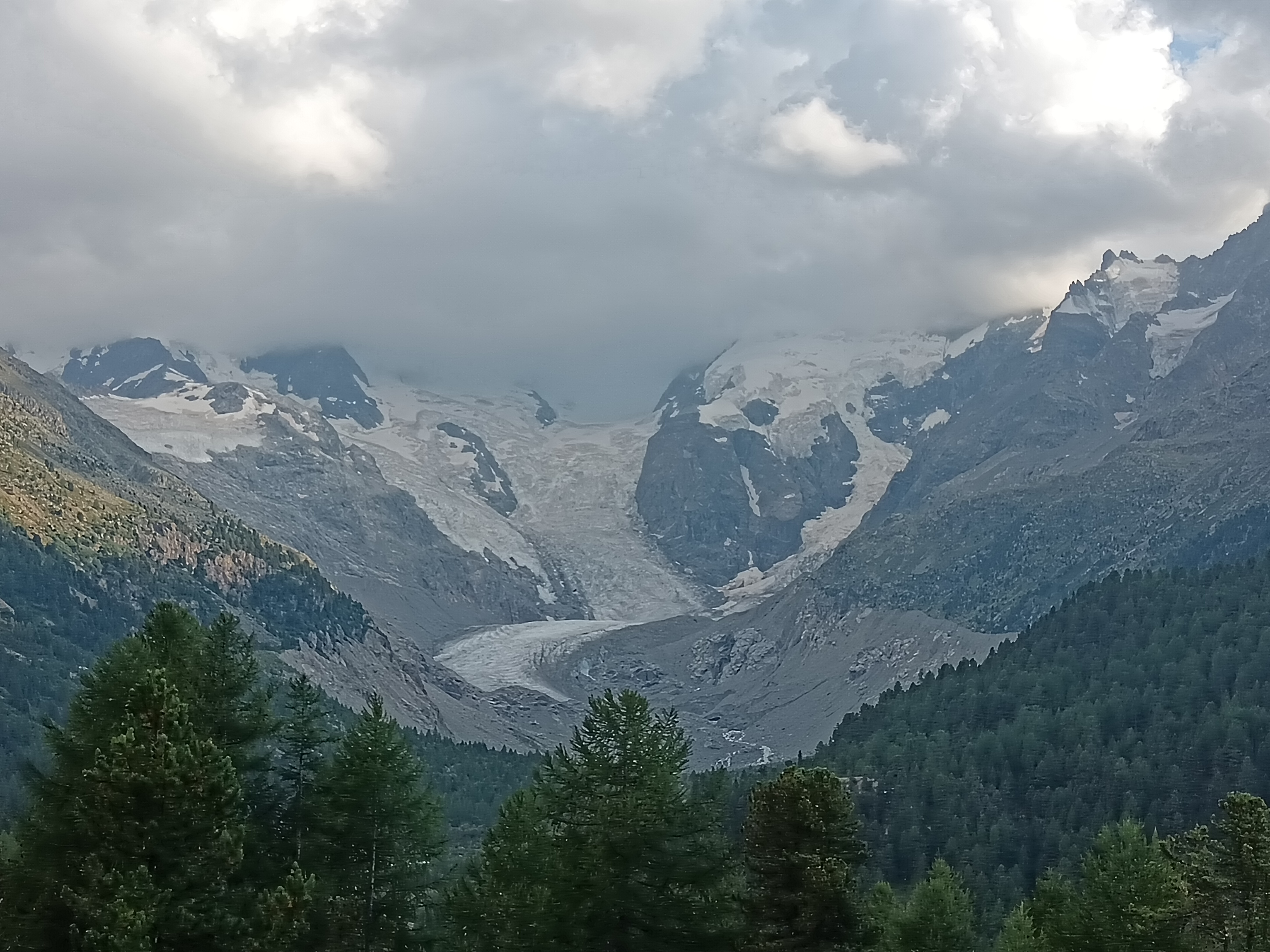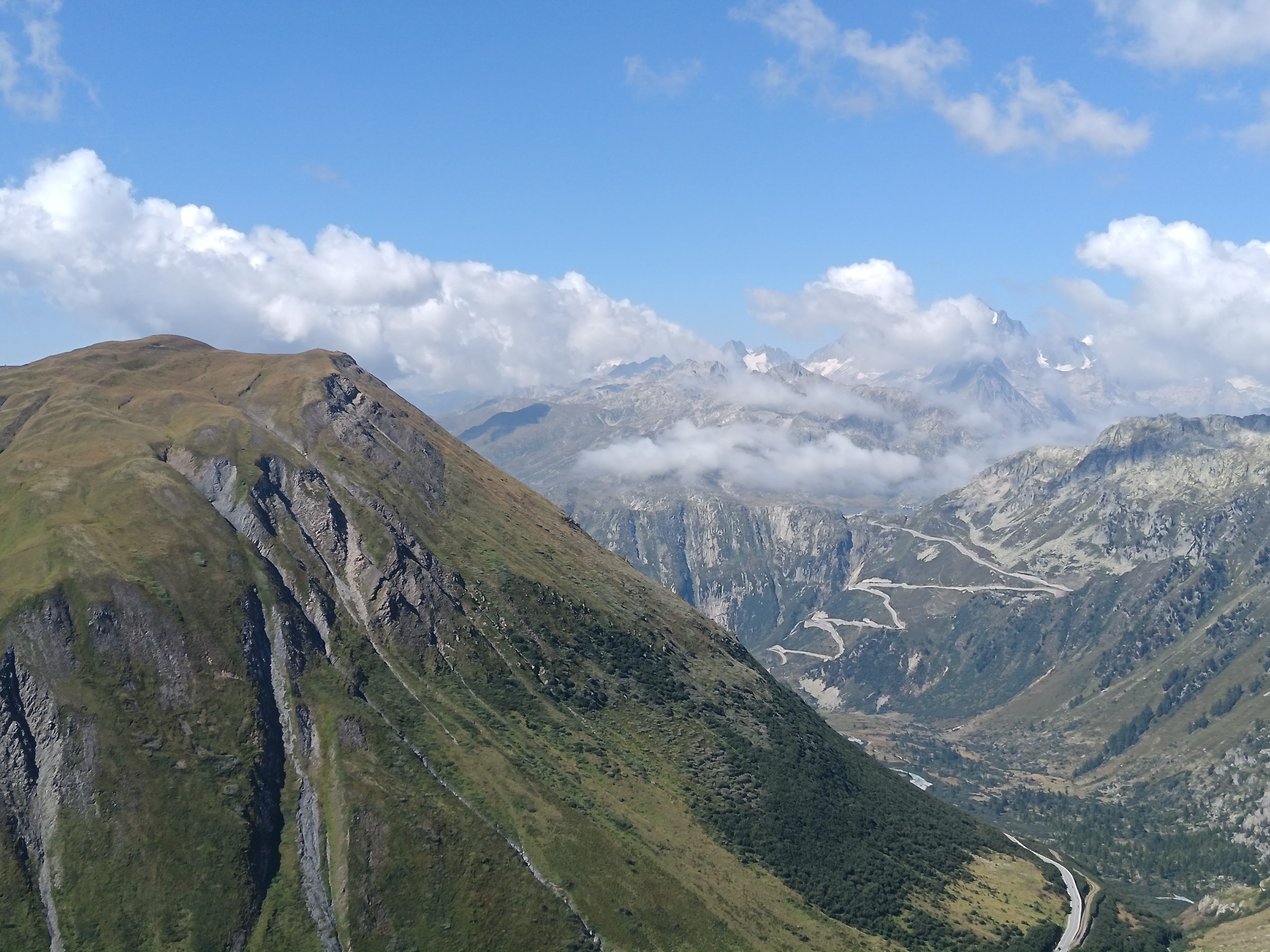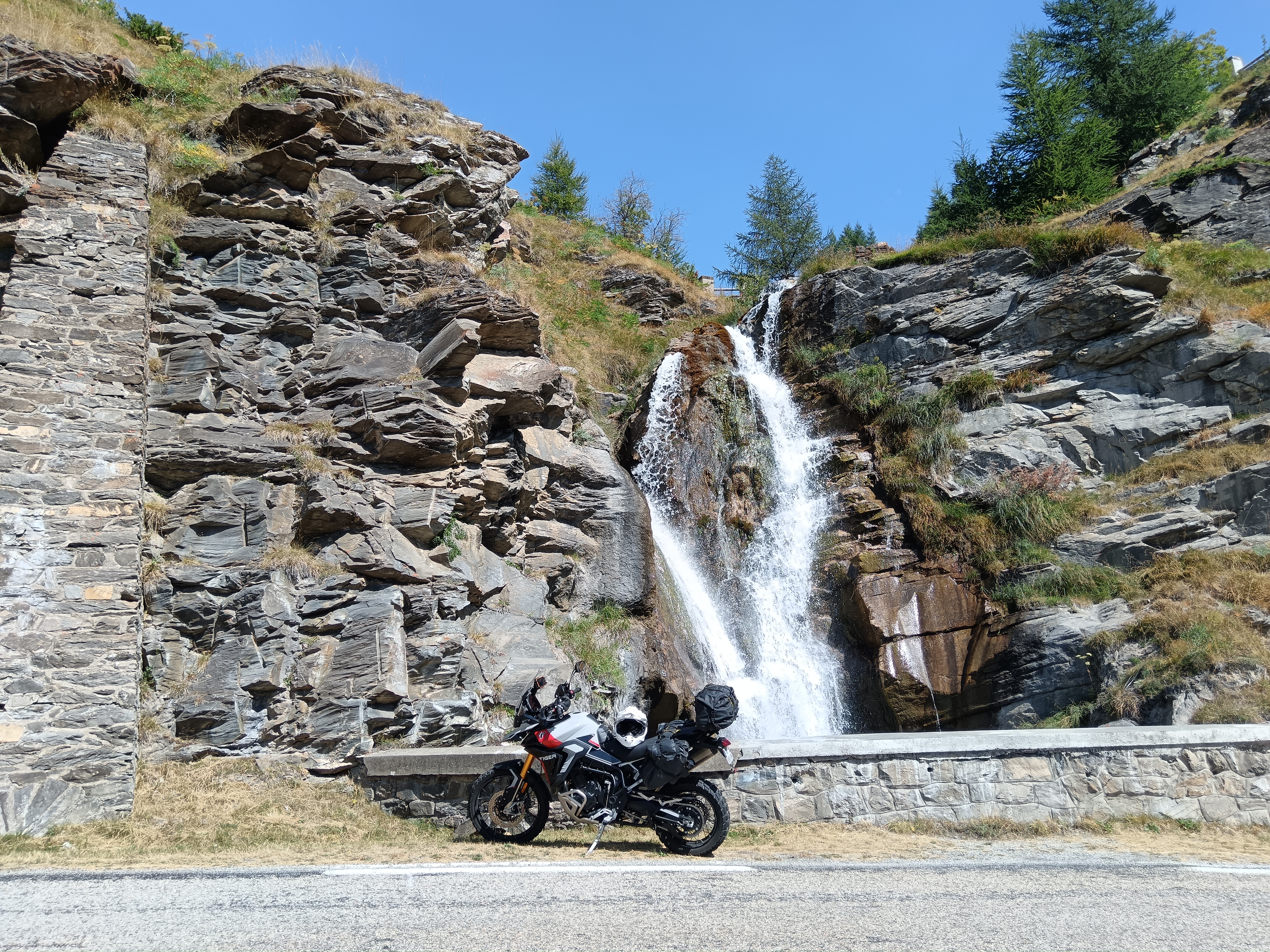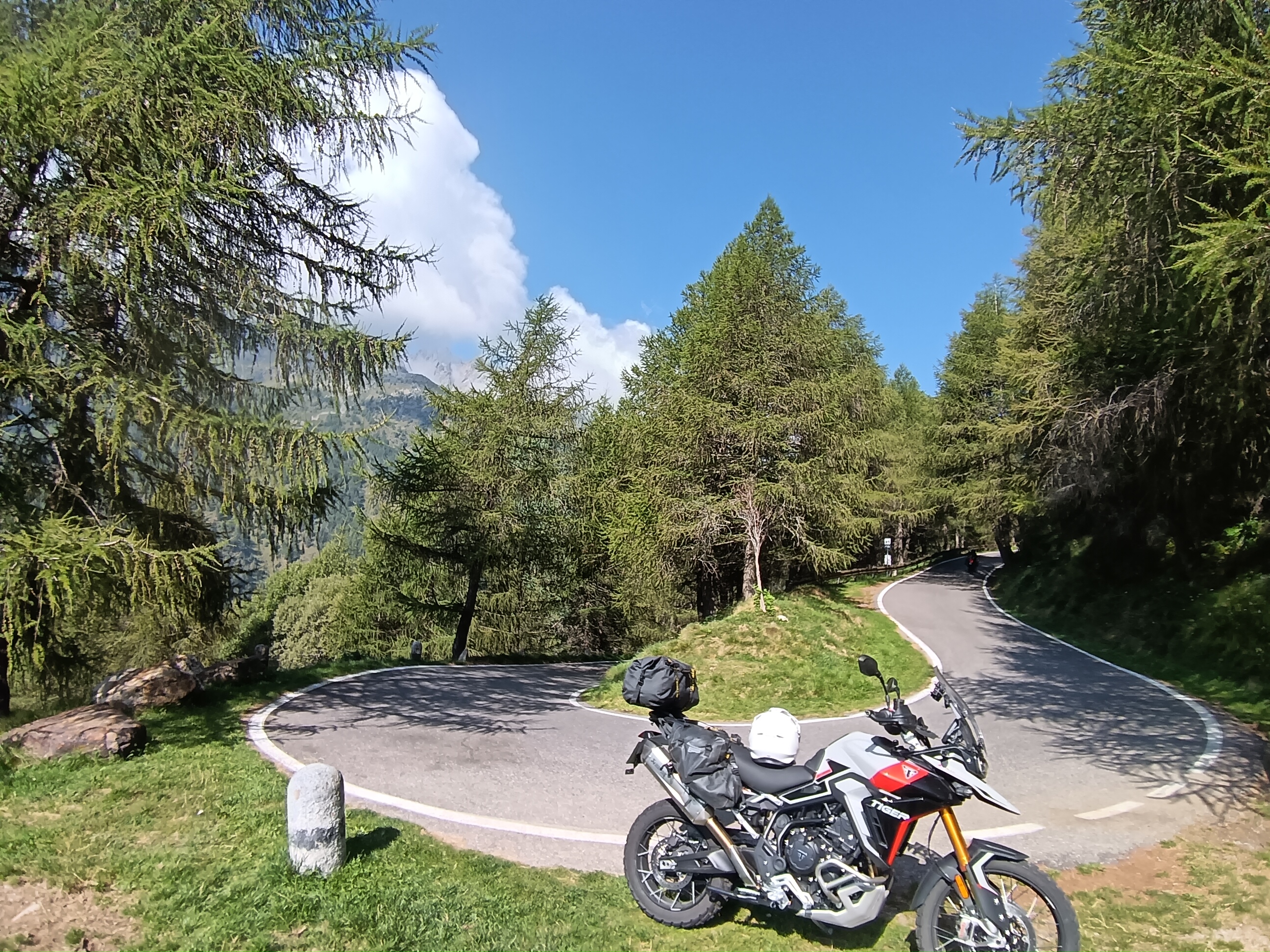 Journée très hautes montagnes, essentiellement suisses. Une de ces journées du voyage pour lesquelles j’ai été trop ambitieux lors de la préparation du roadbook, puisqu’il aura fallu plus de 8h30 de roulage (moteur allumé moto roulante – dixit la Brexiteuse) entre les deux salles de bain, soit à peu près 12h en comptant les arrêts contemplation, nutrition, hydratation, et évacuation. Peu importe, une des plus belles journées malgré tout, même si elle m’aura coûté très cher. Réveil avec lever de soleil sur le lago Maggiore qu’on longe jusqu’à Locarno en Suisse (où l’on ne s’attarde pas, peu d’intérêt et pouvoir d’achat insuffisant de votre serviteur). On rejoint ensuite Airolo, où, à partir de là, c’est spectacle garanti pour les yeux, et excitation de la Brexiteuse pour ses pneus. On entre en effet dans une série de cols de haute altitude, d’importants glaciers, dont celui du Rhône, du moins ce qu’il en reste. Dans l’ordre: San Gottardo, Furka, Grimsel, Susten, Oberalp, Splügen, Maloja, Bernina. Chacun de ces cols présente des intérêts propres du point de vue des paysages et du pilotage, des pavés du Gottardo, aux gorges dans la descente du Grimsel, en passant par les serpentins interminables et les tunnels suspendus du Splügen, si bien que l’on ne ressent aucune forme de lassitude. Mais physiquement, on s’en souvient. Belle journée donc, en partie gâchée par la maréchaussée suisse, dont les tarifs de contravention pour excès de vitesse (104km/h au lieu de 80km/h, juste un petit coup d’accélérateur pour dépasser un camping car) auront allégé mon budget (tarif: 725 francs suisses, soit l’équivalent en lei roumains, tenez-vous bien, de 200 pintes dans un village des Carpates). Dodo dans un agriturismo italo-suisse, au-dessus d’un de ces impressionnants viaducs hélicoïdaux, qui permettent aux chemins de fer suisses de quadriller tout le pays.