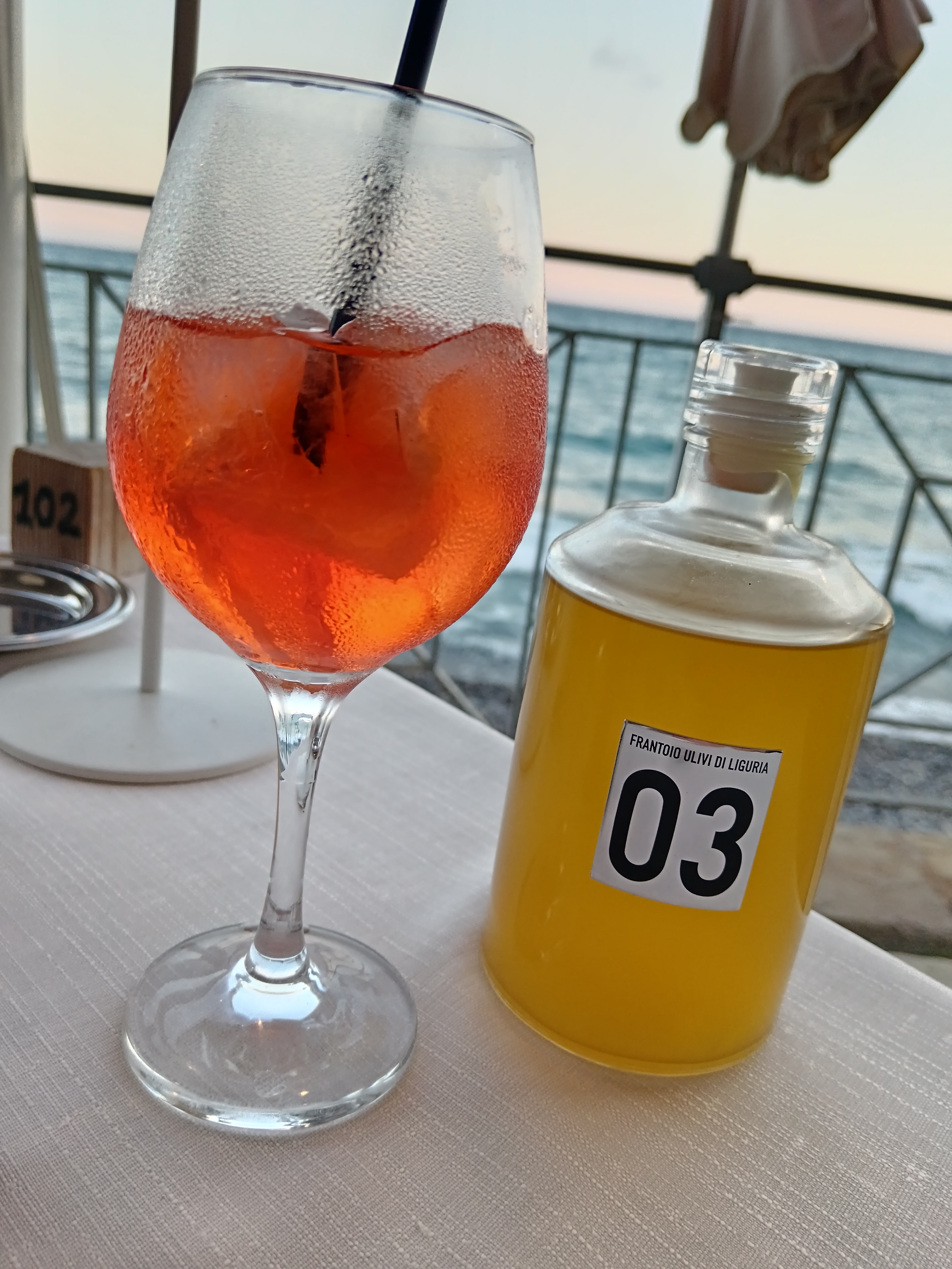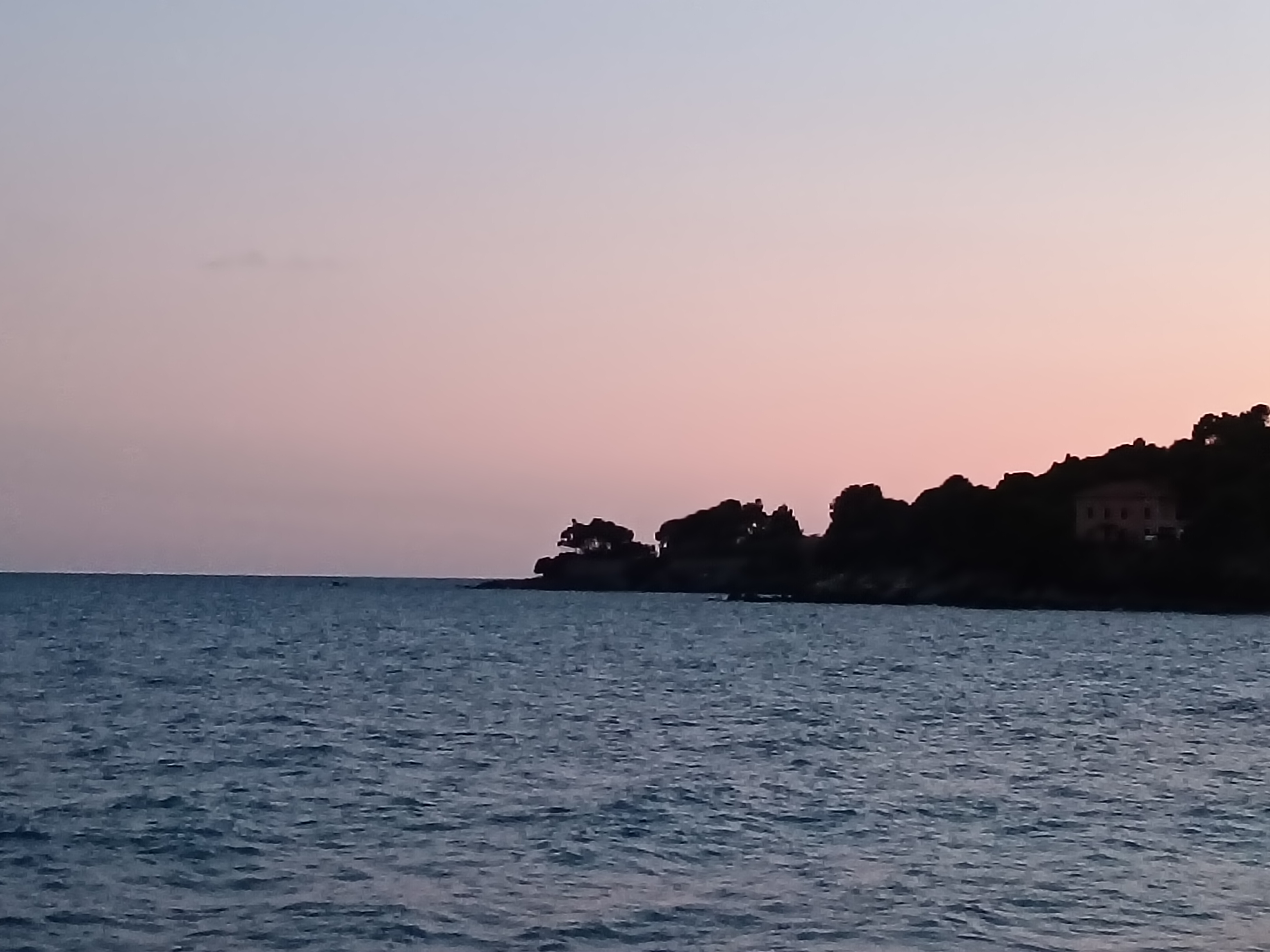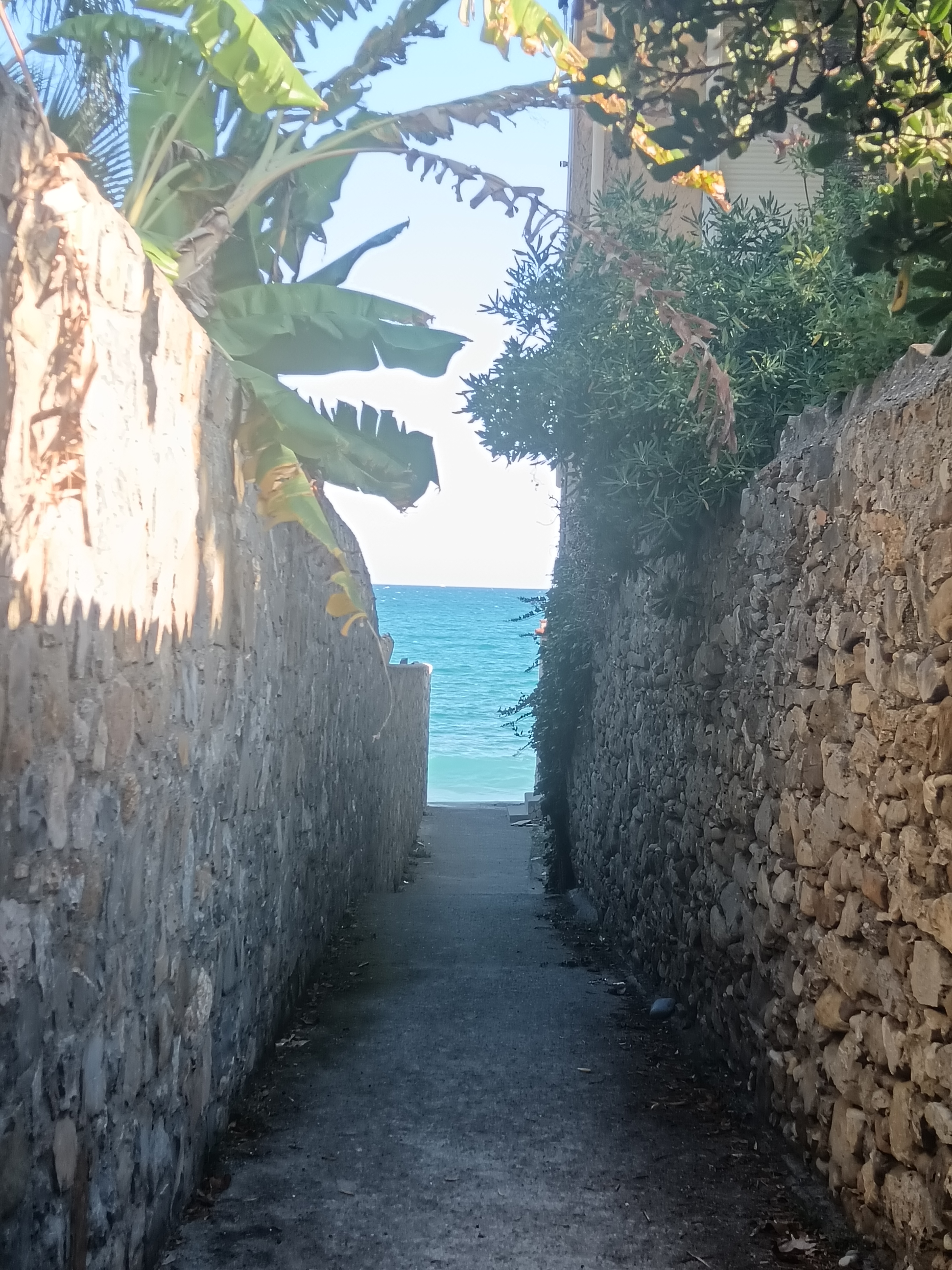 Je quitte Cinqueterre et rejoins, pour la première fois de tout le voyage, une autoroute. Cette incroyable autoroute jour/nuit/tunnels/viaducs/vent/pas vent, épuisante à moto, et qui longe toute la côte ligurienne. Cela dure deux ou trois heures jusqu’à Vintimiglia, où je décide d’upgrader mon hôtel, pour bénéficier d’une plage privée accessible par un sentier bordé de murets, avec vue sur les montagnes, et d’un restaurant les pieds dans l’eau, histoire de célébrer la fin approchante du voyage avec un combo spritz/burrata