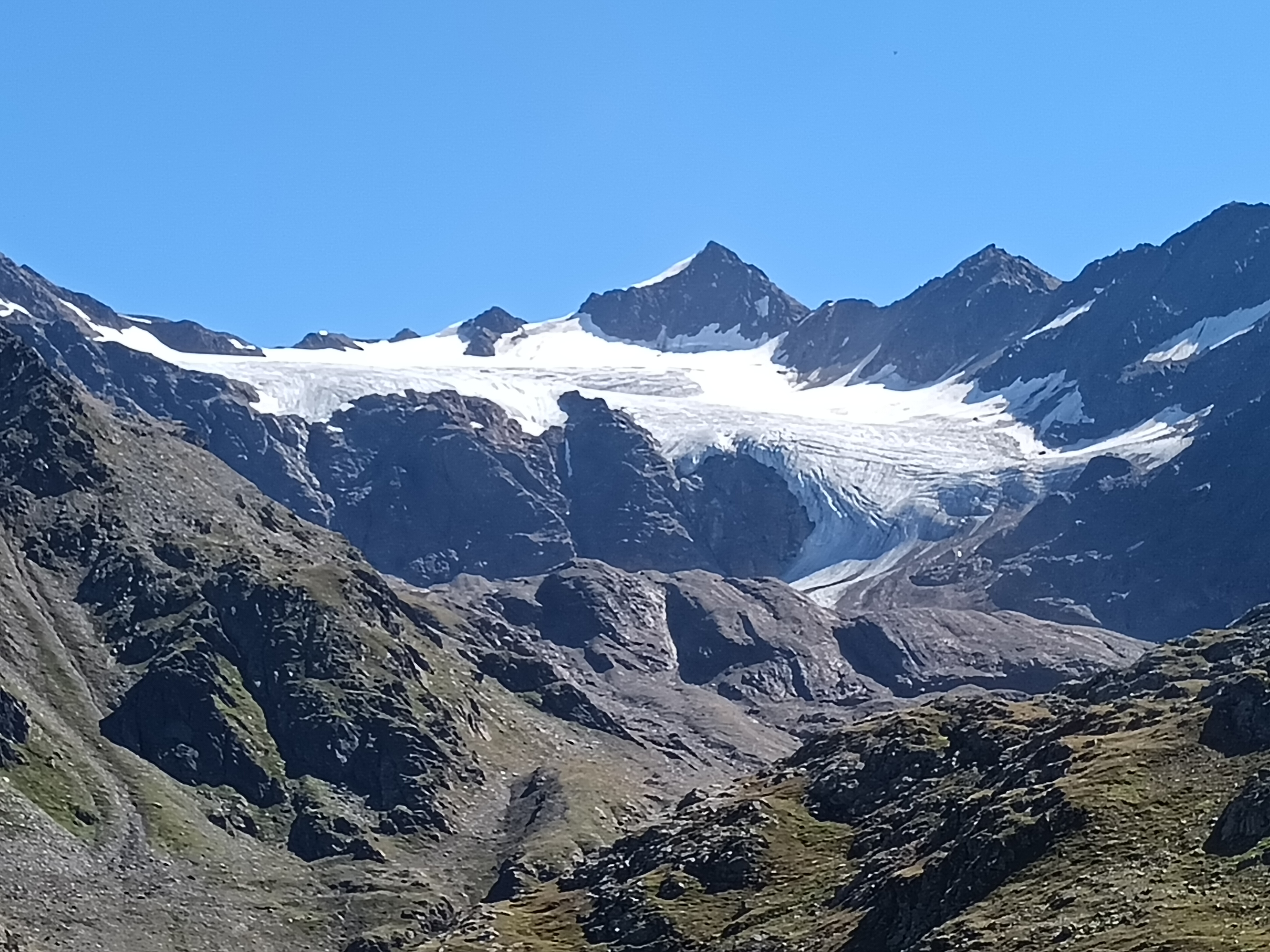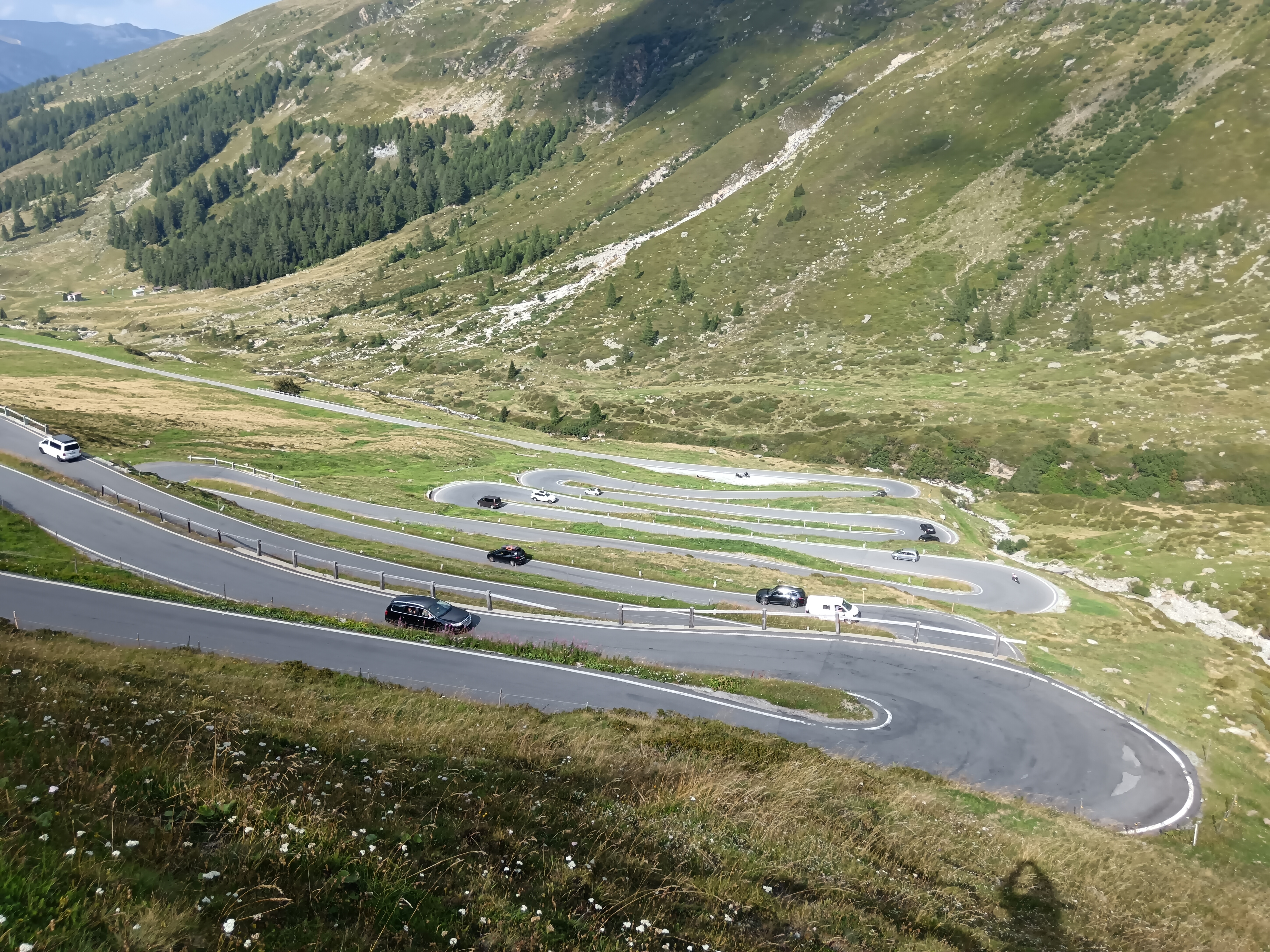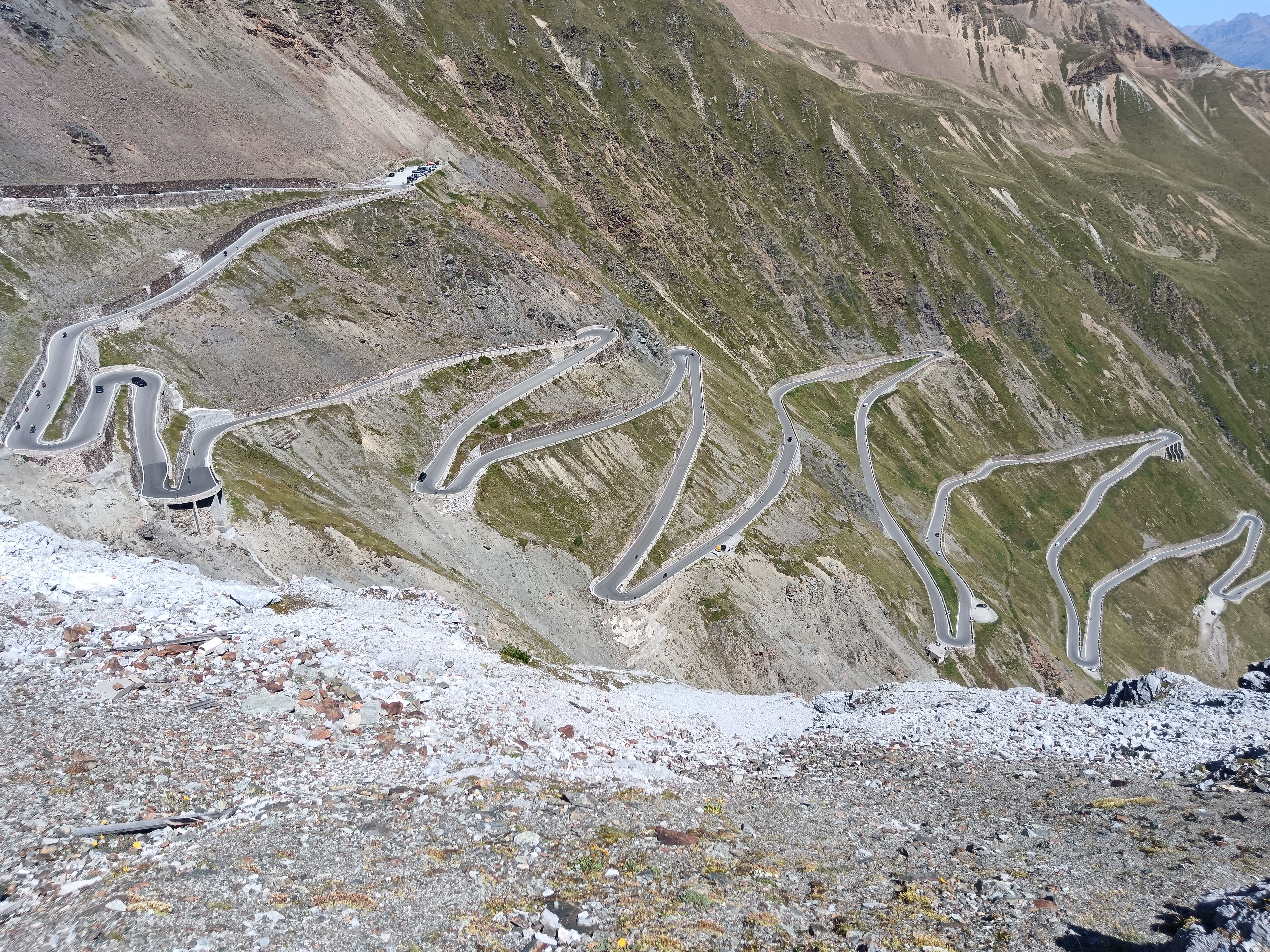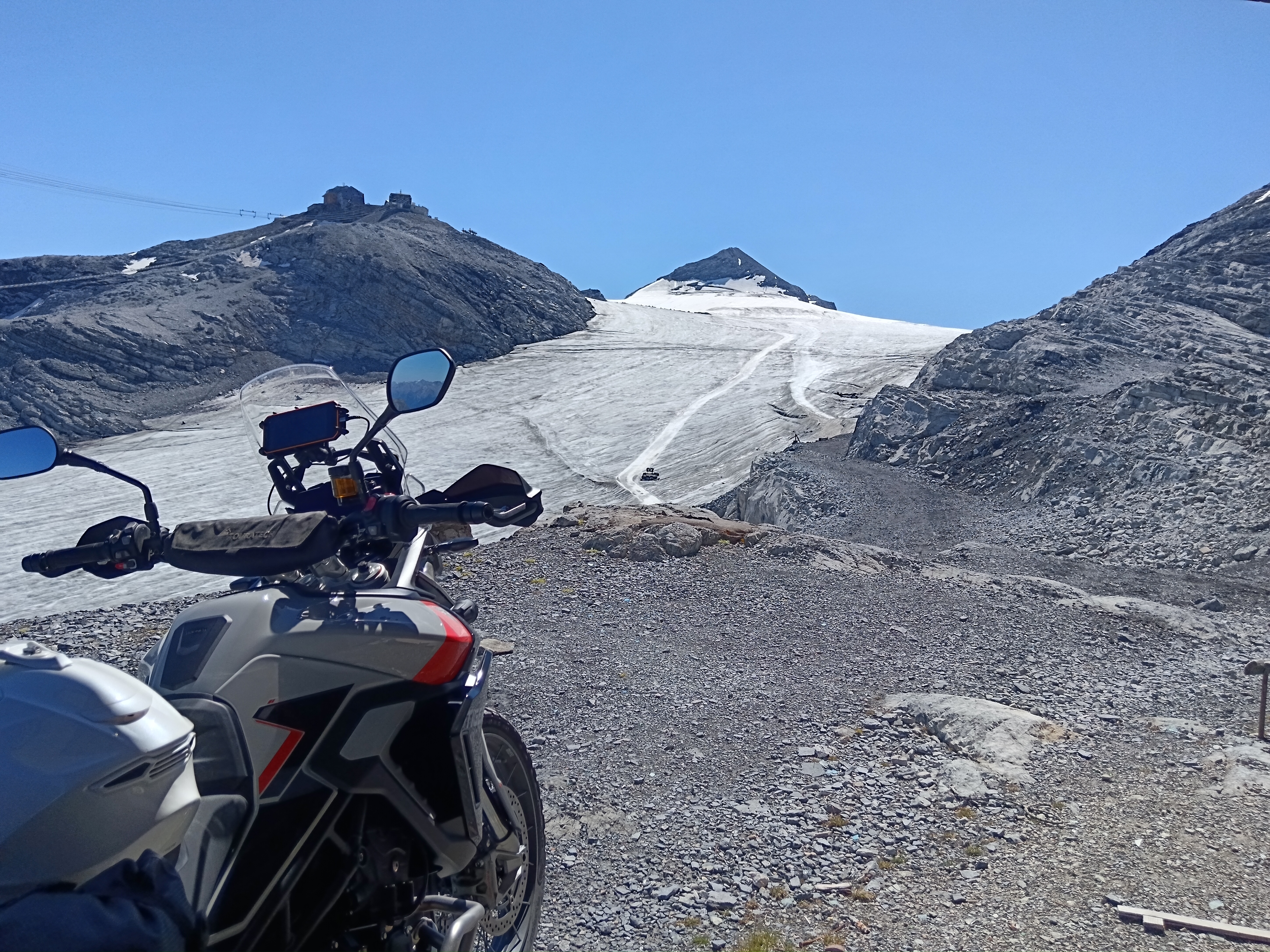 On n’y prend goût à la très haute montagne (après tant de semaines de chaleur étouffante en plaine à bosser parce que des éditeurs ont considéré que tes publis méritaient une V4. Ceux qui savent savent). Alors on remet une couche. Moins de kilomètres, mais, bim! 9h20 de roulage. J’ai déconné sur le traçage, mais je crois que j’y prends un malin plaisir. Ce sera essentiellement Tyrol et Dolomites au programme. On débute par le Passo Mortirolo, une route très étroite dans la forêt, déconseillée dès le pied aux voitures, et tout le long à la gloire de Pantani. Vous comprendrez alors le pourcentage de dénivelé, bien que je n’ai pris aucun produit illicite pour gravir jusqu’au sommet. On poursuit par un de mes cols préférés en Europe, déjà gravi lors d’un voyage en 2015, le Passo Gavia. Un col très étroit, où l’on s’arrête pour croiser même à moto, et avec des vues superbes sur les glaciers. Le col suivant sera le Lourdes des motards, le Passo Stelvio et ses 2728m. Au sommet, environ 2 à 3000 motards en permanence (cela doit être ma cinquième ascension), caméra embarquée, selfies à gogo, et des italiens pour qui « chuchoter » est un mot banni du dictionnaire. Je ne m’arrête donc pas (disserter des heures sur « t’as vu comme je suis rentré dans l’épingle pour pourrir le gonze » n’est pas mon idée du voyage), mais met en oeuvre mon plan préparé de longue date. Derrière un des hôtels, j’ai préalablement repéré par image satellite un départ de piste menant au glacier. 3km et 350m de dénivelé environ sur une piste assez difficile mais gérable pour arriver au-delà de 3000m dans une zone glacière. Seul, là, vue à 360 degrés, glace, soleil. Voilà pourquoi je voyage. Pas plus de détails, gardons le plan confidentiel. On descend par les interminables lacets jusque dans la vallée 2000m plus bas, au milieu des motos, cyclistes, camping cars. On voit ceux qui sont expérimentés et ceux qui ne le sont pas. Des motards perdent l’équilibre et chutent dans les lacets, des camping cars s’y prennent à plusieurs reprises pour passer ces mêmes lacets, bref, un joyeux bordel.