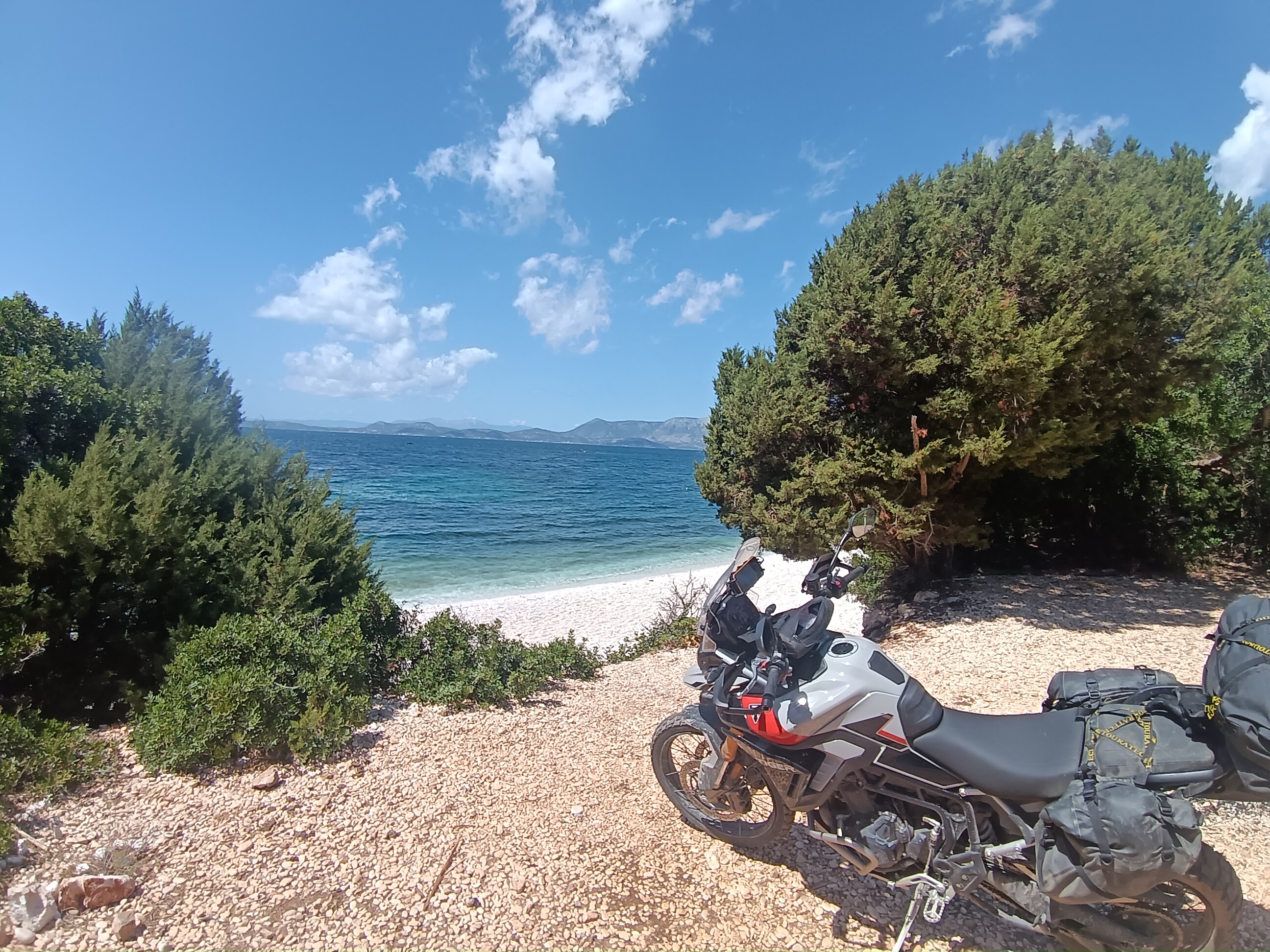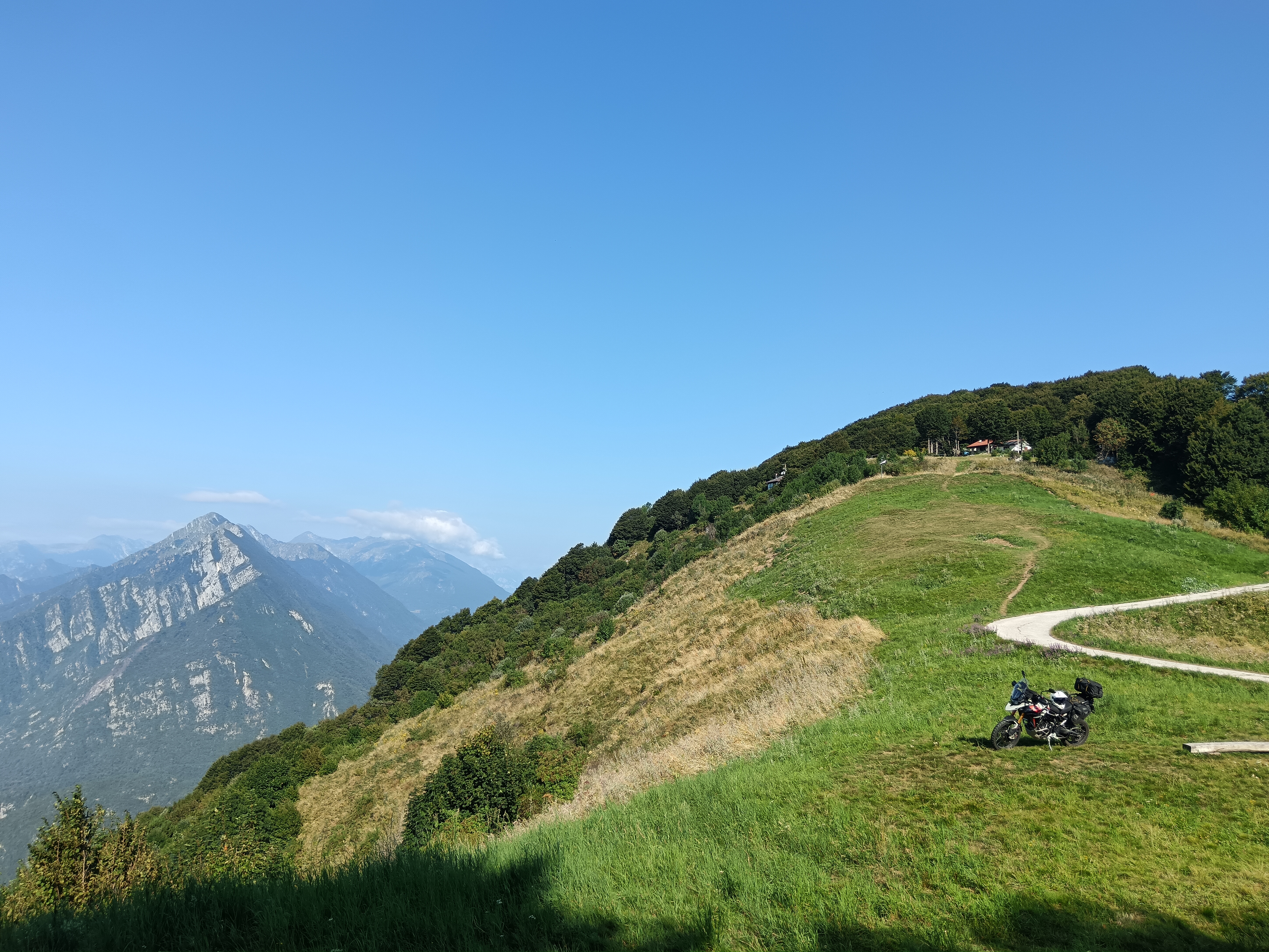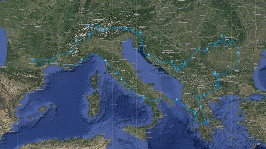 Nouvel épisode de ce blog et donc nouveau voyage, mais toujours dans le même esprit: grands paysages, variantes hors bitume, exploration quotidienne en continue, avec pauses culinaires et houblonnesques, et, s’il reste du temps, explorations culturelles et rafraichissements corporels dès qu’un bout de mer s’offre à moi. Une nouvelle moto cette année: un simple upgrading de la précédente Brexiteuse, fraichement rodée et équipée du nécessaire pour voyager sur et hors route. Direction l’Europe de l’est. Point le plus au nord: Chur, dans les Alpes suisses. Point le plus à l’est: la Place de la Constitution à Bucharest. Point le plus au sud: la Cité Archéologique de Delphes en Grèce. Pour relier le tout, 9850km en 23 jours, via 13 pays (par ordre de temps de traversée: Italie-6 jours; Grèce-4 jours; Roumanie-3,5 jours; France-2 jours; Suisse-1,5 jours, Slovénie-1,5 jours; Bulgarie-1,5 jours; Croatie-1 jour; Bosnie-1 jour; Montenegro-1 jour; Serbie-1 jour; Macédoine-2h; Autriche-1h, et je vous épargne la demi-heure à Monaco). Environ 1500km hors bitume, par des pistes et chemins repérés en amont par les images satellites, dans des endroits où il y a un intérêt à quitter la route pour explorer des paysages plus majestueux. Et puis ce genre de moto, c’est fait pour cela, même si il est vrai que les derniers voyages off-road, trop intenses et terminés en blessures (voir Albania 2023, et Spain 2023), ont eu raison de mon ambition pour les longs trips full-off-road.