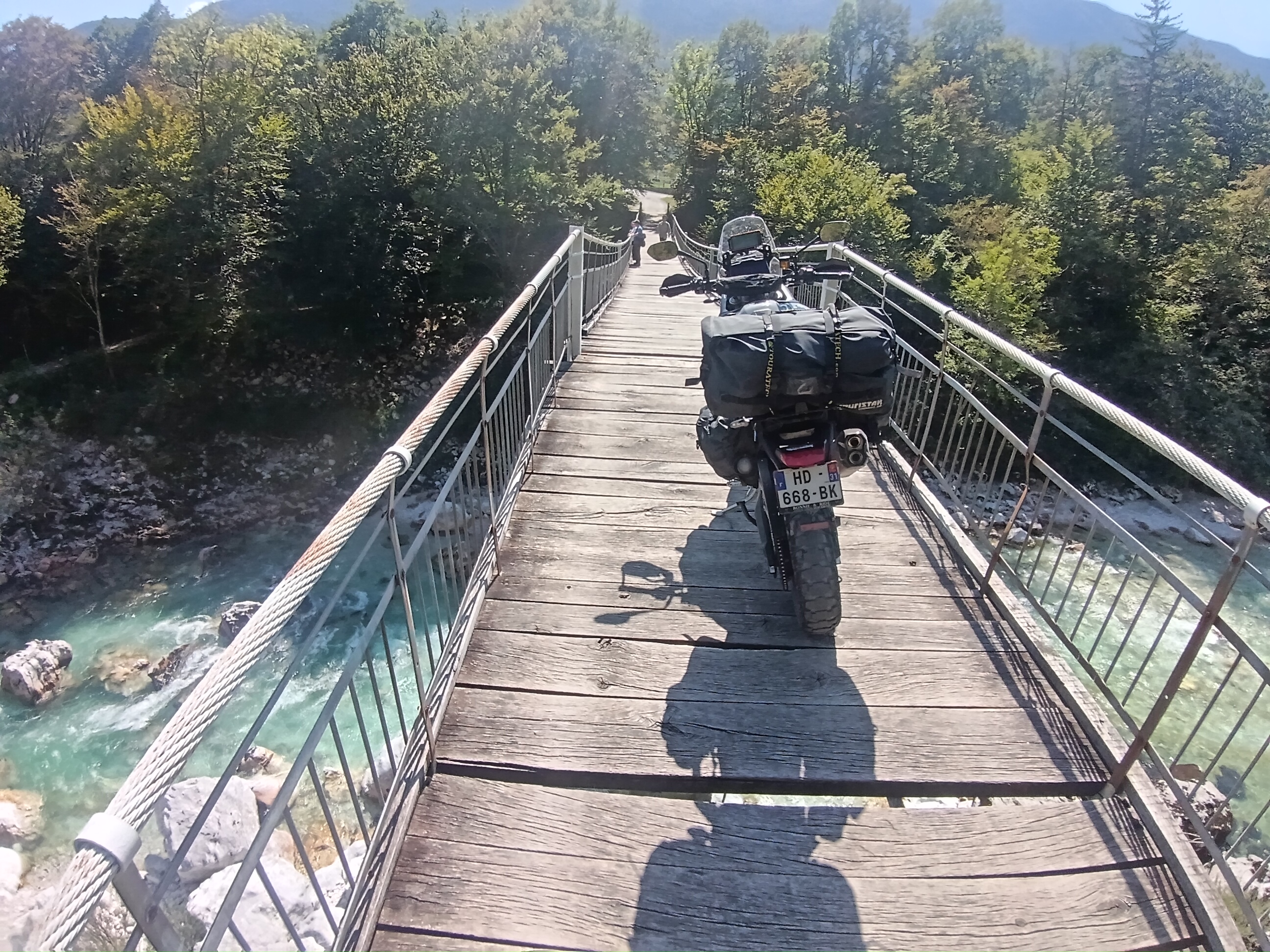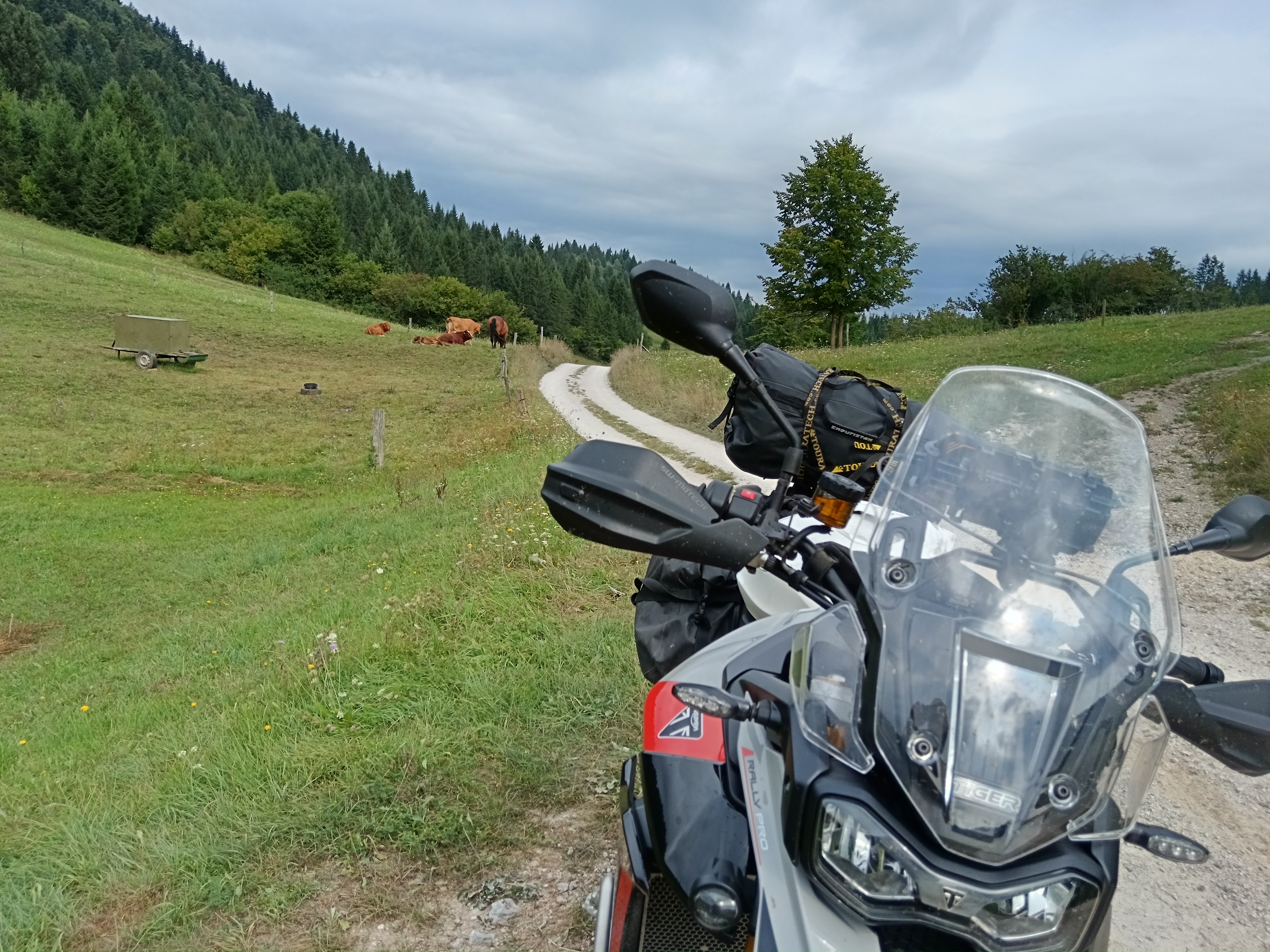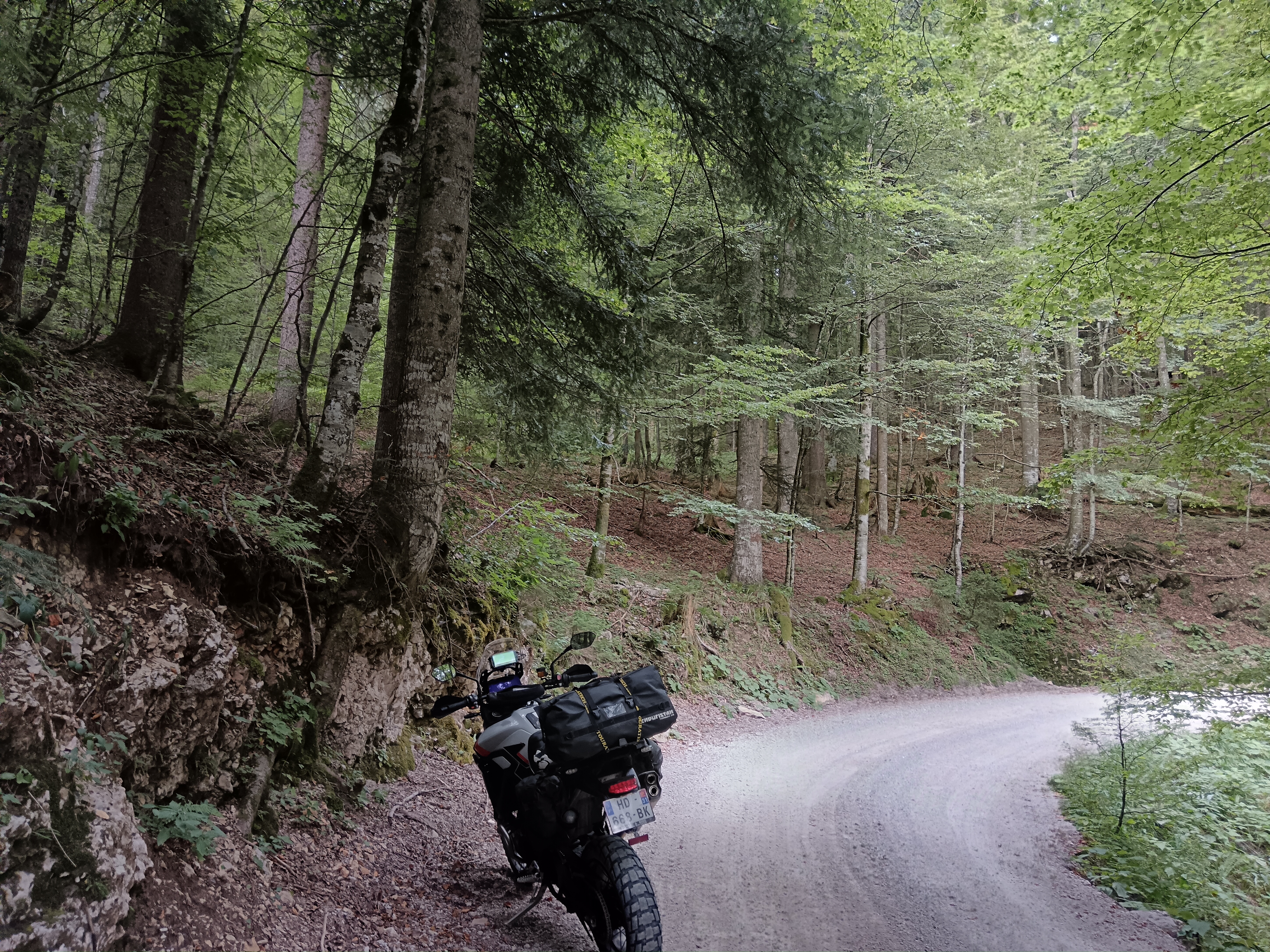 On se calme sur les forts kilométrages quotidiens, afin d’aller explorer plus de petites routes et chemins de montagne, et ne pas terminer l’étape trop tard afin de déambuler le soir dans la capitale slovène. On commence tôt le matin par monter au « Altopiano San Simeone », par une très étroite route à flanc de montagne, où chaque épingle est un minitunnel. Idem pour l’accès au Altopiano del Montasio près de la frontière slovène. Bref, une matinée Altopiani, relativement protégée du tourisme de masse que connaissent les Alpes italiennes. Parvenu aux croisements de l’Italie, de l’Autriche et de la Slovénie, on rejoint le très touristique et très beau Vršič Pass, un col slovène en grande partie pavé, en bas duquel, par un descente dans les forêts slovènes, on rejoint la très belle rivière Soca, connue pour ses couleurs turquoises, et ses excellentes truites. On s’échappe ensuite hors bitume, à travers canyons et forêts pour accéder à quelques villages typiques – mention spéciale pour le village rural de Zgornja Sorica.