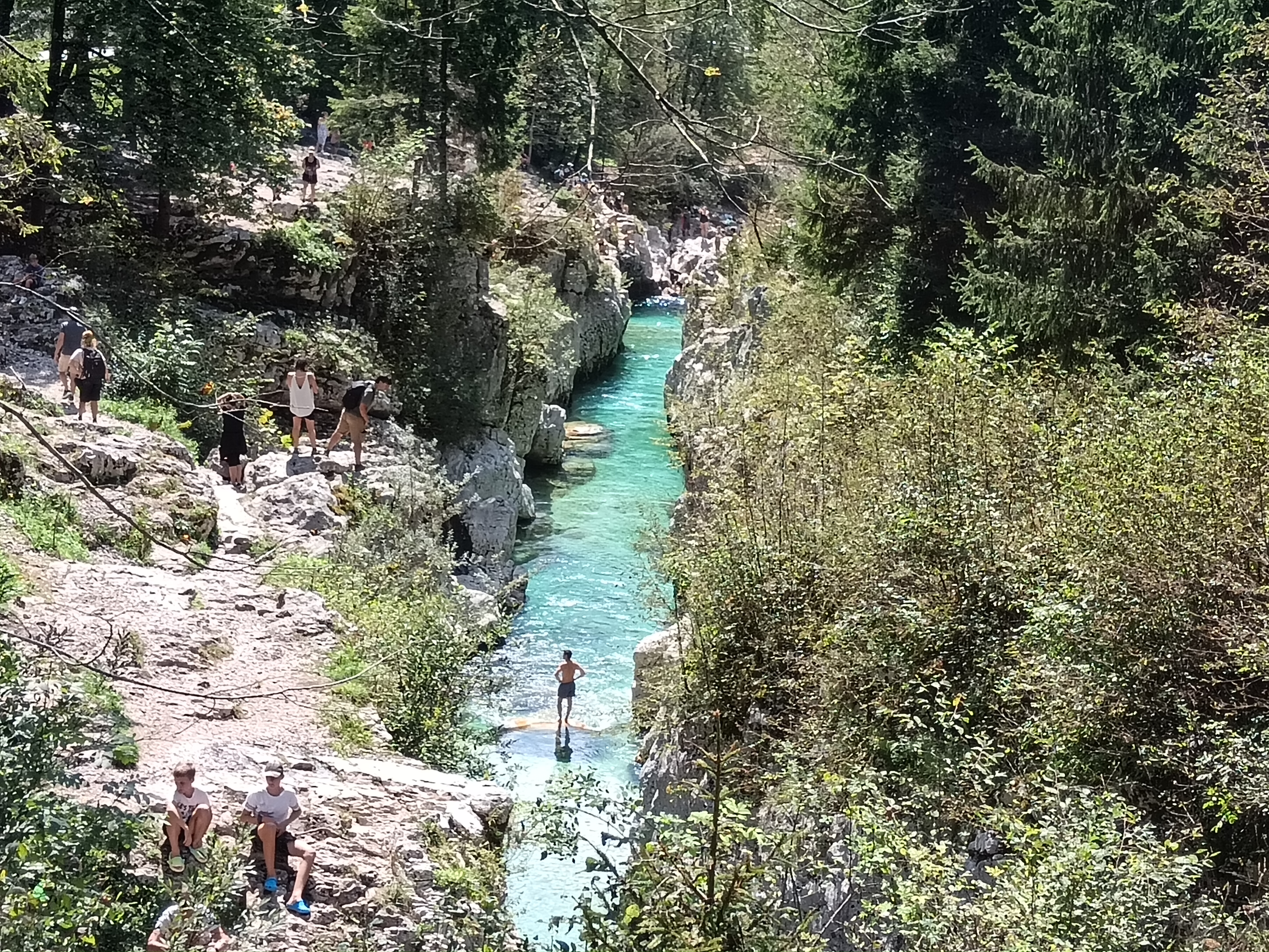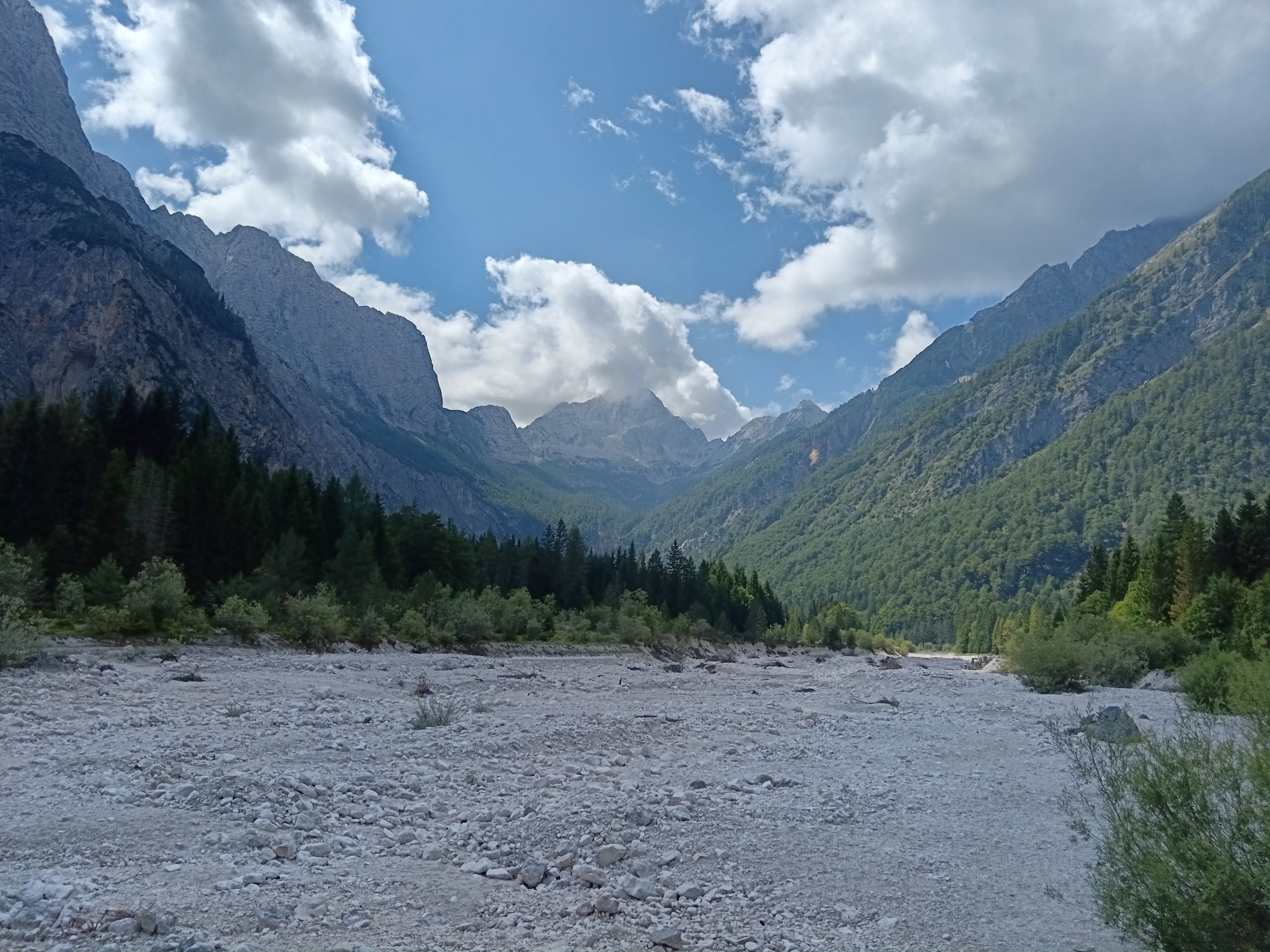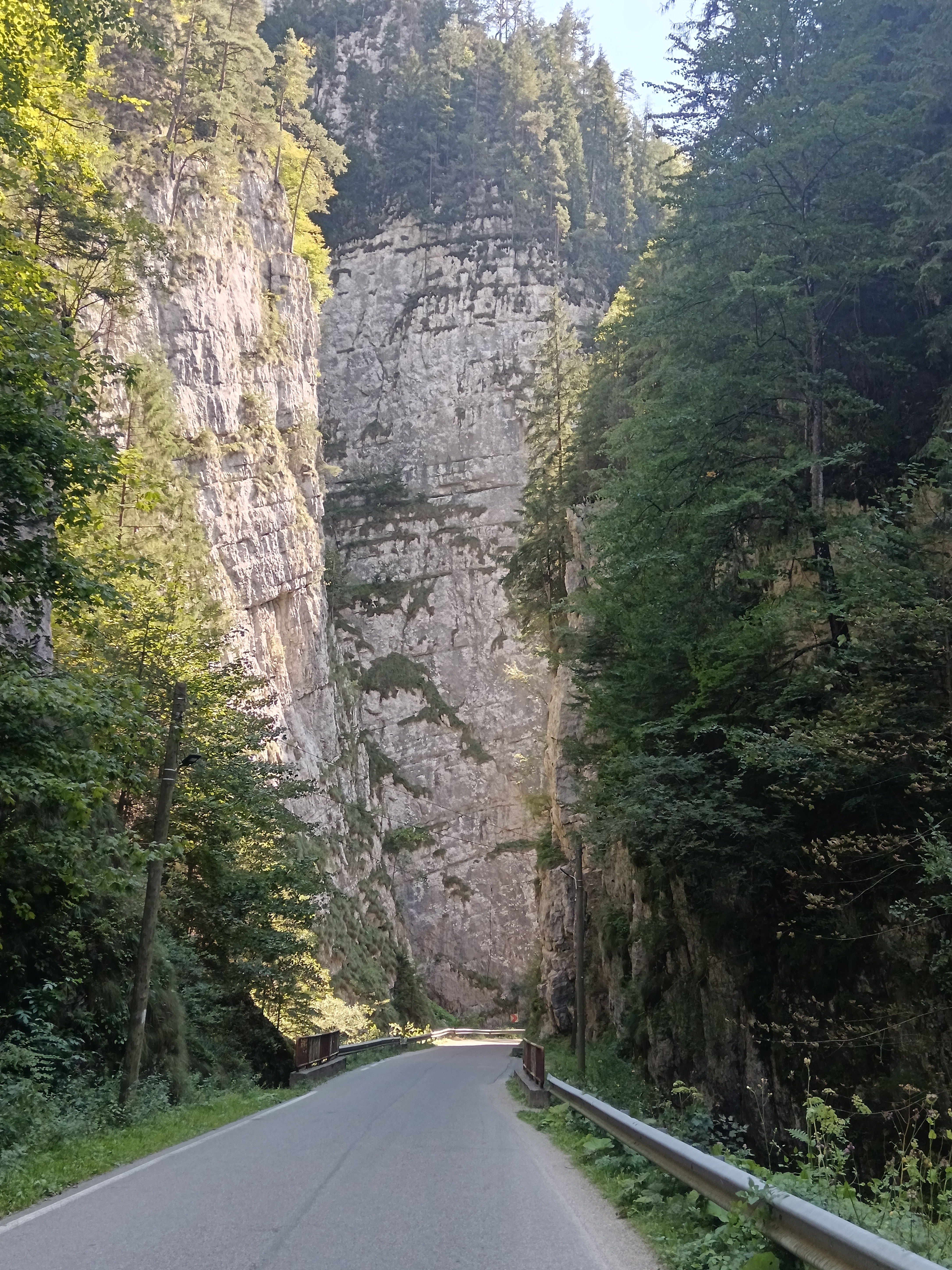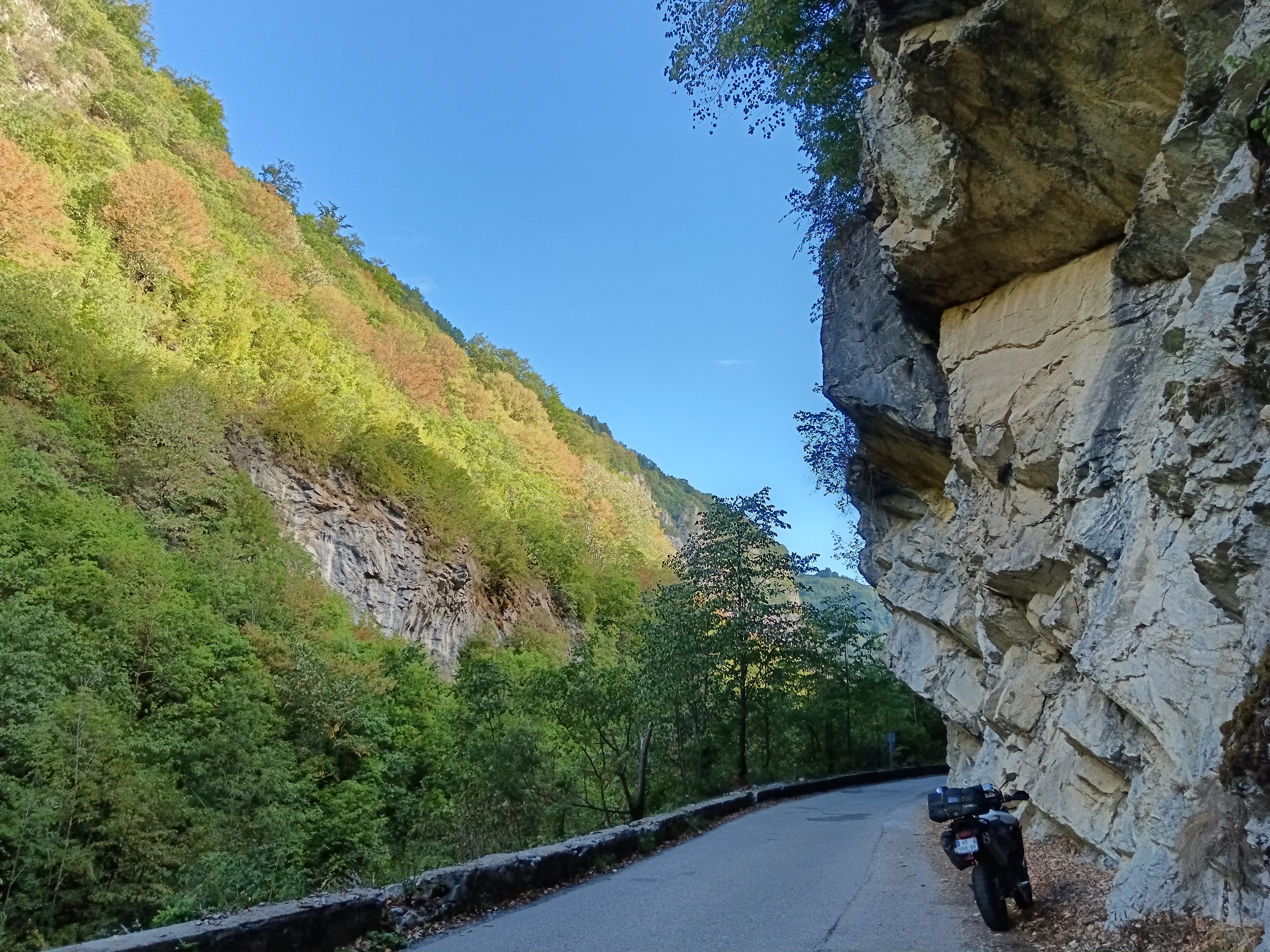 On se calme sur les forts kilométrages quotidiens, afin d’aller explorer plus de petites routes et chemins de montagne, et ne pas terminer l’étape trop tard afin de déambuler le soir dans la capitale slovène. On commence tôt le matin par monter au « Altopiano San Simeone », par une très étroite route à flanc de montagne, où chaque épingle est un minitunnel. Idem pour l’accès au Altopiano del Montasio près de la frontière slovène. Bref, une matinée Altopiani, relativement protégée du tourisme de masse que connaissent les Alpes italiennes. Parvenu aux croisements de l’Italie, de l’Autriche et de la Slovénie, on rejoint le très touristique et très beau Vršič Pass, un col slovène en grande partie pavé, en bas duquel, par un descente dans les forêts slovènes, on rejoint la très belle rivière Soca, connue pour ses couleurs turquoises, et ses excellentes truites. On s’échappe ensuite hors bitume, à travers canyons et forêts pour accéder à quelques villages typiques – mention spéciale pour le village rural de Zgornja Sorica.