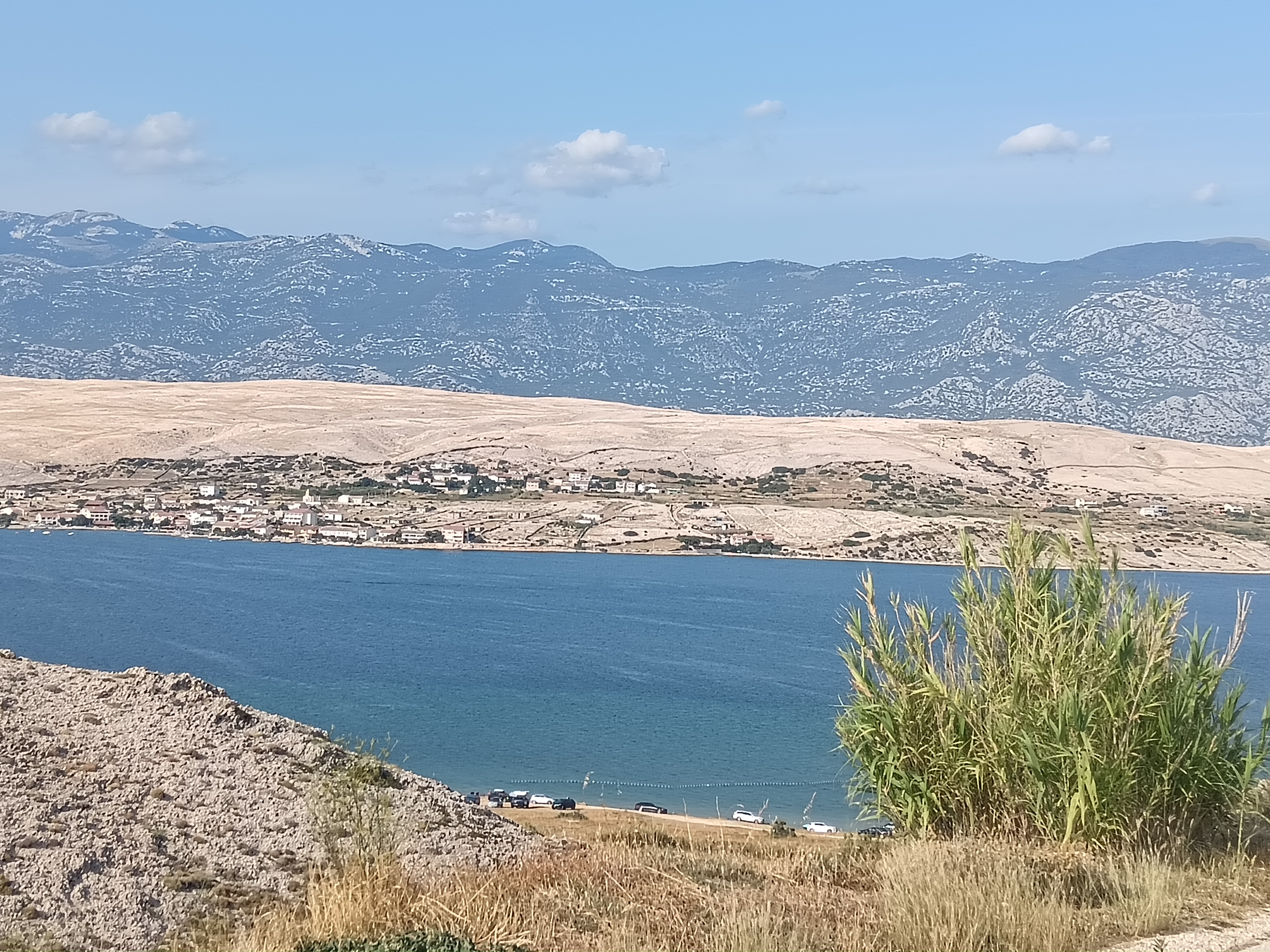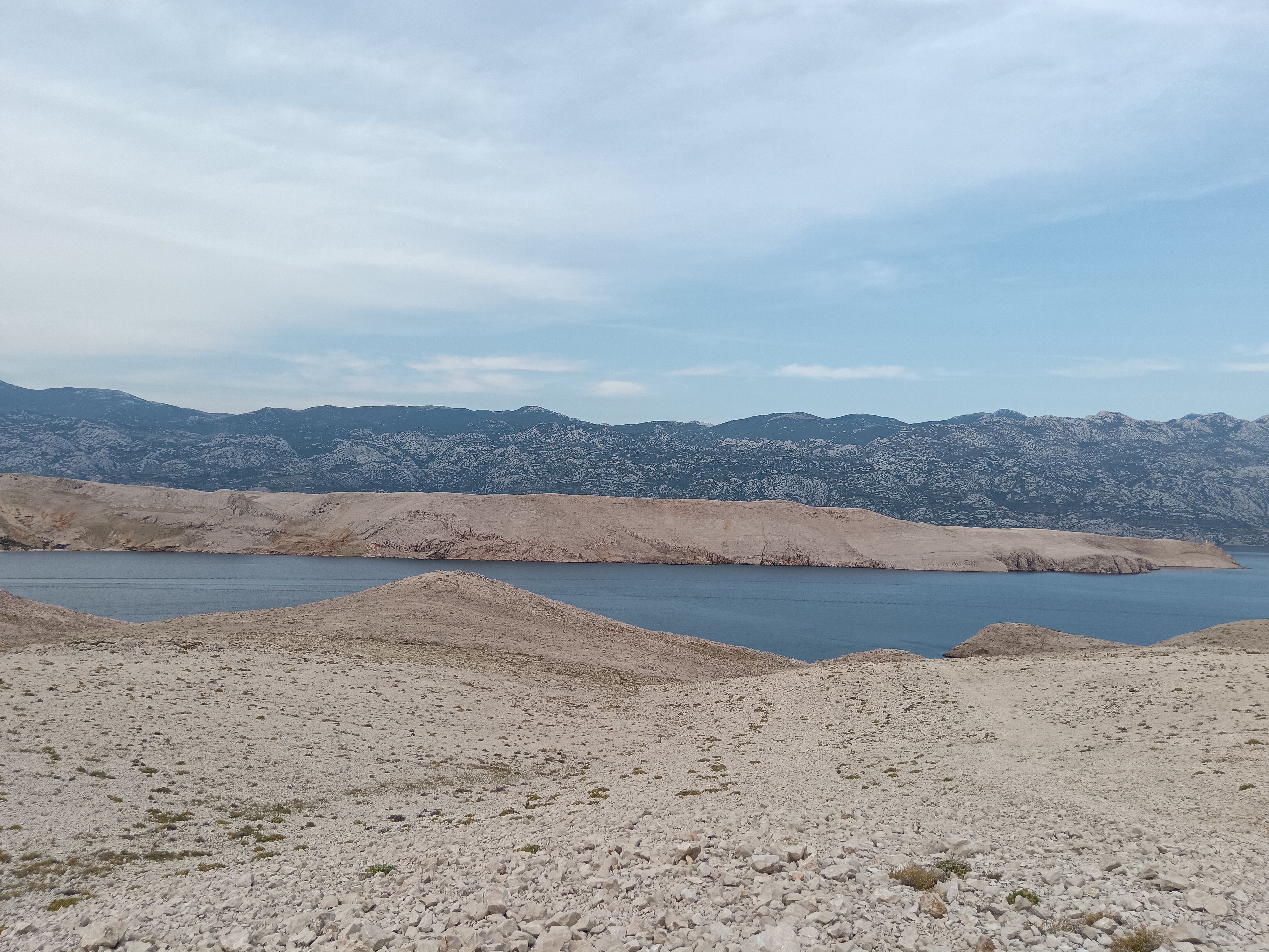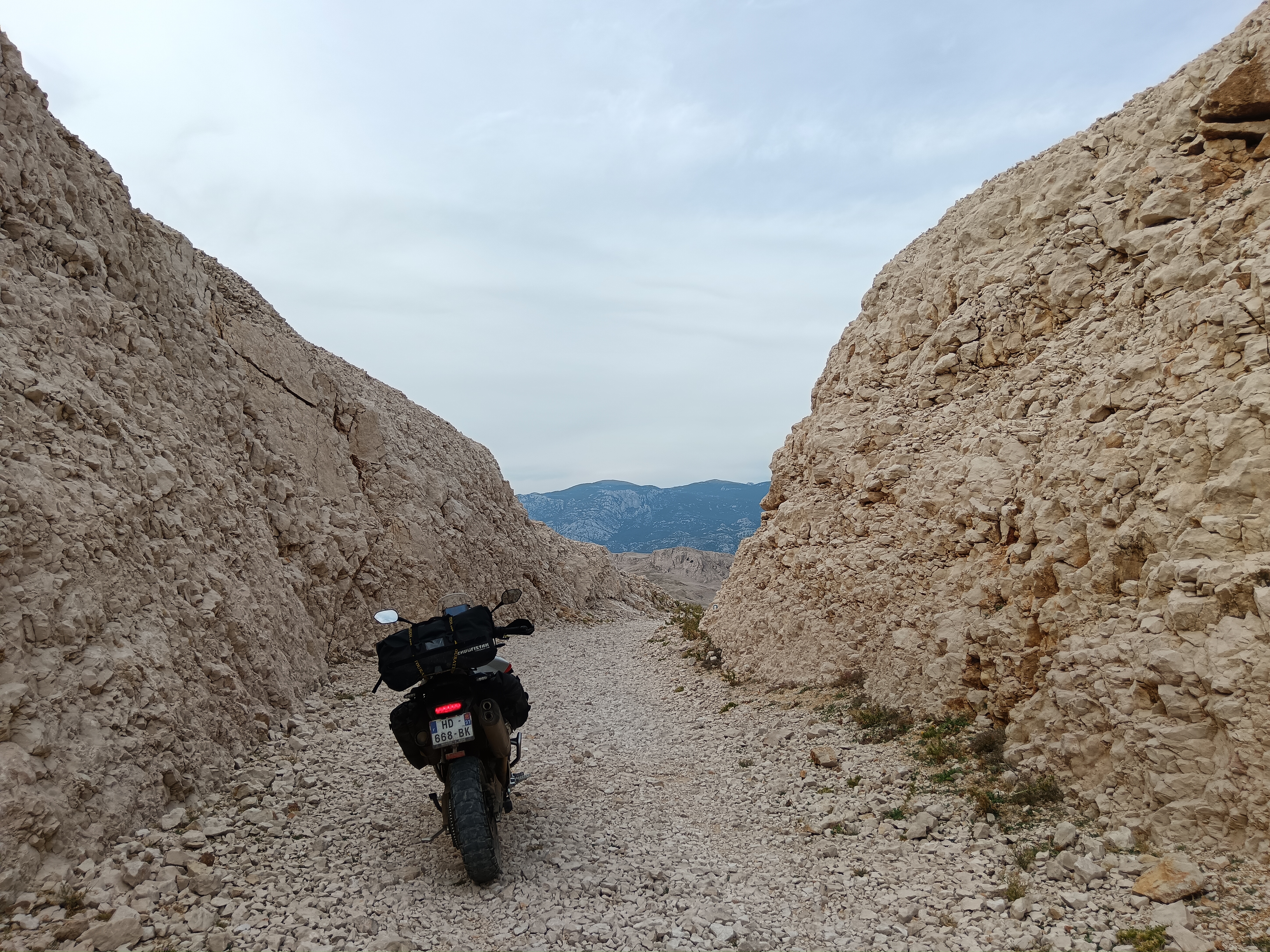 Le soleil revient à l’approche des côtes du nord de la Croatie, que je longerais non par la route, mais par des pistes de crêtes, jusqu’au ferry menant vers l’ile de Pag, une centaine de kilomètres plus au sud. 15 minutes de ferry, et l’on se retrouve au milieu d’étendues arides, à la pierre blanche. Bien sûr, vous vous doutez bien, votre serviteur avait préalablement repéré comment s’engager dans ce no man’s land, se balader à travers ces paysages loin des axes touristiques, et accéder à des criques sauvages. La journée se termine dans une petite cité balnéaire tout au sud de l’ile (presqu’ile en fait si l’on considère la connection par un pont plus au sud). Baignade, produits de la mer en terrasse, dodo. Demain, ca va être plus physique, le linesman a prévu du très costaud.