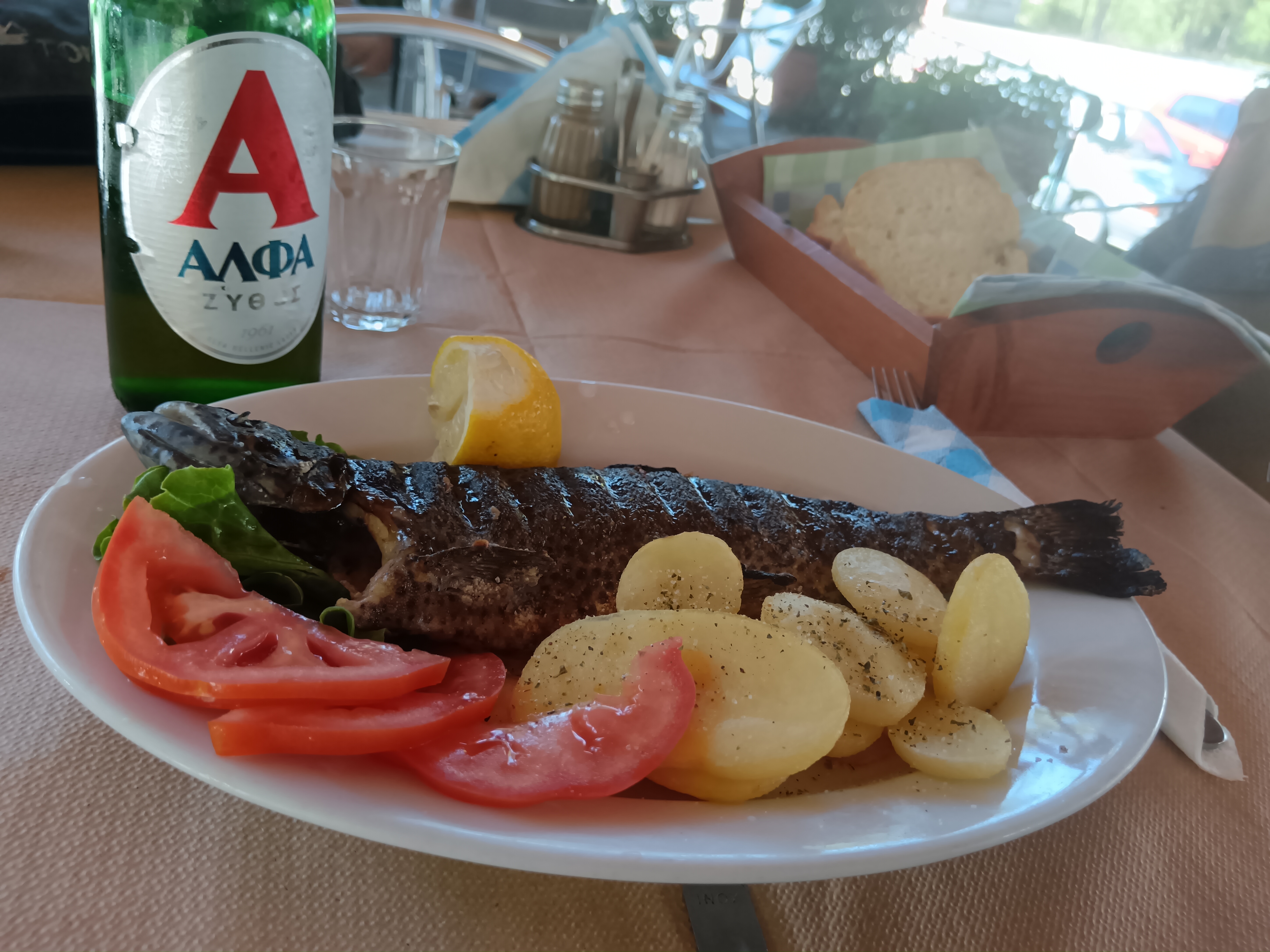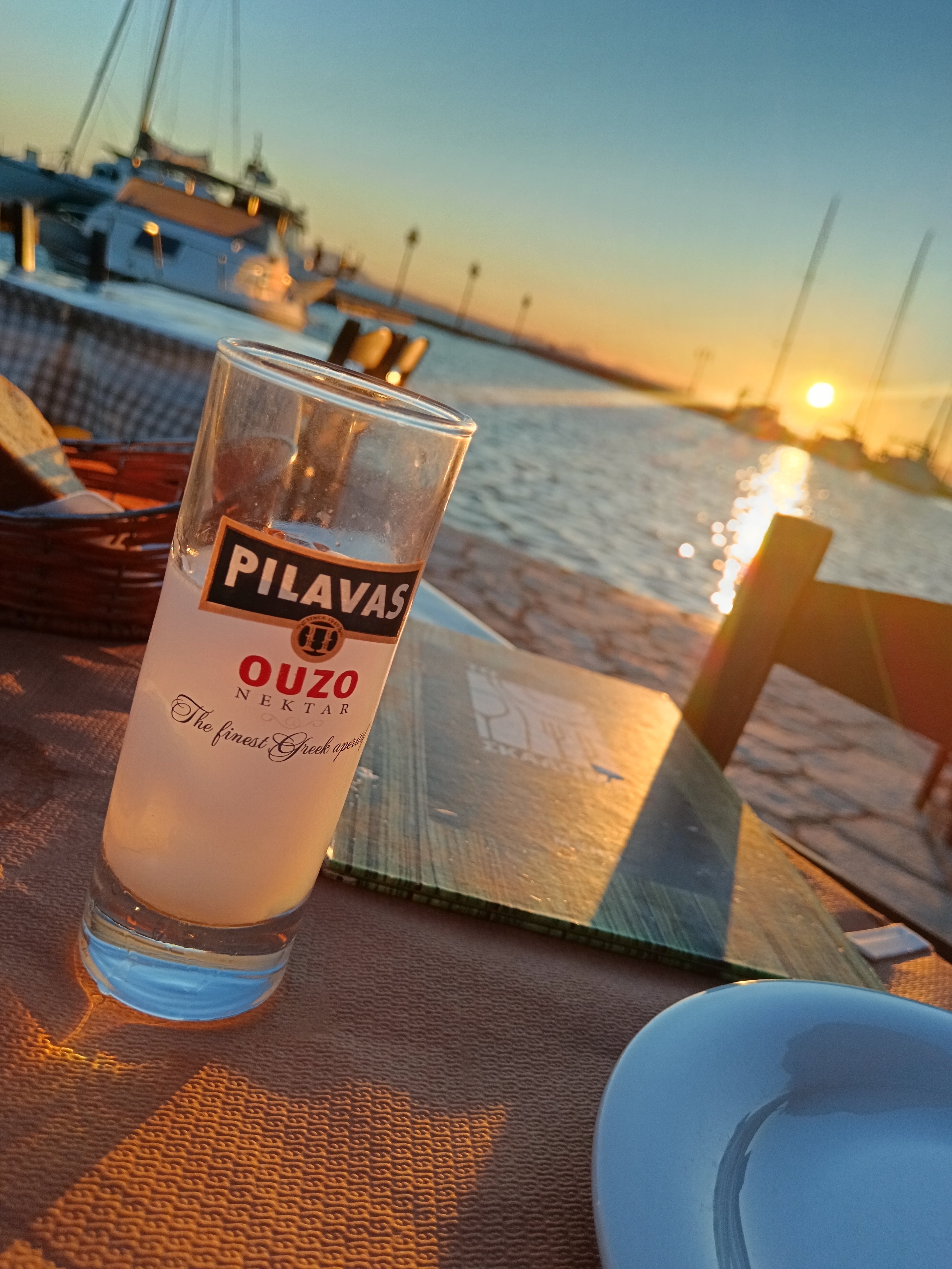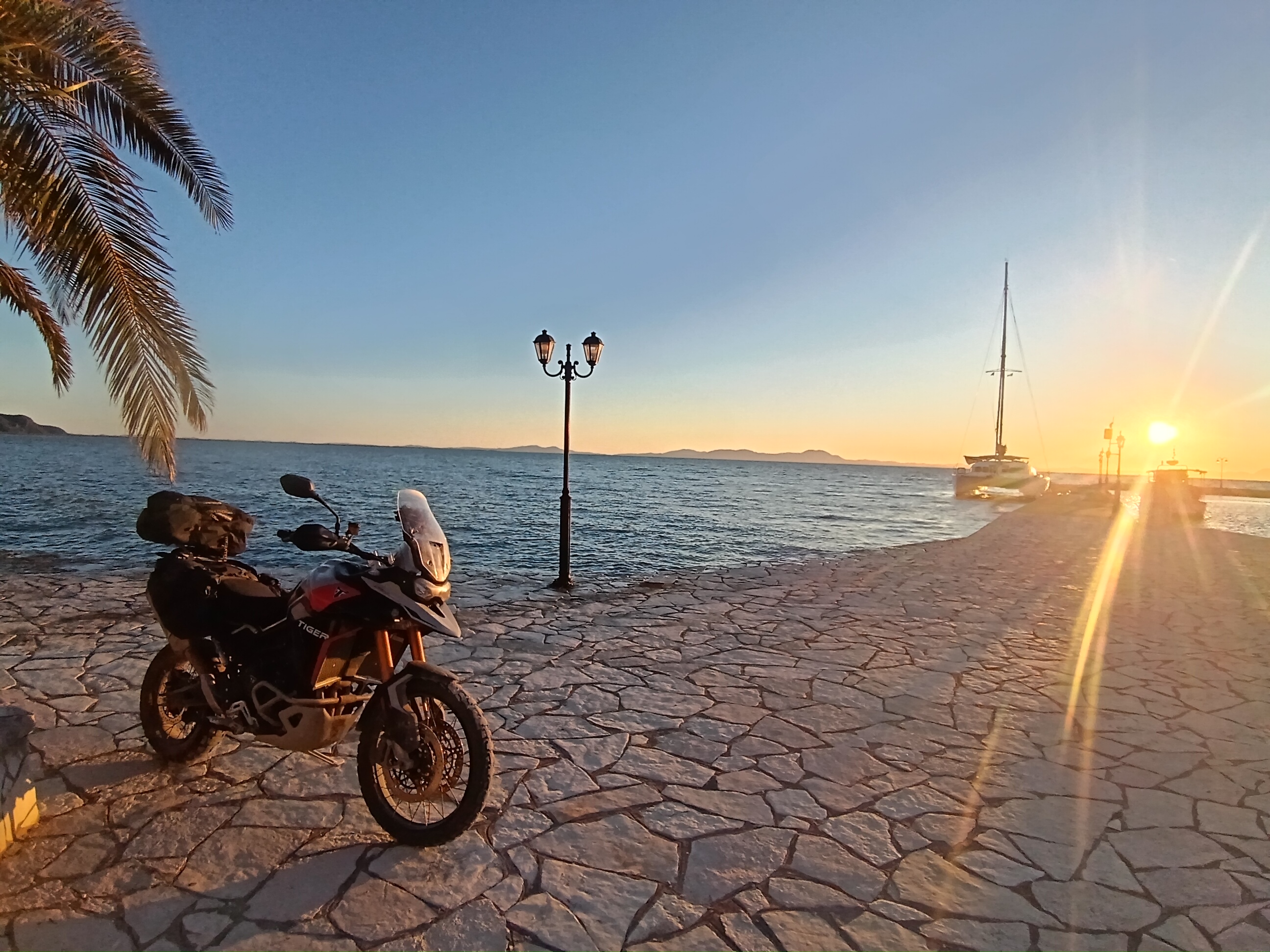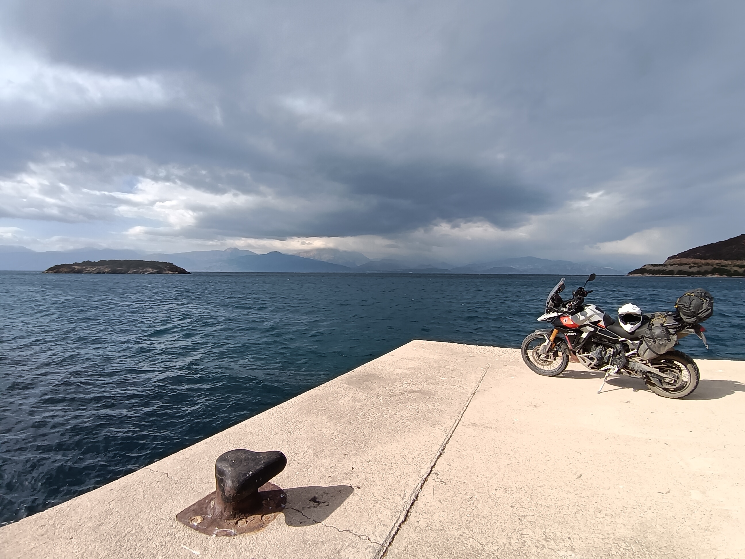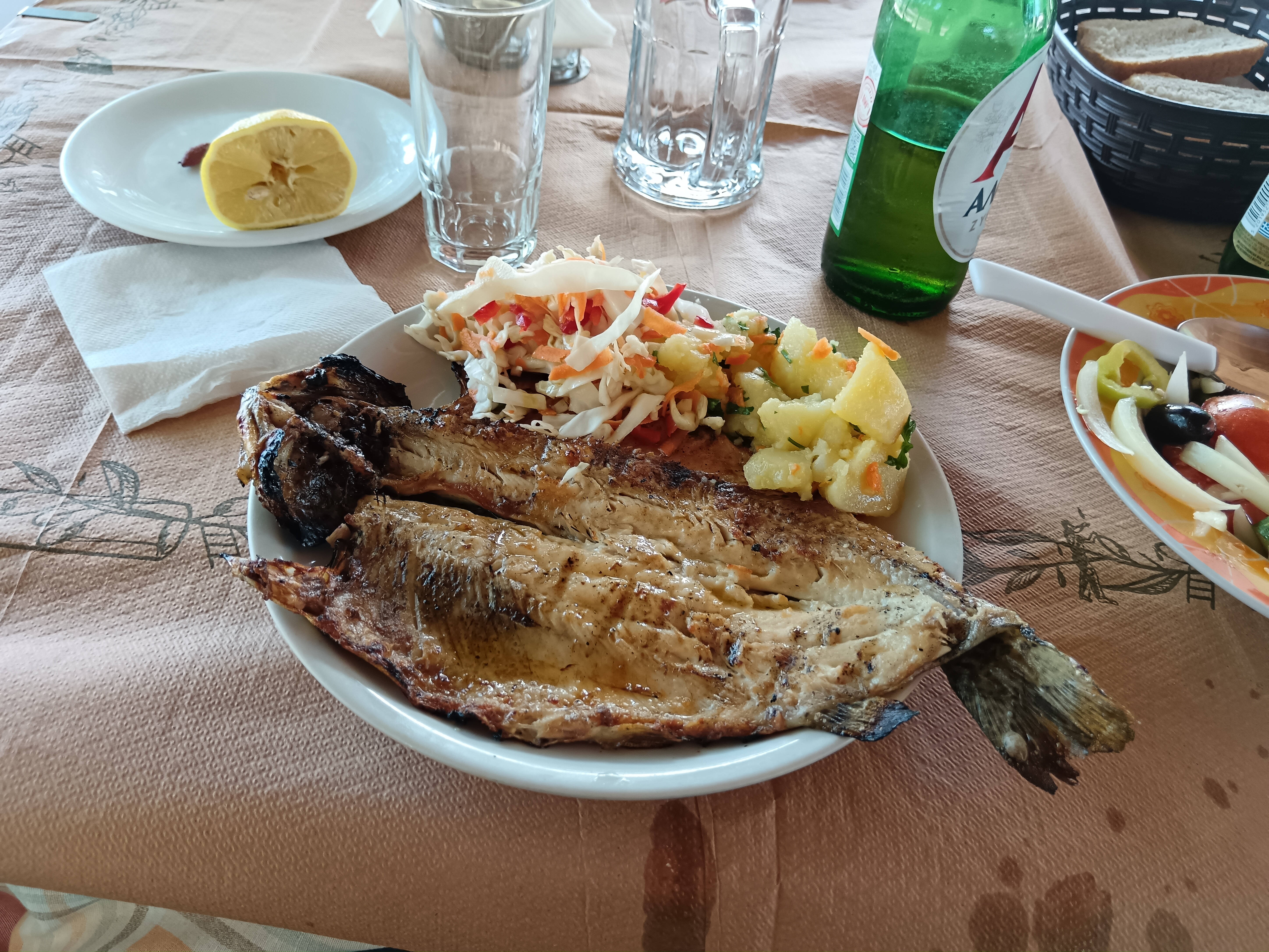 Dernier jour en Grèce, un rafiot m’attend au port de Igoumenitsa ce soir à minuit. Cela me laisse le temps de revenir dans les terres montagneuses à la recherche d’échappées paysagères. Même si le port est à l’ouest, je pars vers le nord pour 200km de montagnes, succession de canyons, de vieux ponts génois, de villages perchés, dont un fera l’objet d’un arrêt « dernière truite locale dans le gosier », le tout sur des routes en très mauvais état, souvent parsemés de blocs de roches. Pour tout dire, j’adore. Un arrêt au très beau monastère de Giromeri, avant de parvenir au nord du port de Igoumenitsa, à Sagiada, près de la frontière albanaise. Sagiada est un petit village de pêcheurs faisant face à Corfu. Je m’y pose, me baigne en attendant l’heure du Ouzo et du coucher de soleil, sur la terrasse du pêcheur qui fait office de restaurateur. Une daurade et un rouget commandés, sortis du bateau amaré en face de moi, le soleil se couchant sur Corfu, sirotant mon Ouzo. La Brexiteuse siestant non loin derrière moi sous un palmier, ou un olivier, je ne sais plus. J’ai connu pire contexte.