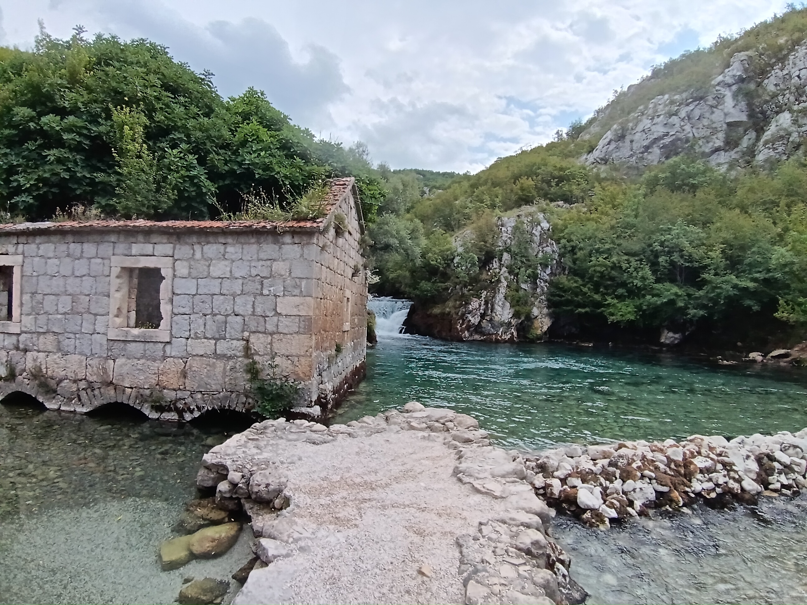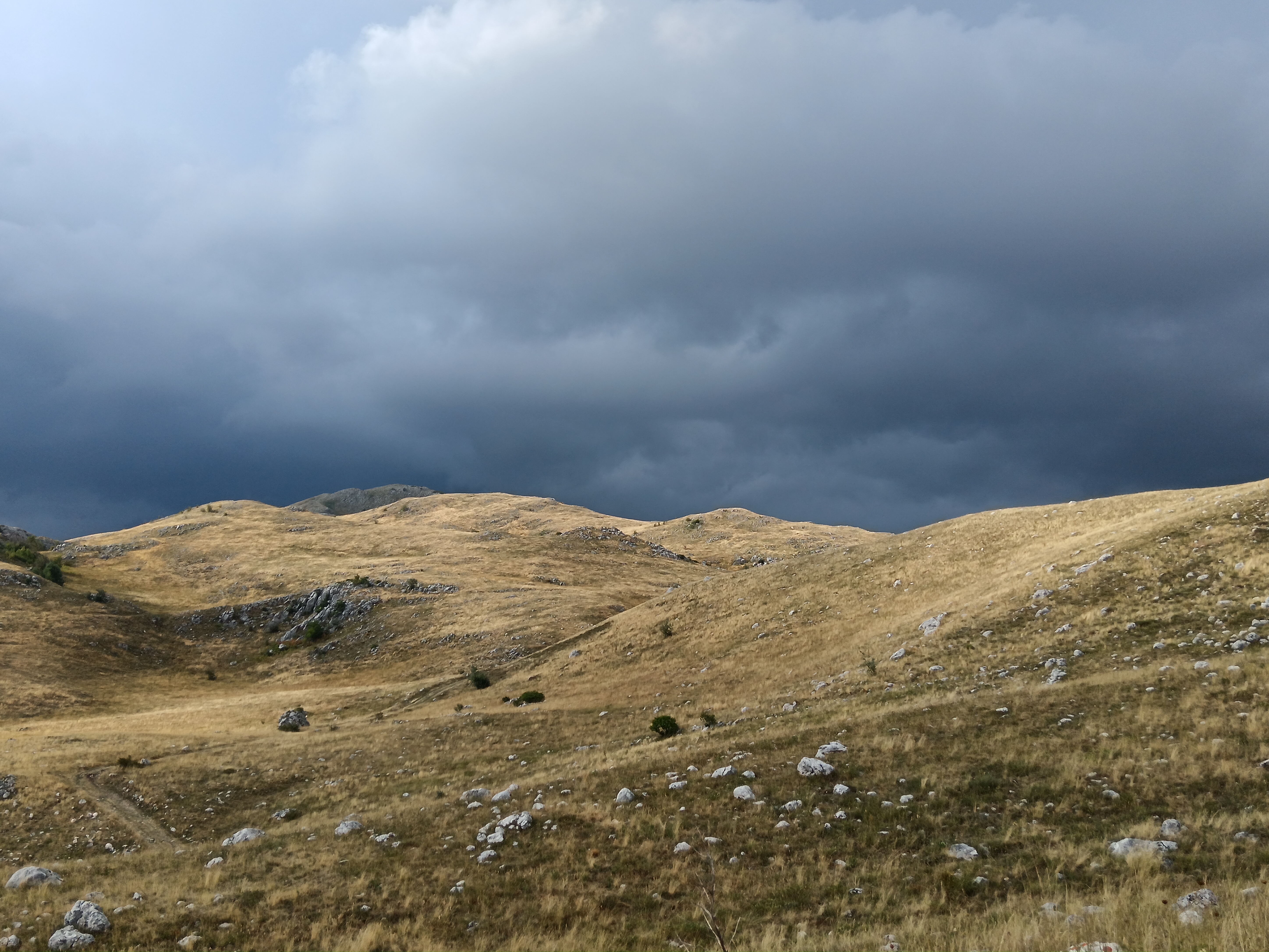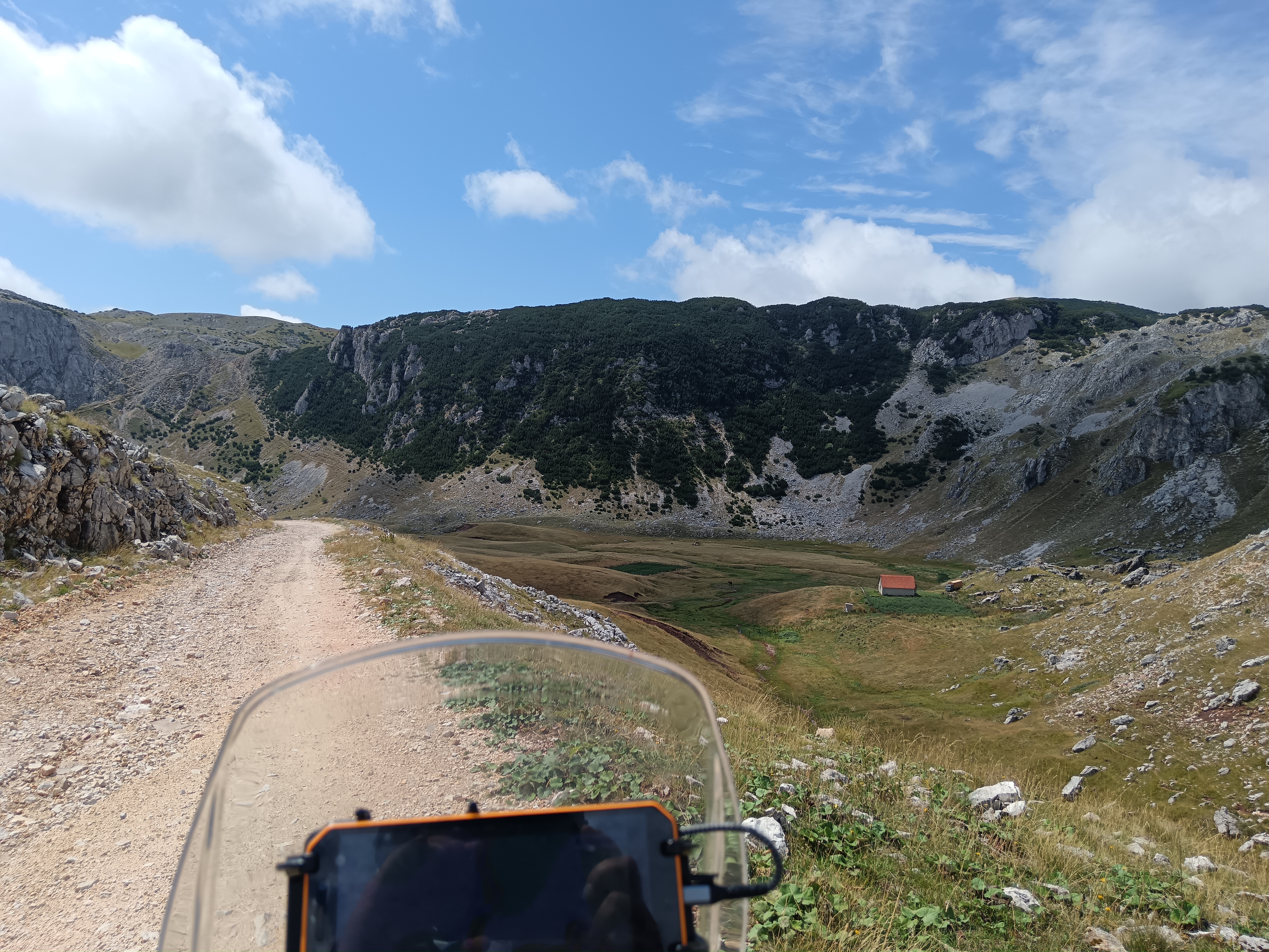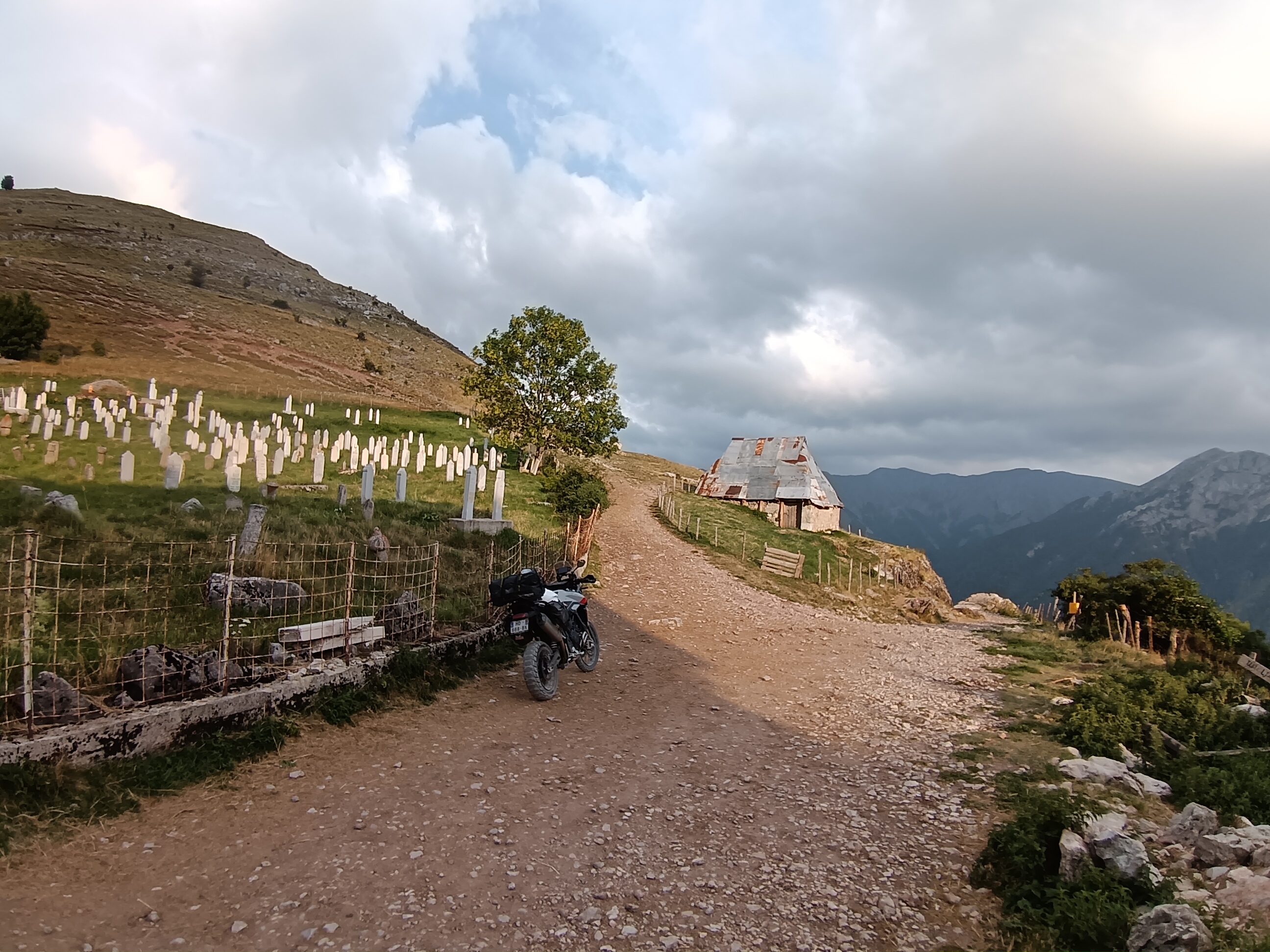 Encore une journée partiellement perturbée par la pluie, mais le plan a été respecté. Une journée de roulage plus longue, et plus technique, avec la moitié de la distance hors bitume. Le but: rejoindre le plus haut village de Bosnie – Lukomir. Mais pour cela, pas de côte touristique aujourd’hui. On entre au cœur des chaines de montagne du sud de la Croatie et de la Bosnie, des steppes, des petites rivières surgissant de la roche, des lacs, naturels ou pas, des gorges, quelques gouffres, des villages à l’abandon, d’autres en rénovation. Peu de monde. Quelques connaisseurs, à moto, vélo, ou chaussures de rando. Dans mon top 3 des natures sauvages en Europe (C’est mon troisième passage en 10 ans, avec quelques variantes pour mieux explorer les lieux). Fin de journée, j’ai sérieusement compromis mon stock de gateaux secs amandes/citron et barres vitaminées (pas de resto sur la trace depuis le matin), et il est temps de monter sur le plateau de Lukomir. A l’est, de Sarajevo, il est relativement facile d’y accéder par des pistes roulantes (la piste de descente des JO d’hiver démarrait non loin de là). Mais à l’ouest, on y accède par des chemins de pierres, très pentus. J’ai souffert dans un passage. Environ 300m dans un pierrier très pentu. J’ai du m’y reprendre à 3 fois. Première fois, tanké dans les pierres au bout de 100m. Pas grave, on essaie de tourner la moto, on redescent, on s’arrête, on réfléchit, on respire. On enlève 500gr de pression aux pneus, on se concentre, et on réattaque la montée : Tanké une cinquantaine de mètres avant que le chemin ne reprenne un dénivelé raisonnable. On désespère pas, on redescent, et on se pose en bas une demi-heure. Deux alternatives: 1. sortir de là, retourner dans la vallée, et faire 80km de petites routes pour rejoindre Sarajevo et monter à Lukomir par l’est. 2. Réessayer une troisième fois. Option 2: j’enlève 500gr de plus dans le pneu arrière. Il ne lui reste que 1kg2, mais avec une telle pression, si je fais pas le con à taper brutalement dans les cailloux, il devrait les épouser, mieux tracter, plutôt que rebondir et déstabiliser la moto et ma trajectoire comme lors des deux premiers essais. De la théorie tout ça…. mais de la théorie avec preuve, puisque le troisième essai sera réussi, suivi d’un cri de joie et un célèbre lyrics de Bowie « we can be heroes » !.