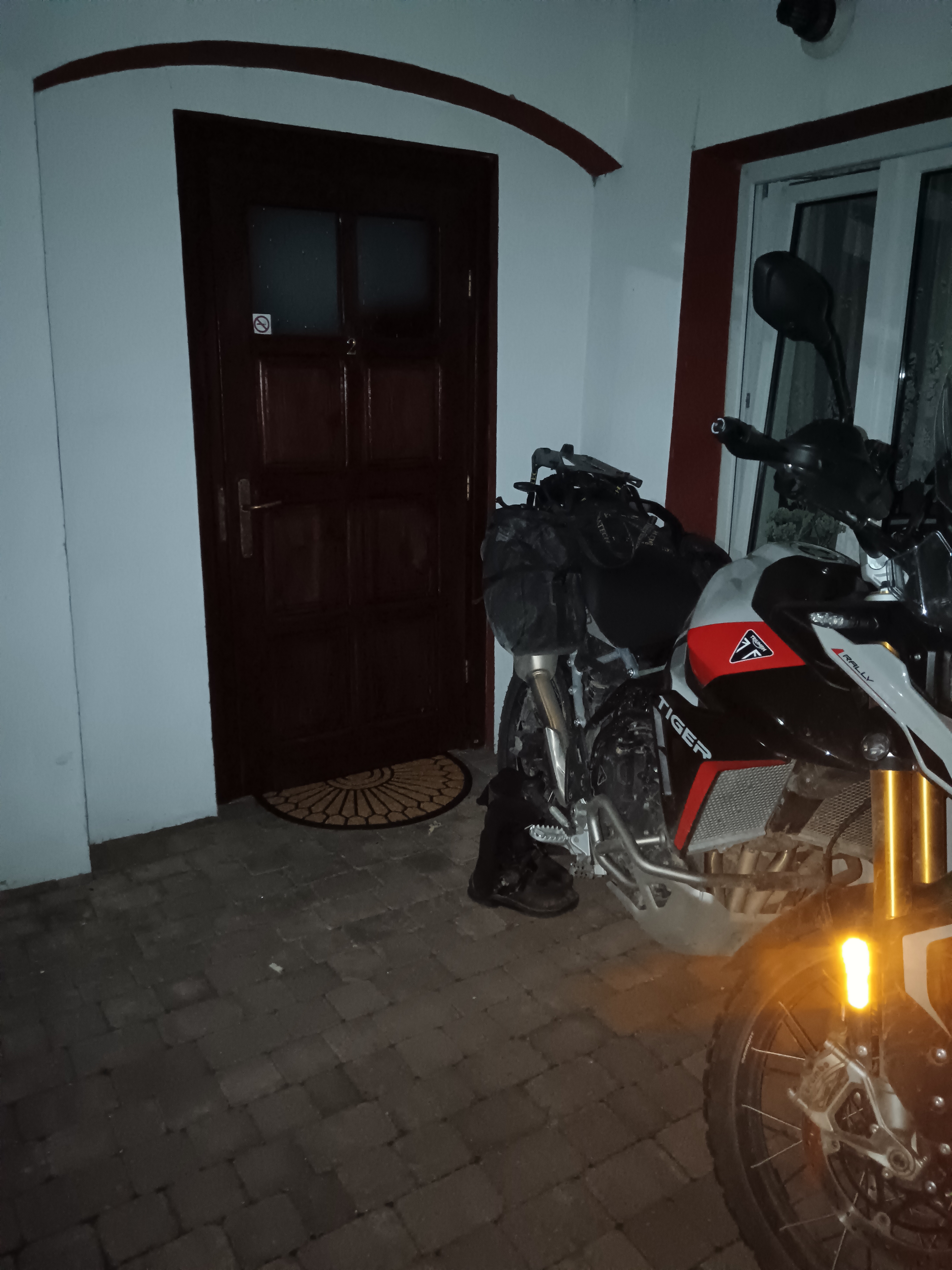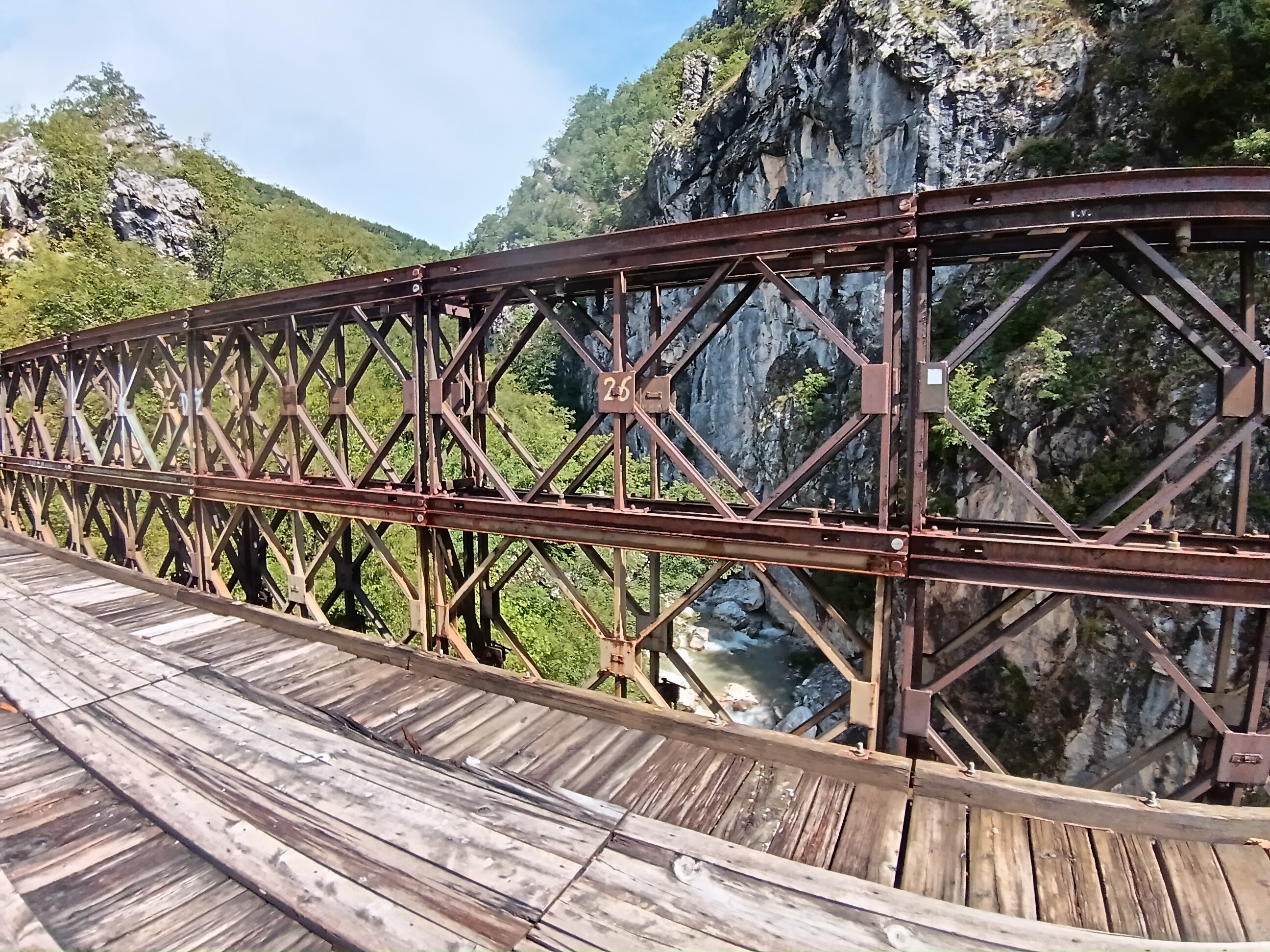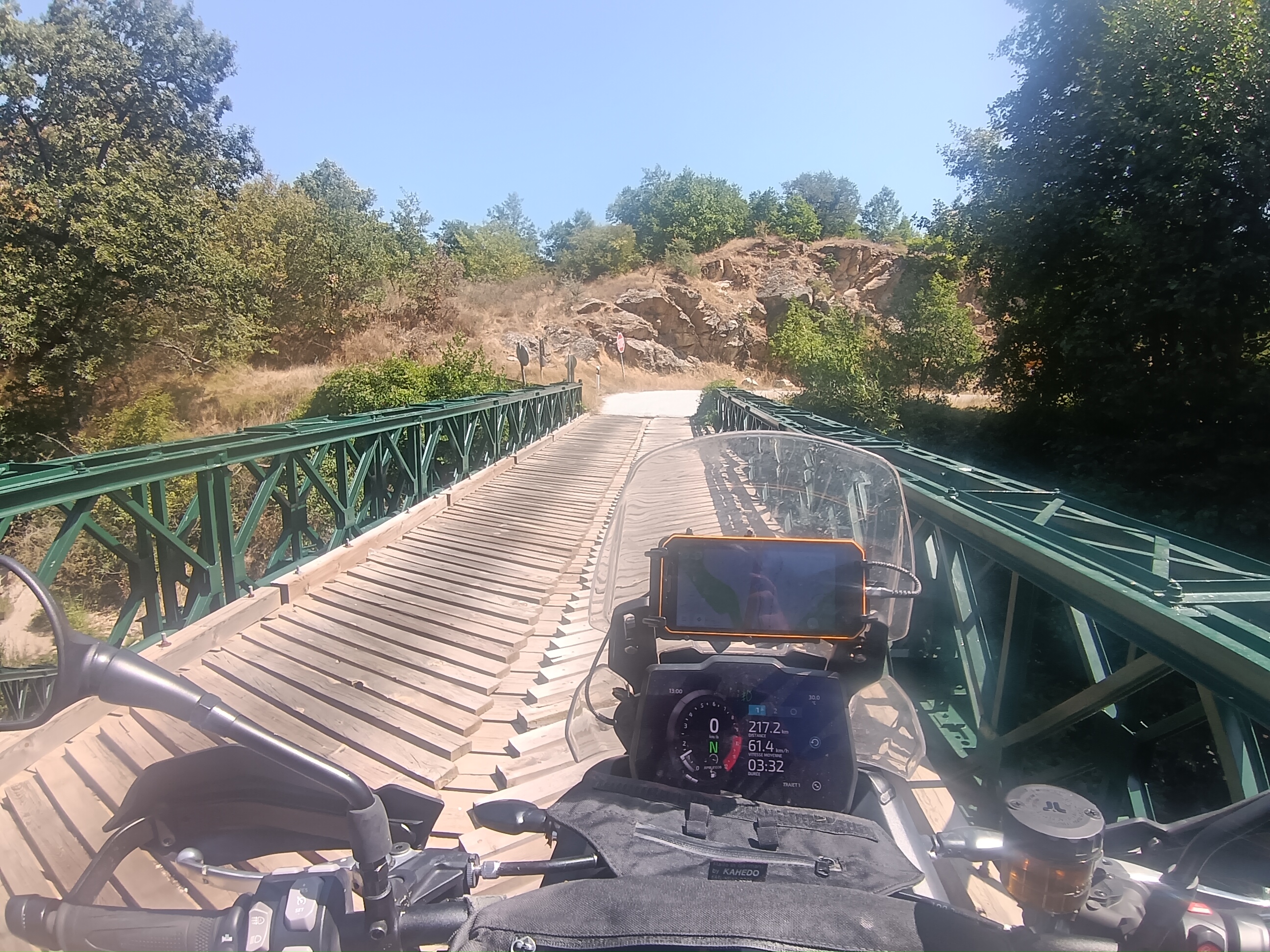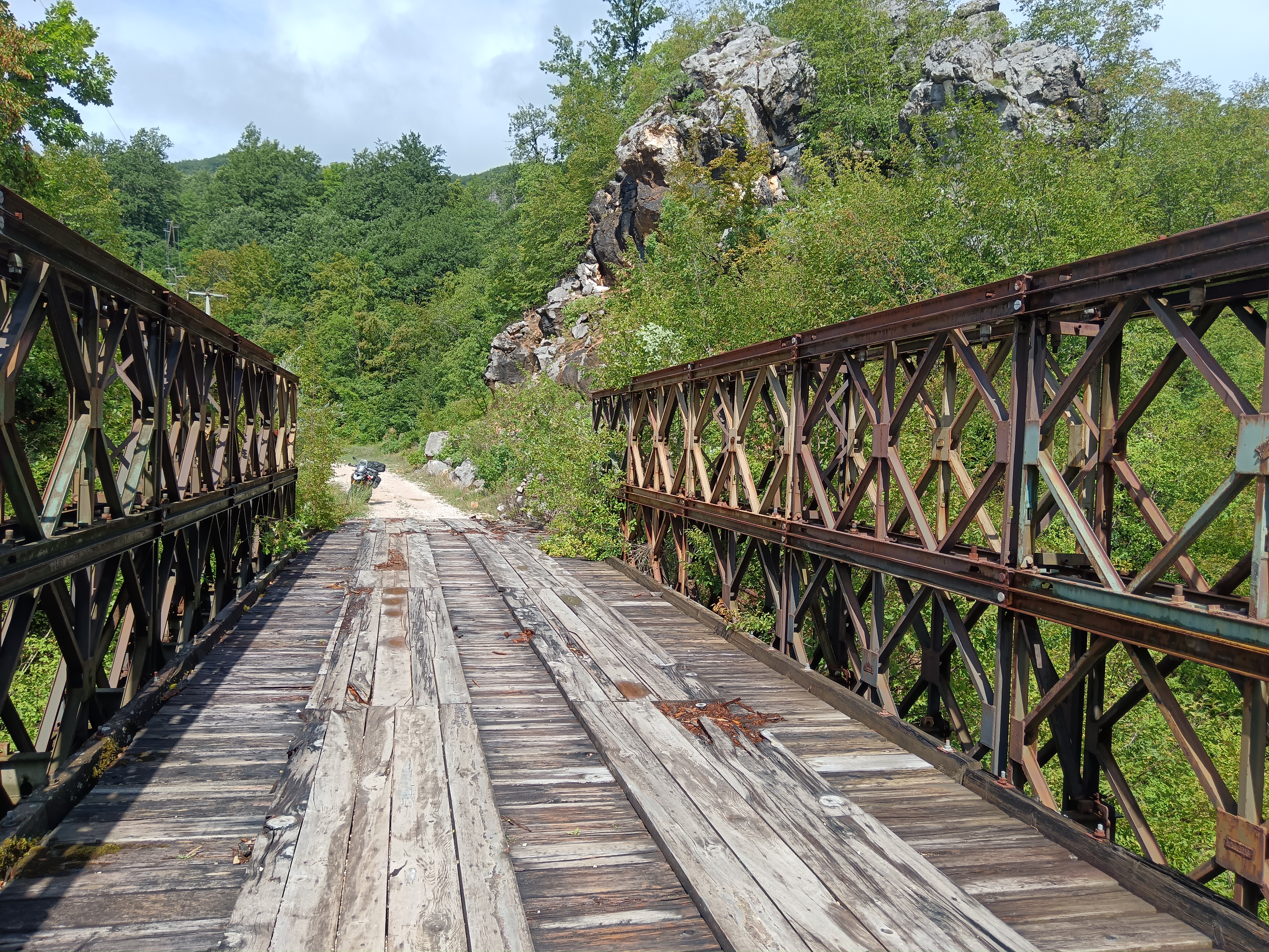 La malchance se poursuit côté météo. Si en temps normal, la brexiteuse démarre vers 8h du matin, là, elle aura du attendre 10h30, en raison d’un ciel crachant des trombes d’eau, et une visibilité à 20m. Vu ce qui m’attend pour la matinée (120km de pistes de montagne jusqu’à la frontière monténégrine – j’ai pas envie de la plus longue variante routière – c’est comme ça, c’est moi qui décide). Une fois les nuages balayés par le vent et les premiers rayons de soleil, me voilà parti vers le sud, sur de belles pistes, rendues un peu glissantes par la pluie, mais ça se gère. Encore des nécropoles, puis un pont de bois enjambant un canyon dont j’apprends d’un baroudeur local qu’il a été construit à la va-vite par des ingénieurs espagnols venus en aide à des populations rurales coupées du monde suite aux bombardements de la guerre des Balkans. On voit en effet l’ancien pont écroulé en dessous. 30 ans plus tard, le pont est encore praticable, mais je vous cache pas l’avoir d’abord parcouru à pied pour vérifier l’état des planches de bois. On poursuit jusqu’à la frontière monténégrine par cols et chemins de crêtes, avec des panoramas magnifiques. Le poste frontière n’est normalement réservé qu’aux populations locales, mais une fouille web m’indiquait une « tolérance ». En effet, un seul agent dans une cabane, voulant d’abord me faire rebrousser chemin (ce qui aurait compromis l’intégralité de l’étape du jour). Un petit papotage, et la barrière toute déglinguée s’est ouverte, pour me permettre de rejoindre le parc national du Durmitor, de plus en plus connu des touristes européens, en particulier le canyon de la rivière Tara. Au fur et à mesure que j’avançais vers le canyon, plus beau selon moi, de la rivière Komarnica, les nuages s’épaicissaient, jusqu’à ce que, alors que je naviguais loin de l’axe touristique principal au dessus des falaises du canyons, de nouvelles trombes d’eau s’abattent sur moi. Sauf que là, c’est 2000m d’altitude, de violentes rafales de vent, 5 degrés, des éclairs non pas au-dessus mais en dessous de toi, et bien sûr, rien pour se mettre à l’abri. Une heure trente environ sous ce régime là, en roulant au pas, avant de rejoindre les abords du village touristique de Zabljak, et m’abriter une heure sous le porche de ce qui semblait être un couvent abandonné. Enorme frustration, car j’ai du me résigner durant cette tornade à ne pas faire une centaine de kilomètres au travers de paysages encore non explorés lors de mes précédents voyages, pour réduire le risque et passer par un itinéraire bis plus simple, totalement routier, et moins dangereux dans ces conditions. L’heure tourne, la pluie a cessé mais la nuit approche, et il me reste 160km pour rejoindre le point de chute réservé en Serbie. Mais la malchance se poursuit: douaniers serbes zélés: 1h15 d’attente dans une file de seulement 5 voitures lors de mon arrivée. La nuit est maintenant noire, et je parviens à mon « etno hotel » à 22h40. Il avait l’air vraiment beau cet hôtel sur les photos, et puis pour 26 euros la nuit, hein, ça vaut le coup. Mais j’ai rien vu. Et puis je l’avais choisi pour son accès pédestre à une falaise surplombant un très beau méandre. « Ouais, ça va être cool cette petite marche et cette belle vue, après une belle journée de moto ». J’ai vu que dalle. Consolation avec du houblon et un excellent diner préparé par un excellent gars qui a accepté de rallumer ses excellents fourneaux face à ma détresse alimentaire.