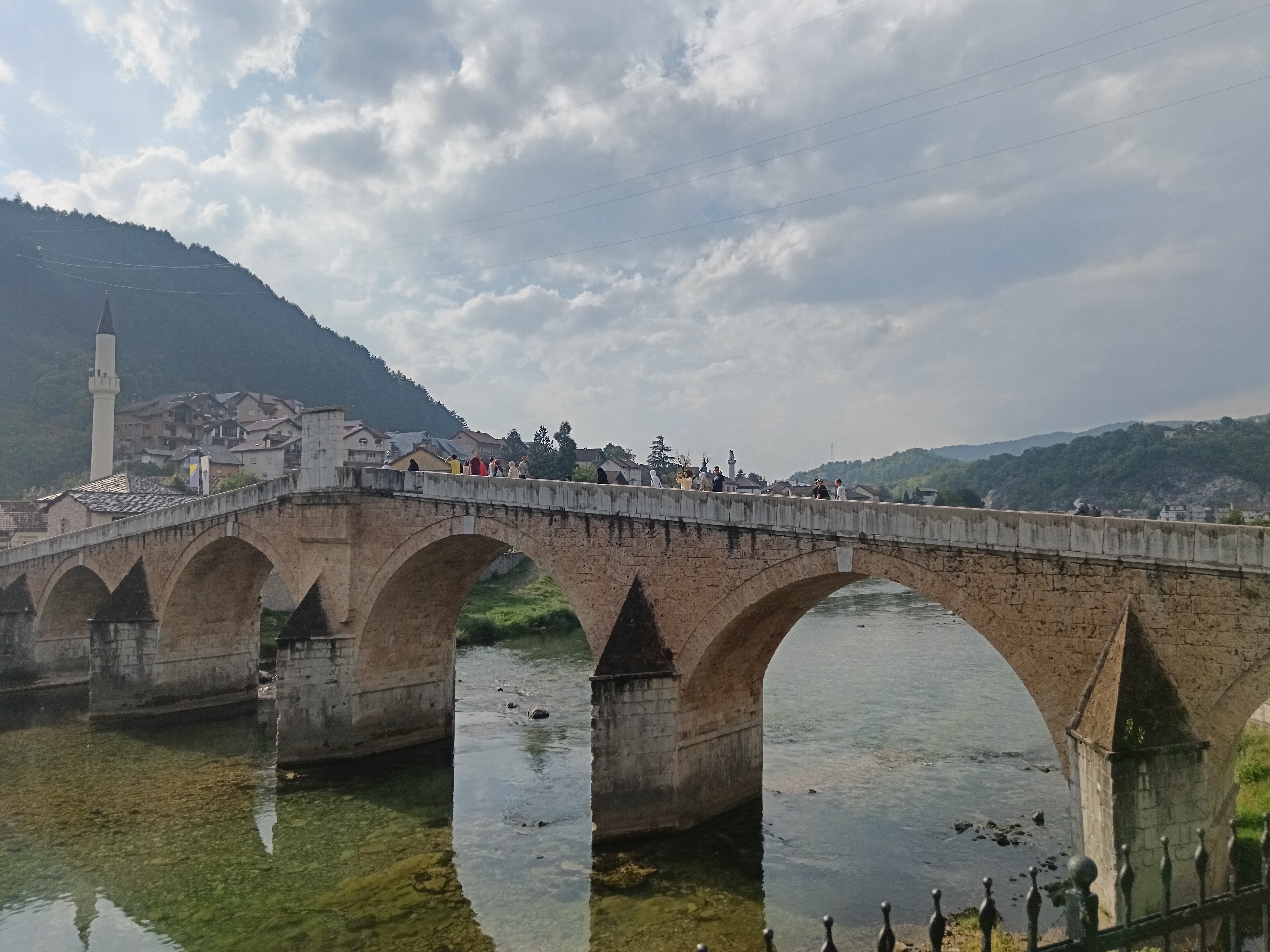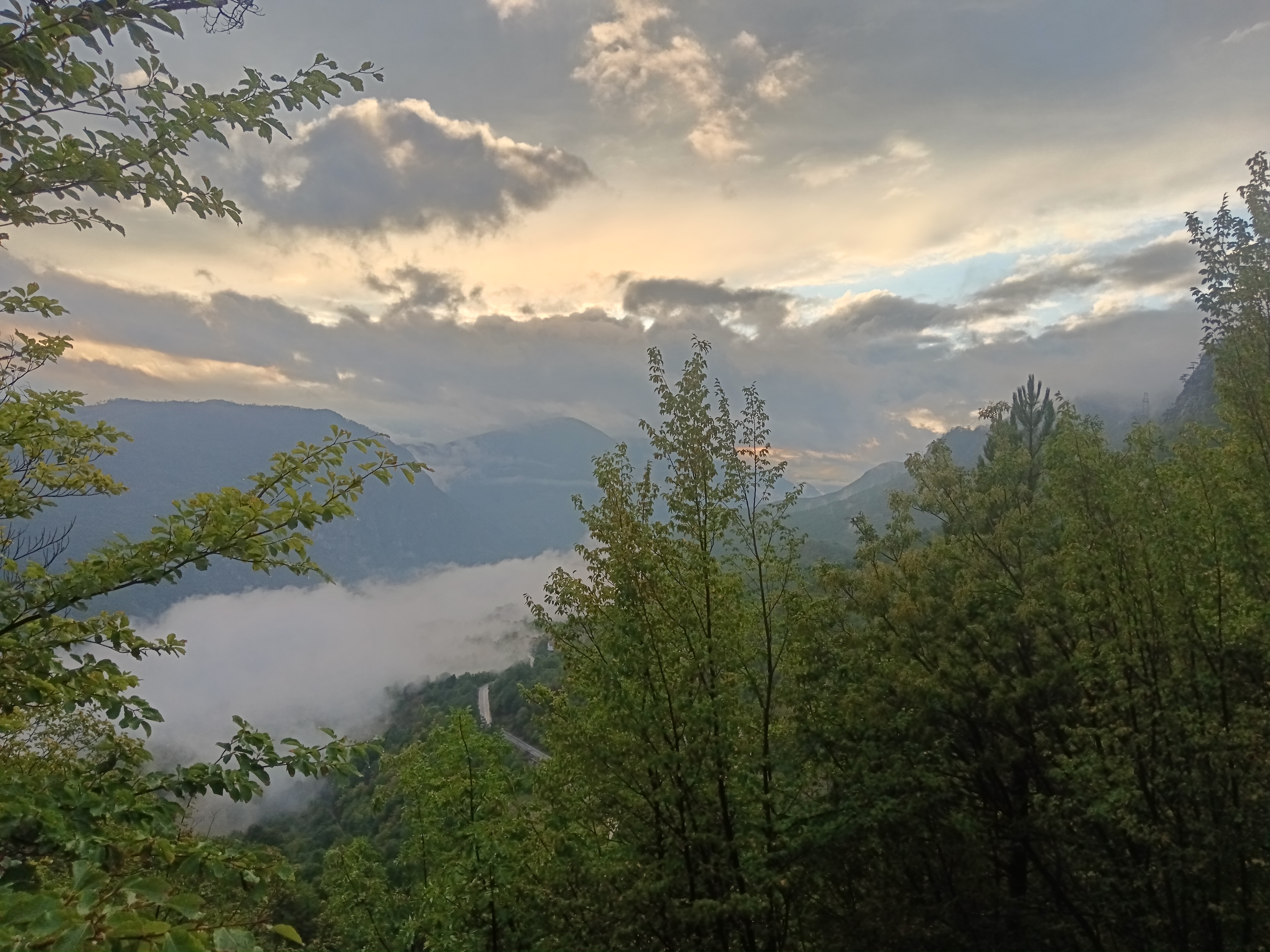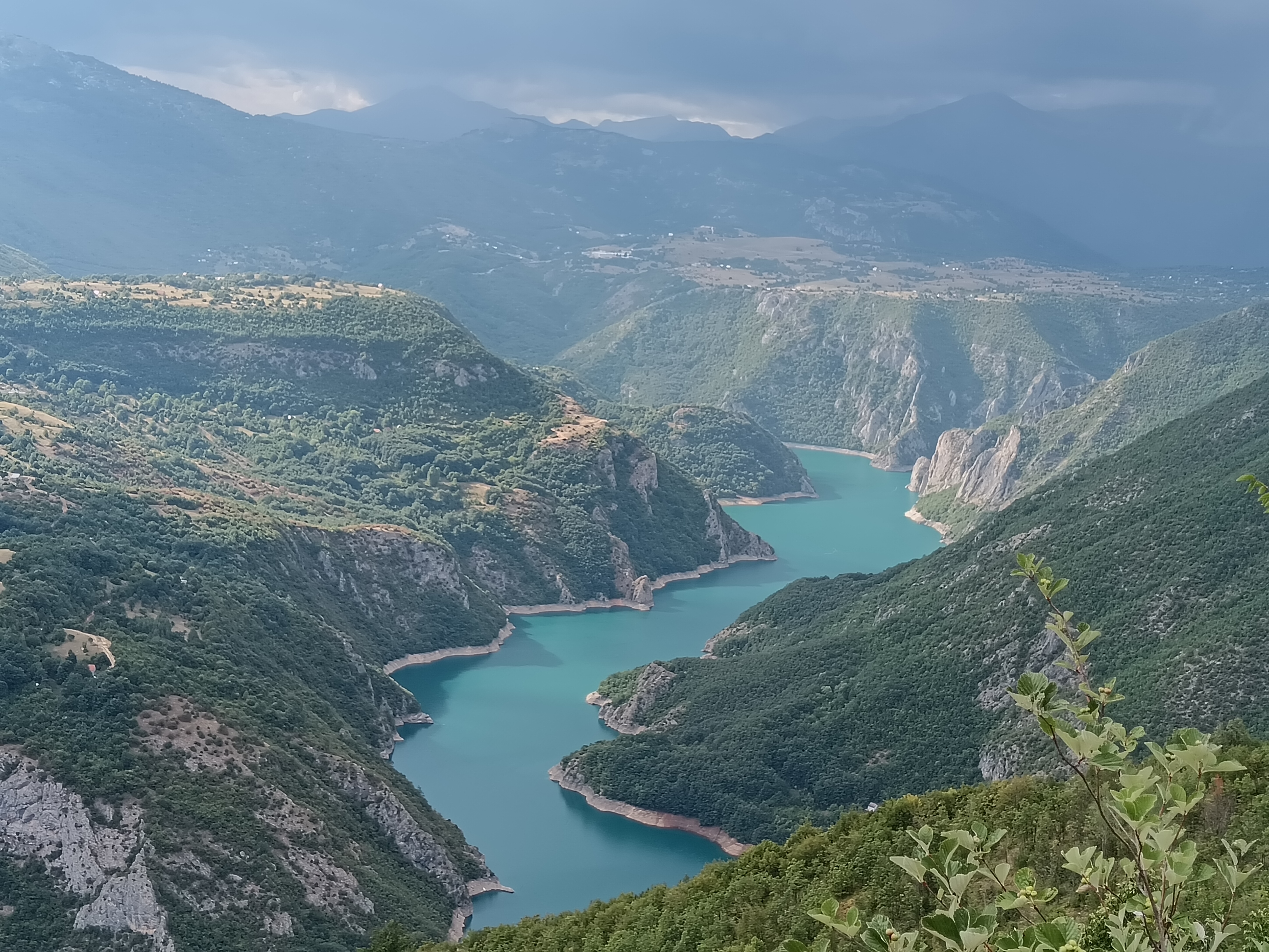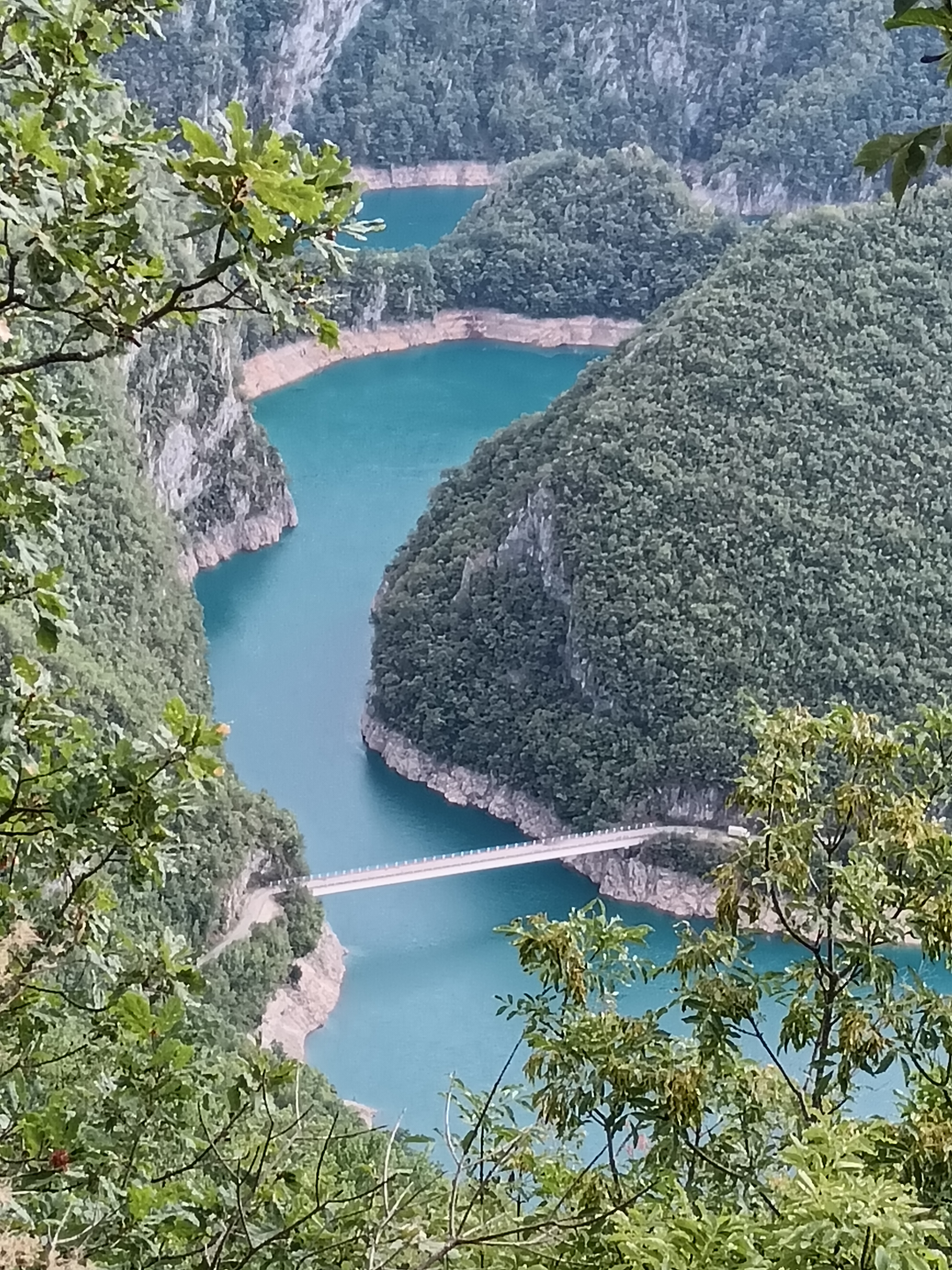 La malchance se poursuit côté météo. Si en temps normal, la brexiteuse démarre vers 8h du matin, là, elle aura du attendre 10h30, en raison d’un ciel crachant des trombes d’eau, et une visibilité à 20m. Vu ce qui m’attend pour la matinée (120km de pistes de montagne jusqu’à la frontière monténégrine – j’ai pas envie de la plus longue variante routière – c’est comme ça, c’est moi qui décide). Une fois les nuages balayés par le vent et les premiers rayons de soleil, me voilà parti vers le sud, sur de belles pistes, rendues un peu glissantes par la pluie, mais ça se gère. Encore des nécropoles, puis un pont de bois enjambant un canyon dont j’apprends d’un baroudeur local qu’il a été construit à la va-vite par des ingénieurs espagnols venus en aide à des populations rurales coupées du monde suite aux bombardements de la guerre des Balkans. On voit en effet l’ancien pont écroulé en dessous. 30 ans plus tard, le pont est encore praticable, mais je vous cache pas l’avoir d’abord parcouru à pied pour vérifier l’état des planches de bois. On poursuit jusqu’à la frontière monténégrine par cols et chemins de crêtes, avec des panoramas magnifiques. Le poste frontière n’est normalement réservé qu’aux populations locales, mais une fouille web m’indiquait une « tolérance ». En effet, un seul agent dans une cabane, voulant d’abord me faire rebrousser chemin (ce qui aurait compromis l’intégralité de l’étape du jour). Un petit papotage, et la barrière toute déglinguée s’est ouverte, pour me permettre de rejoindre le parc national du Durmitor, de plus en plus connu des touristes européens, en particulier le canyon de la rivière Tara. Au fur et à mesure que j’avançais vers le canyon, plus beau selon moi, de la rivière Komarnica, les nuages s’épaicissaient, jusqu’à ce que, alors que je naviguais loin de l’axe touristique principal au dessus des falaises du canyons, de nouvelles trombes d’eau s’abattent sur moi. Sauf que là, c’est 2000m d’altitude, de violentes rafales de vent, 5 degrés, des éclairs non pas au-dessus mais en dessous de toi, et bien sûr, rien pour se mettre à l’abri. Une heure trente environ sous ce régime là, en roulant au pas, avant de rejoindre les abords du village touristique de Zabljak, et m’abriter une heure sous le porche de ce qui semblait être un couvent abandonné. Enorme frustration, car j’ai du me résigner durant cette tornade à ne pas faire une centaine de kilomètres au travers de paysages encore non explorés lors de mes précédents voyages, pour réduire le risque et passer par un itinéraire bis plus simple, totalement routier, et moins dangereux dans ces conditions. L’heure tourne, la pluie a cessé mais la nuit approche, et il me reste 160km pour rejoindre le point de chute réservé en Serbie. Mais la malchance se poursuit: douaniers serbes zélés: 1h15 d’attente dans une file de seulement 5 voitures lors de mon arrivée. La nuit est maintenant noire, et je parviens à mon « etno hotel » à 22h40. Il avait l’air vraiment beau cet hôtel sur les photos, et puis pour 26 euros la nuit, hein, ça vaut le coup. Mais j’ai rien vu. Et puis je l’avais choisi pour son accès pédestre à une falaise surplombant un très beau méandre. « Ouais, ça va être cool cette petite marche et cette belle vue, après une belle journée de moto ». J’ai vu que dalle. Consolation avec du houblon et un excellent diner préparé par un excellent gars qui a accepté de rallumer ses excellents fourneaux face à ma détresse alimentaire.