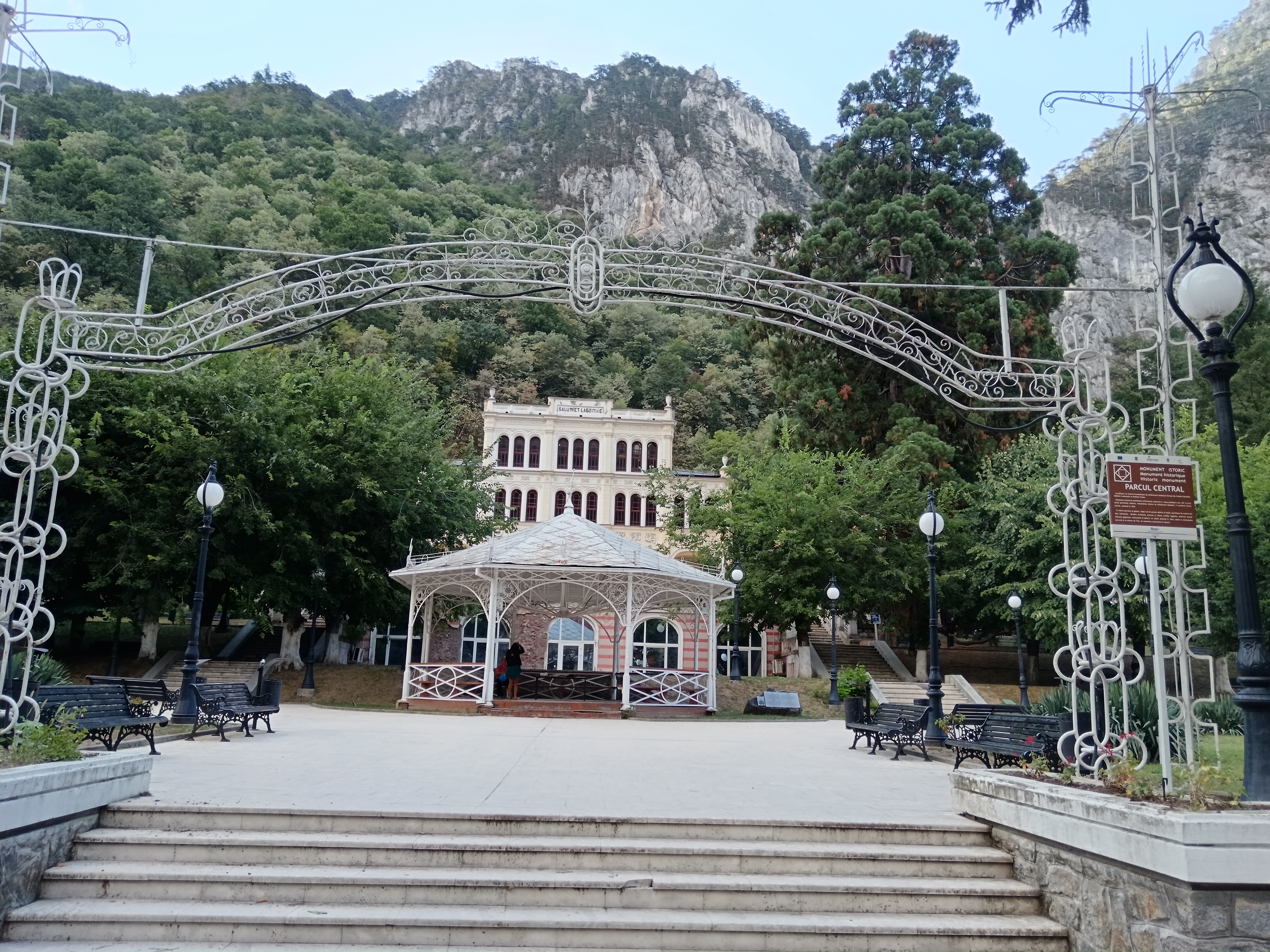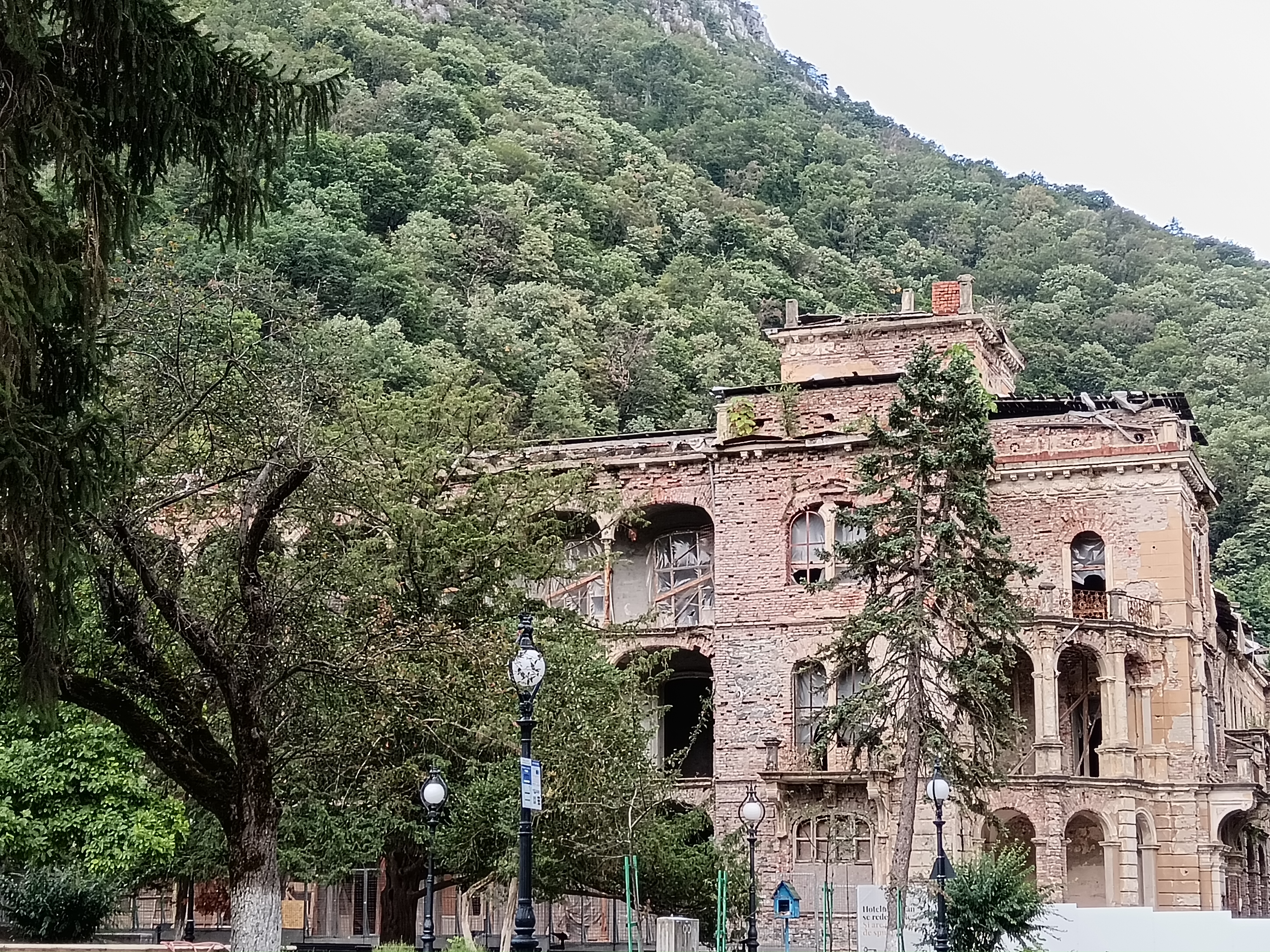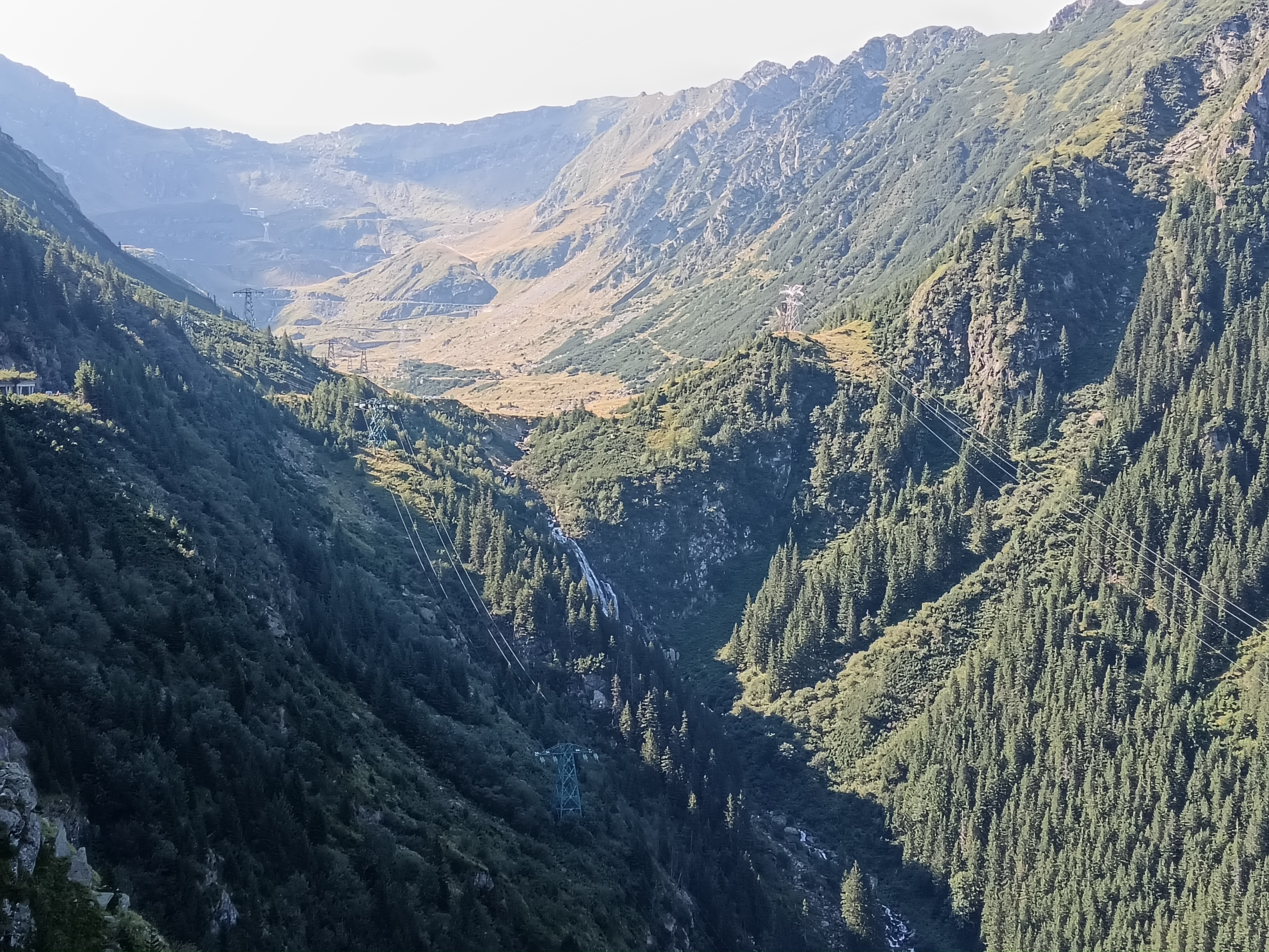 Nous voici donc aujourd’hui et pour deux jours dans l’instant Carpates du voyage. Dès le matin, après un beau lever de soleil sur le Danube, on rejoint dans les premières montagnes les bains de Baile-Herculane, dans les gorges de la rivière Cernei. Un lieu particulièrement insolite. Des bains d’une très belle architecture, dans un état de délabrement avancé, suite à un scandale de corruption. J’en profite pour aller me renseigner sur le web dans la presse locale, face à ces bâtiments, et j’apprends (merci google trad) que des communautés de jeunes, sans aides publiques, ont lancé des travaux de restauration. Vraiment un lieu magnifique. Plus étonnant encore, plus haut en montant le long de la gorge, beaucoup de roumains, des familles âgées et plutôt modestes, garent leur voiture le long de la route étroite, pour descendre se poser au sein de vasques, profiter des bienfaits supposés de cette eau, probablement très froide. Encore plus engagé dans les gorges, je fais un arrêt « évaluation des risques ». Initialement, était prévu un traversée de cette partie des Carpates par une longue piste d’un soixantaine de kilomètres, sans âmes qui vivent. Piste que je savais très variée au niveau des conditions (sous-bois humides, pierres, terres, parties très pentues, parties plus faciles). Mais piste que je savais aussi traverser des paysages sauvages intéressants. Mais comme une petite angoisse. Le pneu arrière commence à être usé, si bien que les conditions de traction hors bitume étaient fragilisées. Le temps était beau et sec, mais les pluies torrentielles étaient passées la veille, si bien que les parties en sous-bois étaient peut-être encore très boueuses. Temps de réflexion donc, puis je décide de ne pas m’engager dans cette partie sans échappatoire autre qu’un demi-tour, qui m’aurait fait perdre trop de temps, et un risque non pas de chute mais de m’embourber et compromettre la journée voire plus. Je decide donc de partir plus au sud par de petites routes traversant une myriade de petits villages ruraux, pour rejoindre la trace prévue plus loin, au pied de la route portant mal son nom: La Transalpina. Deuxième passage ici, le premier en 2017. Pour moi, la plus belle route d’Europe, traversant les Carpates à la verticale. Pas des montagnes comme dans les Alpes, les dénivelés sont plus progressifs jusqu’aux 2150m du sommet de la route, mais les vues sont impressionnantes. Grand soleil, vents forts, seulement 5 degrés, donc pas de brumes de chaleur qui entravent la profondeur des vues.