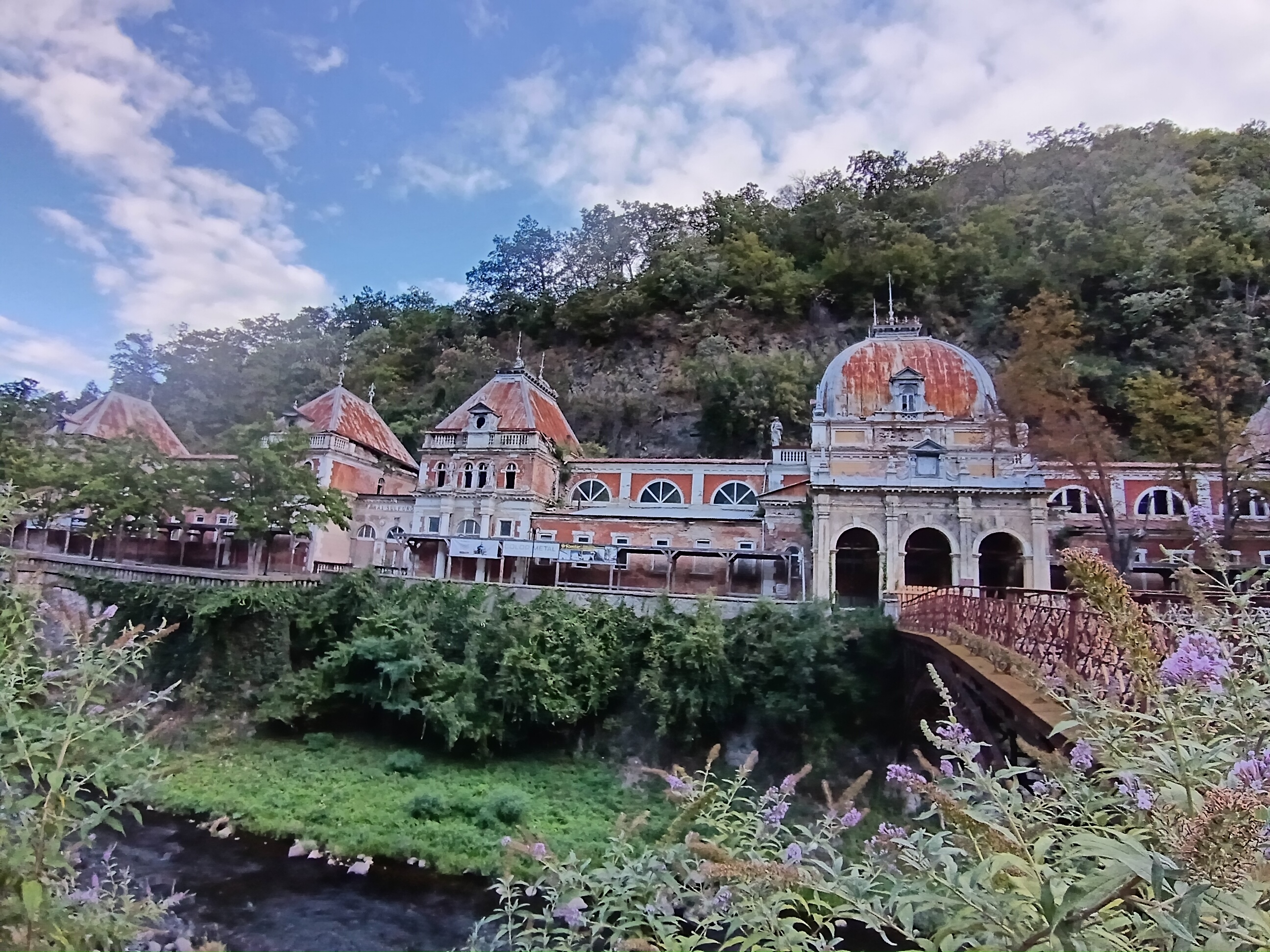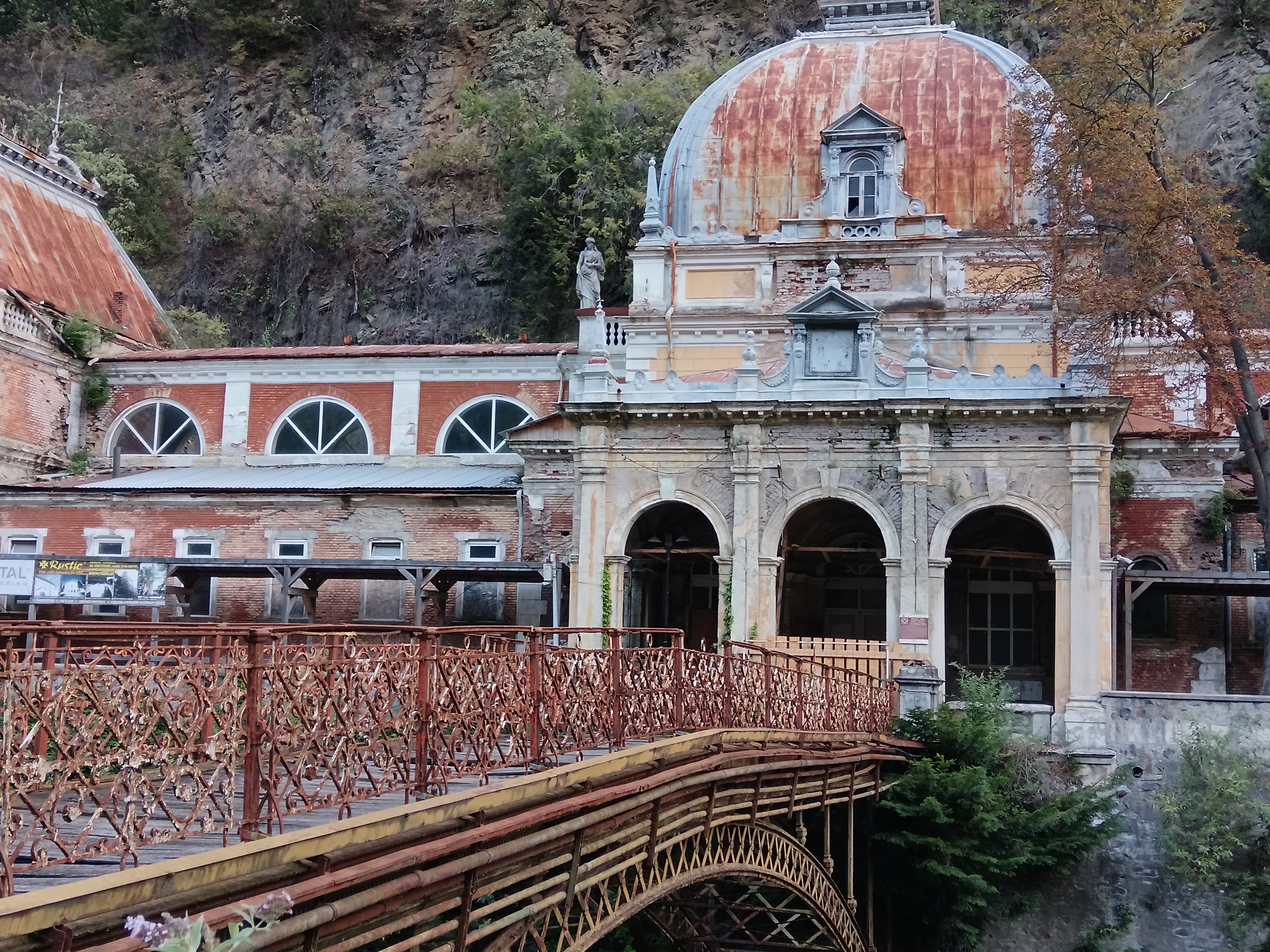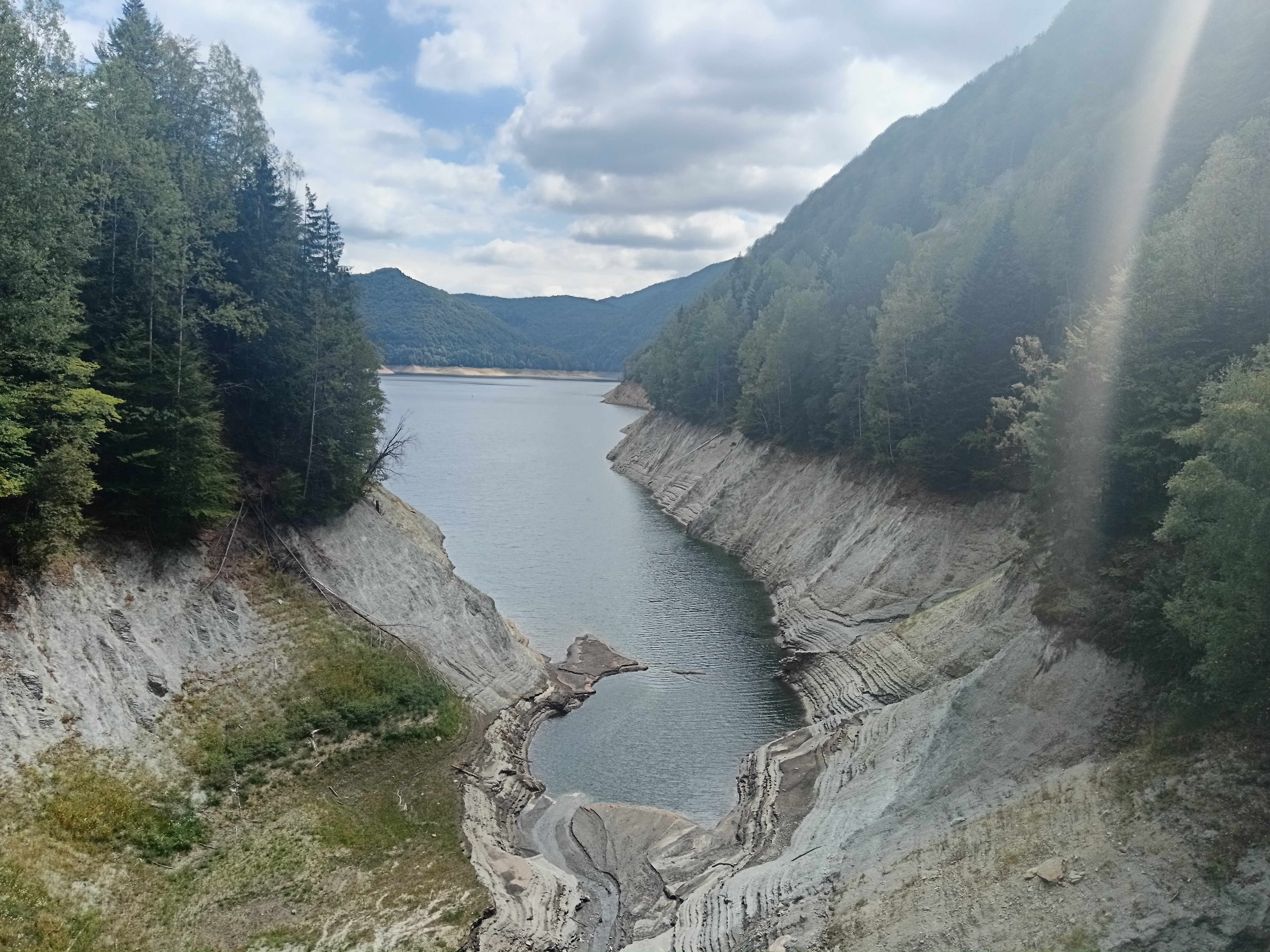 Nous voici donc aujourd’hui et pour deux jours dans l’instant Carpates du voyage. Dès le matin, après un beau lever de soleil sur le Danube, on rejoint dans les premières montagnes les bains de Baile-Herculane, dans les gorges de la rivière Cernei. Un lieu particulièrement insolite. Des bains d’une très belle architecture, dans un état de délabrement avancé, suite à un scandale de corruption. J’en profite pour aller me renseigner sur le web dans la presse locale, face à ces bâtiments, et j’apprends (merci google trad) que des communautés de jeunes, sans aides publiques, ont lancé des travaux de restauration. Vraiment un lieu magnifique. Plus étonnant encore, plus haut en montant le long de la gorge, beaucoup de roumains, des familles âgées et plutôt modestes, garent leur voiture le long de la route étroite, pour descendre se poser au sein de vasques, profiter des bienfaits supposés de cette eau, probablement très froide. Encore plus engagé dans les gorges, je fais un arrêt « évaluation des risques ». Initialement, était prévu un traversée de cette partie des Carpates par une longue piste d’un soixantaine de kilomètres, sans âmes qui vivent. Piste que je savais très variée au niveau des conditions (sous-bois humides, pierres, terres, parties très pentues, parties plus faciles). Mais piste que je savais aussi traverser des paysages sauvages intéressants. Mais comme une petite angoisse. Le pneu arrière commence à être usé, si bien que les conditions de traction hors bitume étaient fragilisées. Le temps était beau et sec, mais les pluies torrentielles étaient passées la veille, si bien que les parties en sous-bois étaient peut-être encore très boueuses. Temps de réflexion donc, puis je décide de ne pas m’engager dans cette partie sans échappatoire autre qu’un demi-tour, qui m’aurait fait perdre trop de temps, et un risque non pas de chute mais de m’embourber et compromettre la journée voire plus. Je decide donc de partir plus au sud par de petites routes traversant une myriade de petits villages ruraux, pour rejoindre la trace prévue plus loin, au pied de la route portant mal son nom: La Transalpina. Deuxième passage ici, le premier en 2017. Pour moi, la plus belle route d’Europe, traversant les Carpates à la verticale. Pas des montagnes comme dans les Alpes, les dénivelés sont plus progressifs jusqu’aux 2150m du sommet de la route, mais les vues sont impressionnantes. Grand soleil, vents forts, seulement 5 degrés, donc pas de brumes de chaleur qui entravent la profondeur des vues.