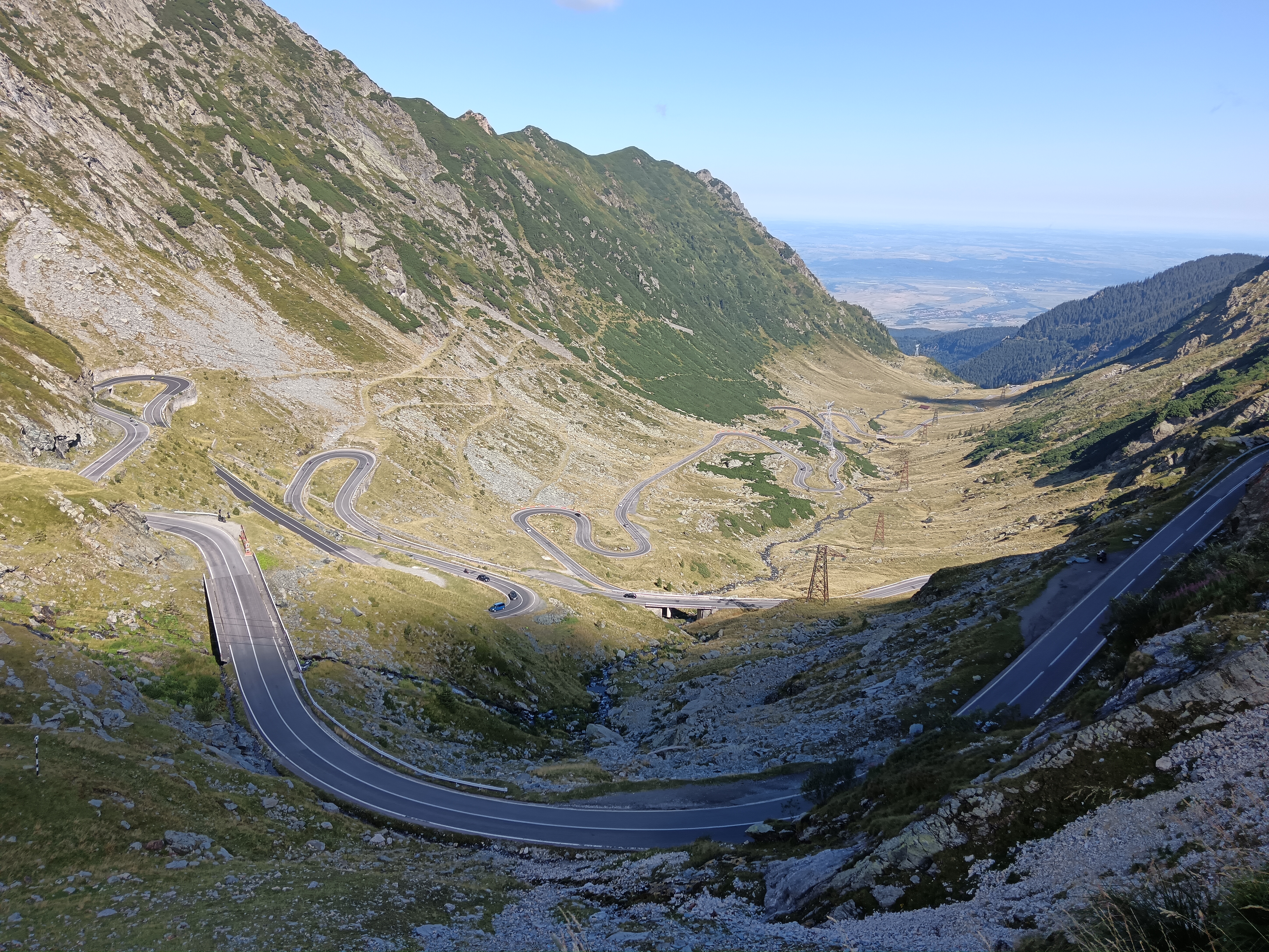 Le petit dej’ de Gabriela, c’est un gros dej’ hyper calorique où quelques fruits ne pourront rivaliser contre les 5 types de fromages et 5 types de charcuteries qui vous attendent devant vos yeux encore humides. Elle doit savoir que monter au sommet des Carpates nécessite de faire le plein d’énergie. En effet, programme du matin, après une vingtaine de kilomètres à travers une plaine céréalière, se présente devant vous un mur, où l’on devine à son sommet le col de Transfagarasan, le Lourdes des motards est-européens, leur Stelvio à eux. La montée est superbe, d’abord en sous-bois, la végétation se raréfie jusqu’au tunnel final qui perce la roche pour basculer au sommet du sud de la Roumanie. Dur de concilier pilotage, tant les courbes se prêtent à tester les talents du pilote (qui vieillit), et contemplation (marmottes, cascades, …). Et puis le buzz s’est installé depuis quelques mois dans les médias et réseaux sociaux: la présence de nombreux ours aux abords de la route. Pas un seul croisé dans la montée. En même temps, je les comprends: attendre un hypothétique touriste à grignoter en plein vent sous 5 degrés, vaut mieux rester sous sa couette. Dans la descente du col, tout aussi belle, on sort de la route pour emprunter une piste de 15 kilomètres qui longe le lac Vidraru, immense réserve d’eau retenue par un imposant barrage. Et puis après le barrage, alors que je n’y pensais plus, à la sortie d’un virage « aveugle », deux ours sur le muret, à 3 ou 4 mètres de moi. Vous auriez pu avoir la preuve en photo, si un motard italien n’avait pas récemment voulu impressionner ses lecteurs en copinant avec eux, pour finir en mauvais état en fond de ravin. Les indications sont claires, sous forme de dessins, en bord de route: ne pas s’arrêter, ne pas les nourrir. Je fonce donc, en rencontre un autre quelques virages plus bas.