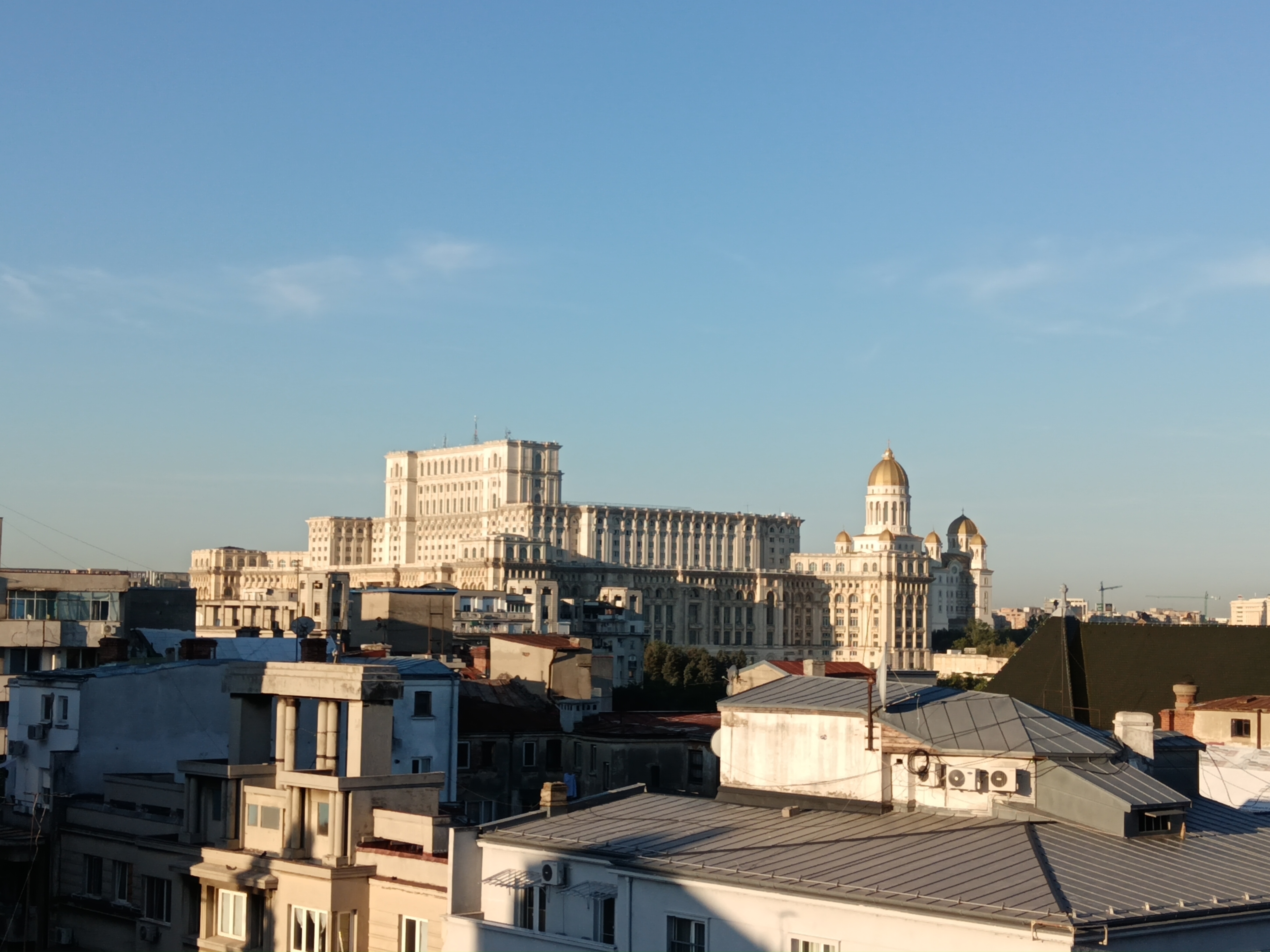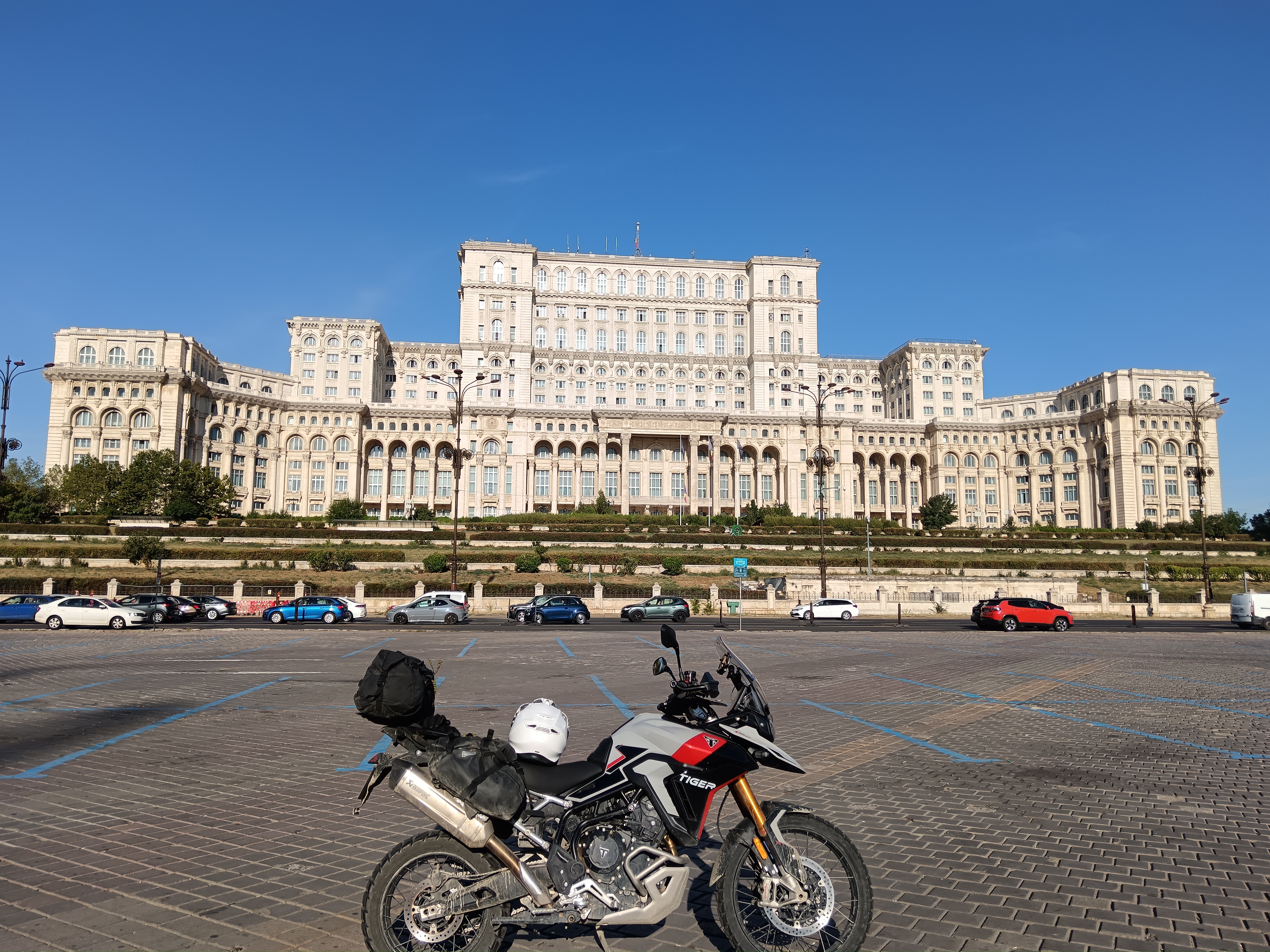 Réveil très matinal, petit dej’ sur le rooftop de l’hôtel avec vue sur le parlement roumain érigé par Ceausescu. Ce serait le deuxième bâtiment à la surface la plus importante au monde, derrière le Pentagone. Peu importe le classement, c’est vraiment très impressionnant. Du coup, une fois les bagages harnachés sur la moto, je me rends sur la place faisant face au bâtiment, pour une photo qui finira en vitrine de ce billet, comme le point le plus à l’est de ce voyage.