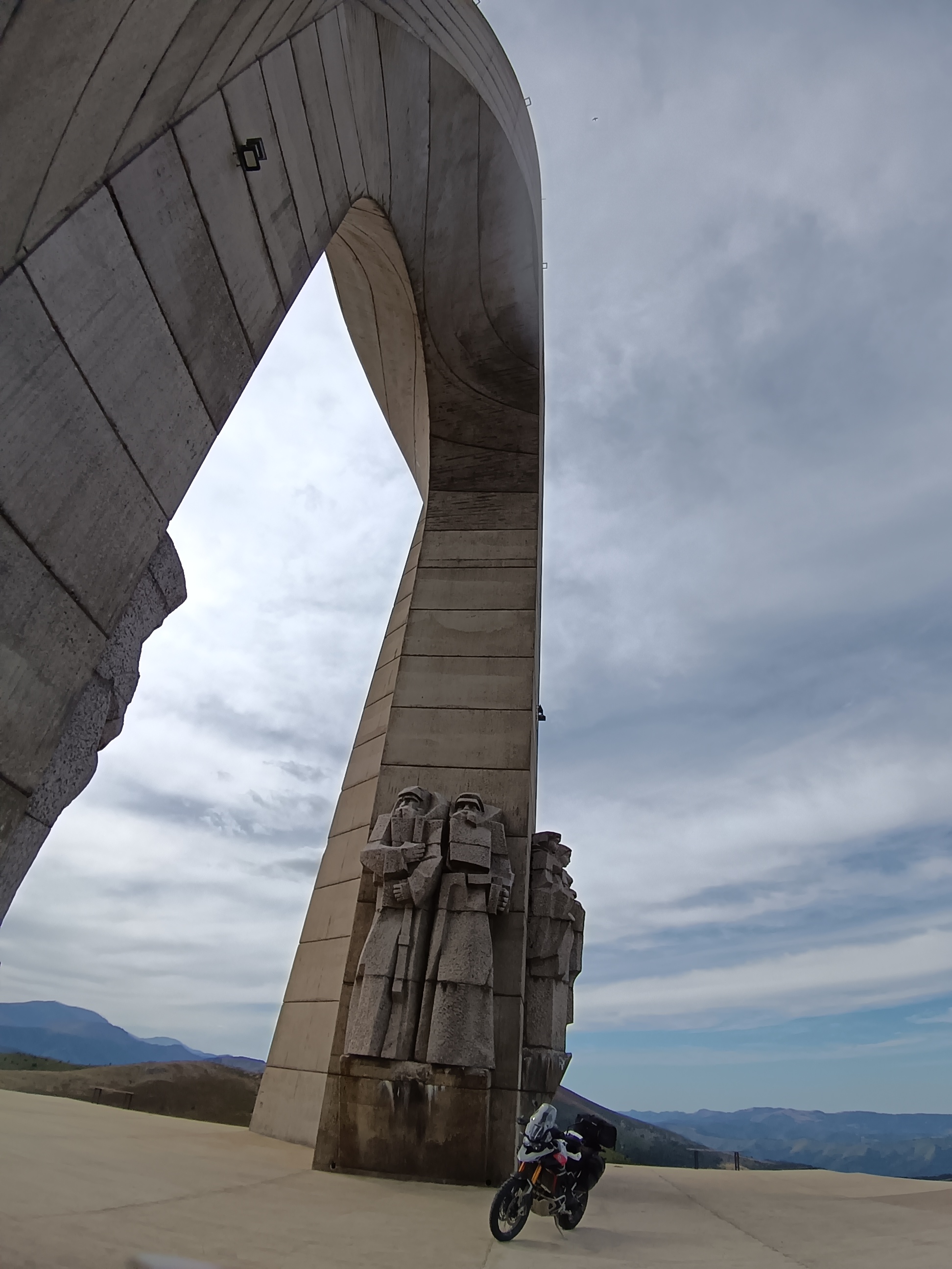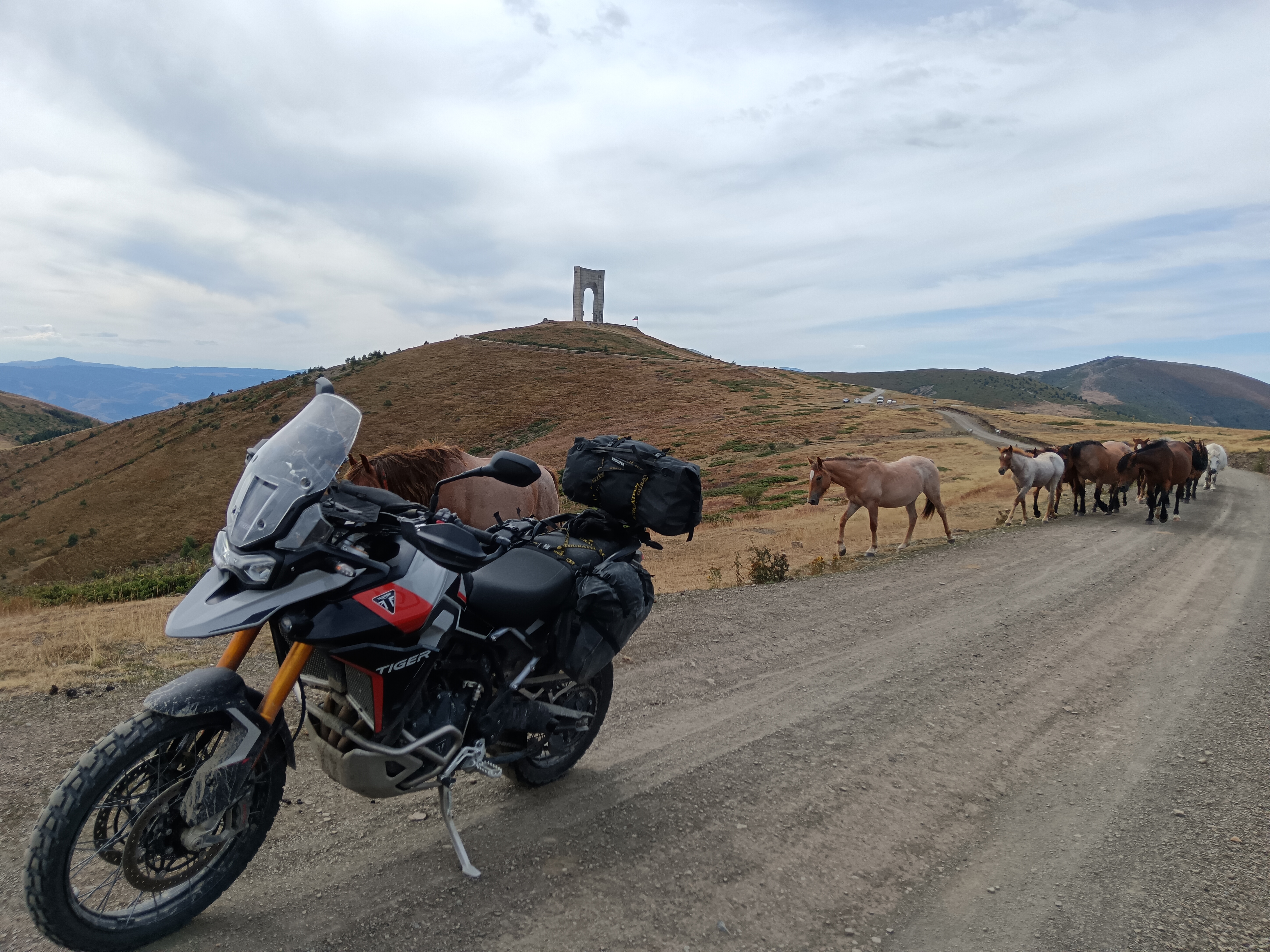 La petite angoisse n’est donc plus qu’un vieux souvenir, et me voilà disposer de suffisamment de temps pour profiter des berges du Danube, visiter de belles villes et villages, comme la ville médiévale de Veliko Tarnovo. Et surtout, en milieu d’après-midi, monter au sommet de la chaine de montagne qui partage la Bulgarie en deux, au col de Troyan, où, non loin du sommet routier se trouve la très impressionnante « АРКА НА СВОБОДАТА », soit l’Arche de la Liberté. Je brave peut-être un interdit mais je suis seul sur cette crête, au pied de cette arche, et ne peux résister à tenter de monter la moto par des marches pour accéder au pied de l’arche, et tenter « the pic of the day » voire « … of the trip ». La moto devient minuscule au pied de cette oeuvre impressionnante, au milieu de nulle part et visible de très loin par les bulgares du sud et les bulgares du nord. Je profite de ces sommets arrondis pour naviguer une vingtaine de kilomètres sur des pistes de terre facile, sans perturber les chevaux sauvages et autres troupeaux, m’offrant même le luxe d’une pause contemplation, allongé au sommet d’une prairie.