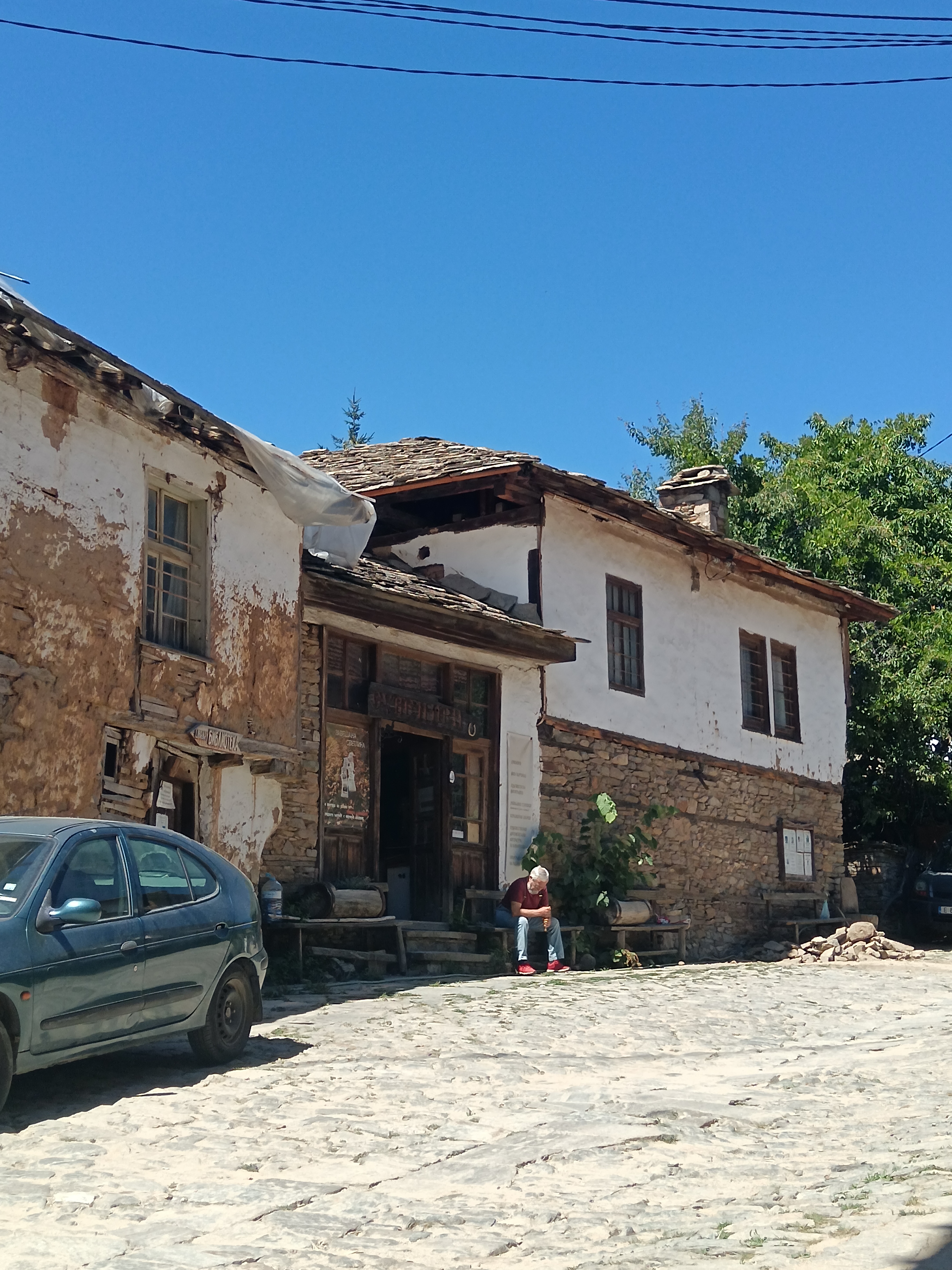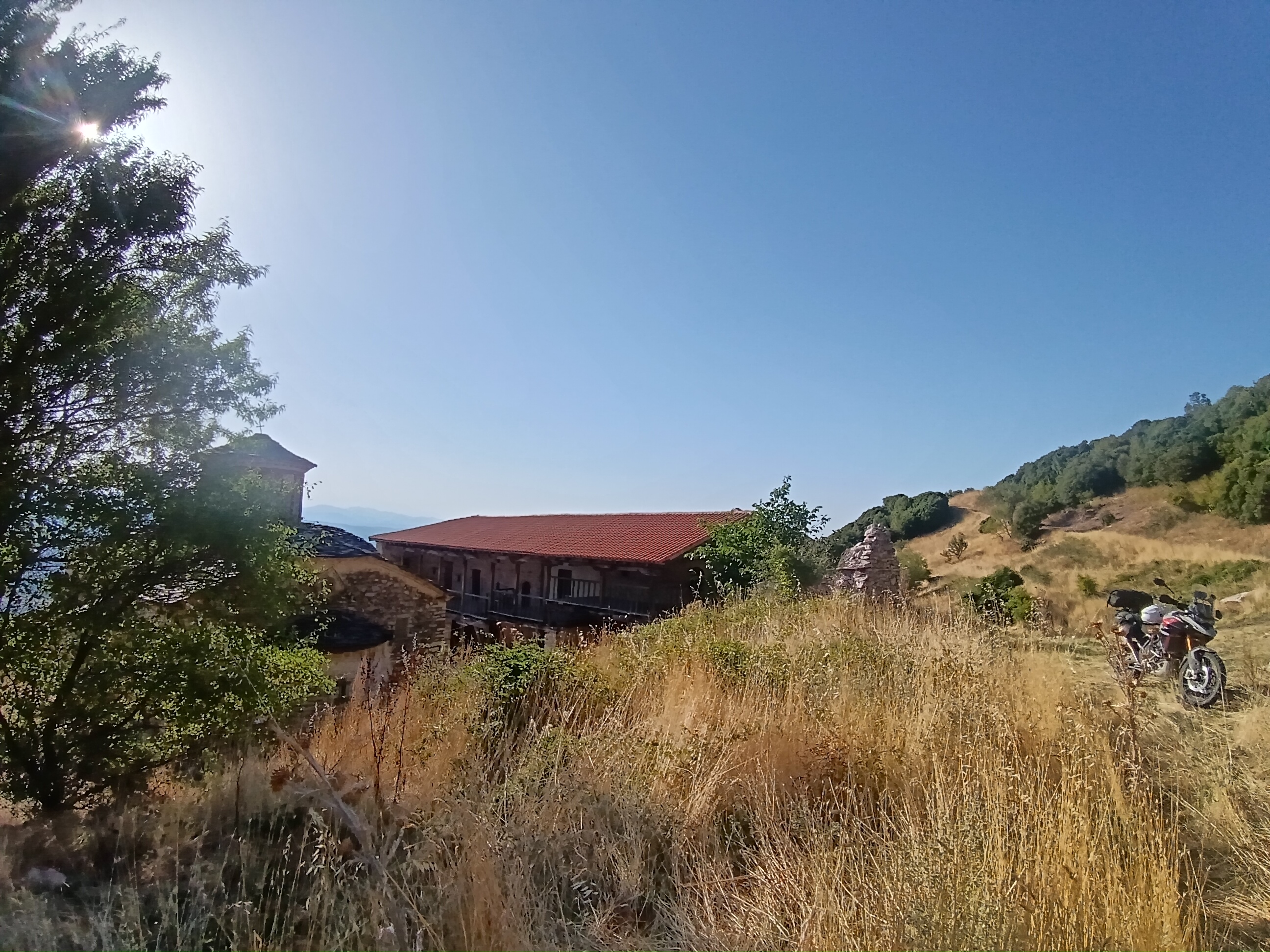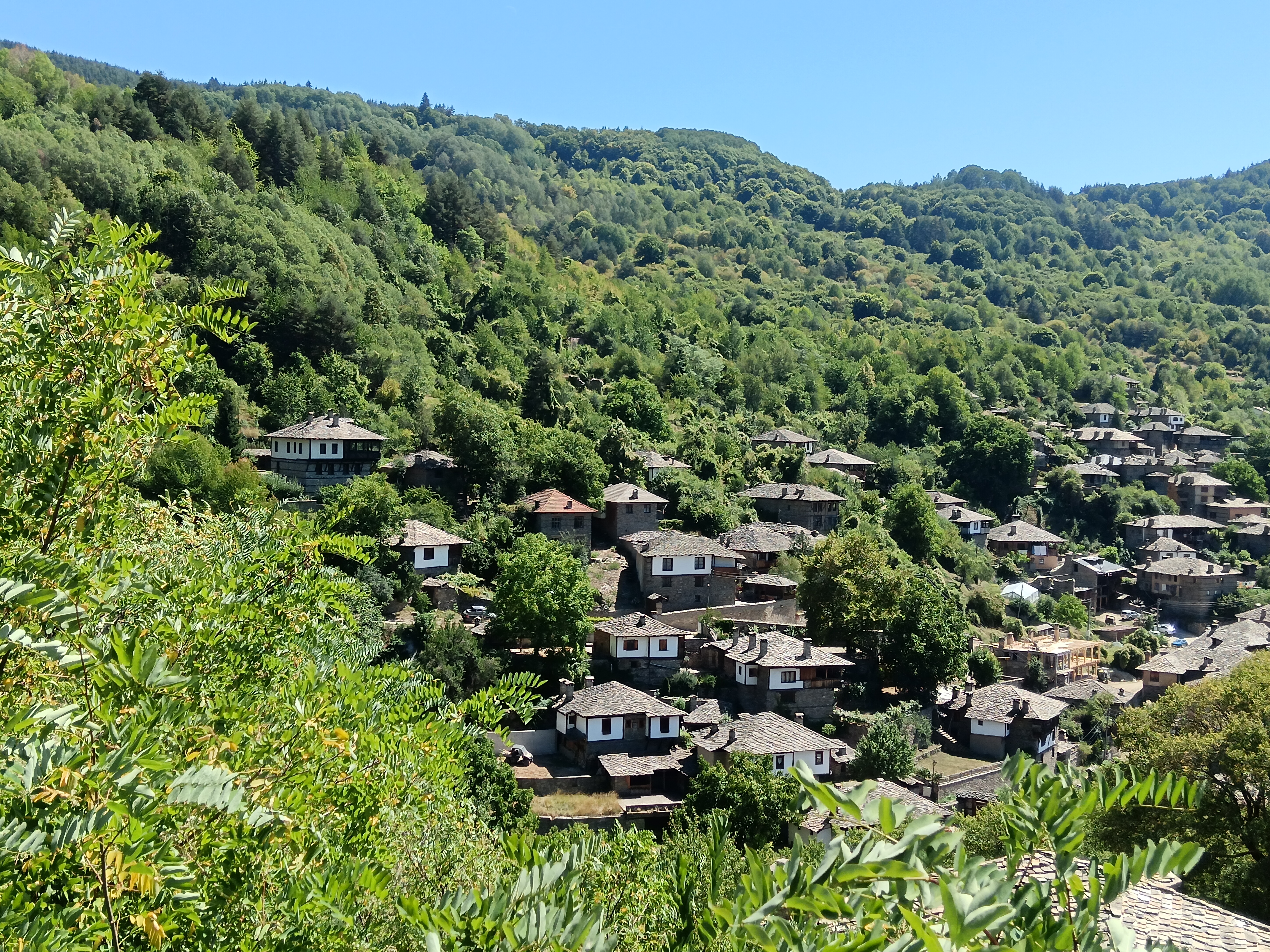 Longue journée en perspective, vers le nord de la Grèce, avec de longues portions hors routes programmées pour explorer les immenses zones forestières du sud de la Bulgarie. Ce sera une des plus belles journées du voyage en termes de paysages. Tout d’abord, une heure en plaine puis une montée par une petite route dégradée pour accéder à plus de 2000m à l’impressionnant réservoir d’eau de Belmeken. La descente est magnifique, et quelque peu gâchée par une piqure d’abeille sur la nuque, qui m’aura un peu stressé compte tenu de mon allergie à leurs piqures. Je m’arrête donc une heure, pour tester l’effet d’un « cortisone naturelle sans ordonnance » que mon pharmacien m’avait délivrée avant mon départ. Mon cou a gonflé rapidement, mais uniquement sur le côté droit, sans que, au bout d’une heure, je ne sente la moindre gêne respiratoire. Me voilà donc reparti d’abord sur une longue route à travers de très denses forêts de résineux à la hauteur impressionnante. Puis 60km de chemins forestiers parfois techniques (merci le pneu neuf aux tétines accrocheuses), sans humains, mais beaucoup de rencontres animalières, pour accéder au village de Kovachevitsa, à 1500m. Ce village est reconnu comme un rare musée de l’architecture bâtimentaire de la renaissance bulgare. Bien sûr, on peut y accéder par une route touristique bitumée. Mais pourquoi arriver là par ce revêtement moderne, côté sud, quand on peut y arriver tel un aventurier par le nord, en surplomb, par des sentes plus confidentielles et offrant des échappées plus sauvages? Cherchez pas plus loin, c’est la raison même de mes voyages à moto (et des heures passées en amont à repérer vu du ciel).