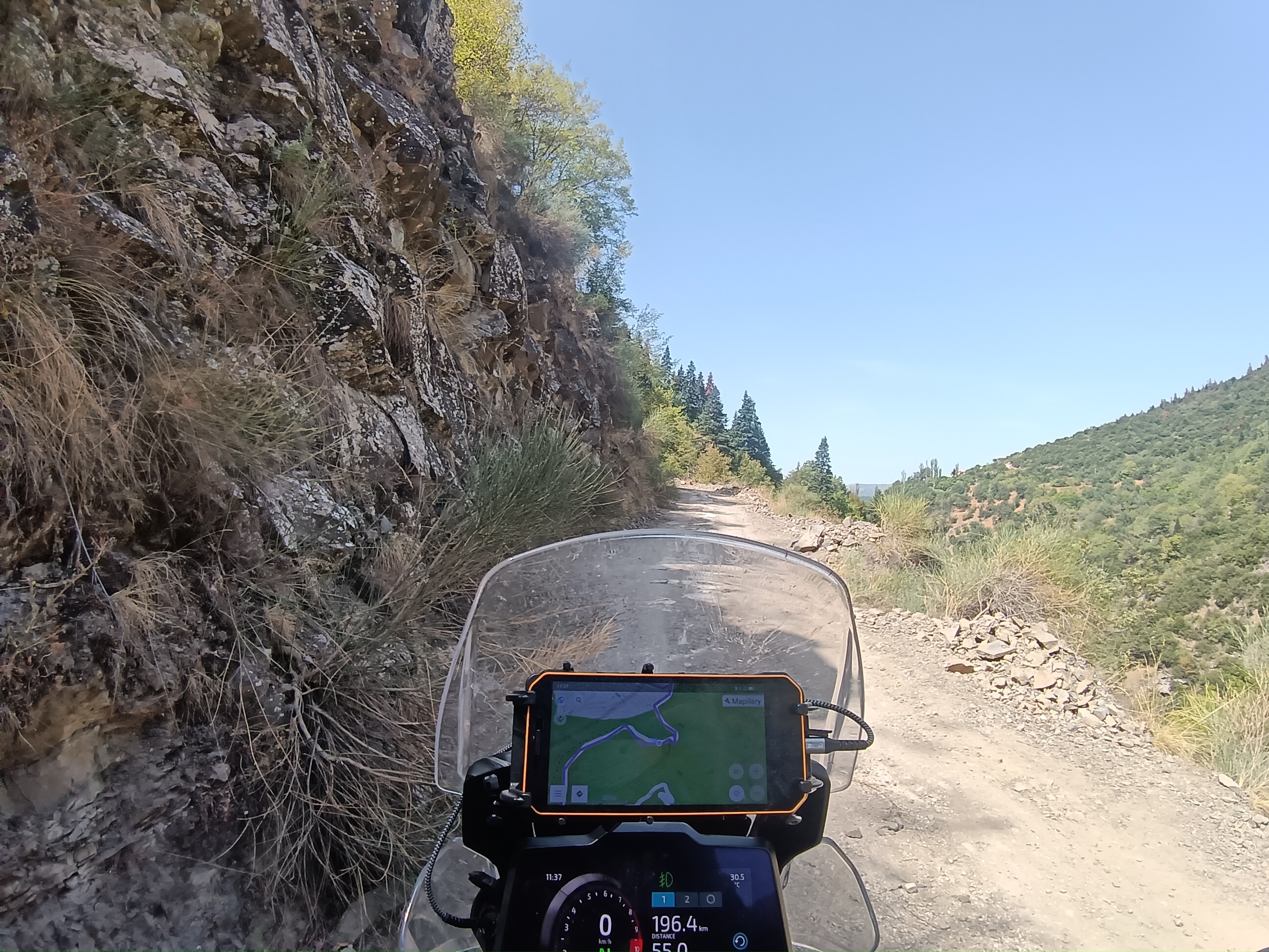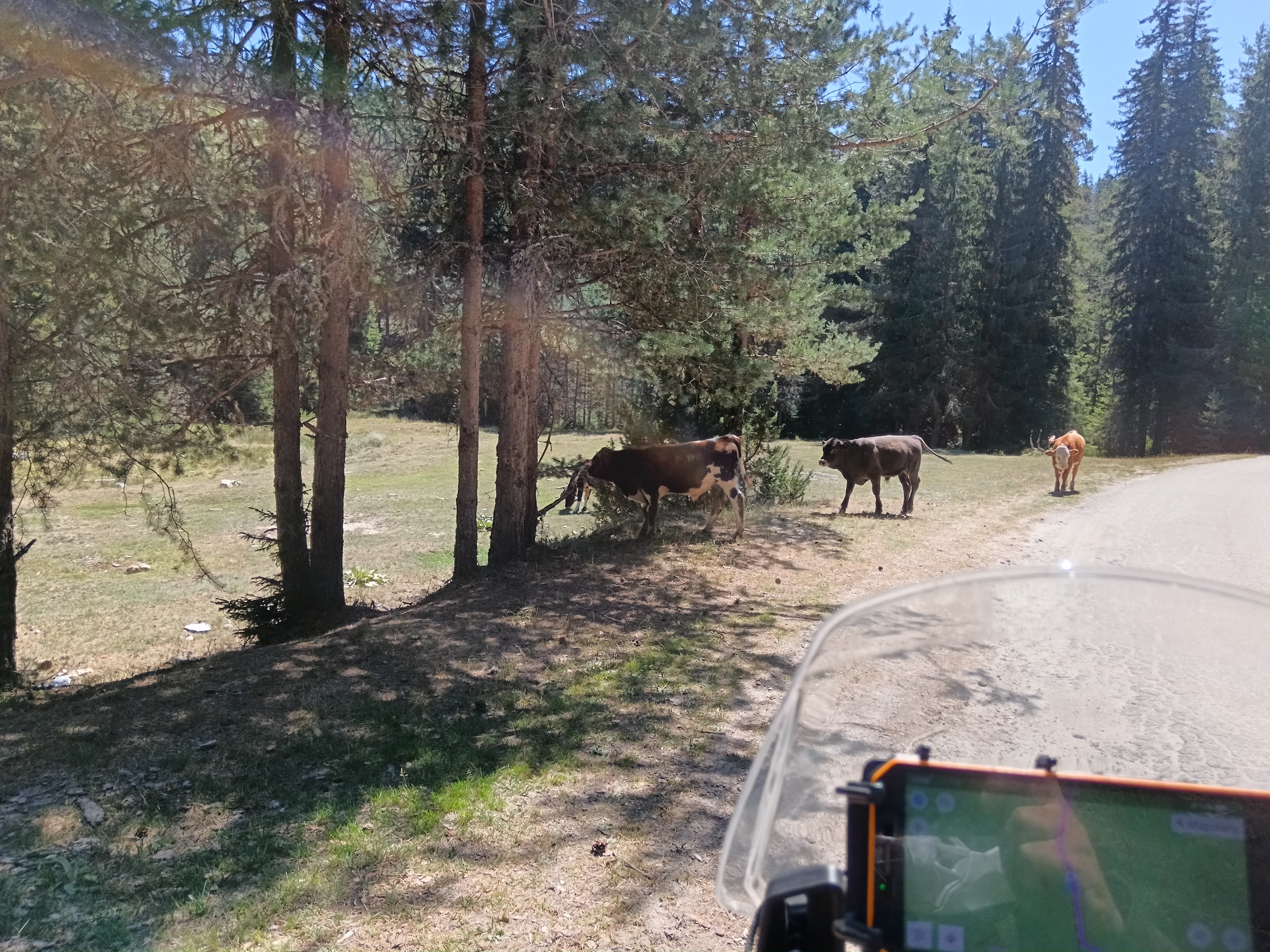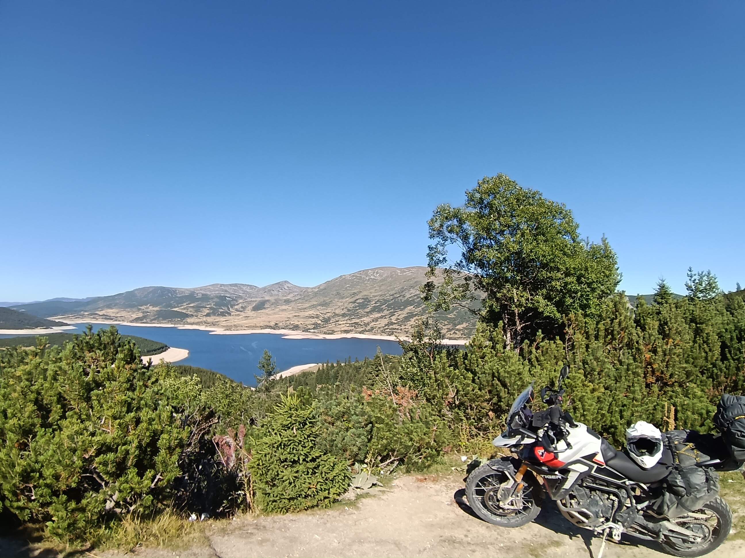 Longue journée en perspective, vers le nord de la Grèce, avec de longues portions hors routes programmées pour explorer les immenses zones forestières du sud de la Bulgarie. Ce sera une des plus belles journées du voyage en termes de paysages. Tout d’abord, une heure en plaine puis une montée par une petite route dégradée pour accéder à plus de 2000m à l’impressionnant réservoir d’eau de Belmeken. La descente est magnifique, et quelque peu gâchée par une piqure d’abeille sur la nuque, qui m’aura un peu stressé compte tenu de mon allergie à leurs piqures. Je m’arrête donc une heure, pour tester l’effet d’un « cortisone naturelle sans ordonnance » que mon pharmacien m’avait délivrée avant mon départ. Mon cou a gonflé rapidement, mais uniquement sur le côté droit, sans que, au bout d’une heure, je ne sente la moindre gêne respiratoire. Me voilà donc reparti d’abord sur une longue route à travers de très denses forêts de résineux à la hauteur impressionnante. Puis 60km de chemins forestiers parfois techniques (merci le pneu neuf aux tétines accrocheuses), sans humains, mais beaucoup de rencontres animalières, pour accéder au village de Kovachevitsa, à 1500m. Ce village est reconnu comme un rare musée de l’architecture bâtimentaire de la renaissance bulgare. Bien sûr, on peut y accéder par une route touristique bitumée. Mais pourquoi arriver là par ce revêtement moderne, côté sud, quand on peut y arriver tel un aventurier par le nord, en surplomb, par des sentes plus confidentielles et offrant des échappées plus sauvages? Cherchez pas plus loin, c’est la raison même de mes voyages à moto (et des heures passées en amont à repérer vu du ciel).